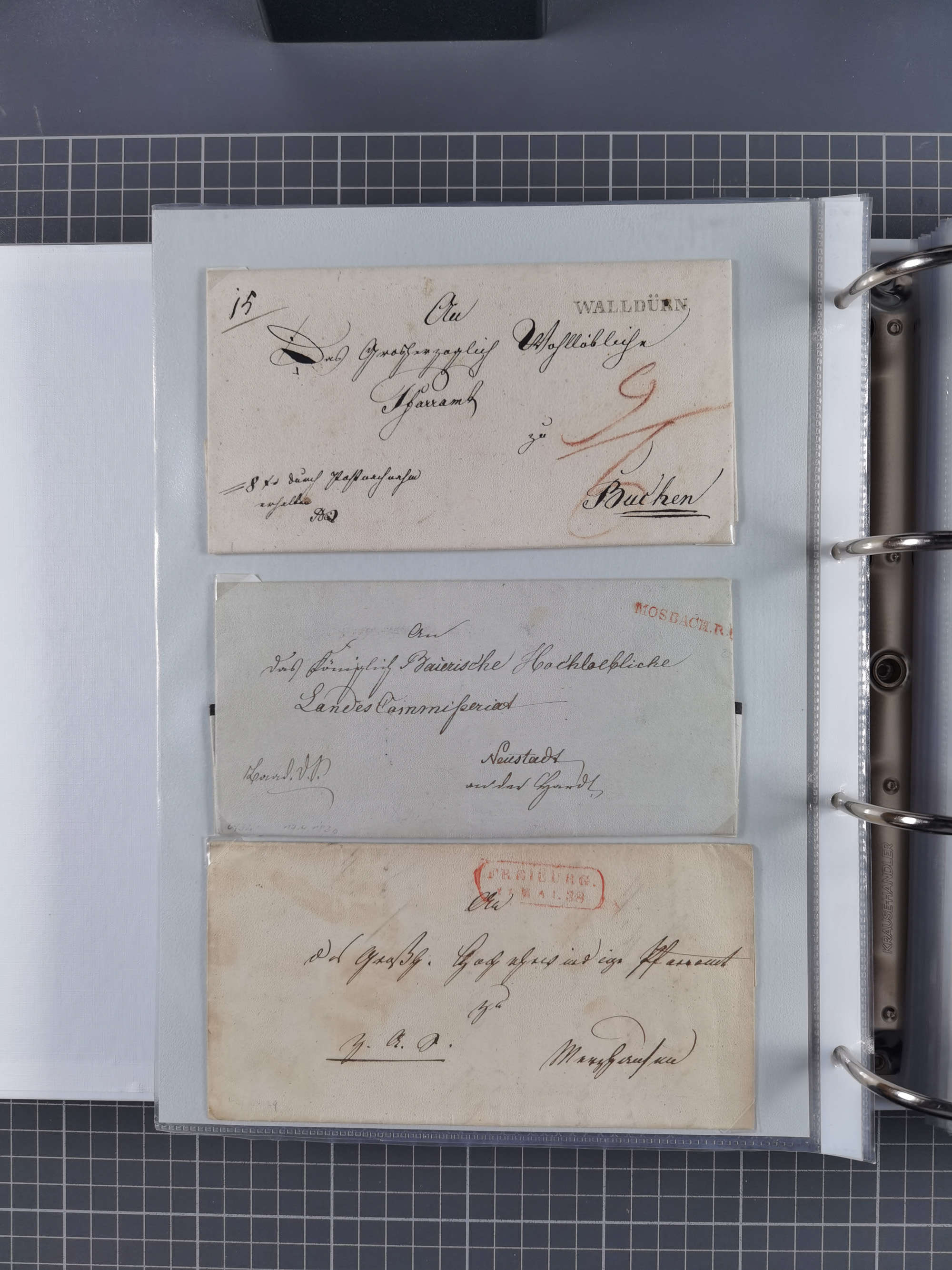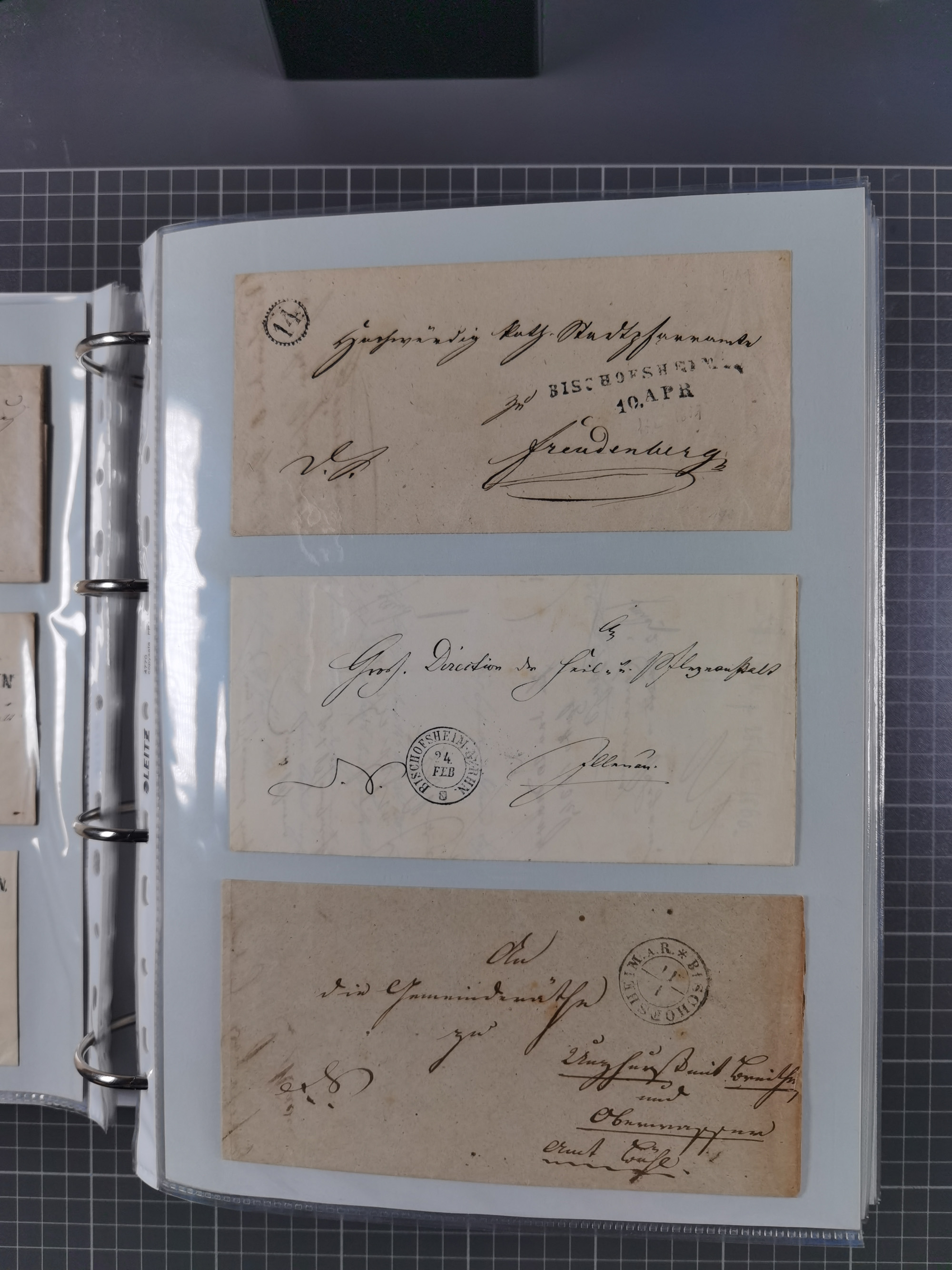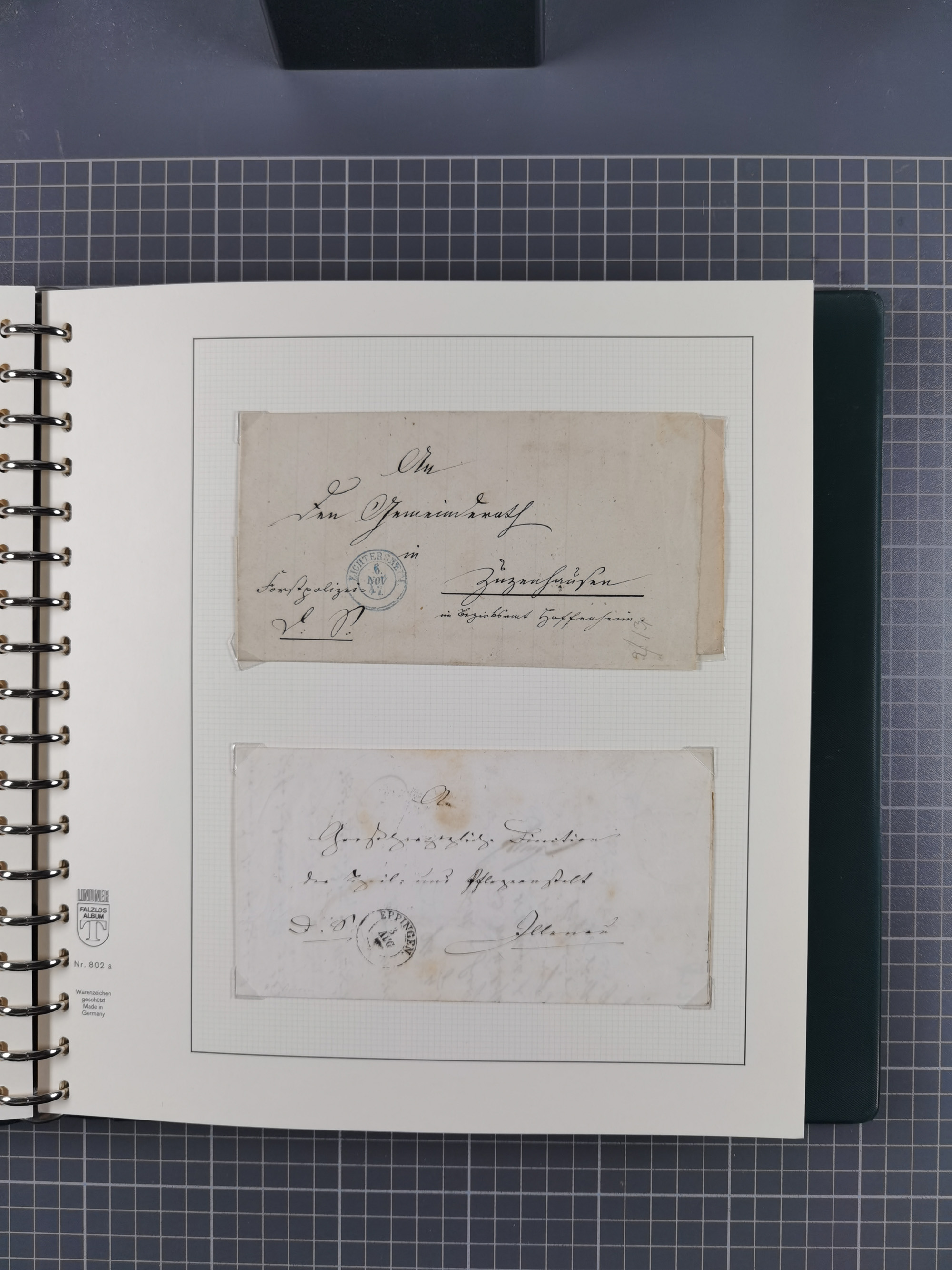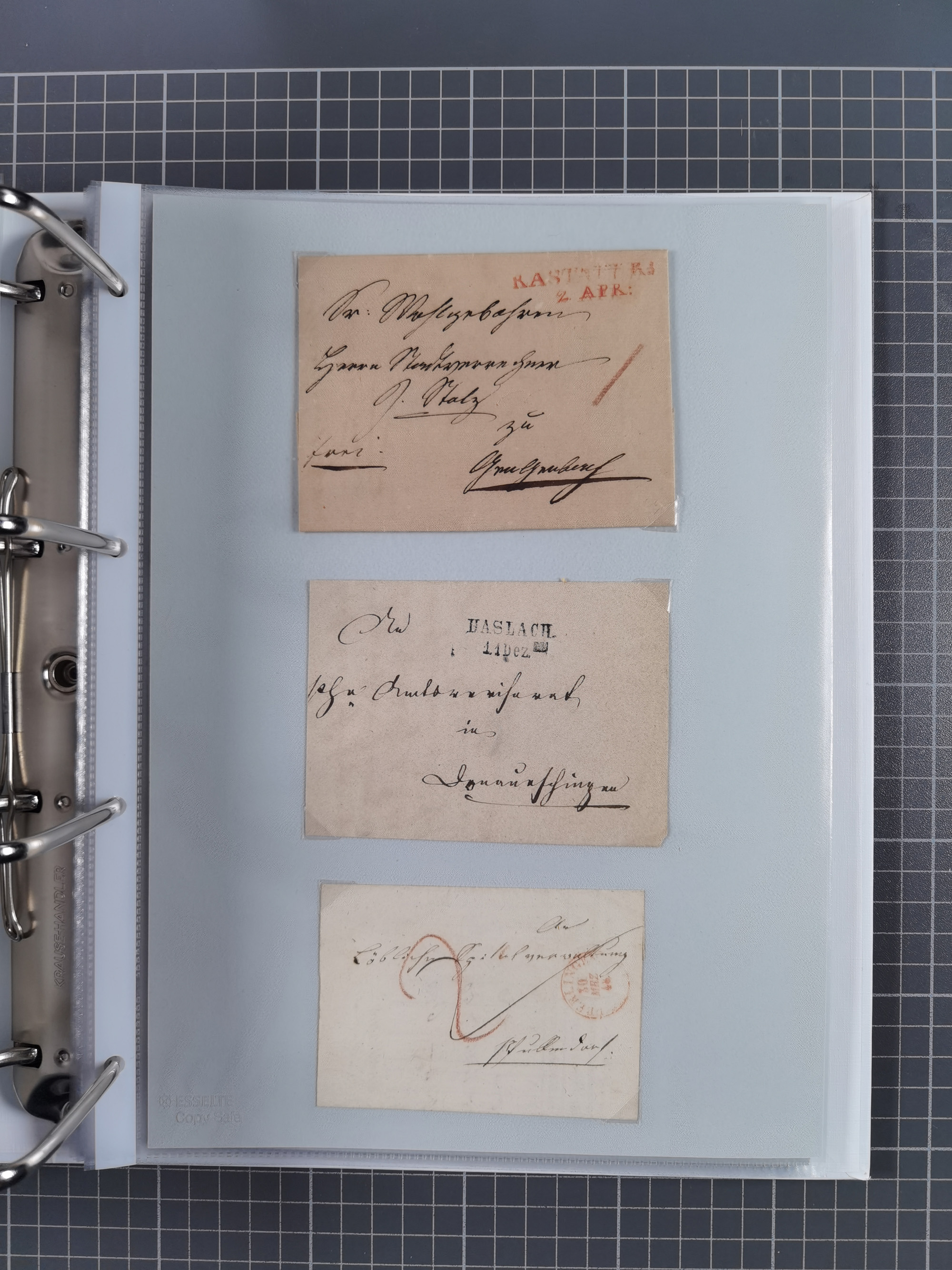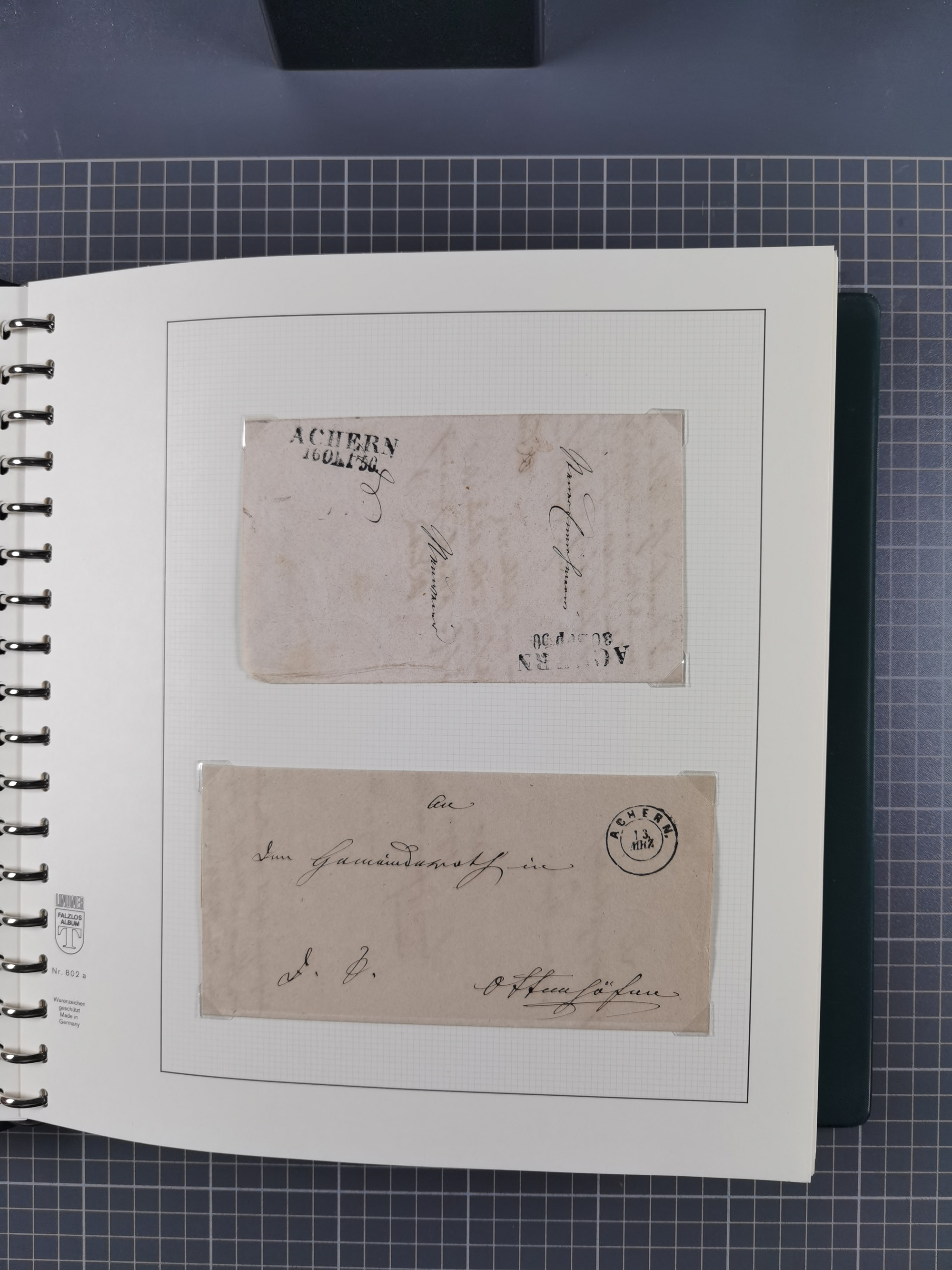 1830/86 (ca.), über 45 meist markenlose Briefe mit Steigbügelstempeln mit Schwerpunkt Württemberg, dabei u.a. HAIGERLOCH in rot auf Vorderseite, ALTSHAUSEN in blau (1844), BLAUFELDEN in waidblau (1850), ECHTERDINGEN in blau (1847), PLOCHINGEN, etc., auch einige Postscheine und Einzelmarken, im Album
