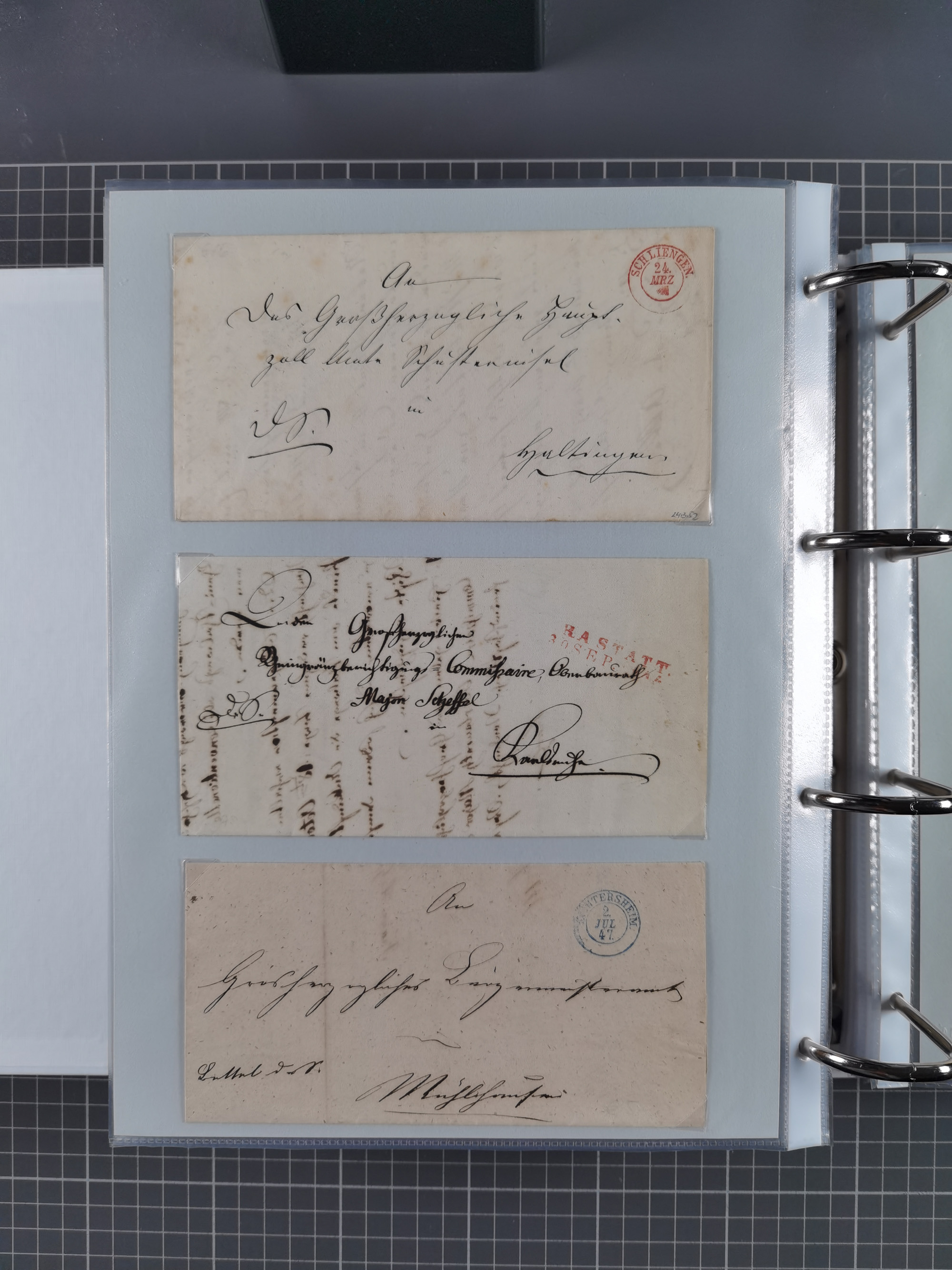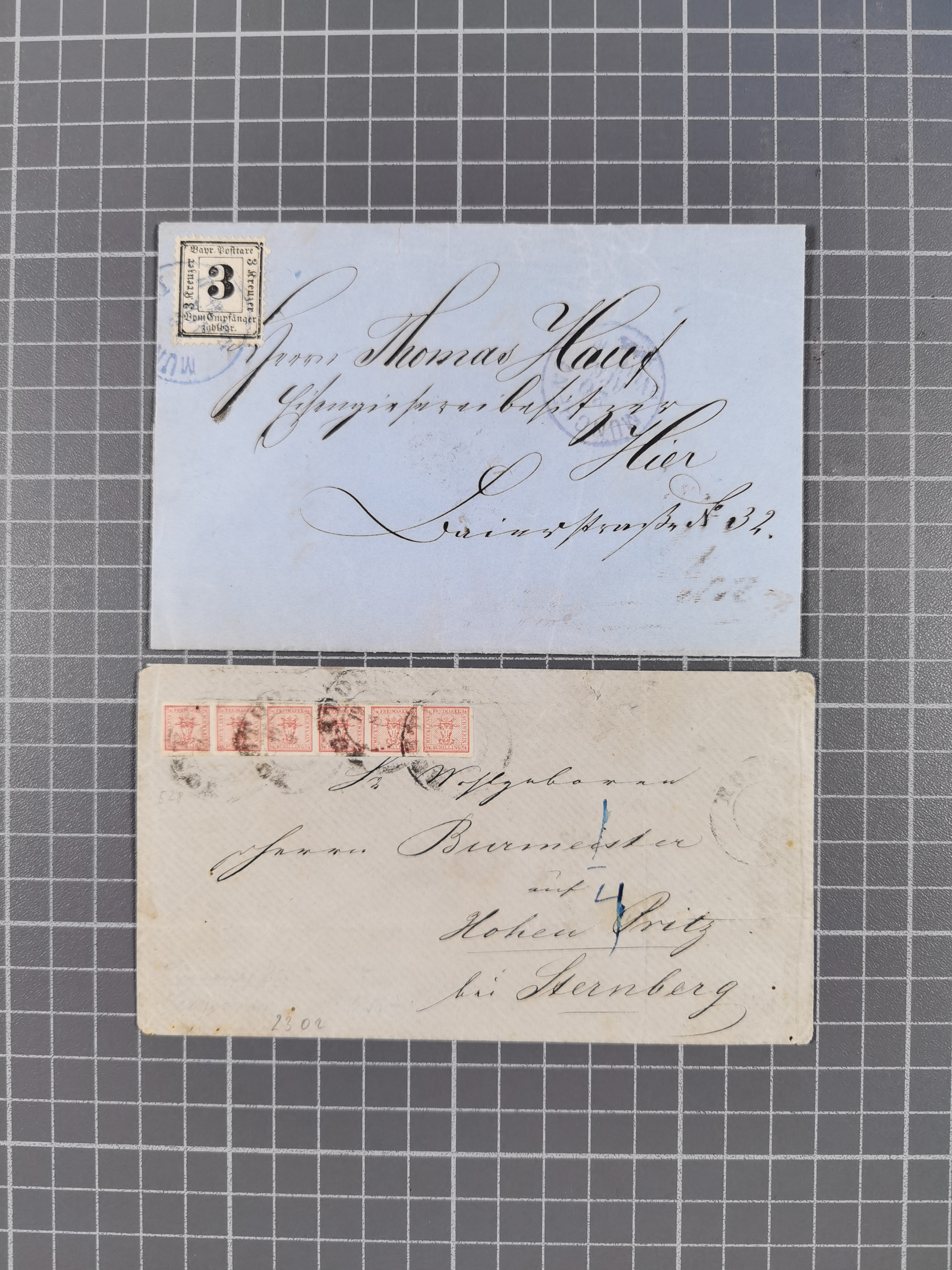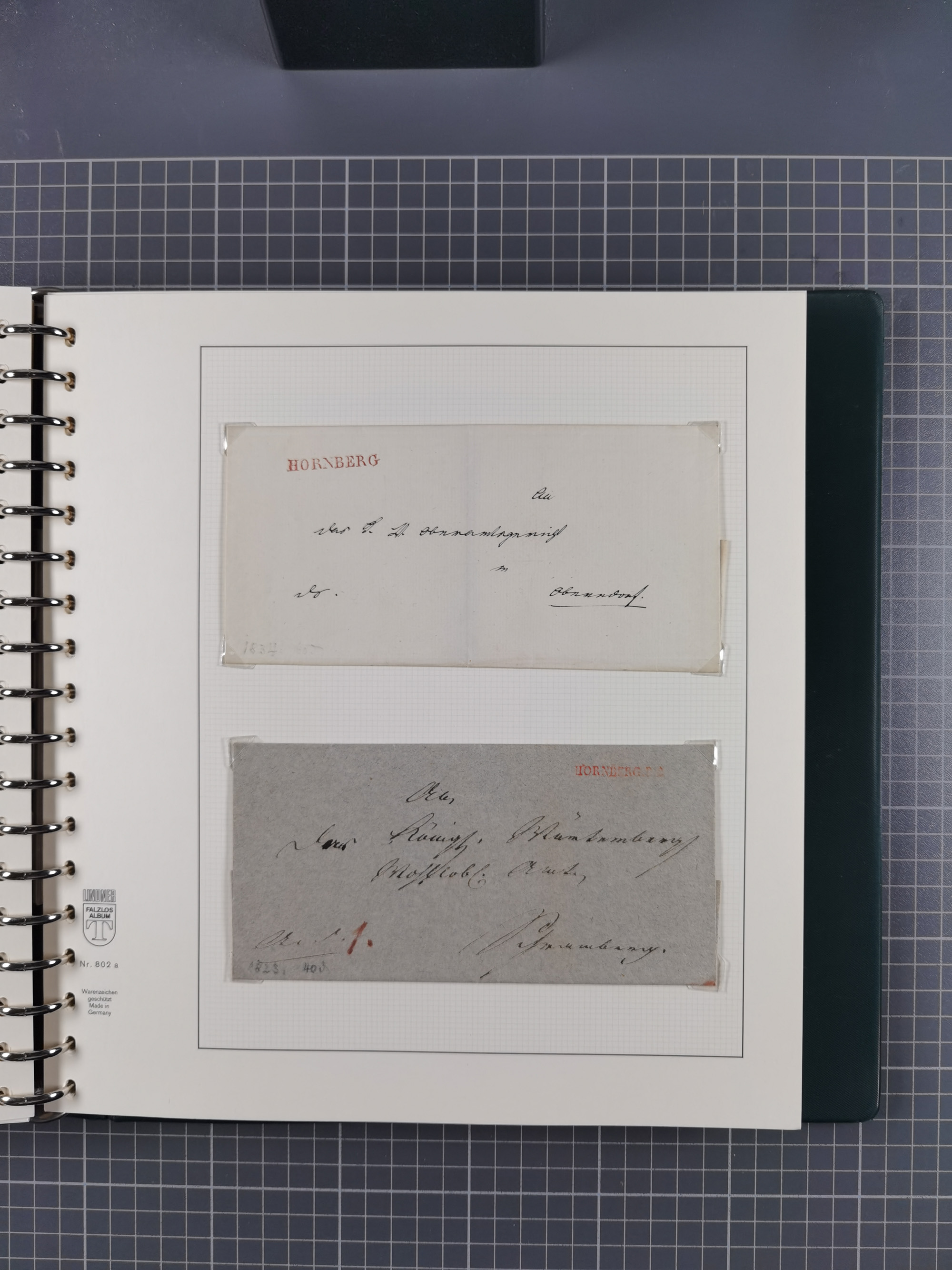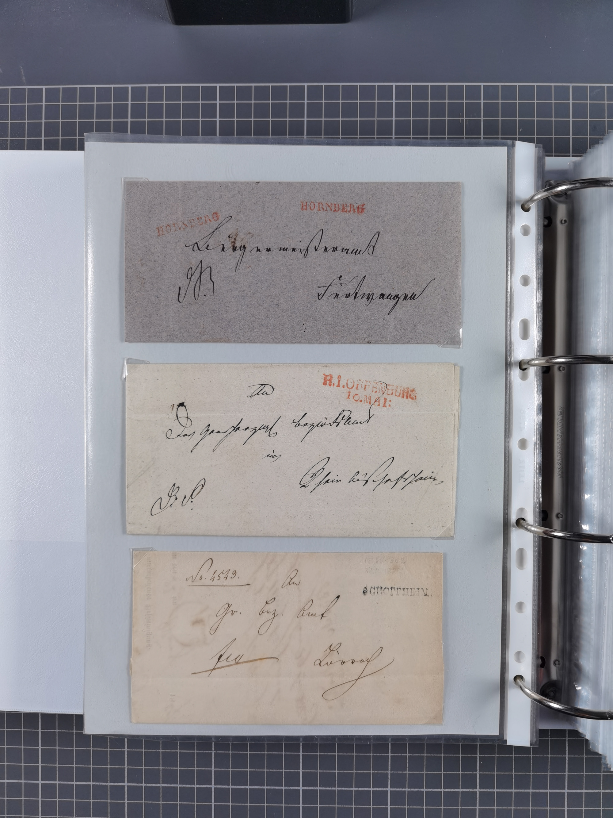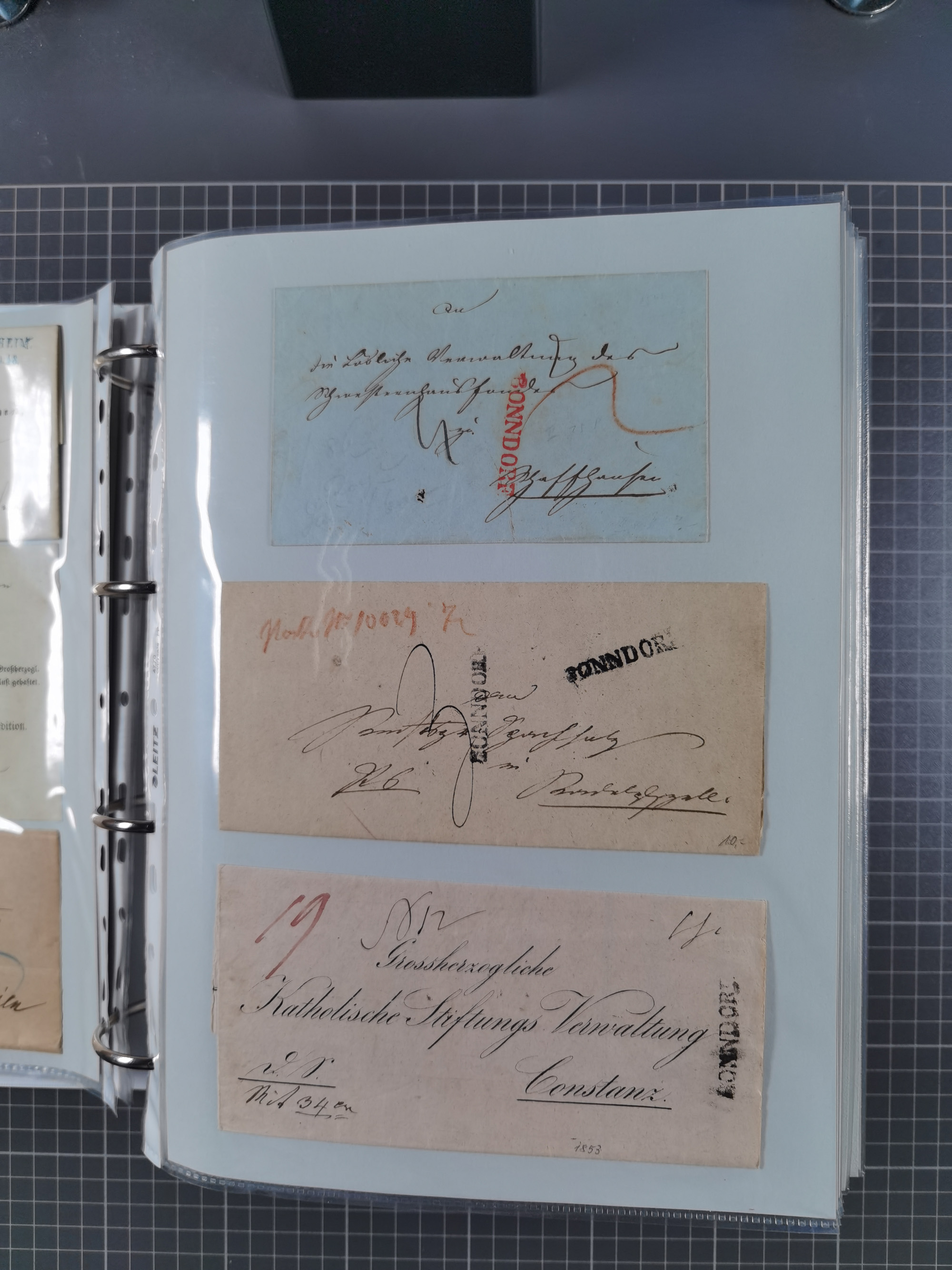 1830/86 (ca.), über 45 meist markenlose Briefe mit Steigbügelstempeln mit Schwerpunkt Württemberg, dabei u.a. HAIGERLOCH in rot auf Vorderseite, ALTSHAUSEN in blau (1844), BLAUFELDEN in waidblau (1850), ECHTERDINGEN in blau (1847), PLOCHINGEN, etc., auch einige Postscheine und Einzelmarken, im Album