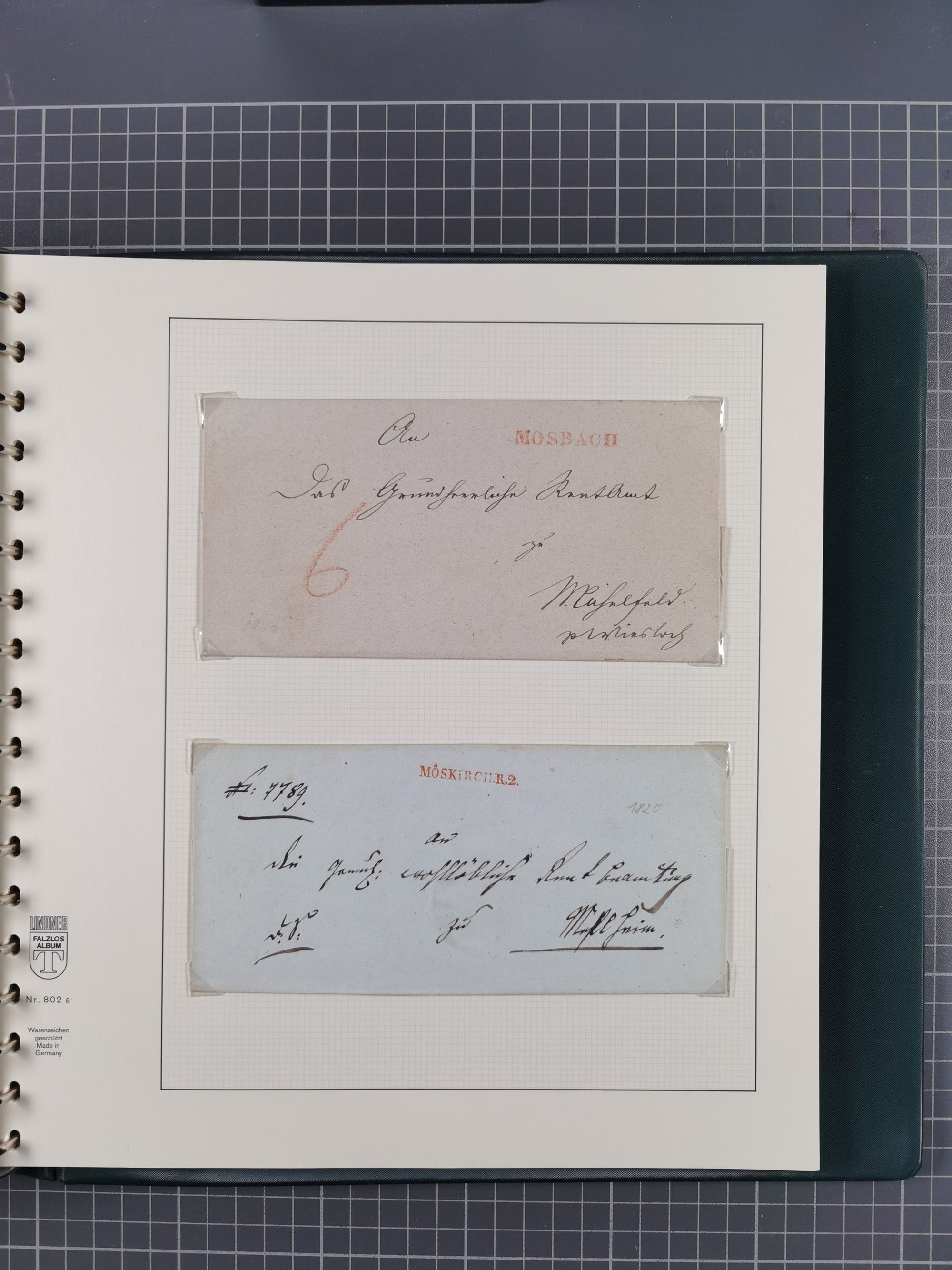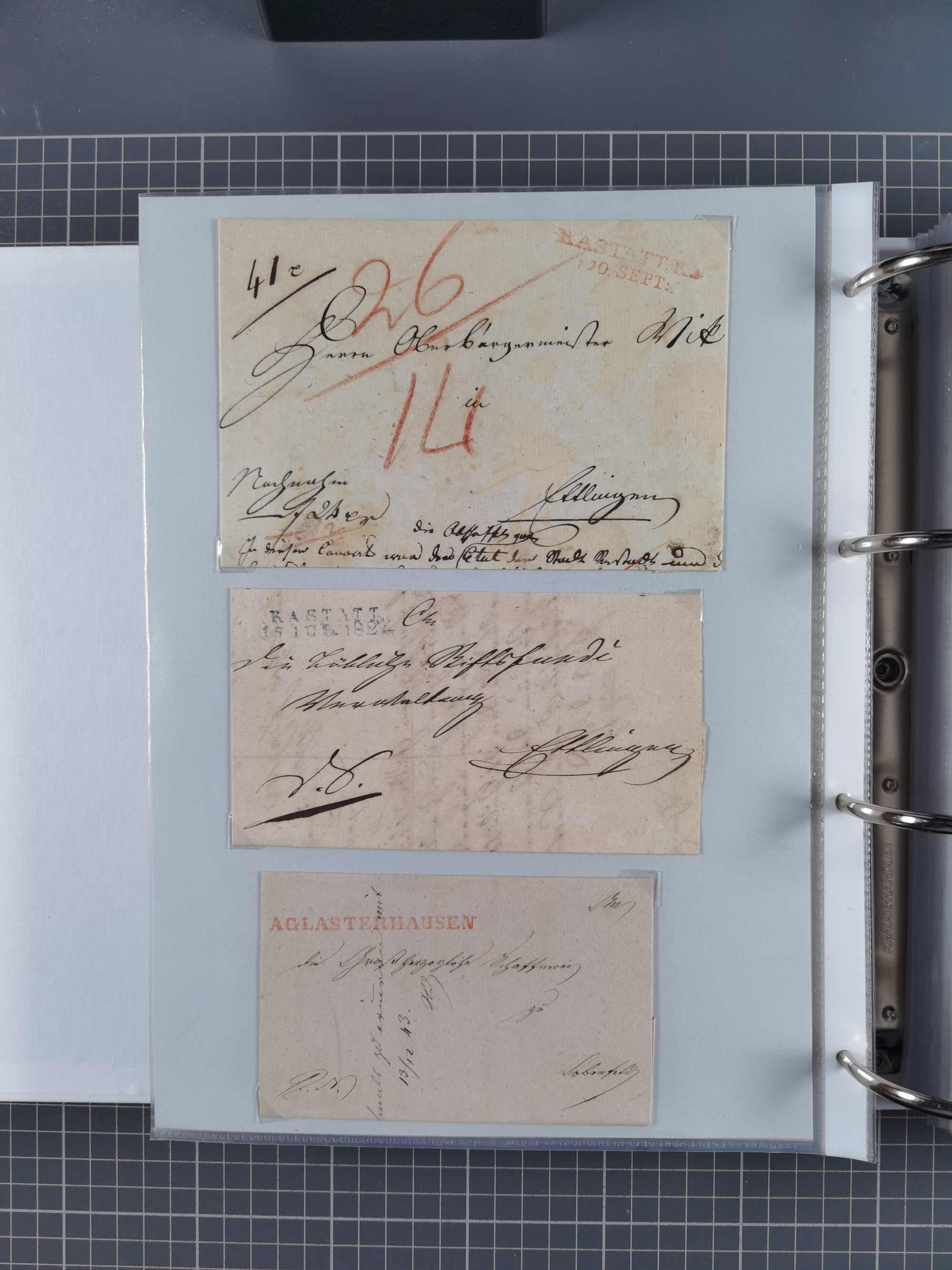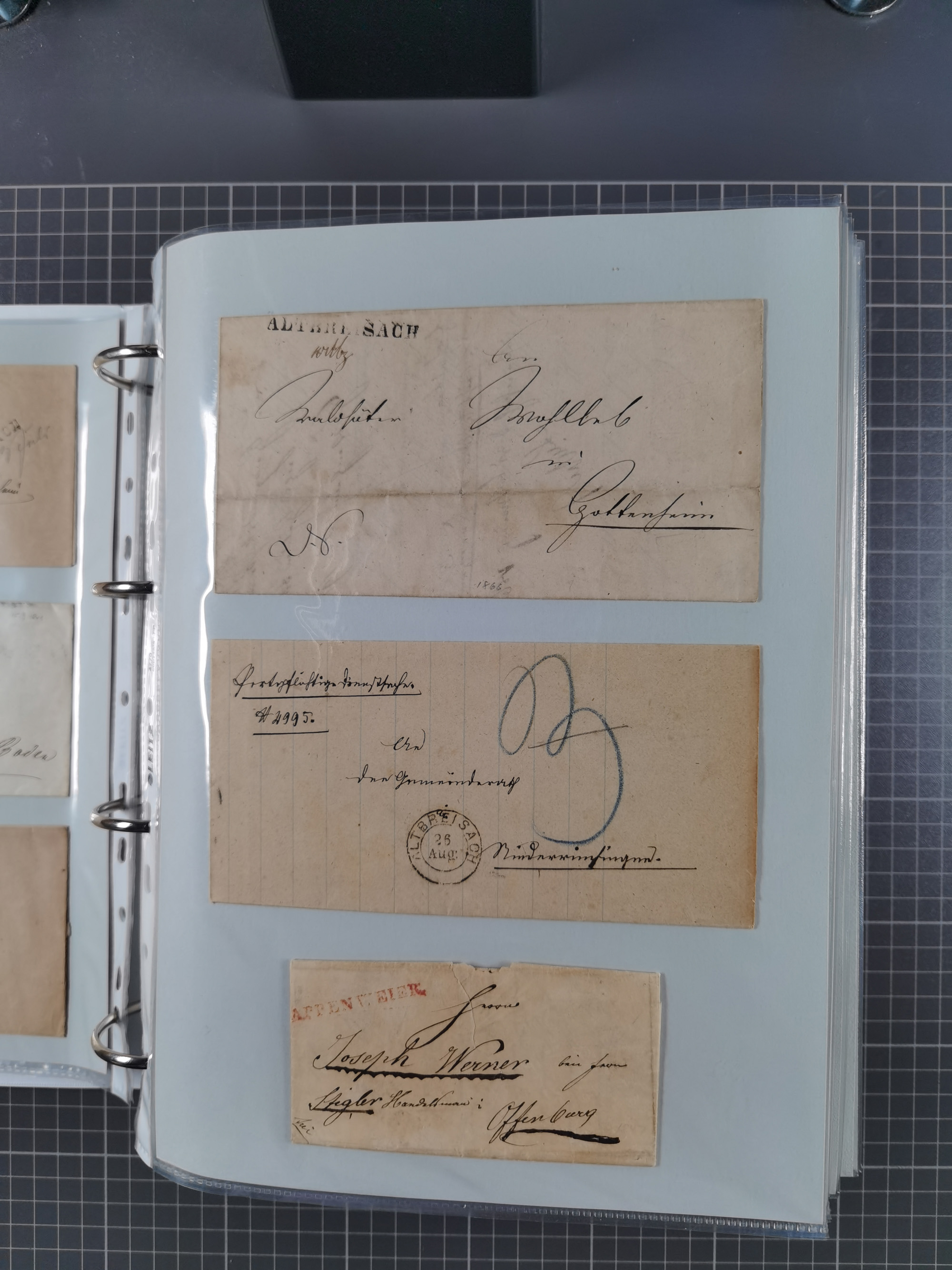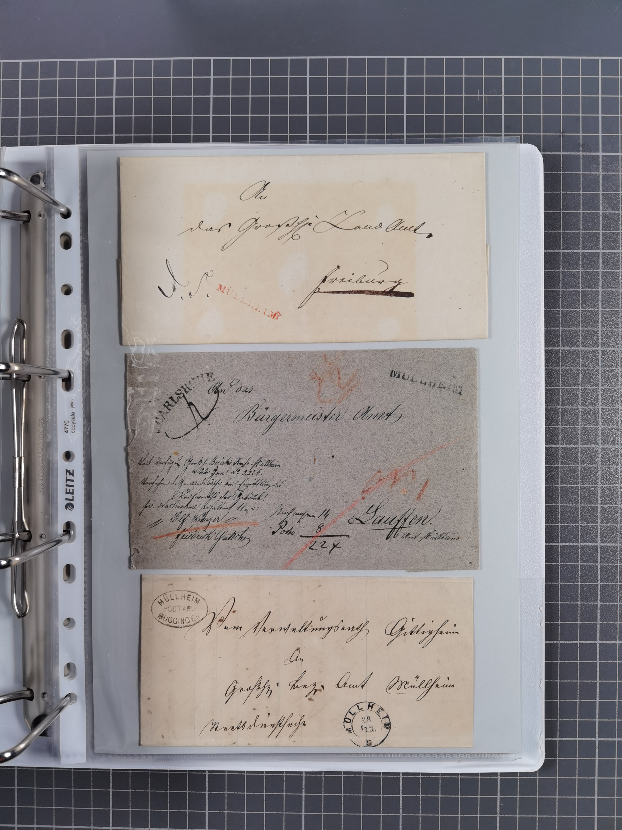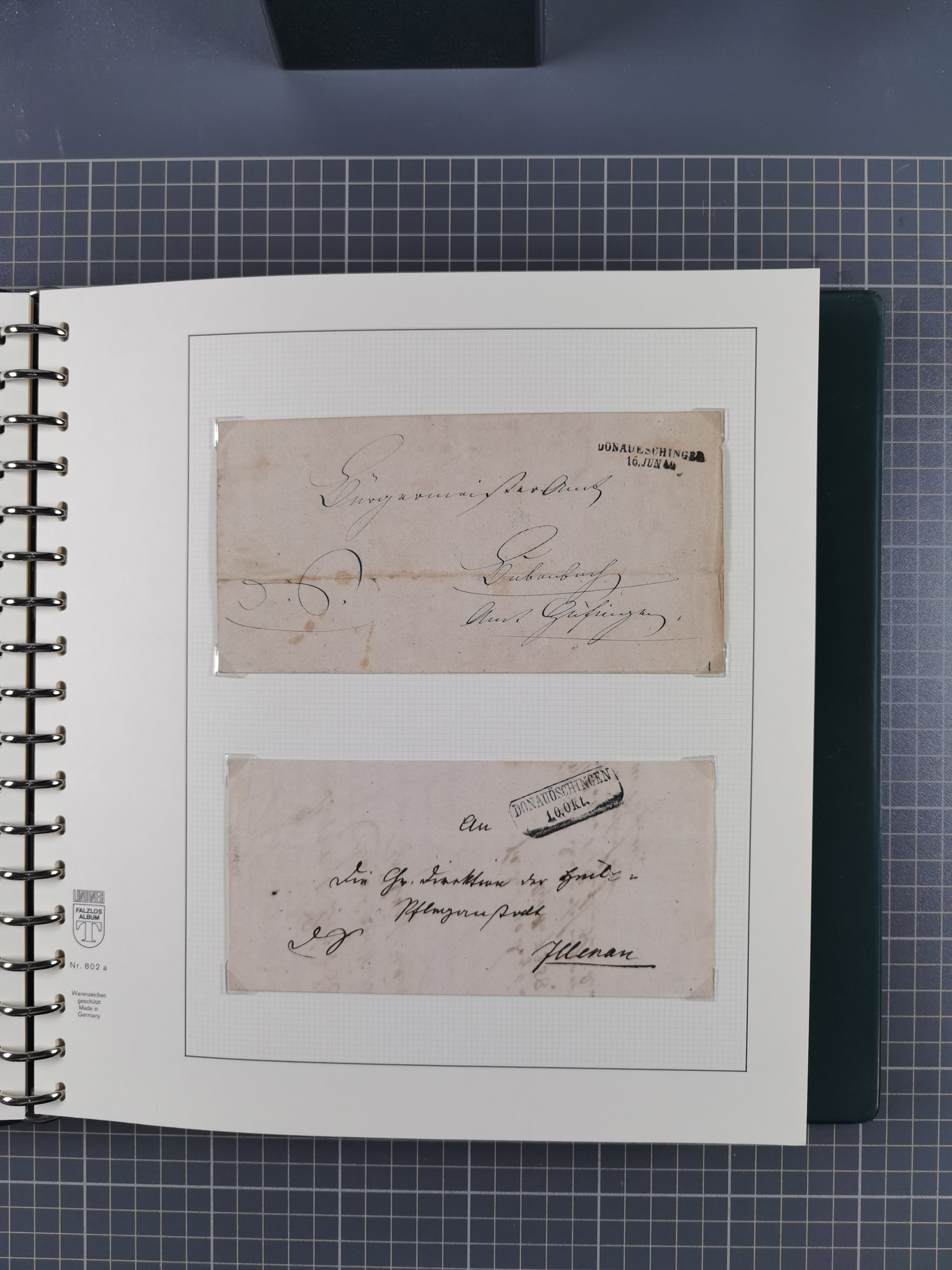 1830/86 (ca.), über 45 meist markenlose Briefe mit Steigbügelstempeln mit Schwerpunkt Württemberg, dabei u.a. HAIGERLOCH in rot auf Vorderseite, ALTSHAUSEN in blau (1844), BLAUFELDEN in waidblau (1850), ECHTERDINGEN in blau (1847), PLOCHINGEN, etc., auch einige Postscheine und Einzelmarken, im Album