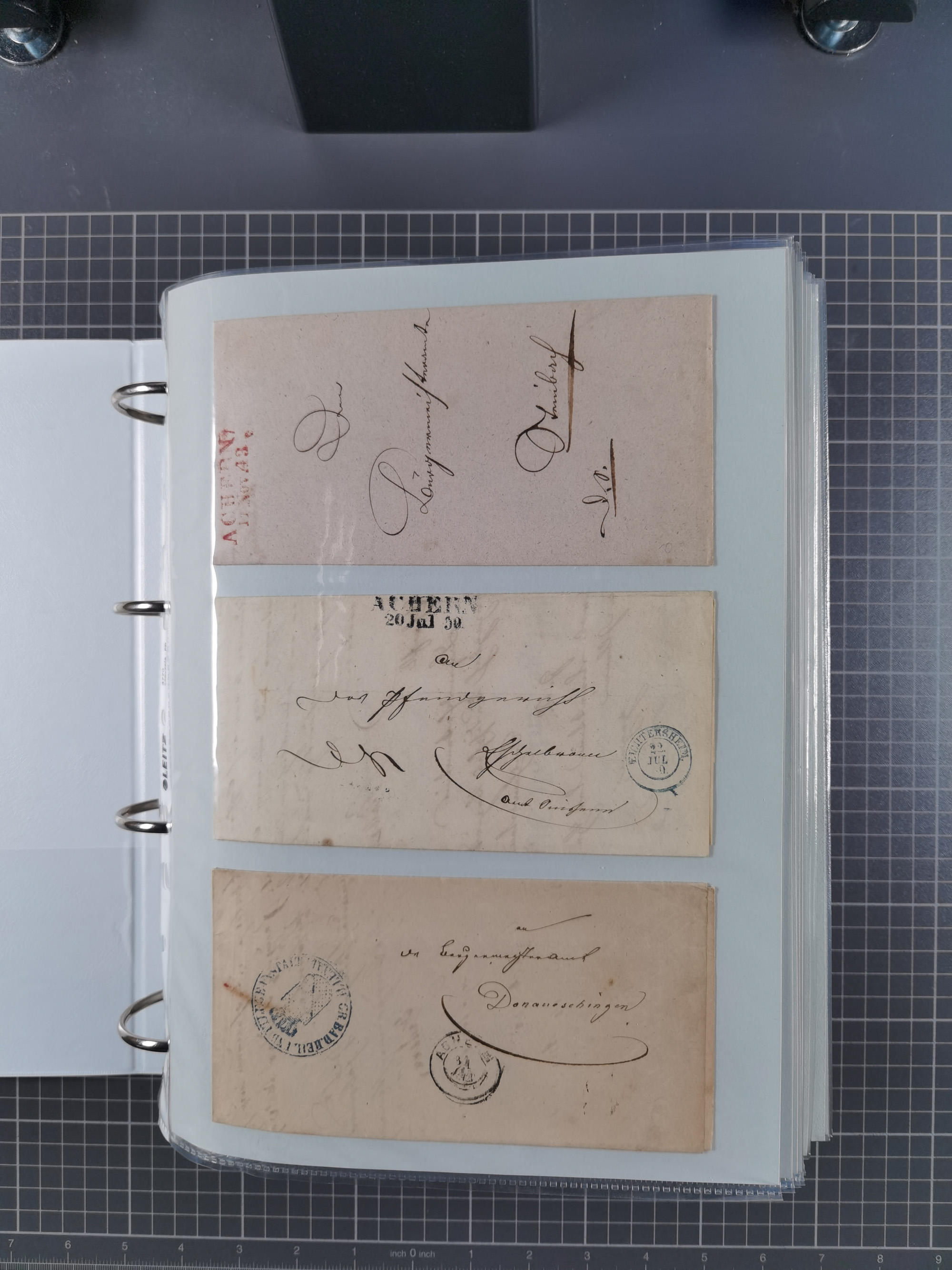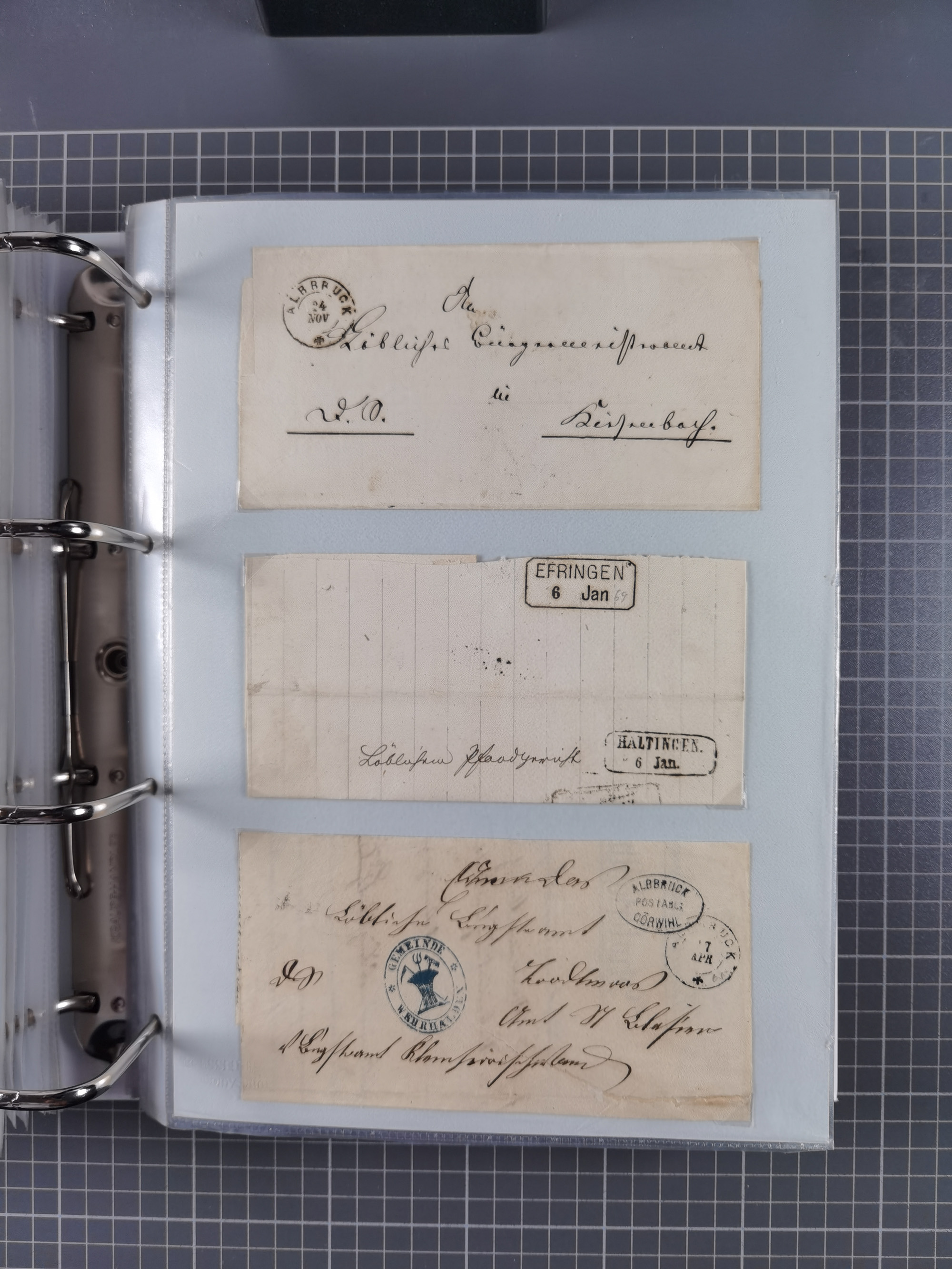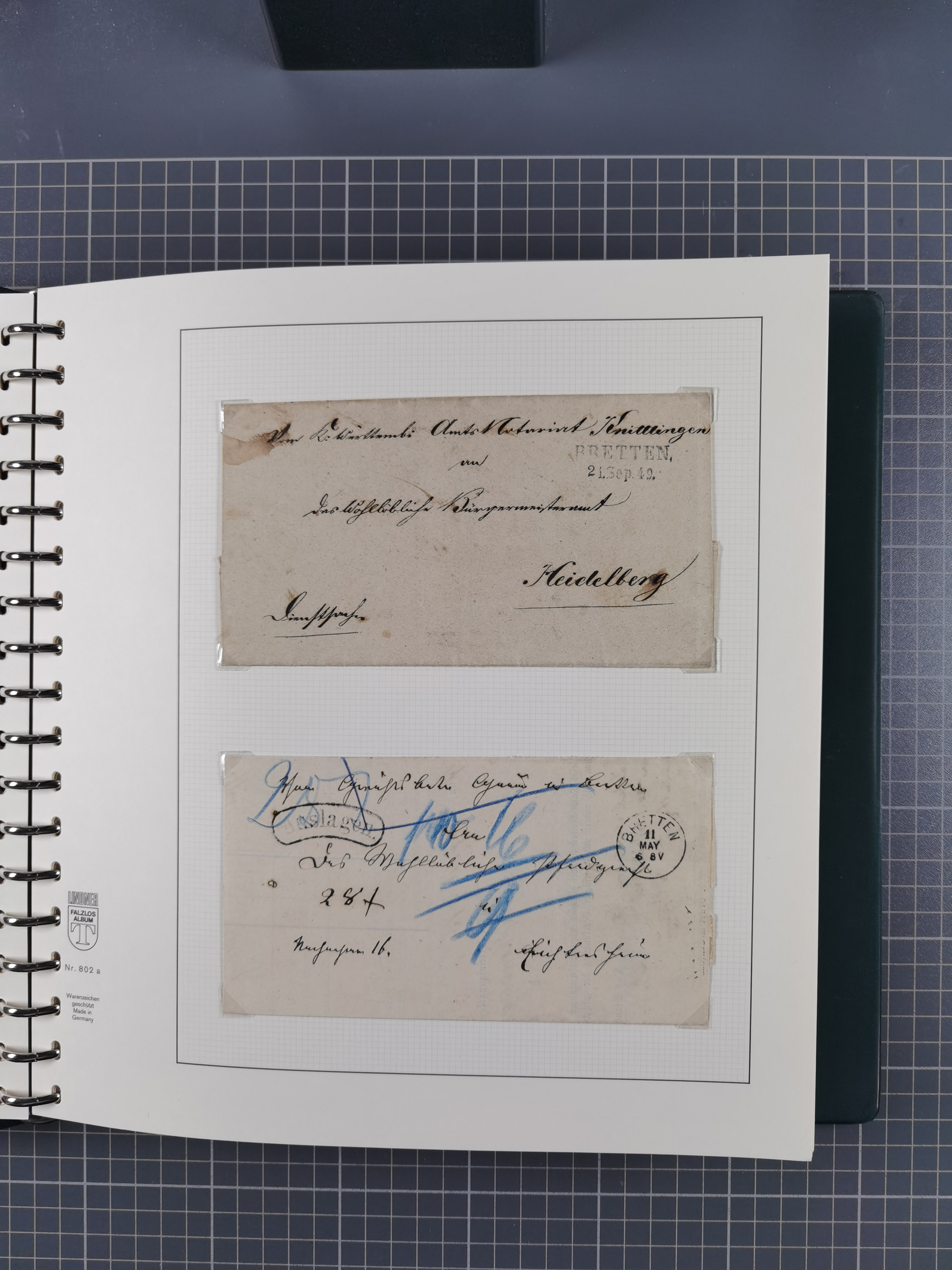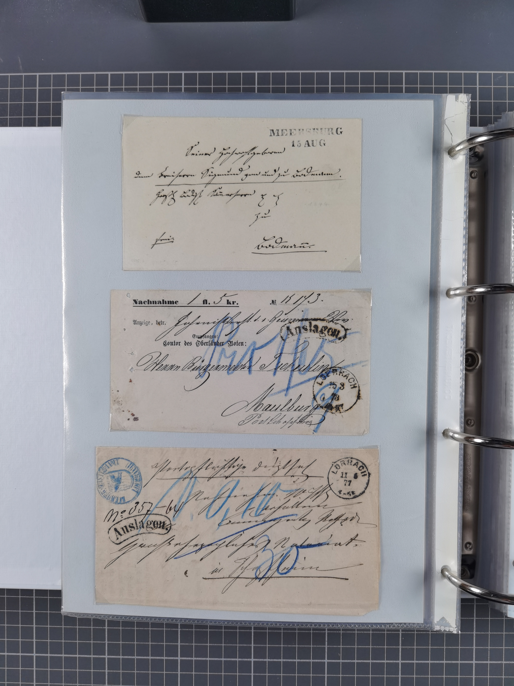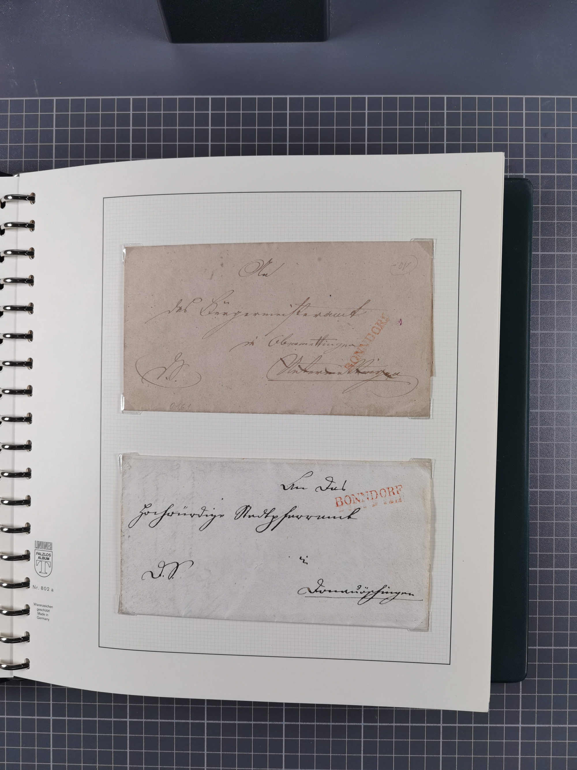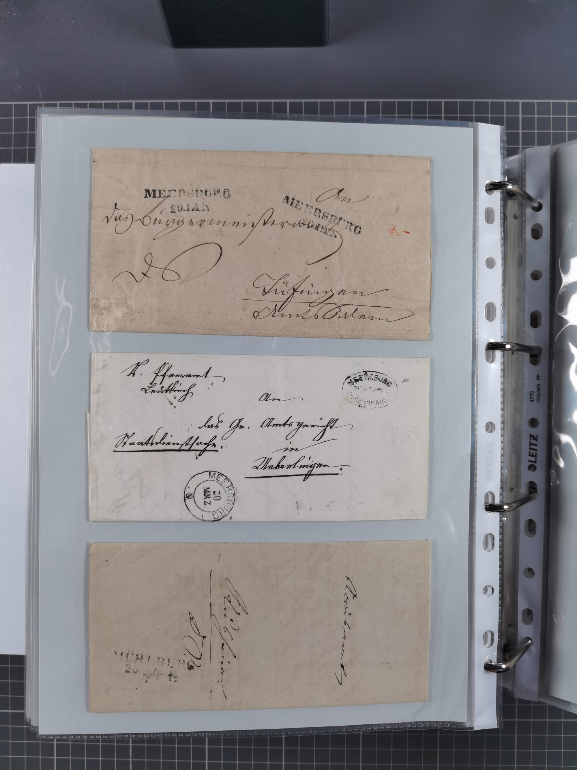 1830/86 (ca.), über 45 meist markenlose Briefe mit Steigbügelstempeln mit Schwerpunkt Württemberg, dabei u.a. HAIGERLOCH in rot auf Vorderseite, ALTSHAUSEN in blau (1844), BLAUFELDEN in waidblau (1850), ECHTERDINGEN in blau (1847), PLOCHINGEN, etc., auch einige Postscheine und Einzelmarken, im Album