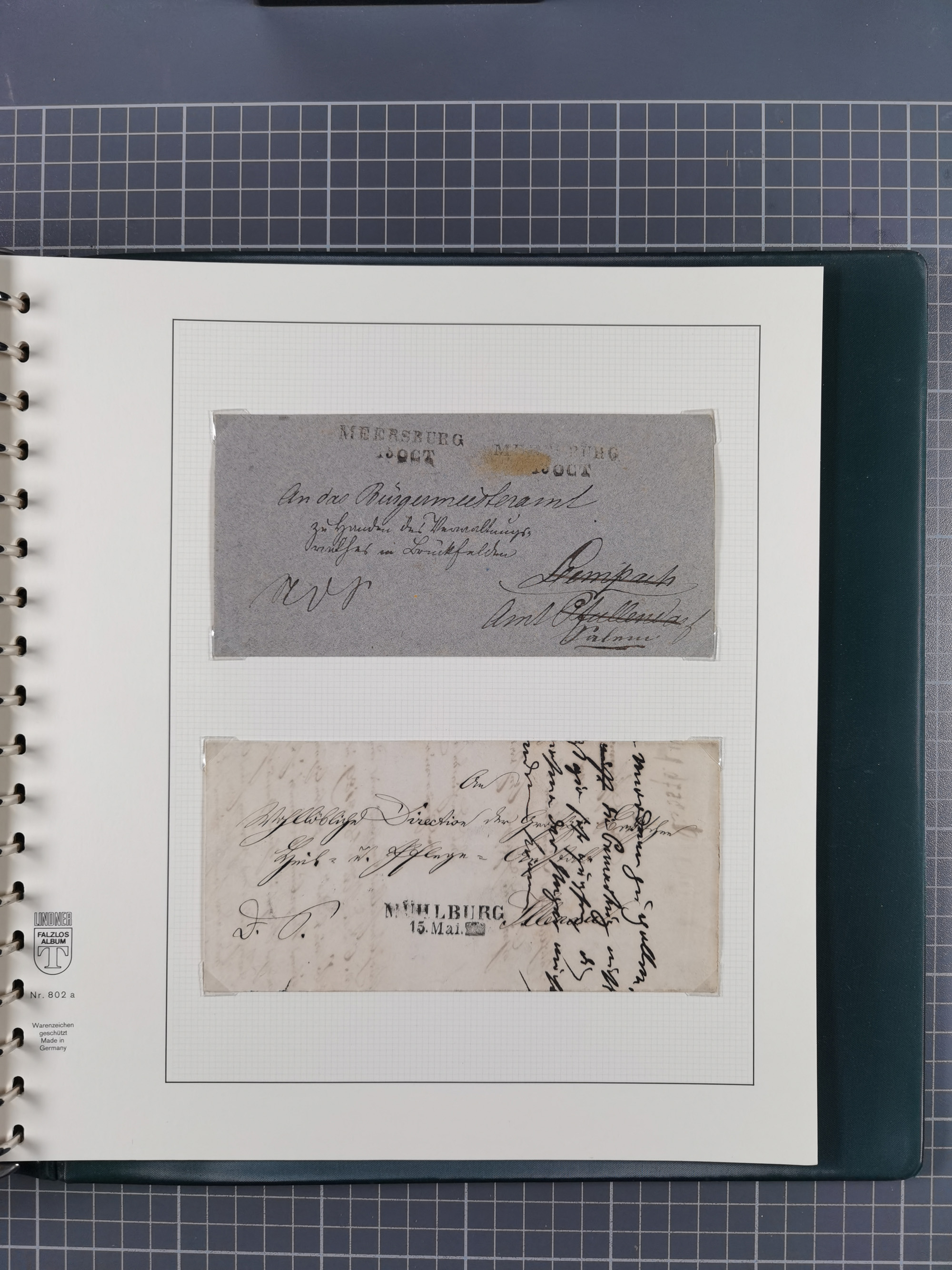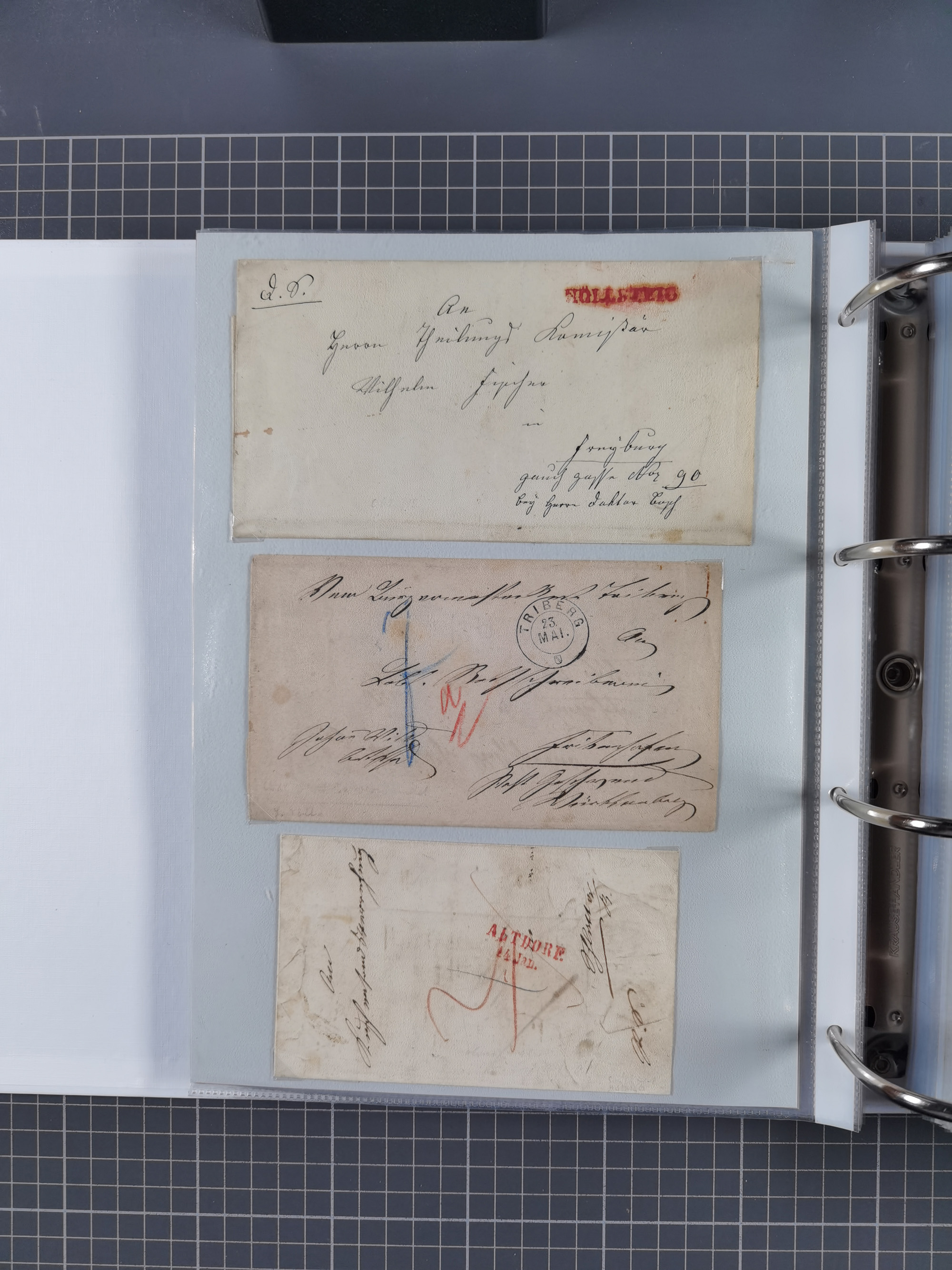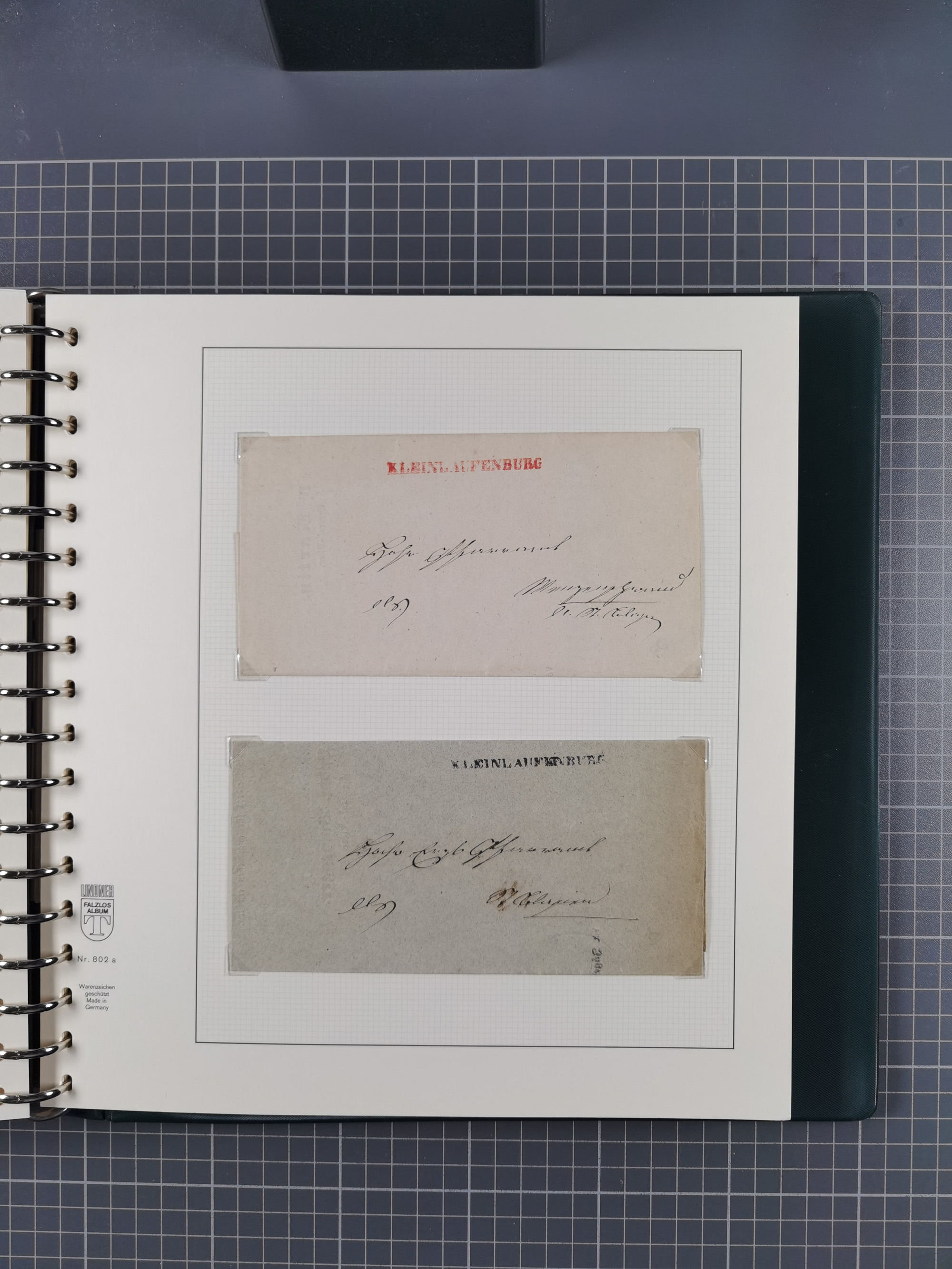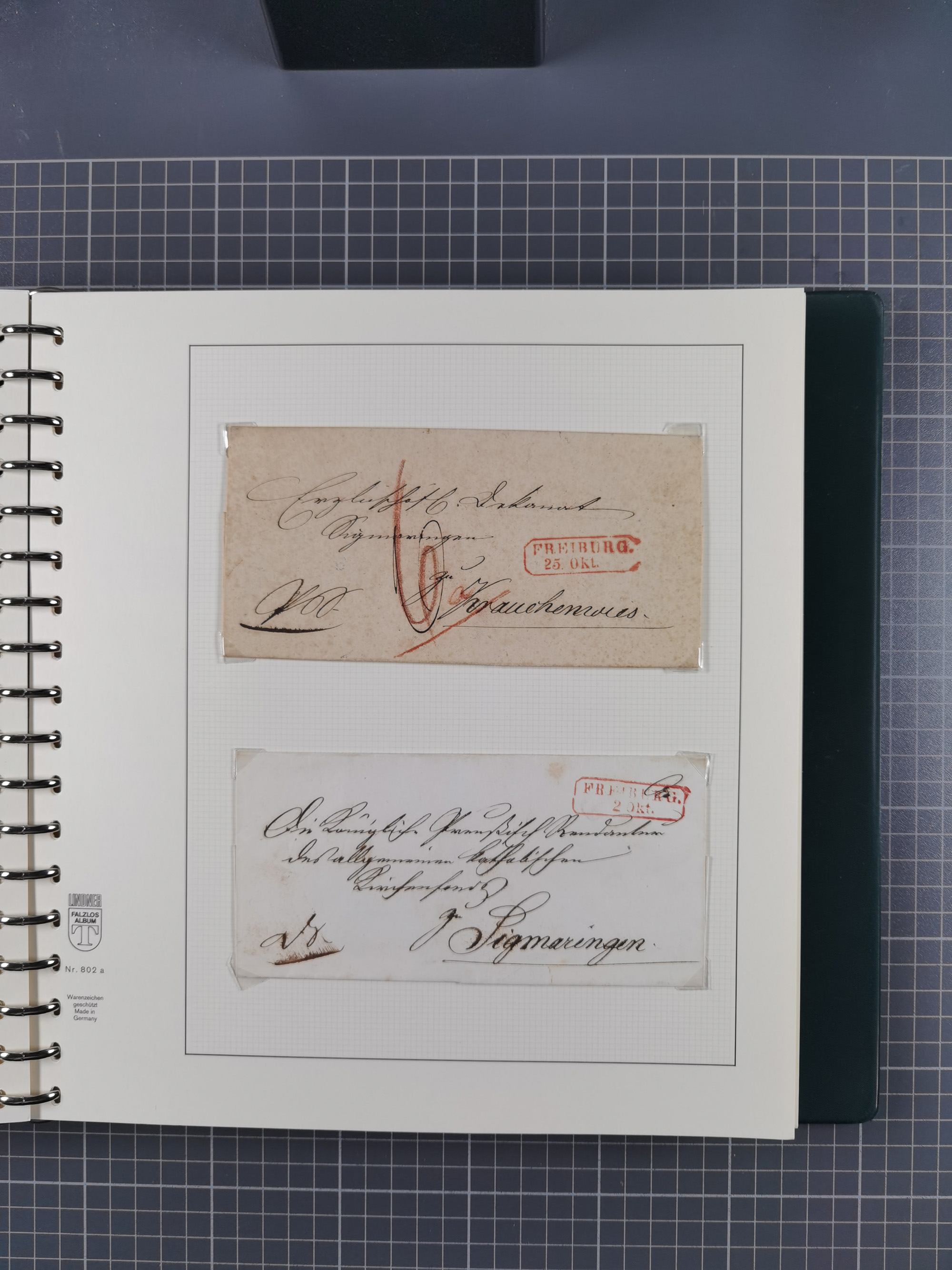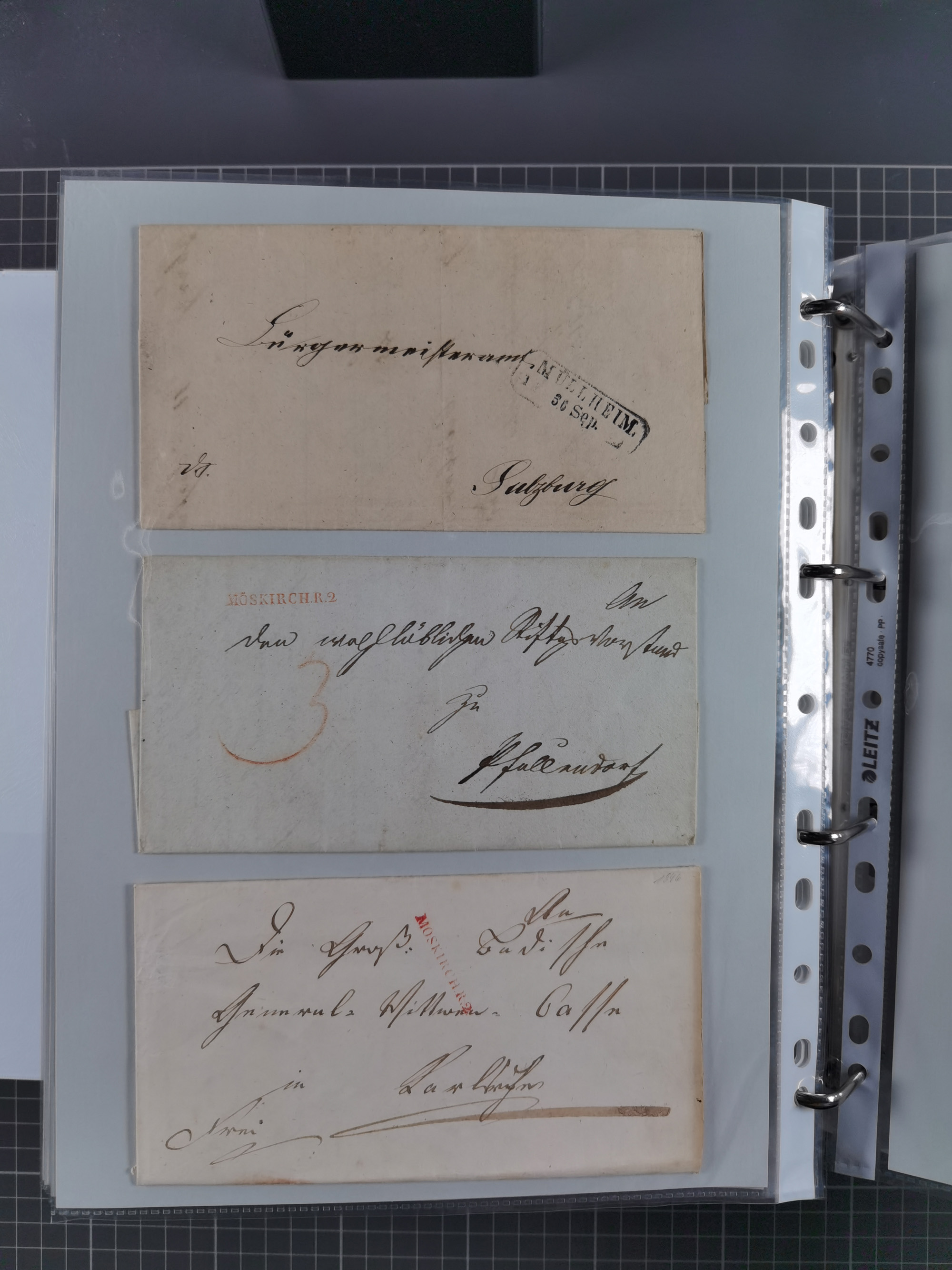 1830/86 (ca.), über 45 meist markenlose Briefe mit Steigbügelstempeln mit Schwerpunkt Württemberg, dabei u.a. HAIGERLOCH in rot auf Vorderseite, ALTSHAUSEN in blau (1844), BLAUFELDEN in waidblau (1850), ECHTERDINGEN in blau (1847), PLOCHINGEN, etc., auch einige Postscheine und Einzelmarken, im Album