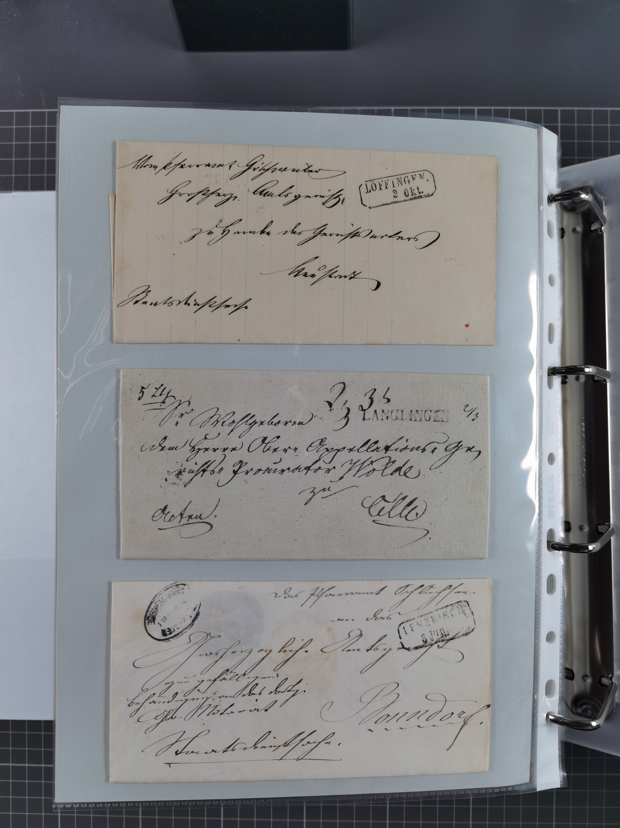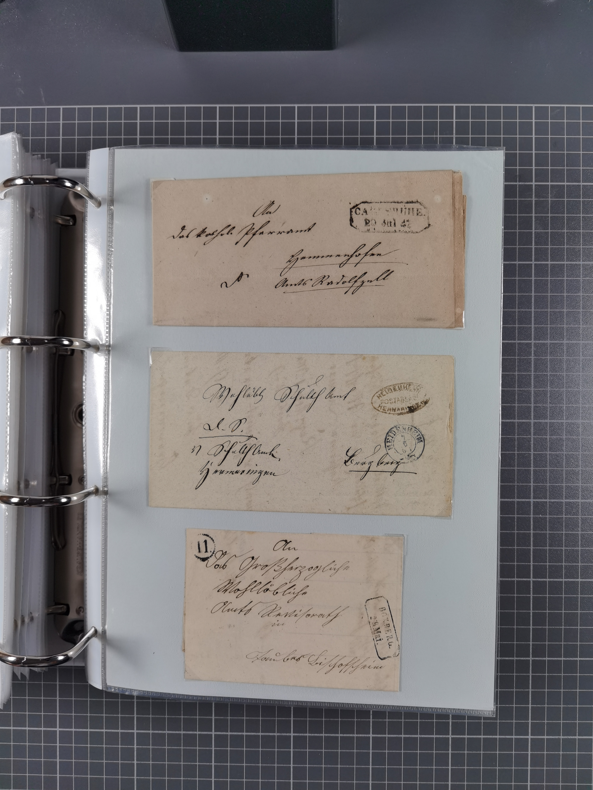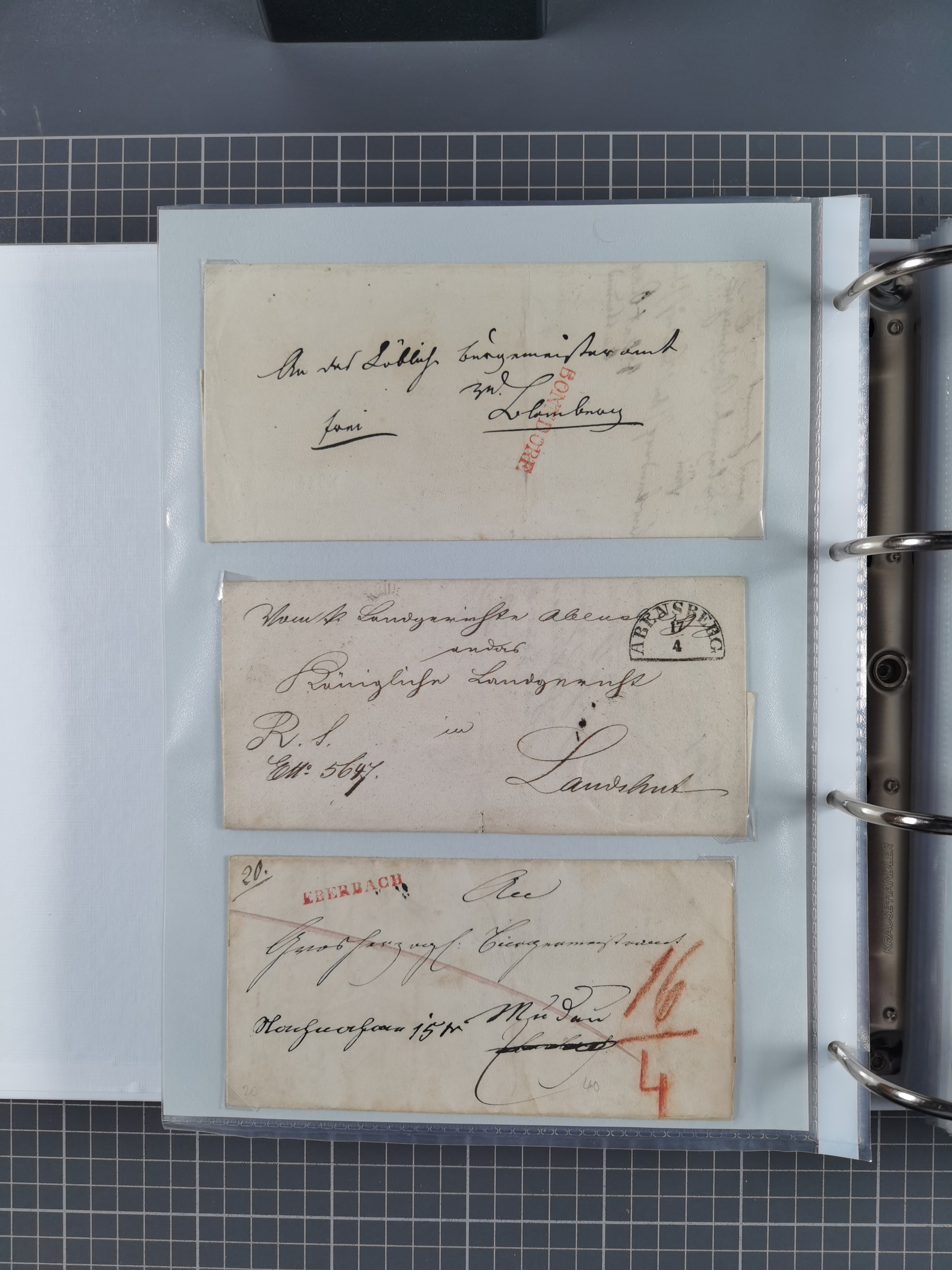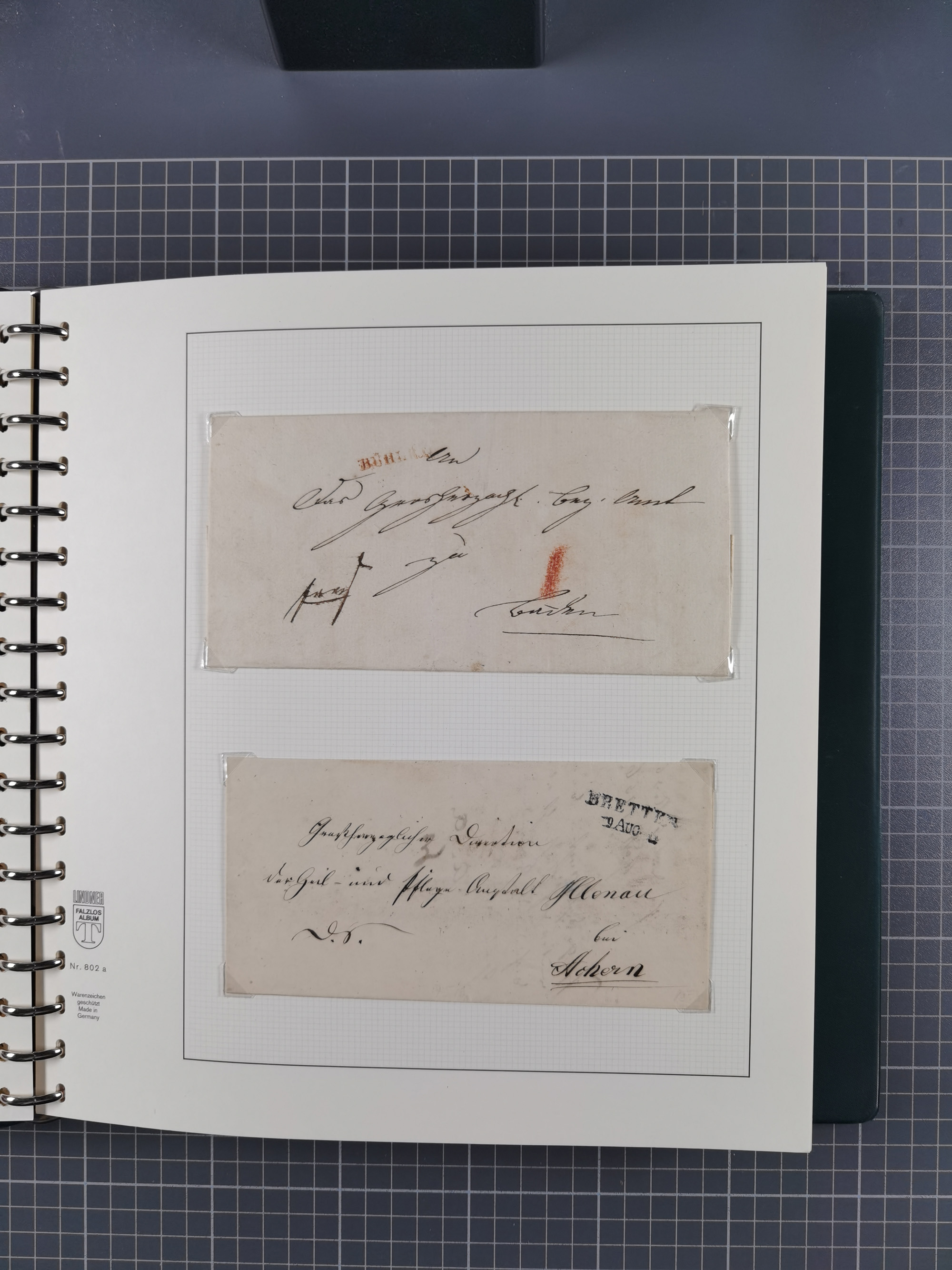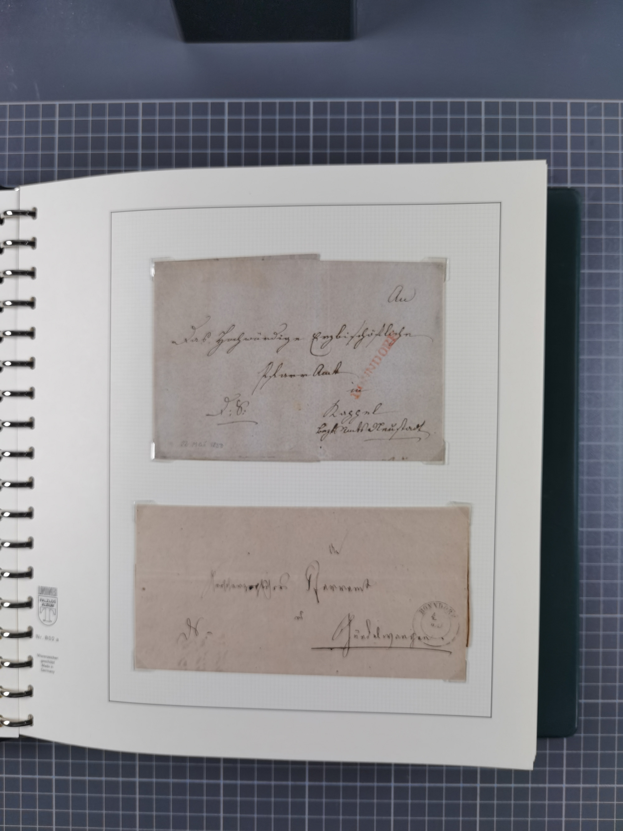1830/86 (ca.), über 45 meist markenlose Briefe mit Steigbügelstempeln mit Schwerpunkt Württemberg, dabei u.a. HAIGERLOCH in rot auf Vorderseite, ALTSHAUSEN in blau (1844), BLAUFELDEN in waidblau (1850), ECHTERDINGEN in blau (1847), PLOCHINGEN, etc., auch einige Postscheine und Einzelmarken, im Album