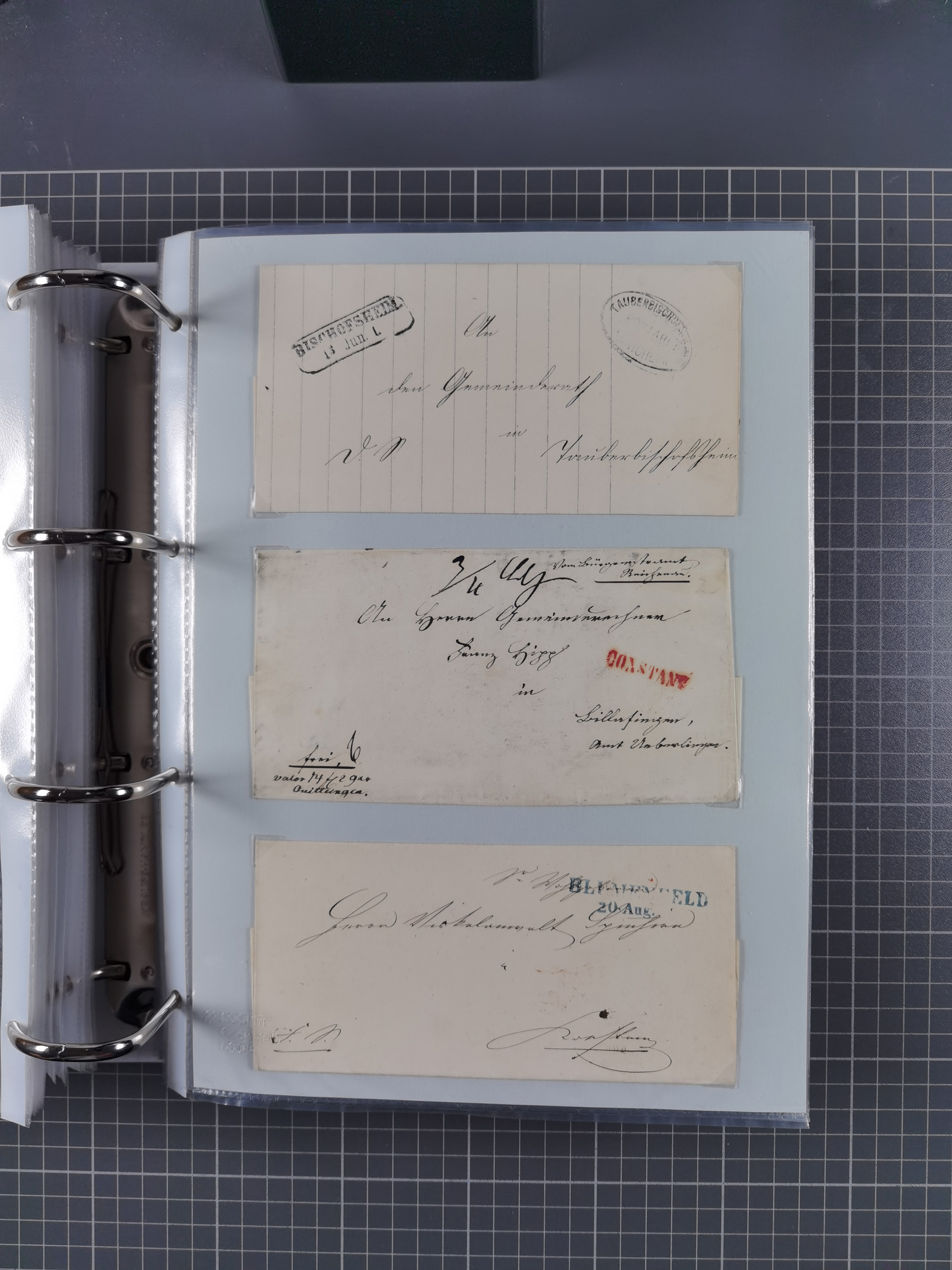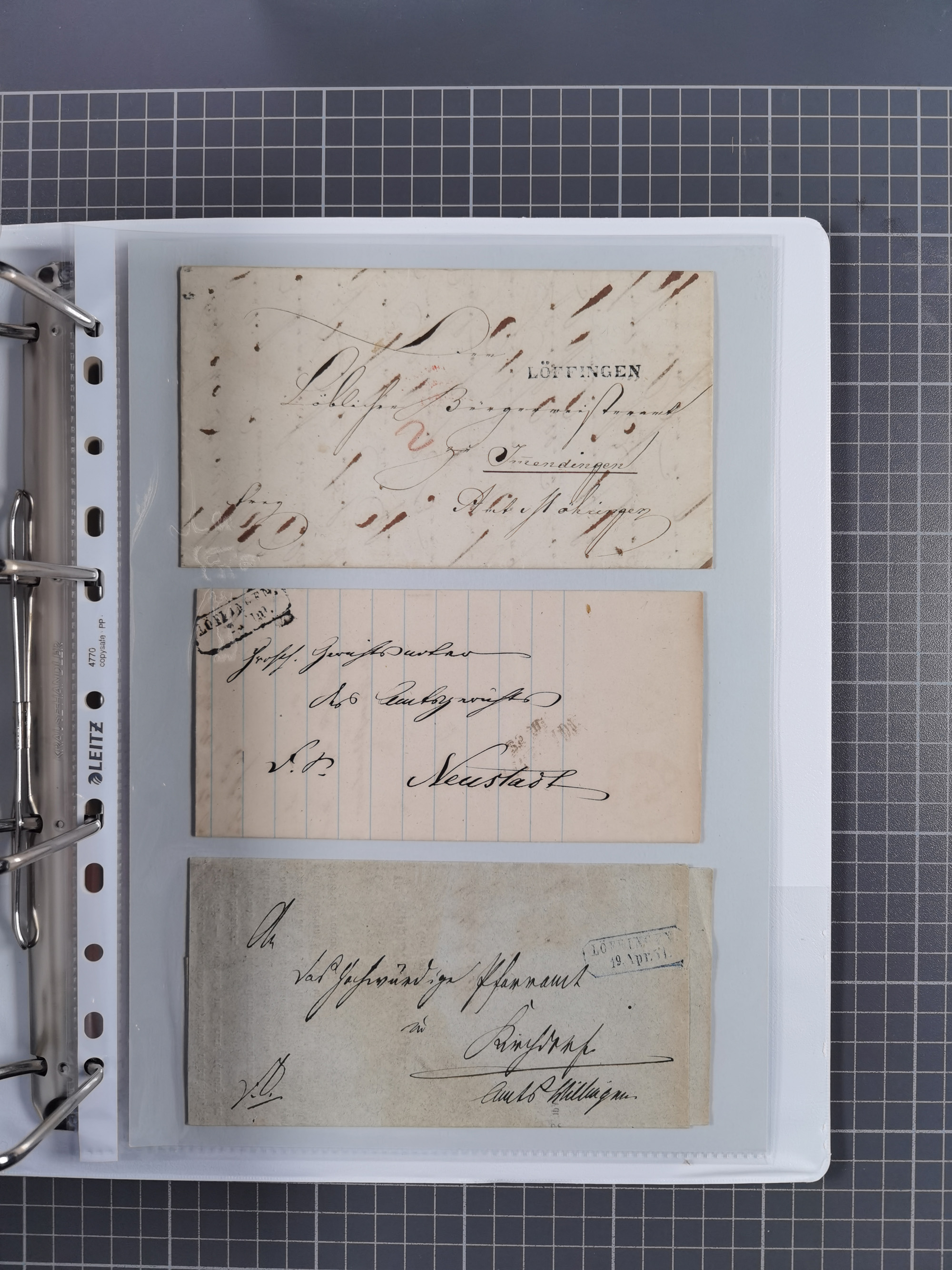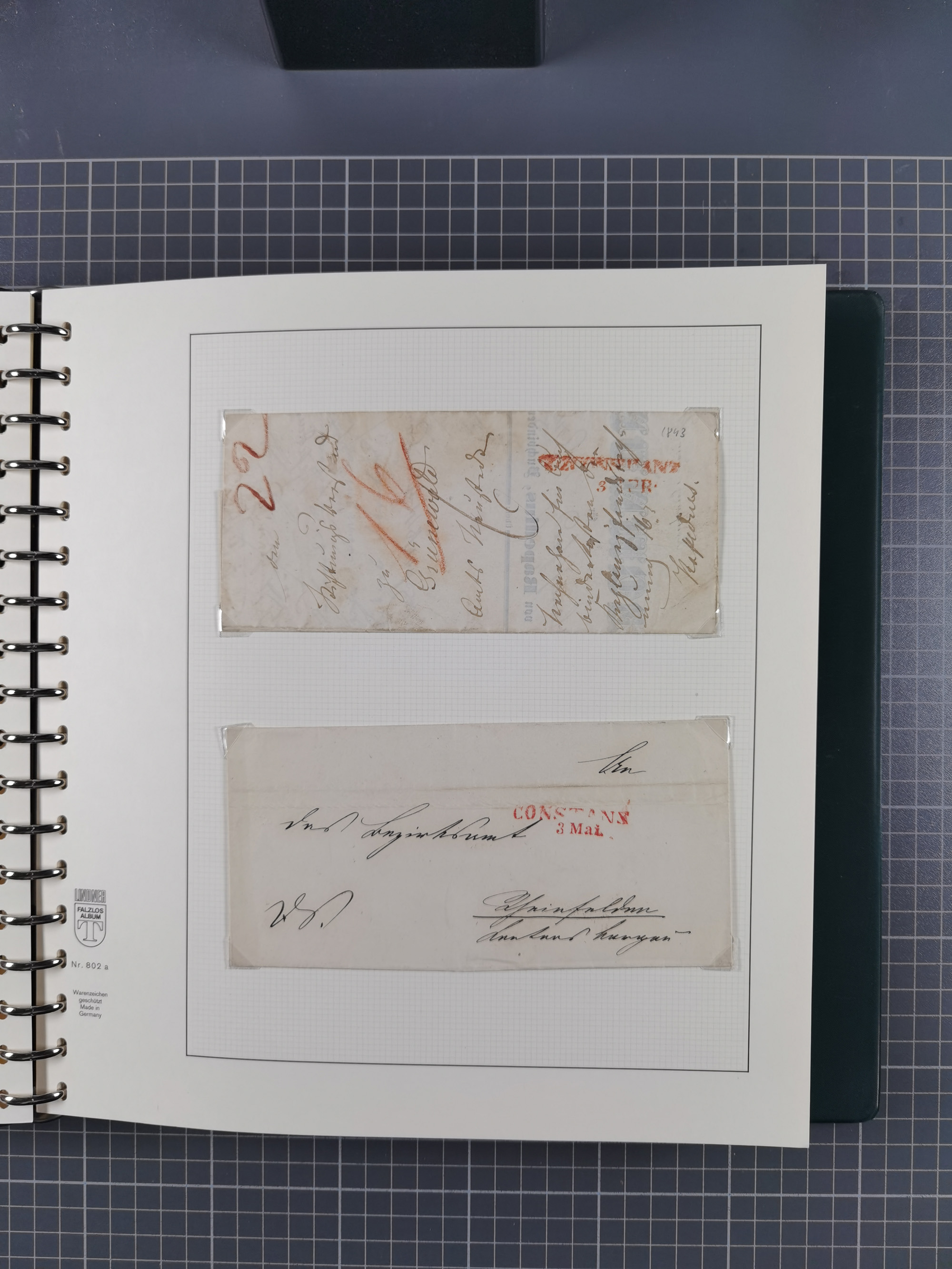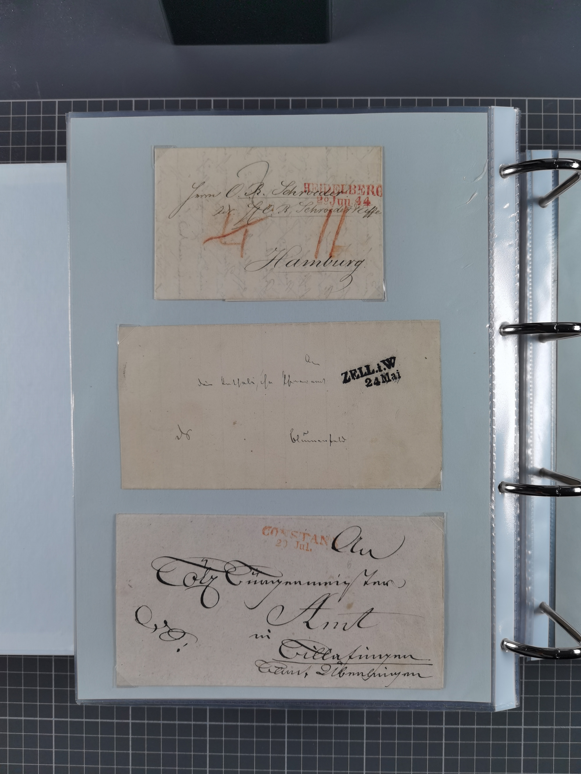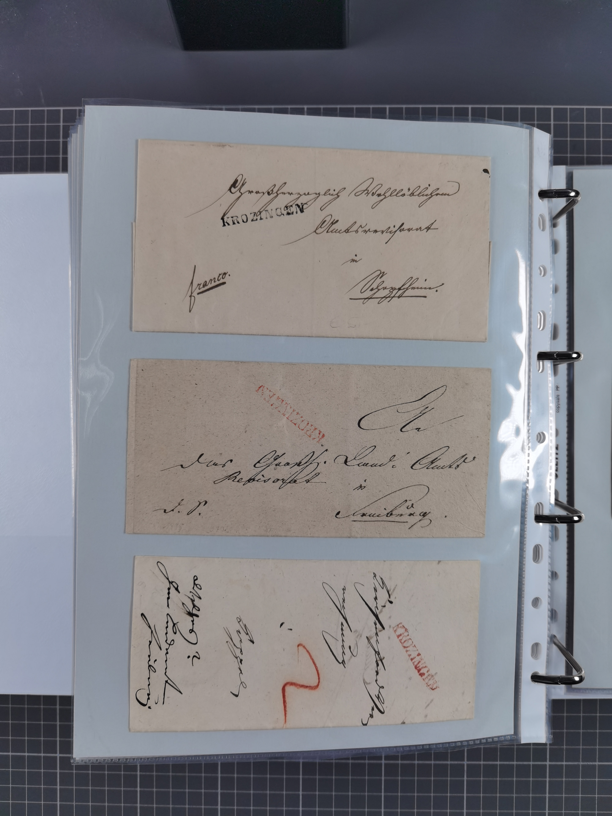 1830/86 (ca.), über 45 meist markenlose Briefe mit Steigbügelstempeln mit Schwerpunkt Württemberg, dabei u.a. HAIGERLOCH in rot auf Vorderseite, ALTSHAUSEN in blau (1844), BLAUFELDEN in waidblau (1850), ECHTERDINGEN in blau (1847), PLOCHINGEN, etc., auch einige Postscheine und Einzelmarken, im Album