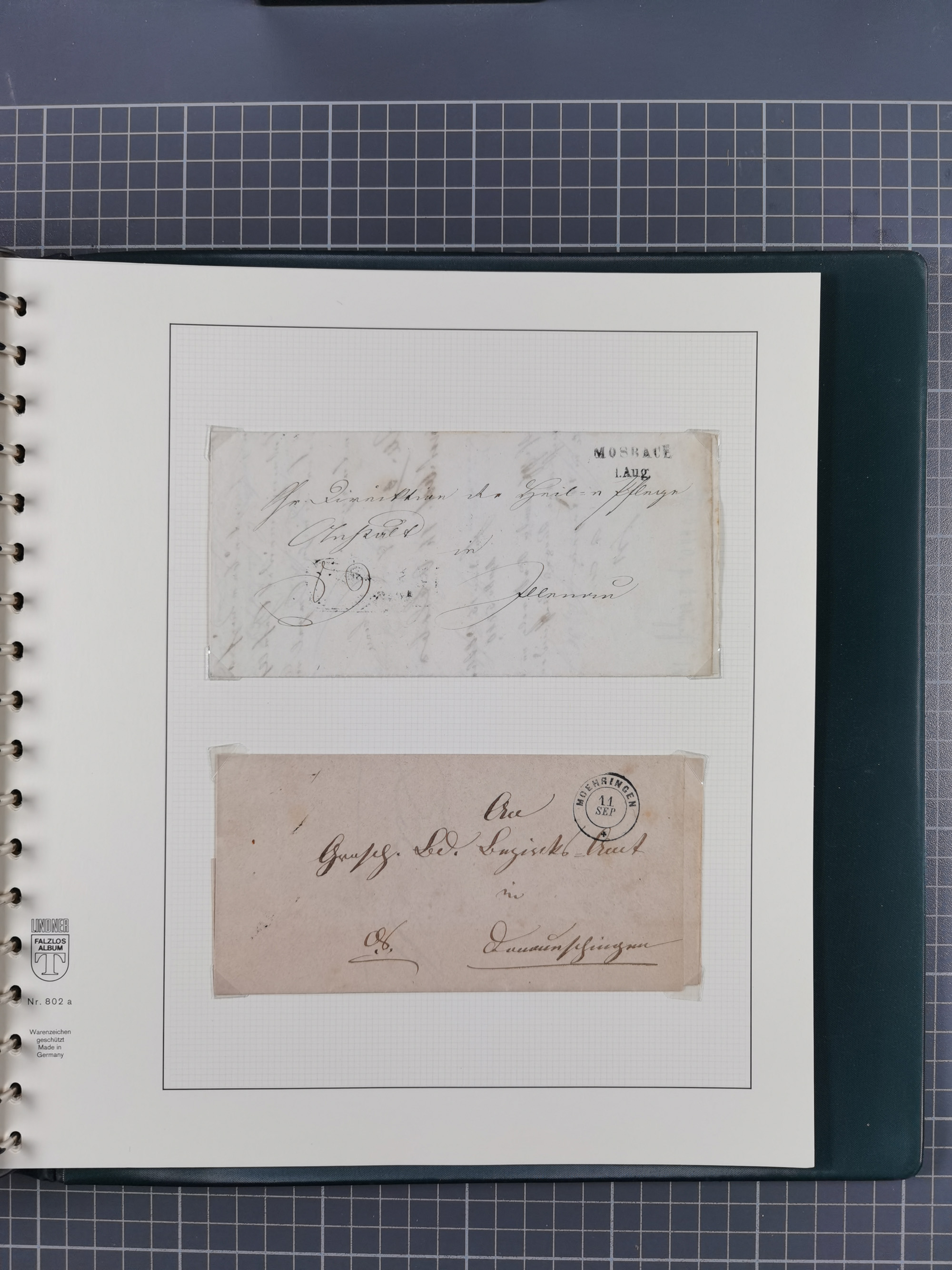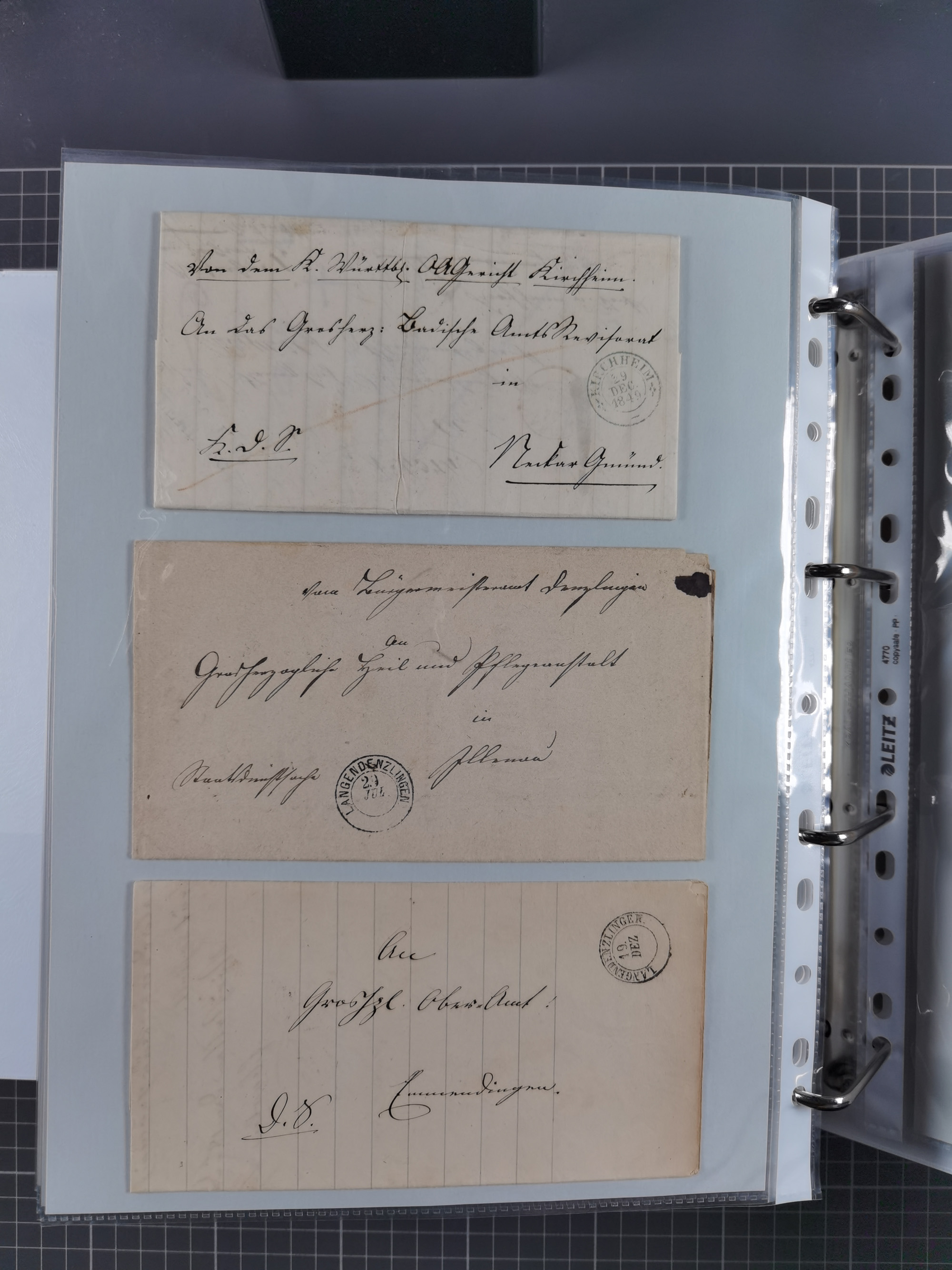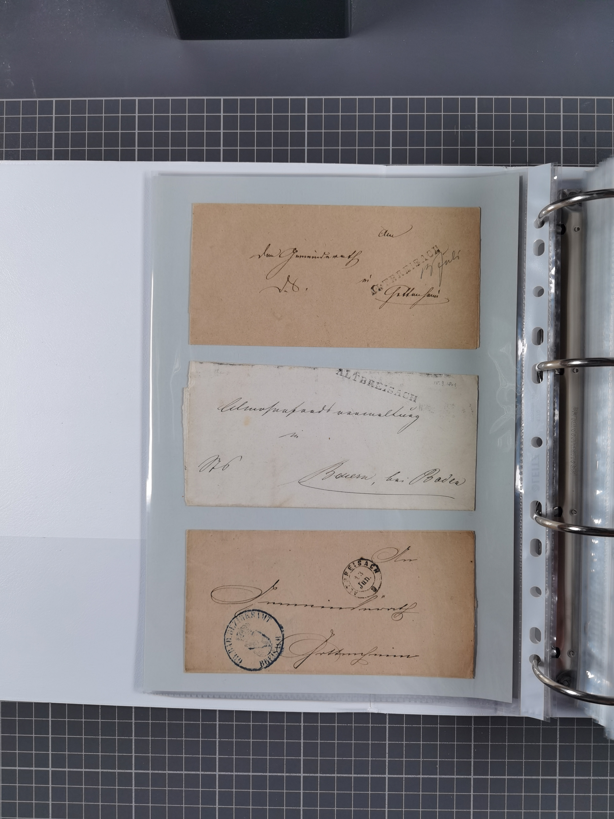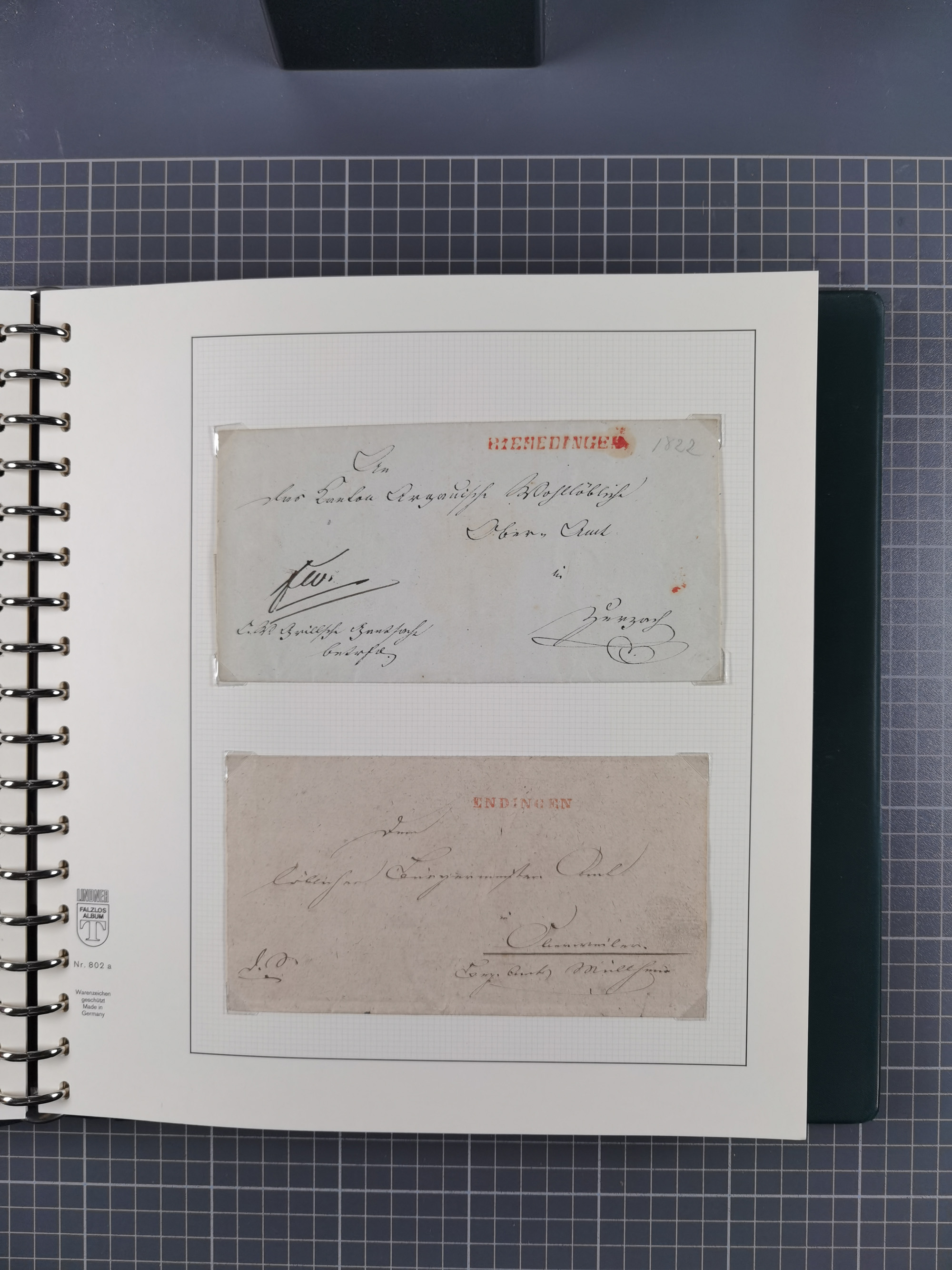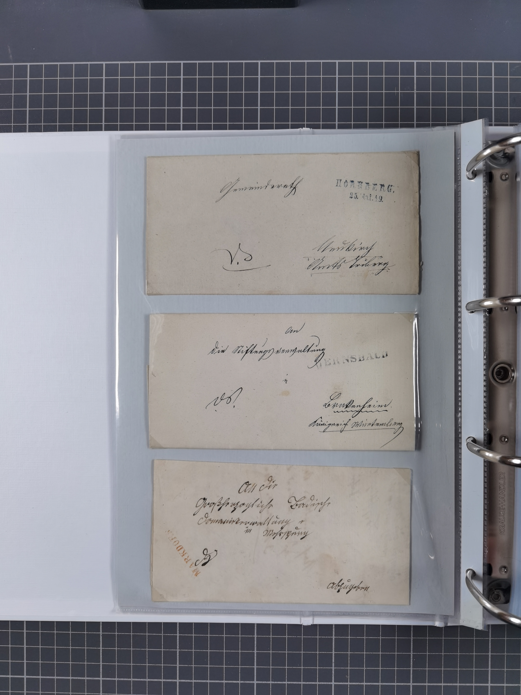 1830/86 (ca.), über 45 meist markenlose Briefe mit Steigbügelstempeln mit Schwerpunkt Württemberg, dabei u.a. HAIGERLOCH in rot auf Vorderseite, ALTSHAUSEN in blau (1844), BLAUFELDEN in waidblau (1850), ECHTERDINGEN in blau (1847), PLOCHINGEN, etc., auch einige Postscheine und Einzelmarken, im Album