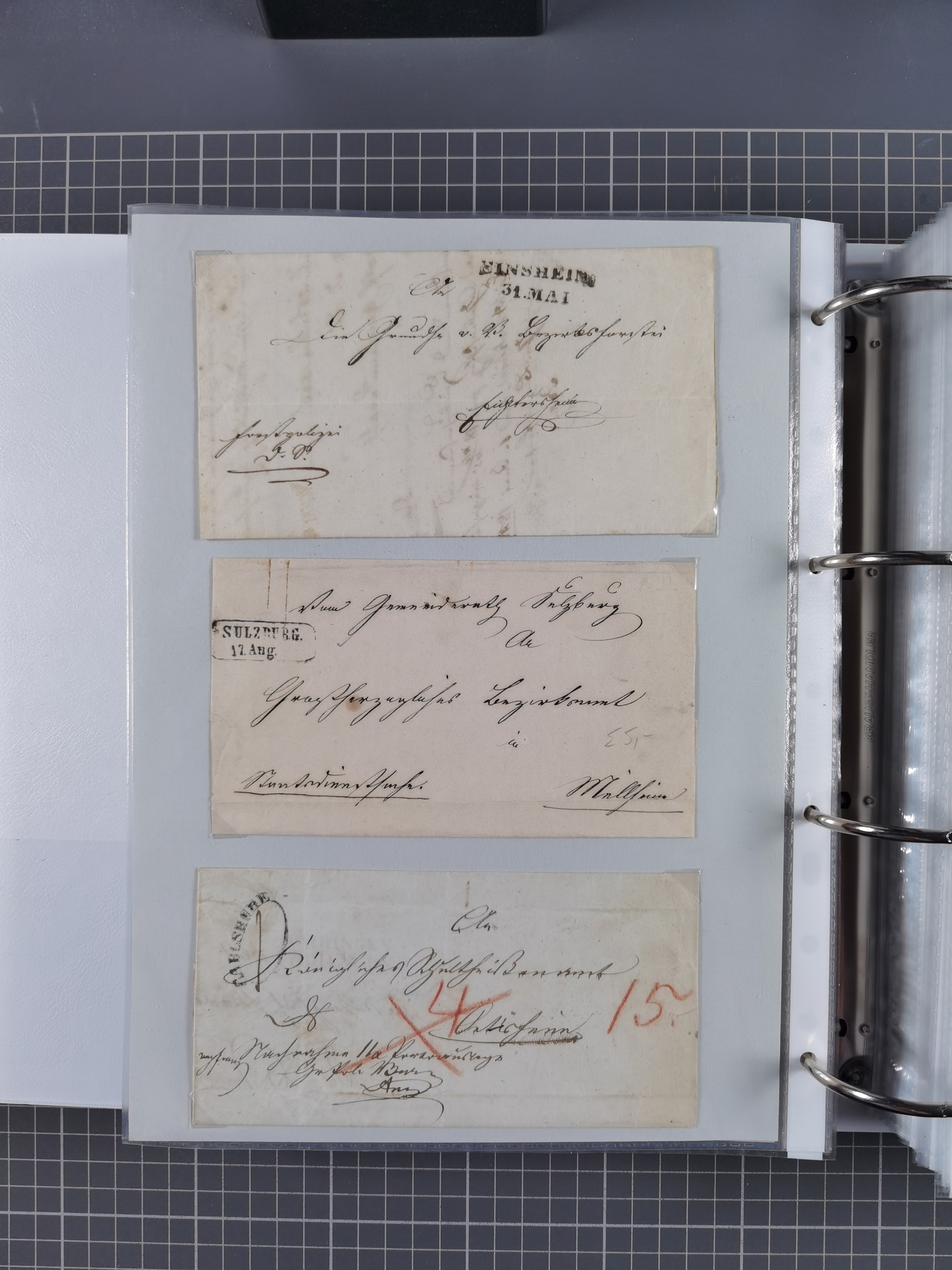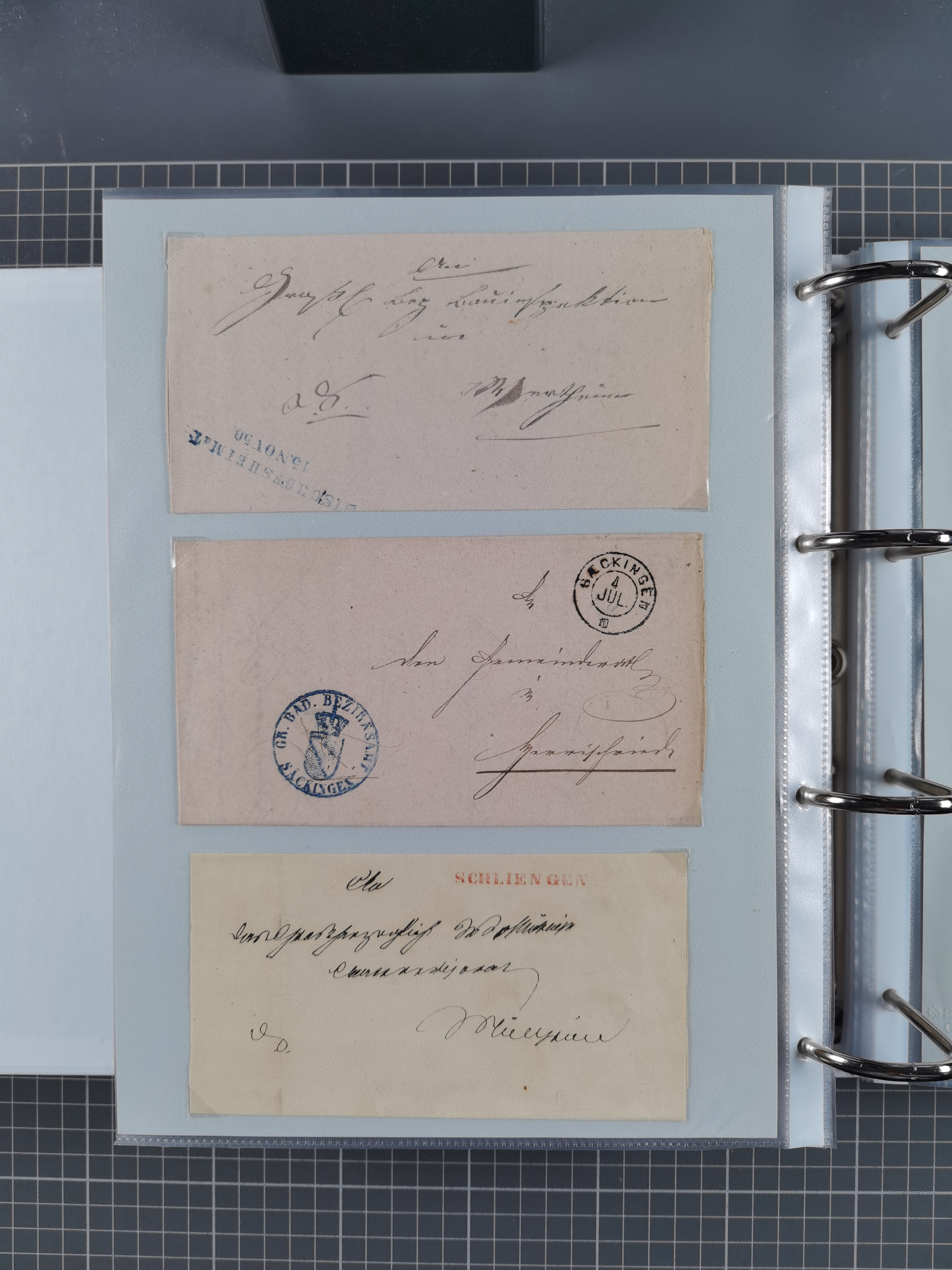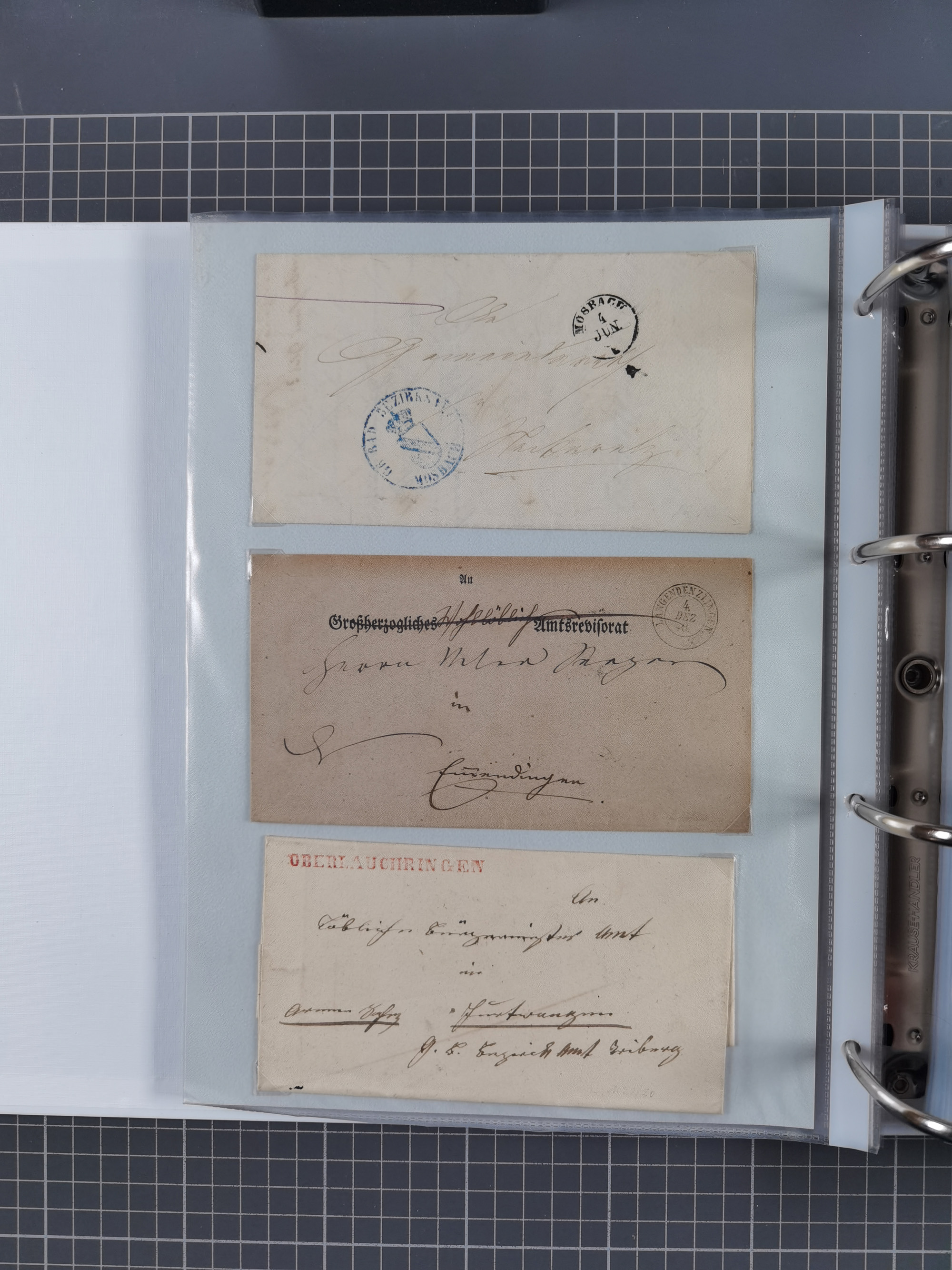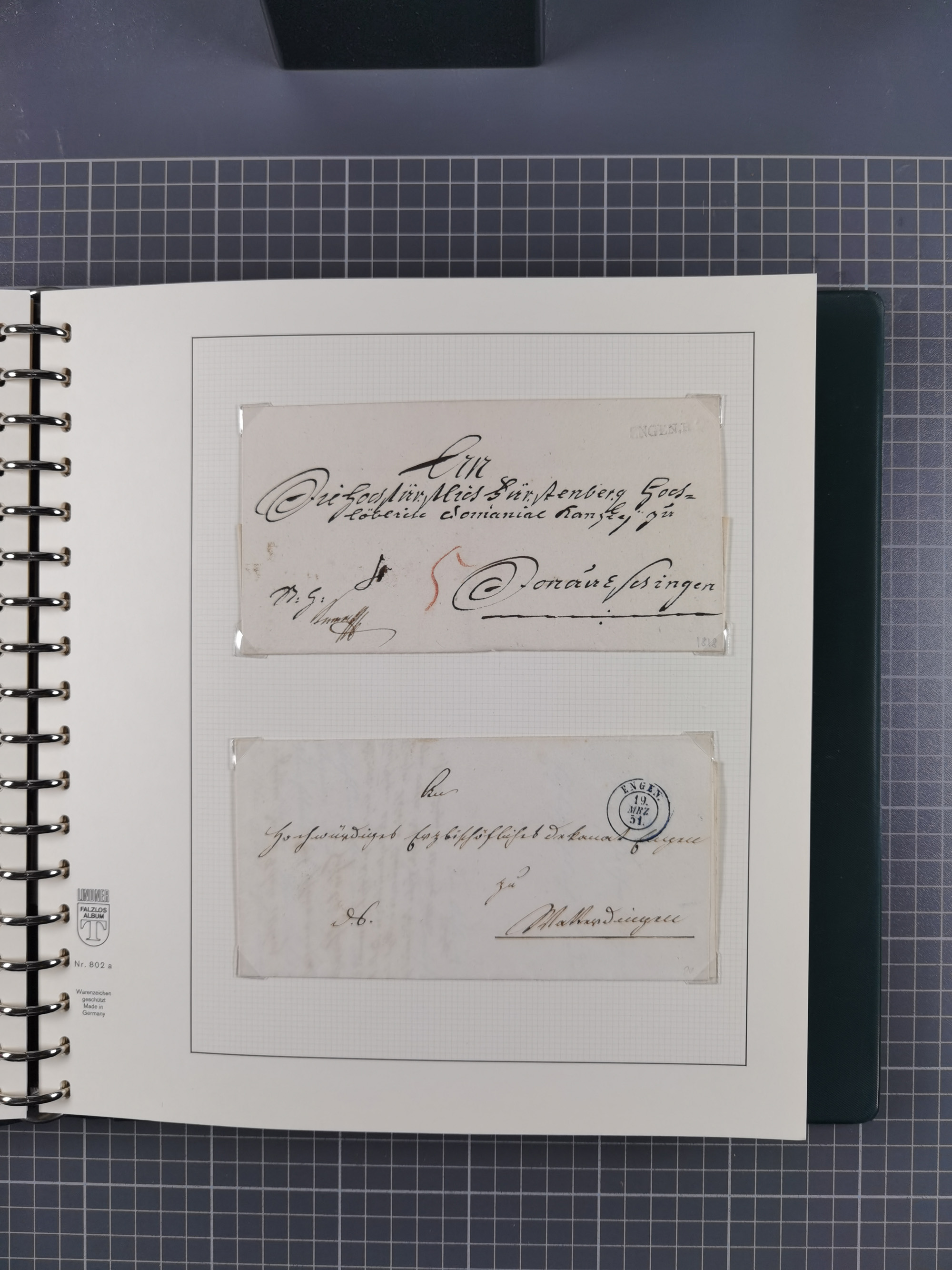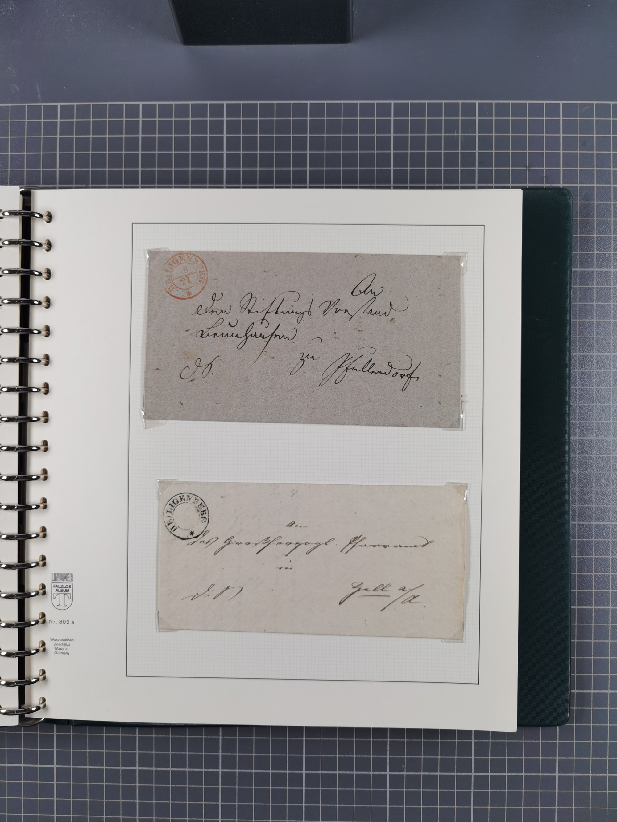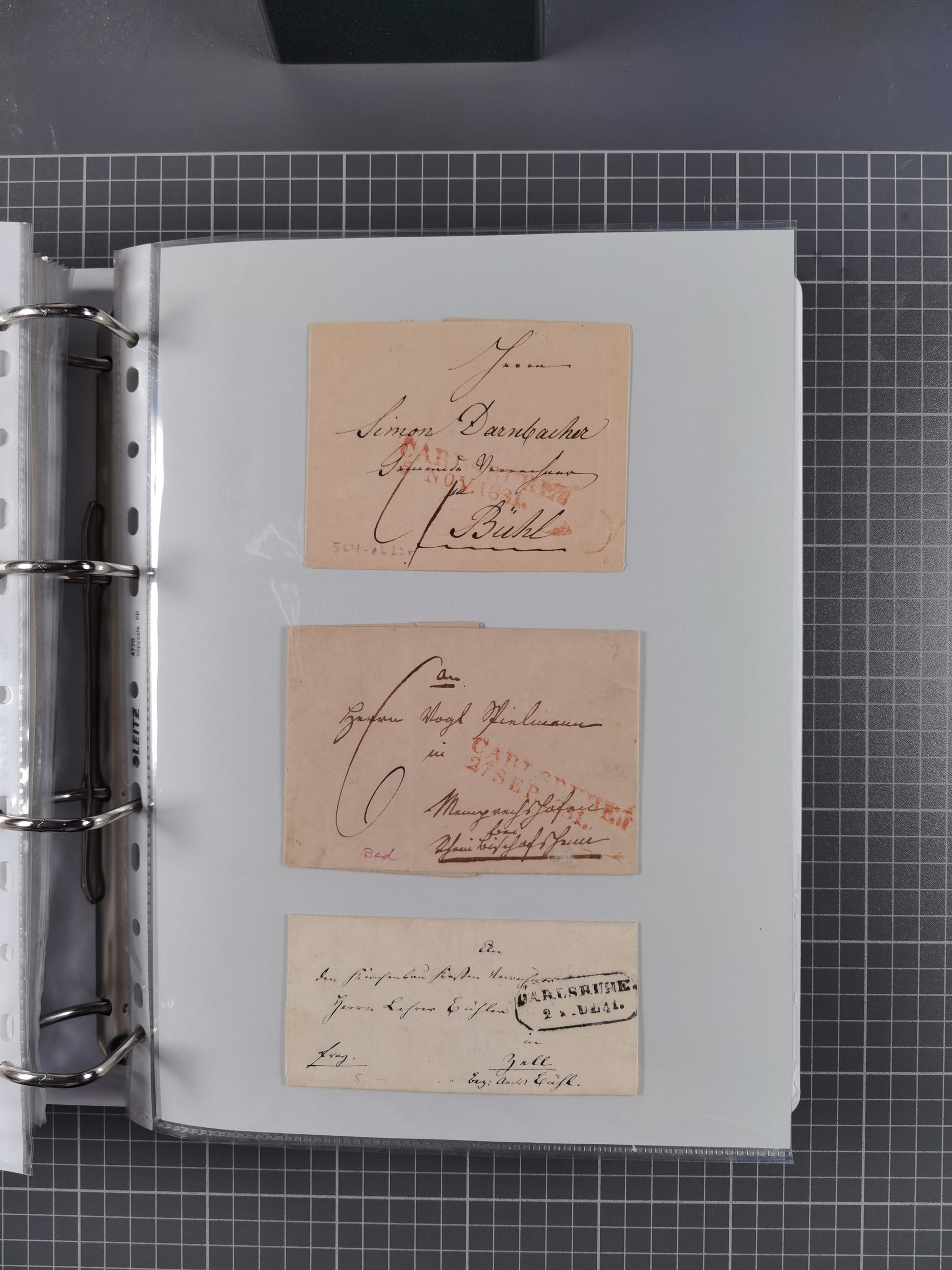 1830/86 (ca.), über 45 meist markenlose Briefe mit Steigbügelstempeln mit Schwerpunkt Württemberg, dabei u.a. HAIGERLOCH in rot auf Vorderseite, ALTSHAUSEN in blau (1844), BLAUFELDEN in waidblau (1850), ECHTERDINGEN in blau (1847), PLOCHINGEN, etc., auch einige Postscheine und Einzelmarken, im Album
