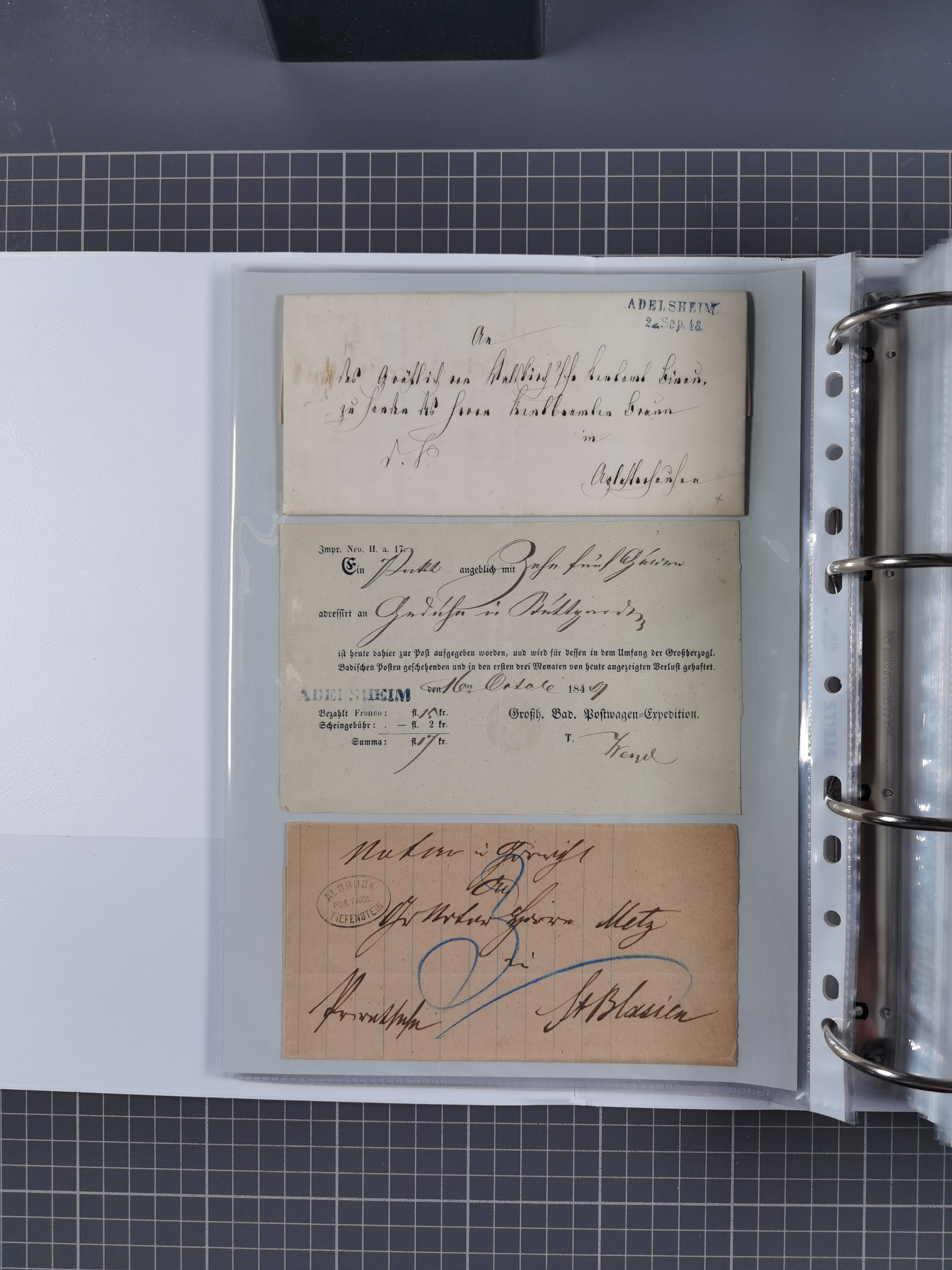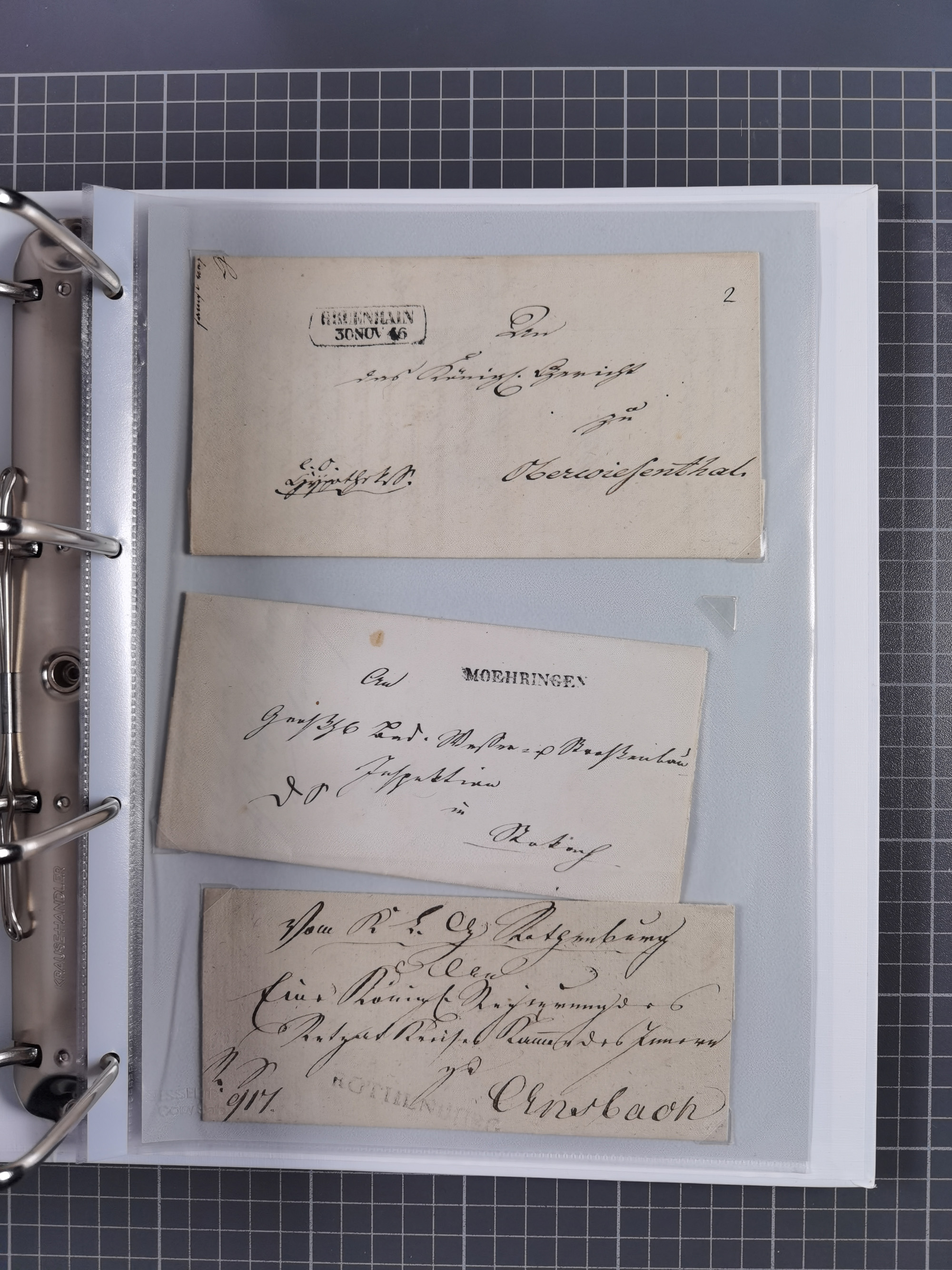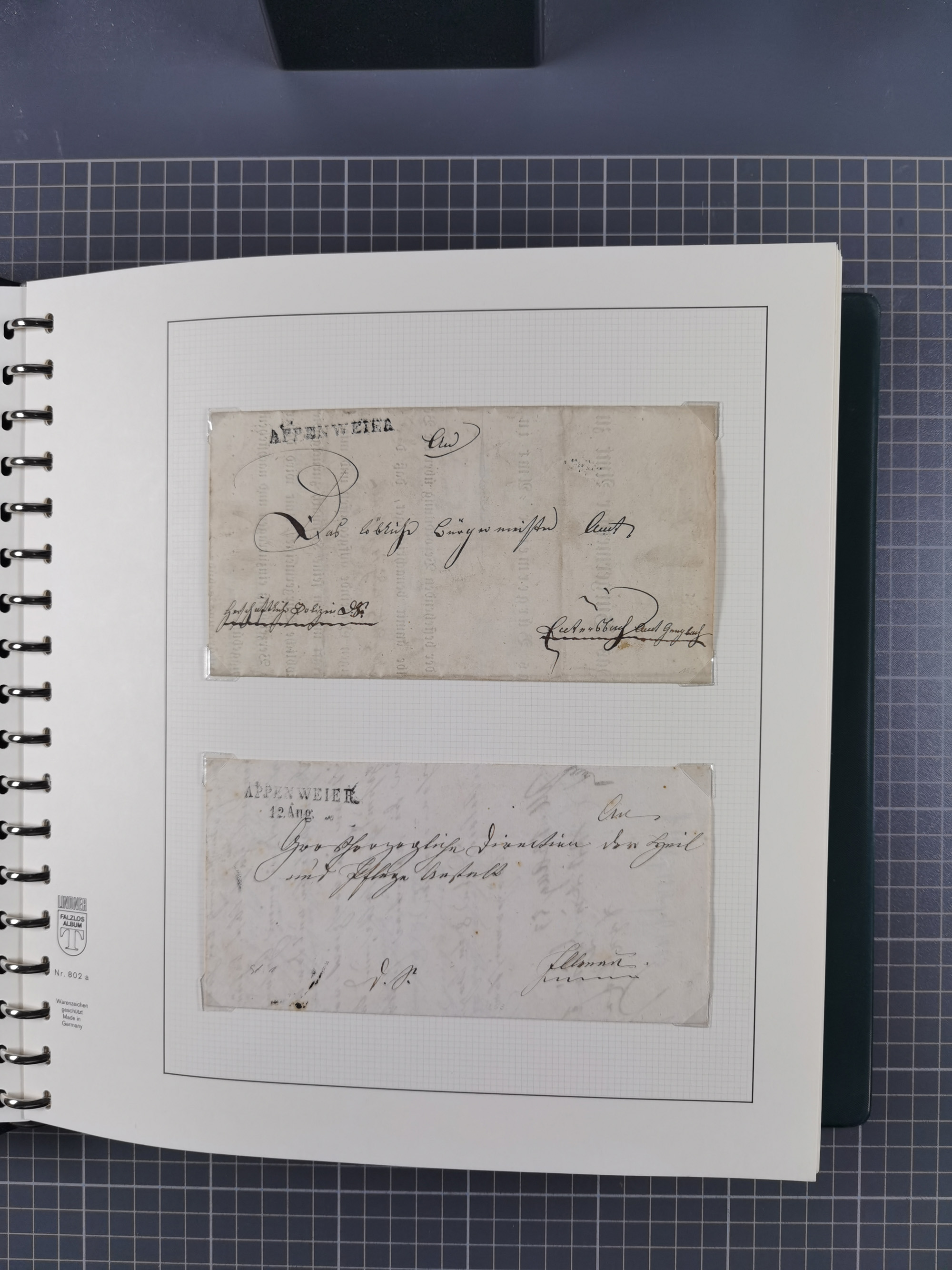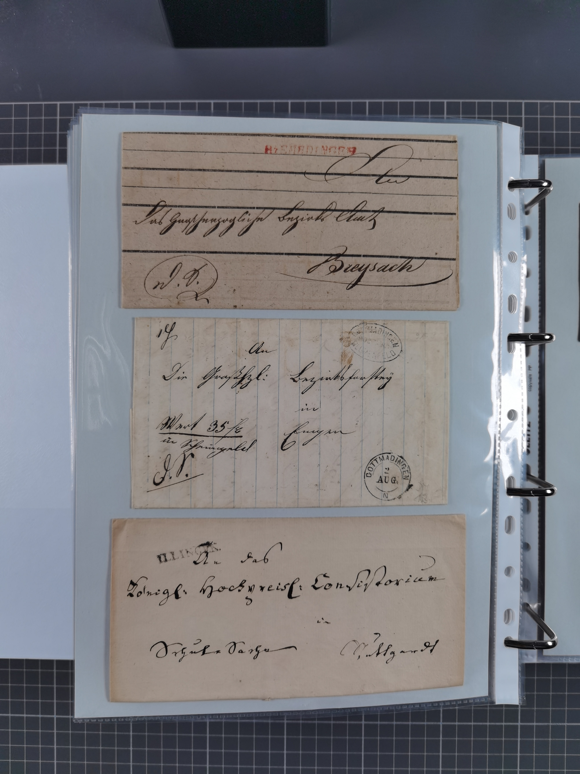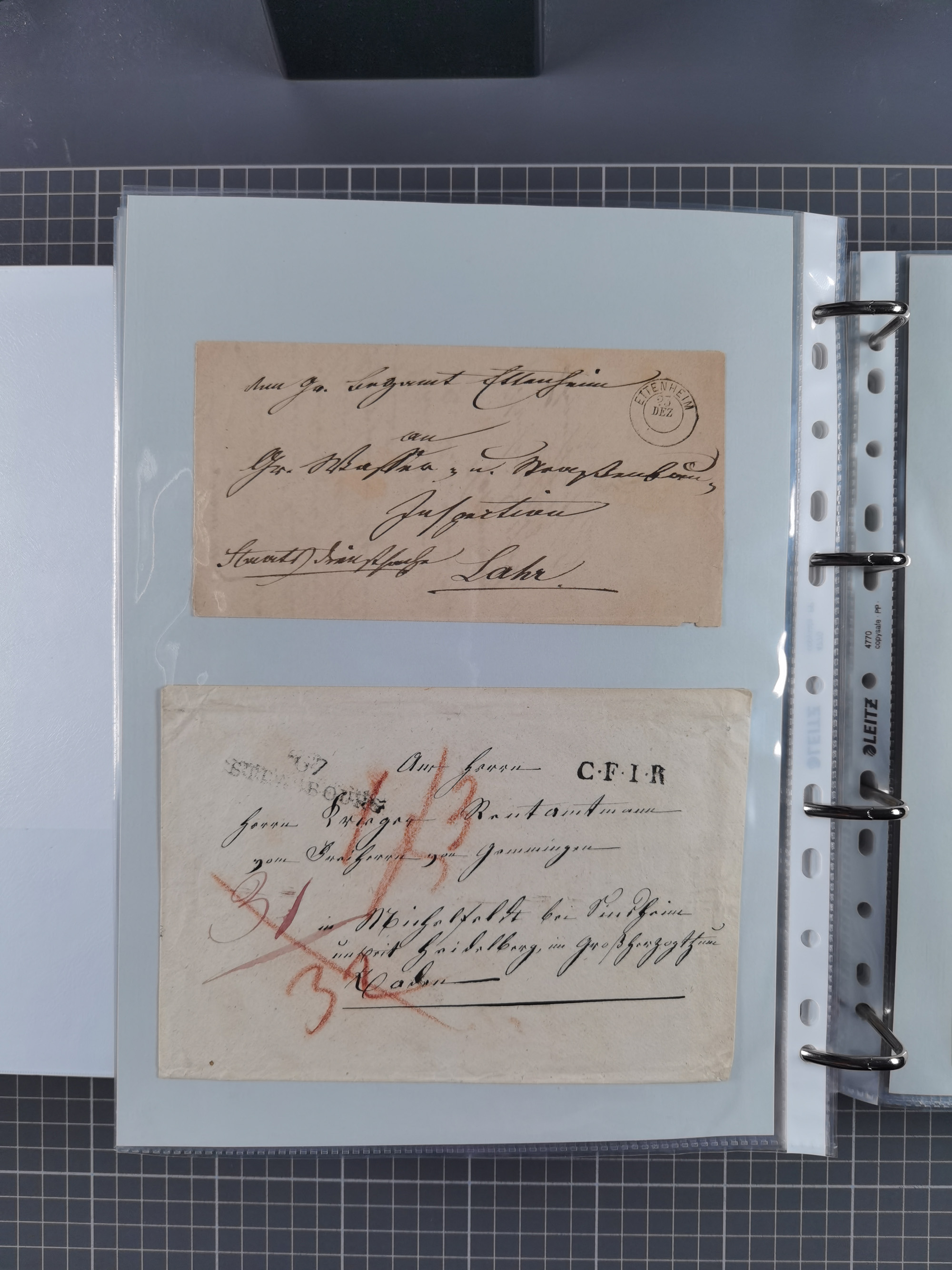 1830/86 (ca.), über 45 meist markenlose Briefe mit Steigbügelstempeln mit Schwerpunkt Württemberg, dabei u.a. HAIGERLOCH in rot auf Vorderseite, ALTSHAUSEN in blau (1844), BLAUFELDEN in waidblau (1850), ECHTERDINGEN in blau (1847), PLOCHINGEN, etc., auch einige Postscheine und Einzelmarken, im Album