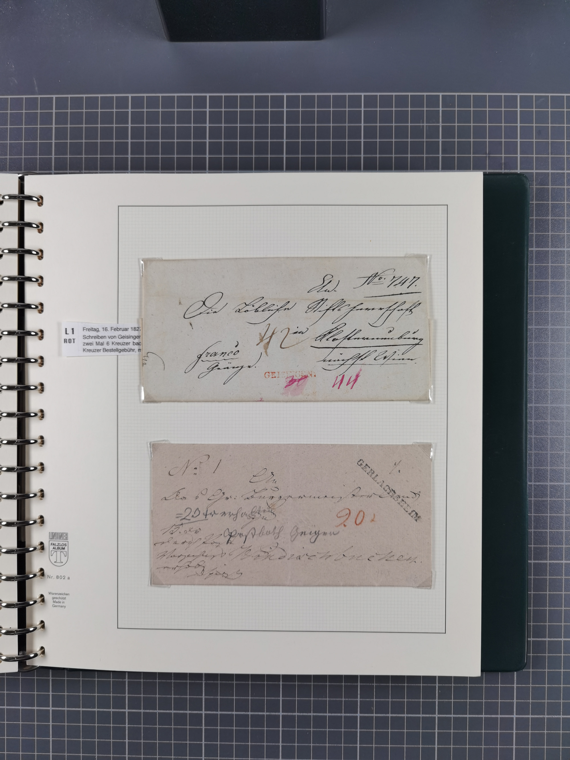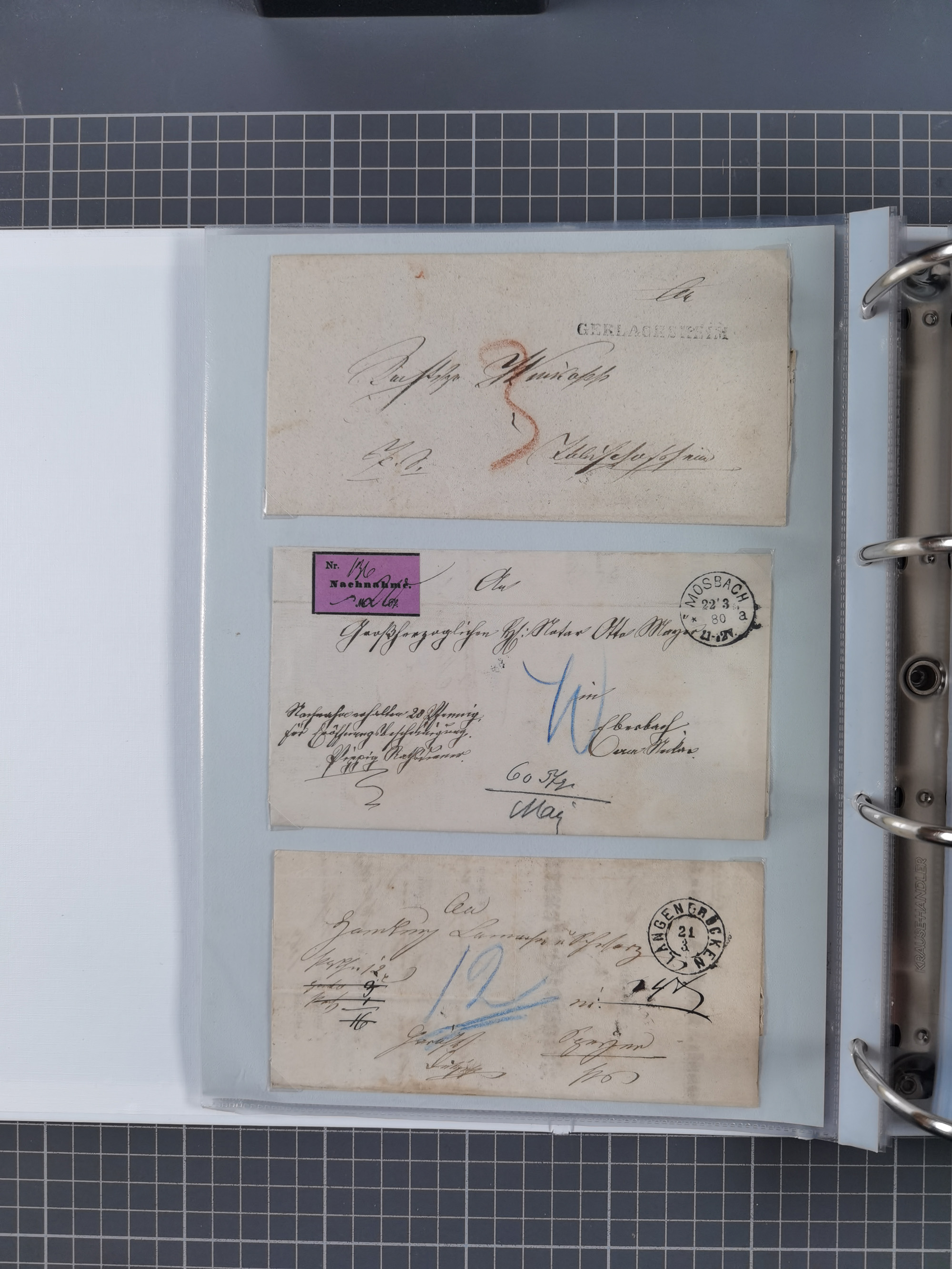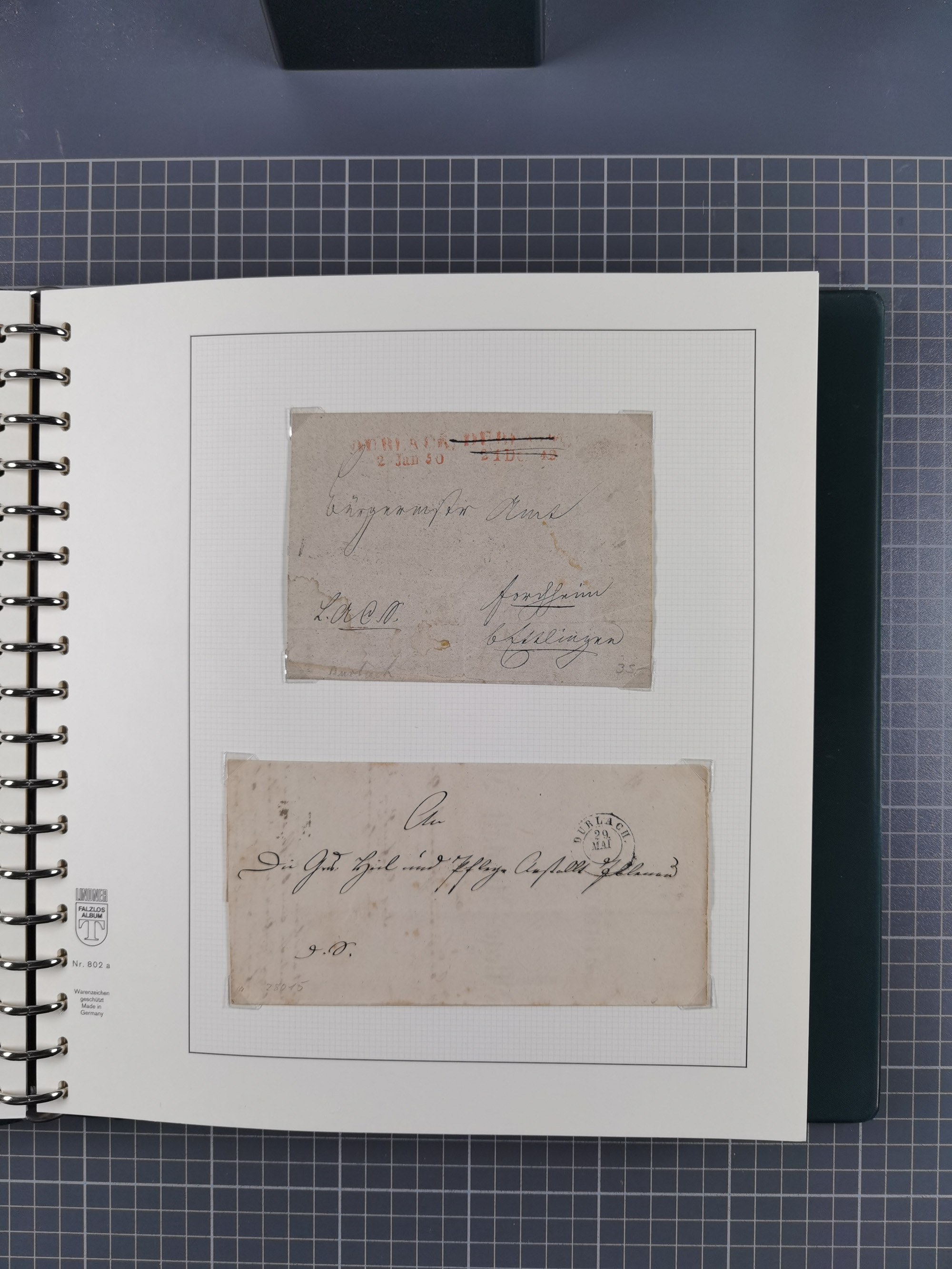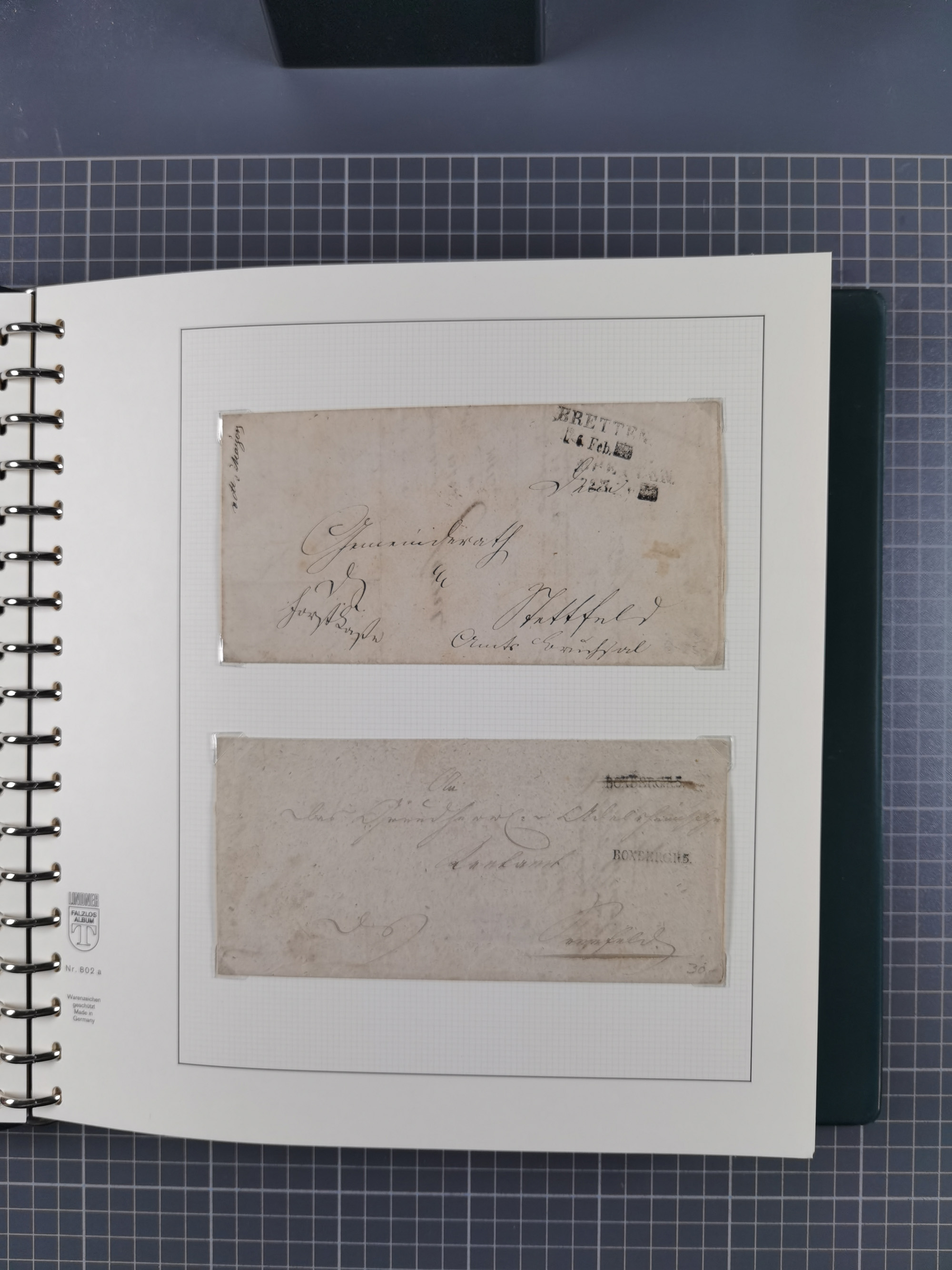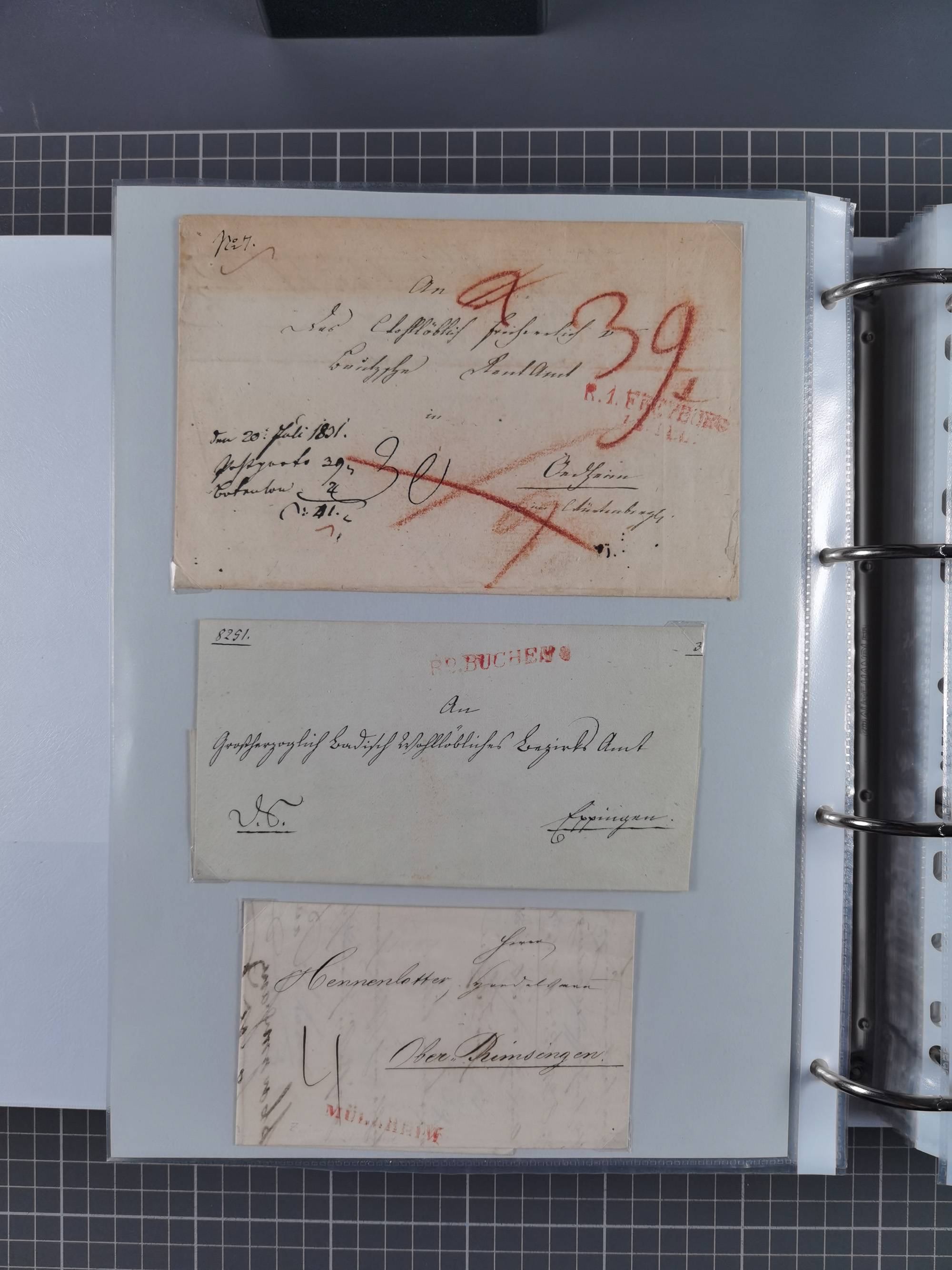 1830/86 (ca.), über 45 meist markenlose Briefe mit Steigbügelstempeln mit Schwerpunkt Württemberg, dabei u.a. HAIGERLOCH in rot auf Vorderseite, ALTSHAUSEN in blau (1844), BLAUFELDEN in waidblau (1850), ECHTERDINGEN in blau (1847), PLOCHINGEN, etc., auch einige Postscheine und Einzelmarken, im Album