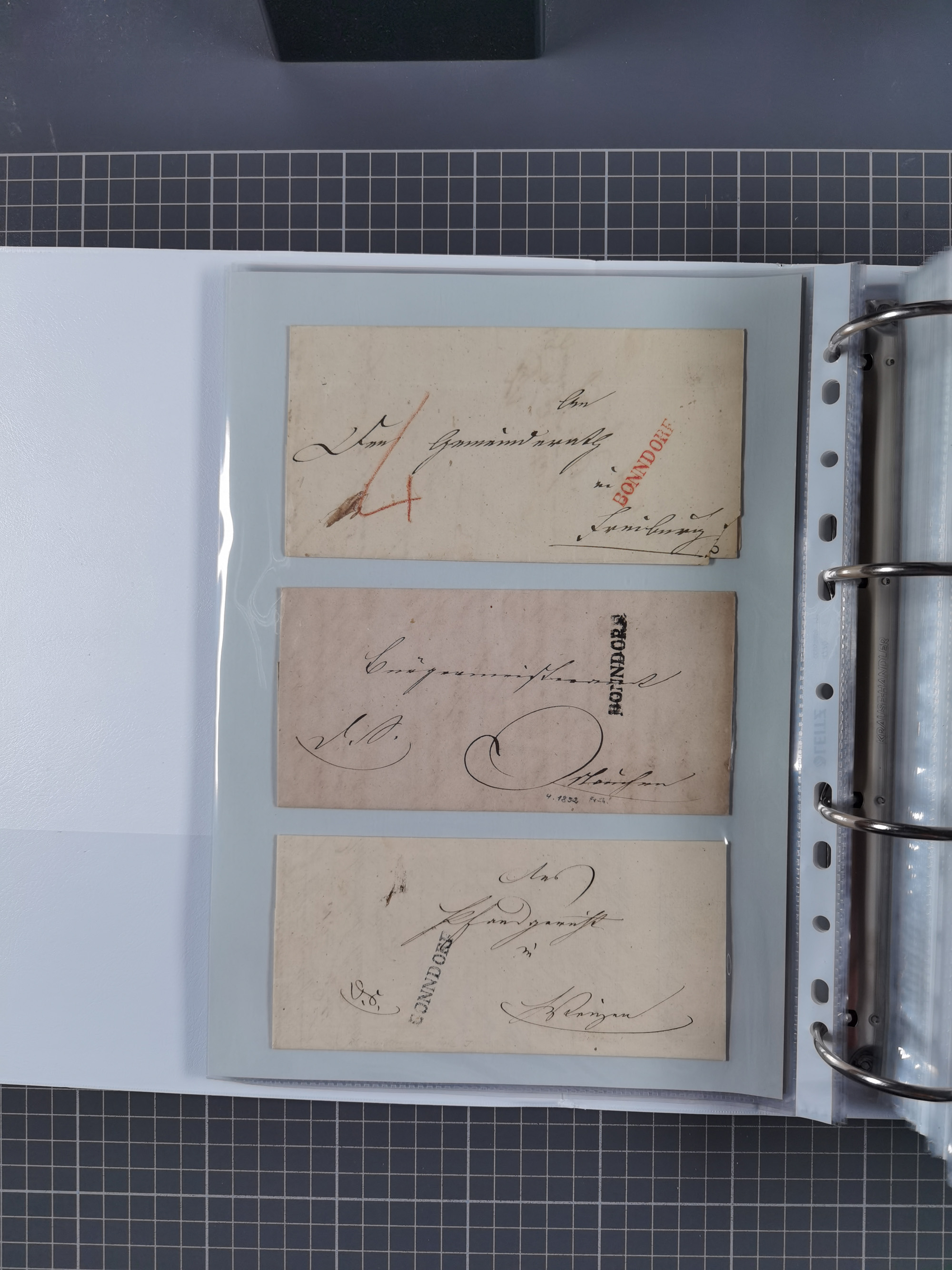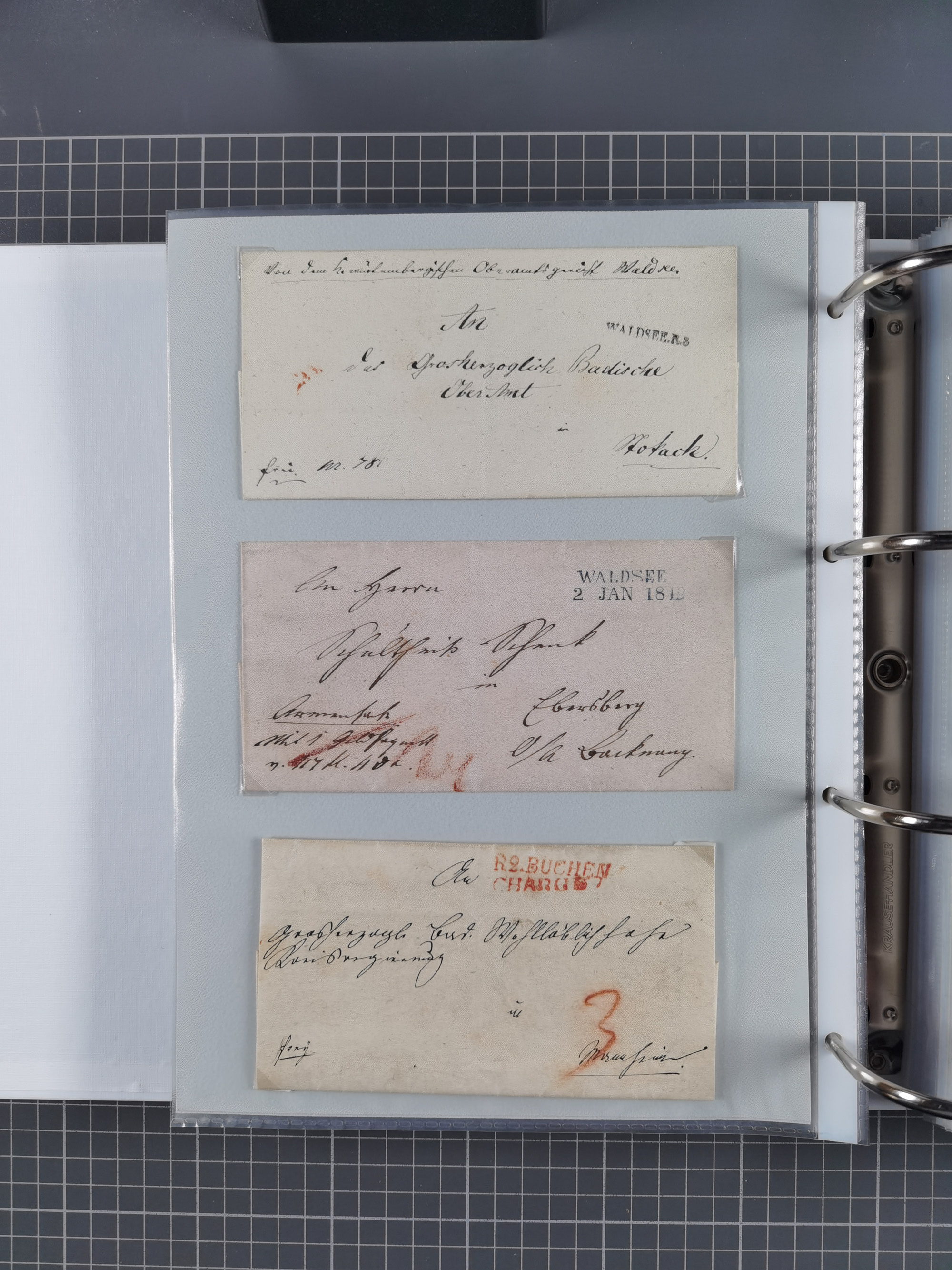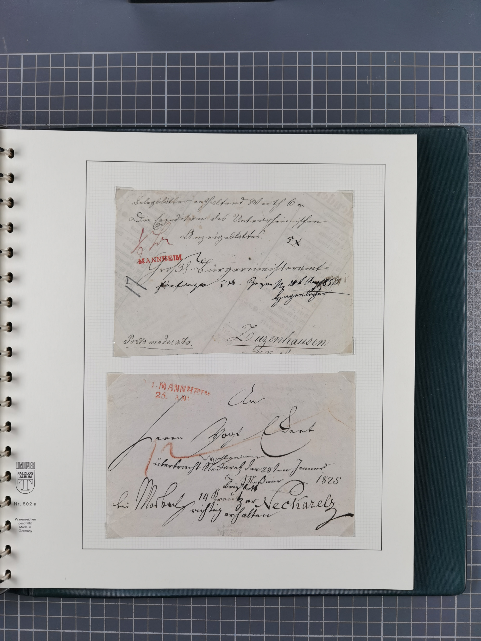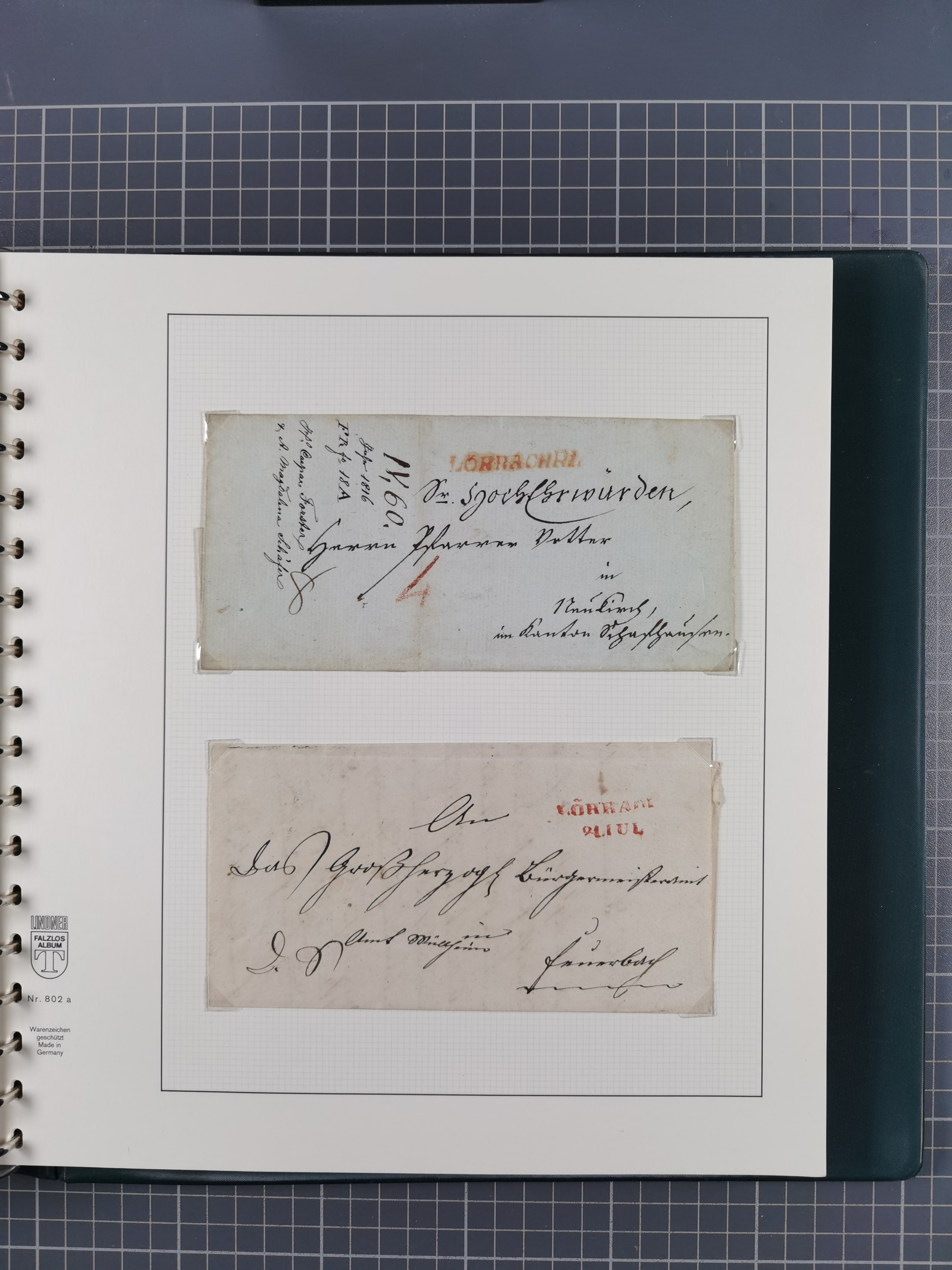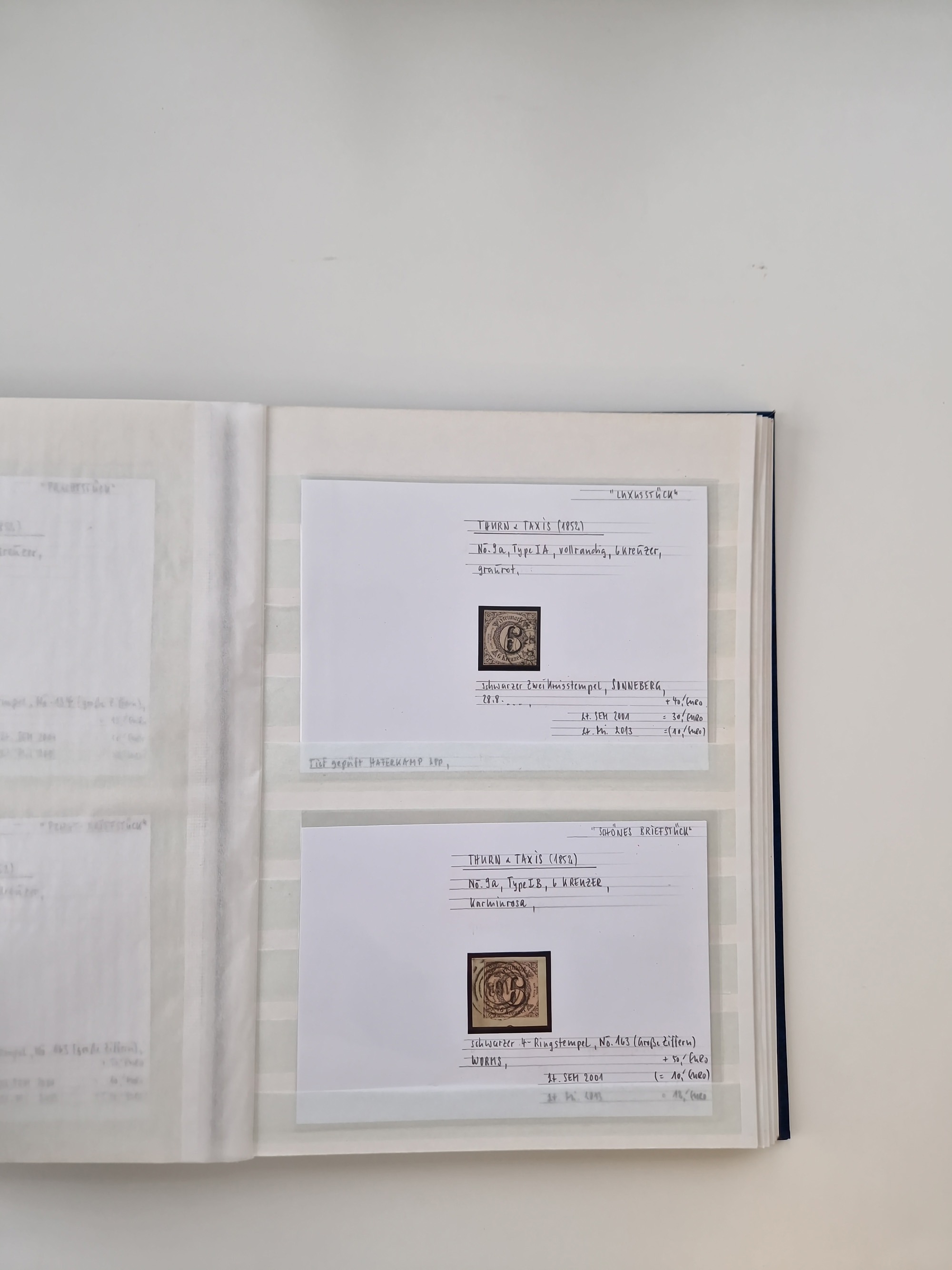 1830/86 (ca.), über 45 meist markenlose Briefe mit Steigbügelstempeln mit Schwerpunkt Württemberg, dabei u.a. HAIGERLOCH in rot auf Vorderseite, ALTSHAUSEN in blau (1844), BLAUFELDEN in waidblau (1850), ECHTERDINGEN in blau (1847), PLOCHINGEN, etc., auch einige Postscheine und Einzelmarken, im Album