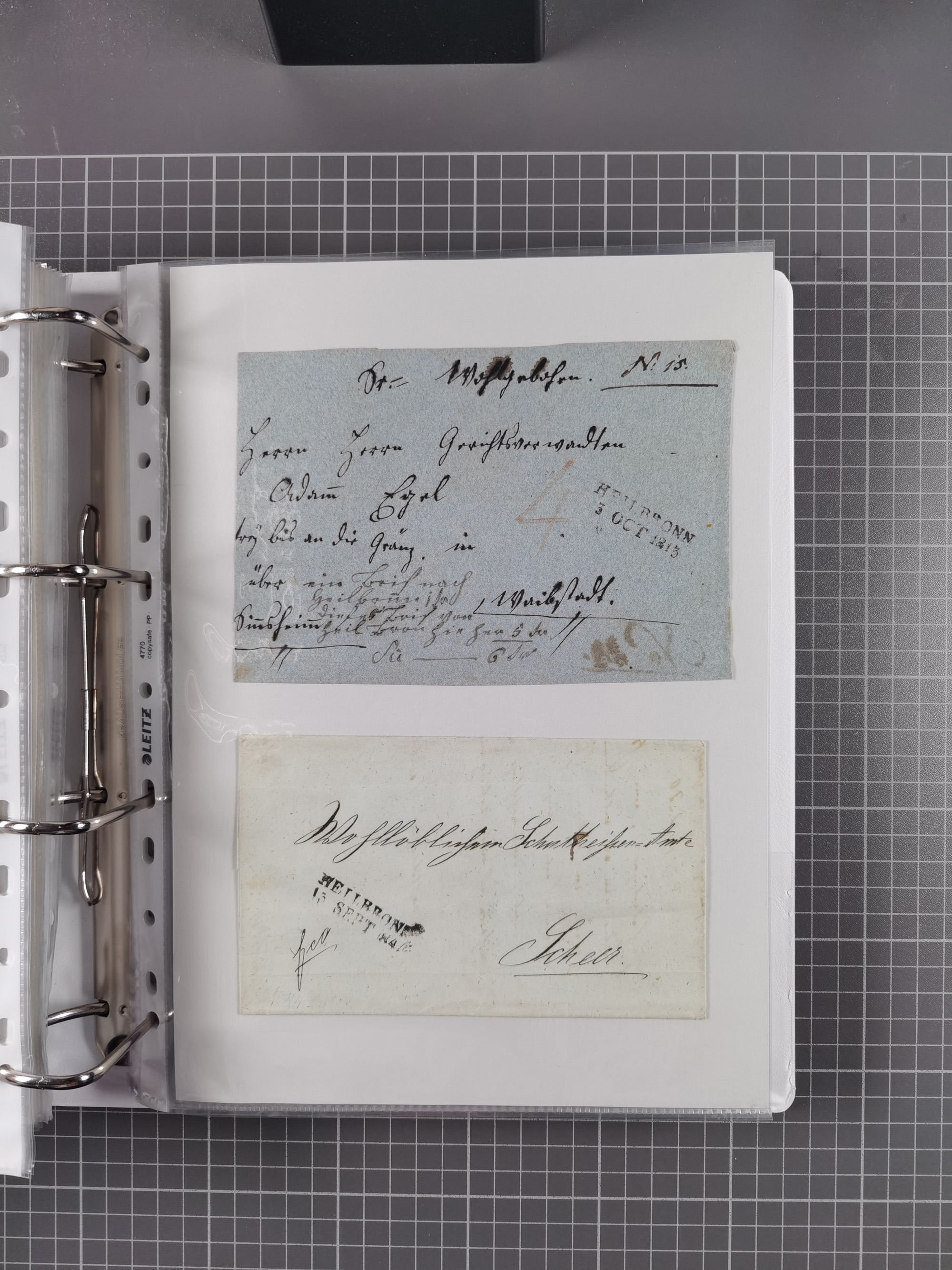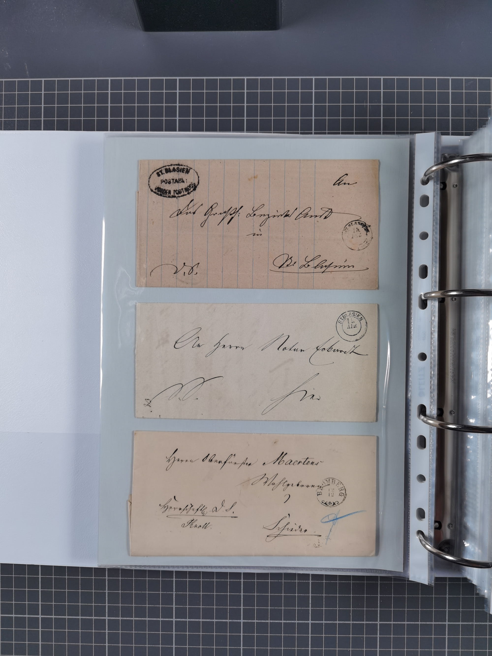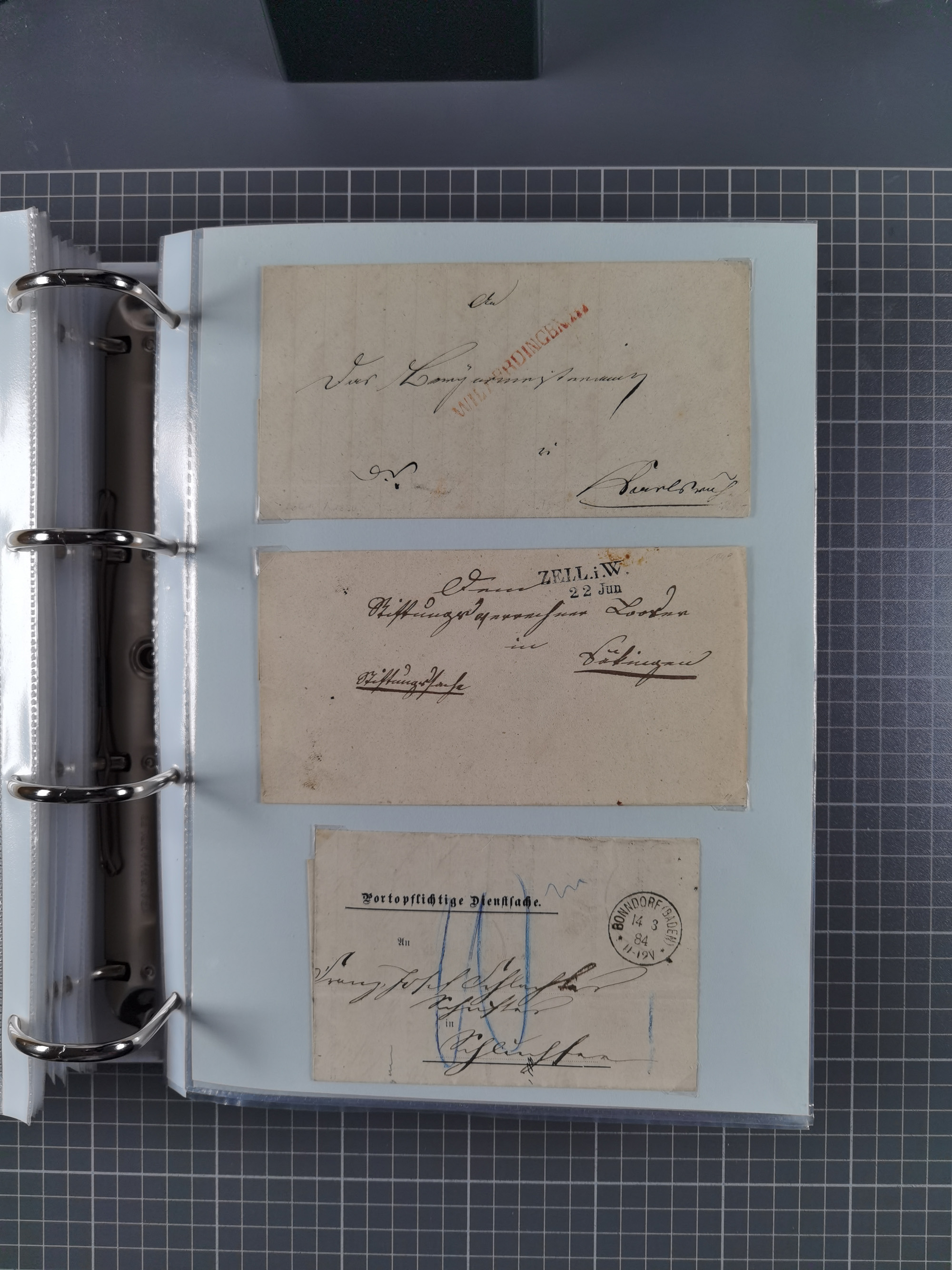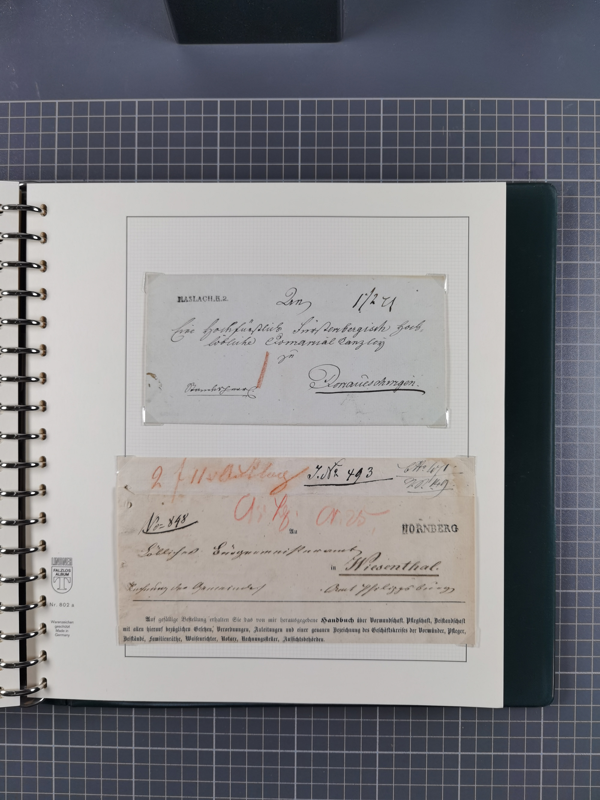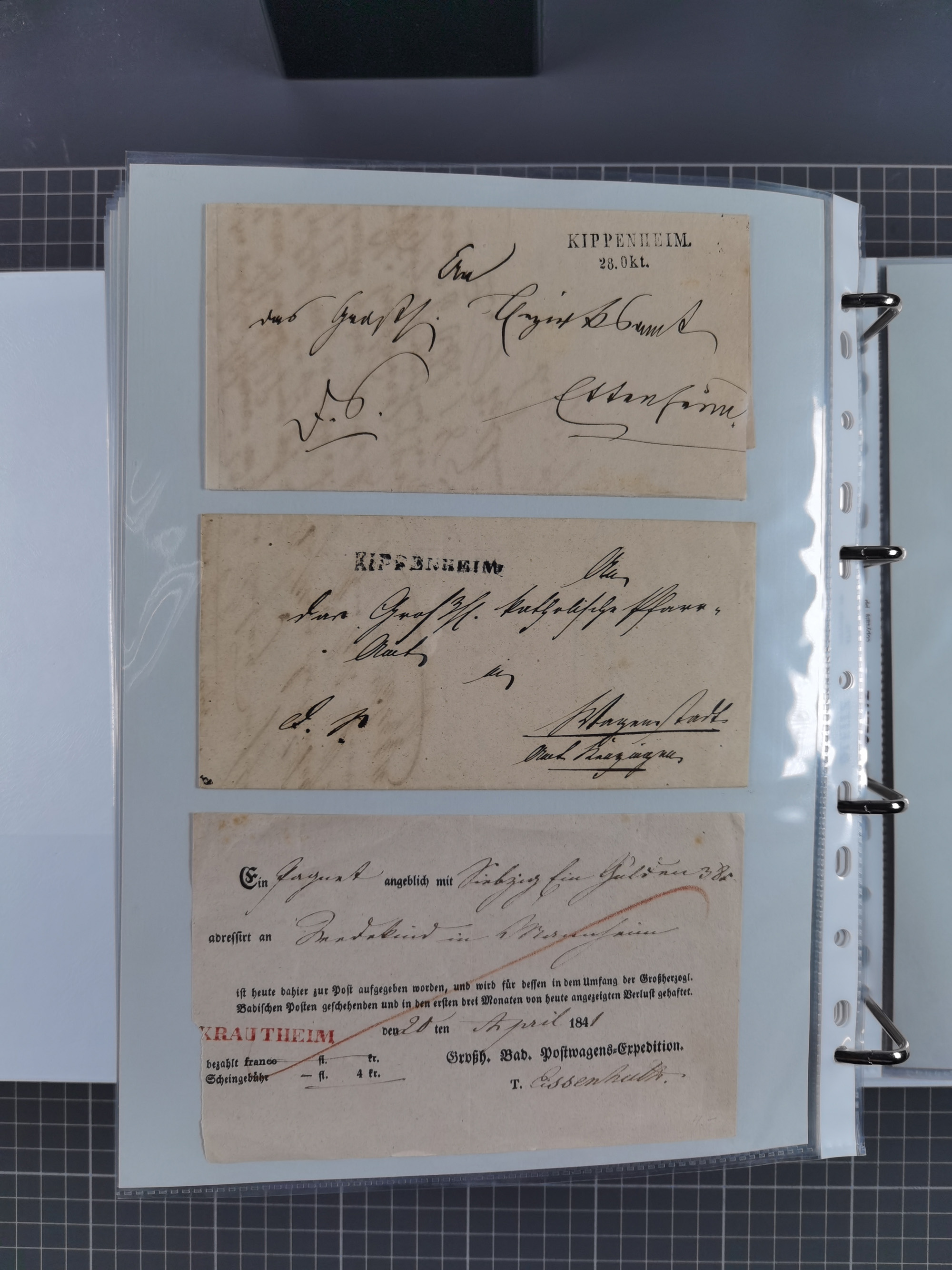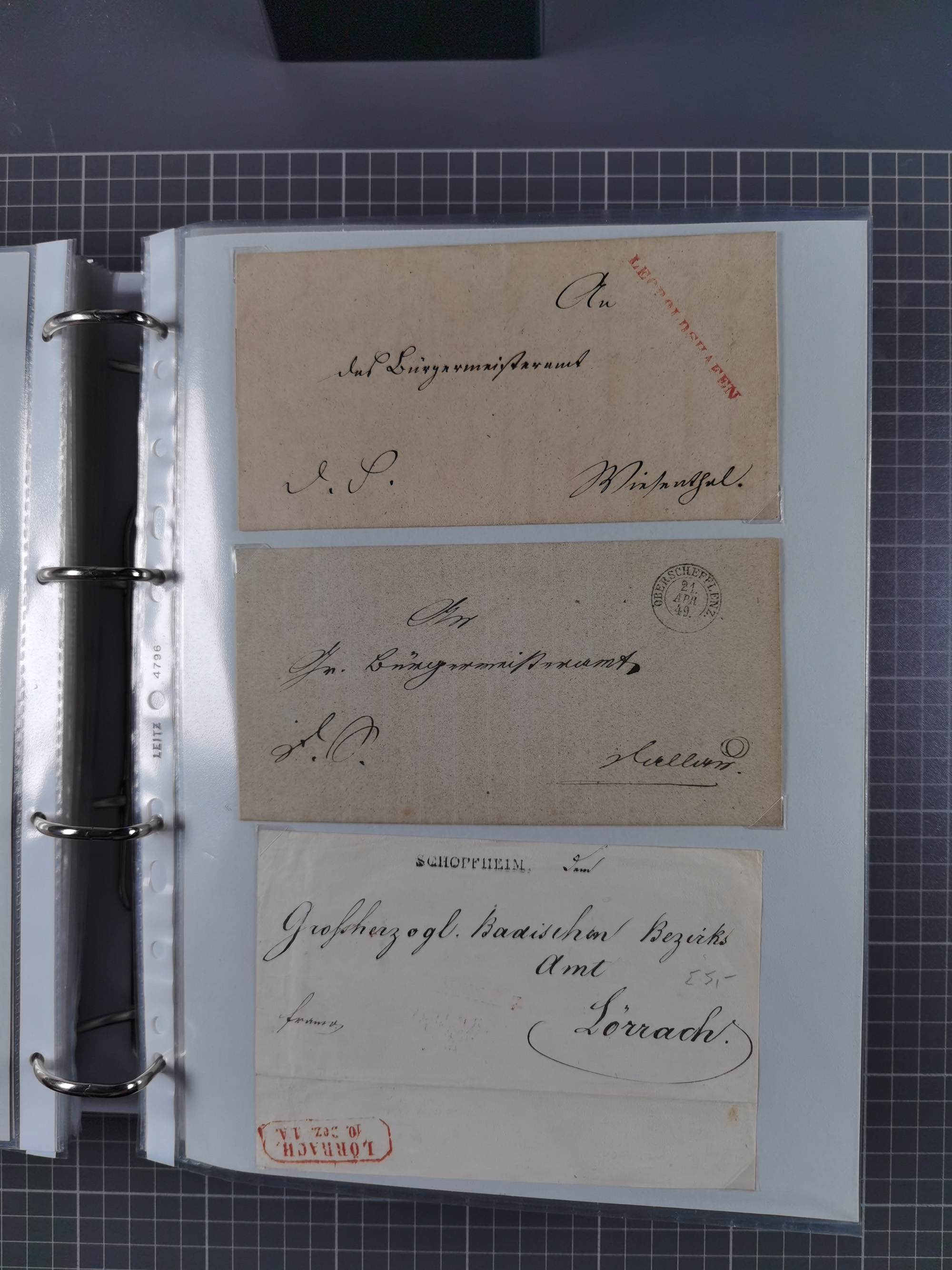 1830/86 (ca.), über 45 meist markenlose Briefe mit Steigbügelstempeln mit Schwerpunkt Württemberg, dabei u.a. HAIGERLOCH in rot auf Vorderseite, ALTSHAUSEN in blau (1844), BLAUFELDEN in waidblau (1850), ECHTERDINGEN in blau (1847), PLOCHINGEN, etc., auch einige Postscheine und Einzelmarken, im Album