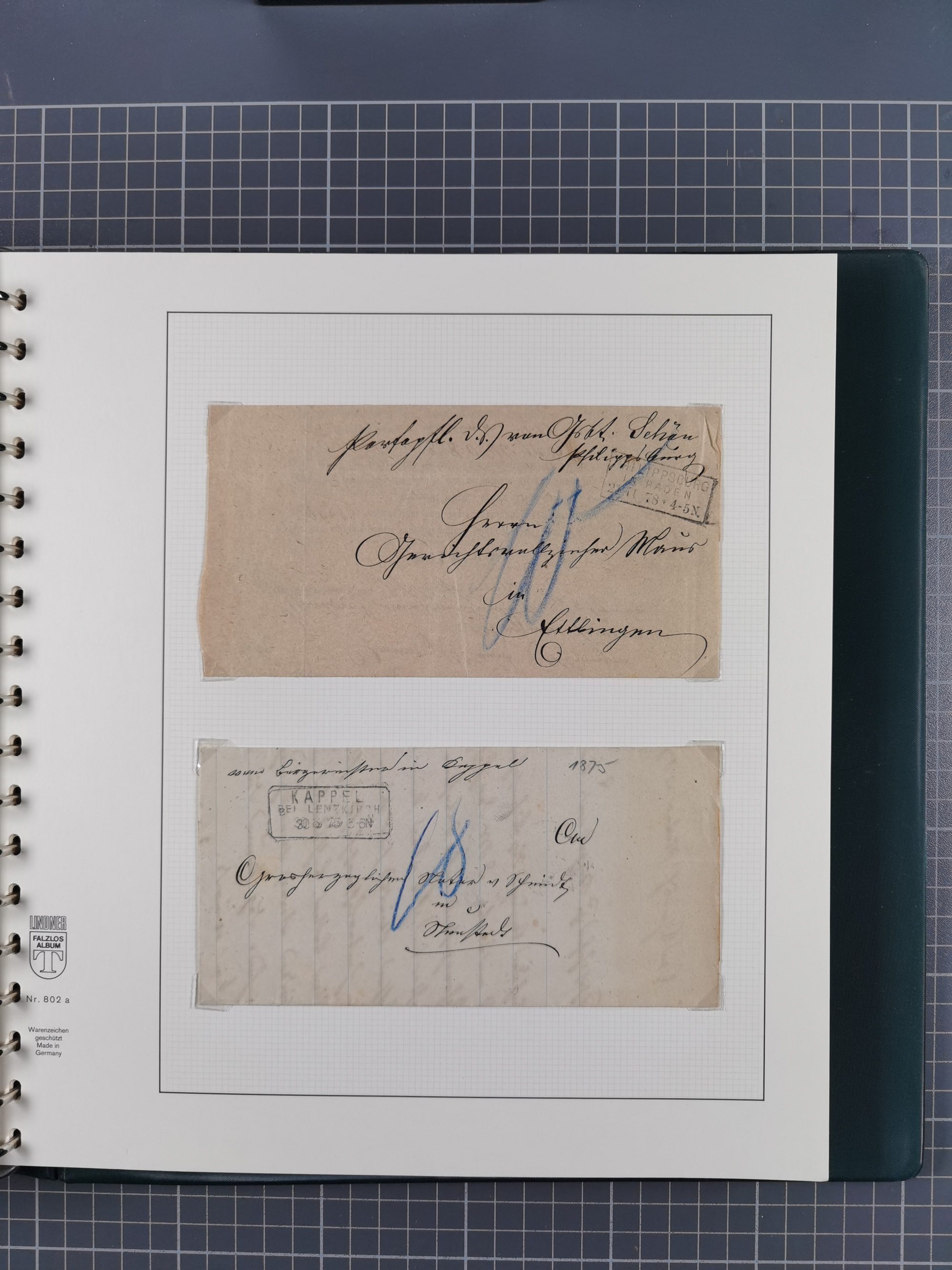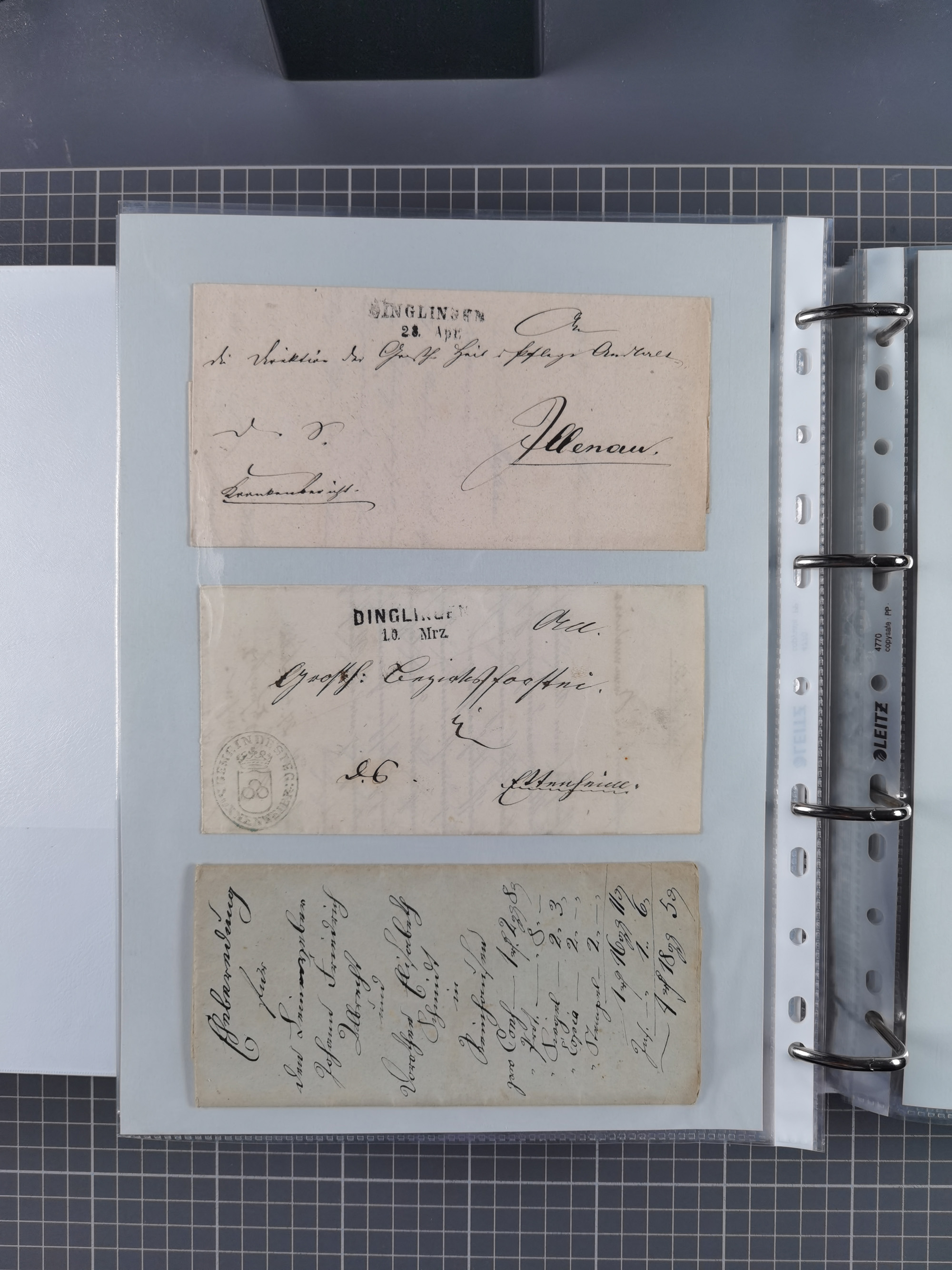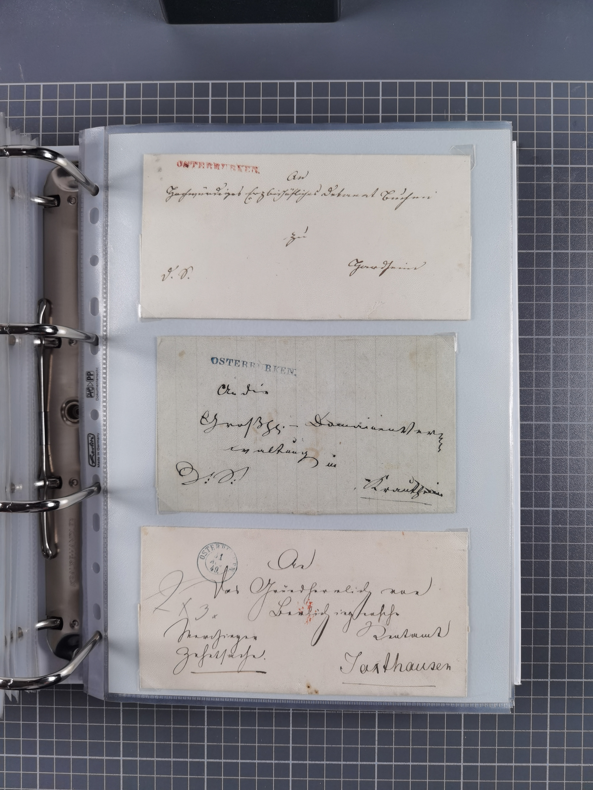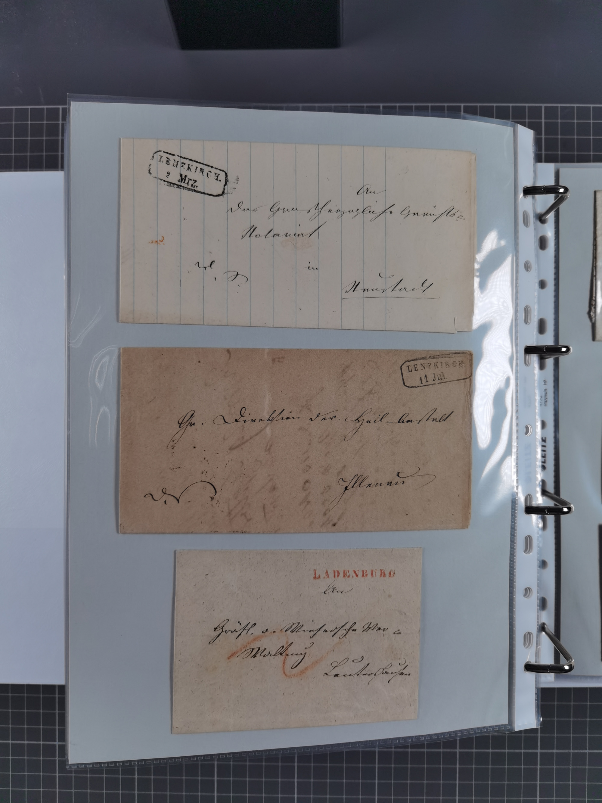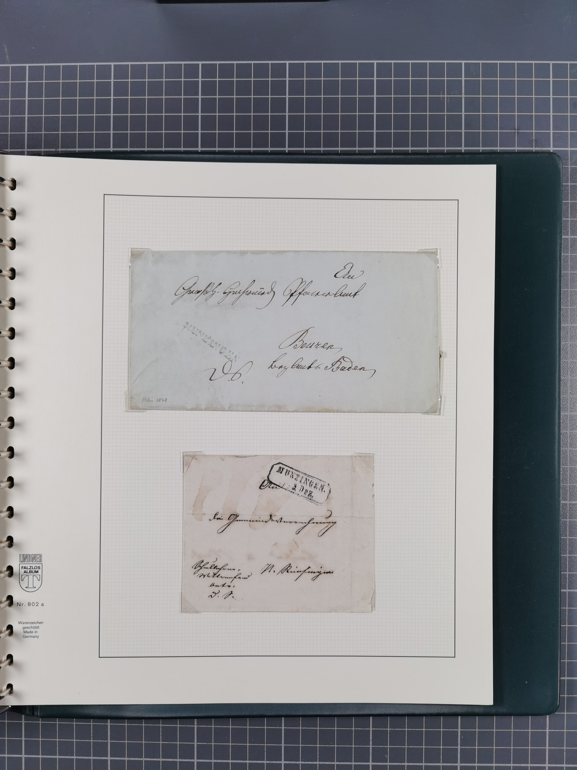 1830/86 (ca.), über 45 meist markenlose Briefe mit Steigbügelstempeln mit Schwerpunkt Württemberg, dabei u.a. HAIGERLOCH in rot auf Vorderseite, ALTSHAUSEN in blau (1844), BLAUFELDEN in waidblau (1850), ECHTERDINGEN in blau (1847), PLOCHINGEN, etc., auch einige Postscheine und Einzelmarken, im Album