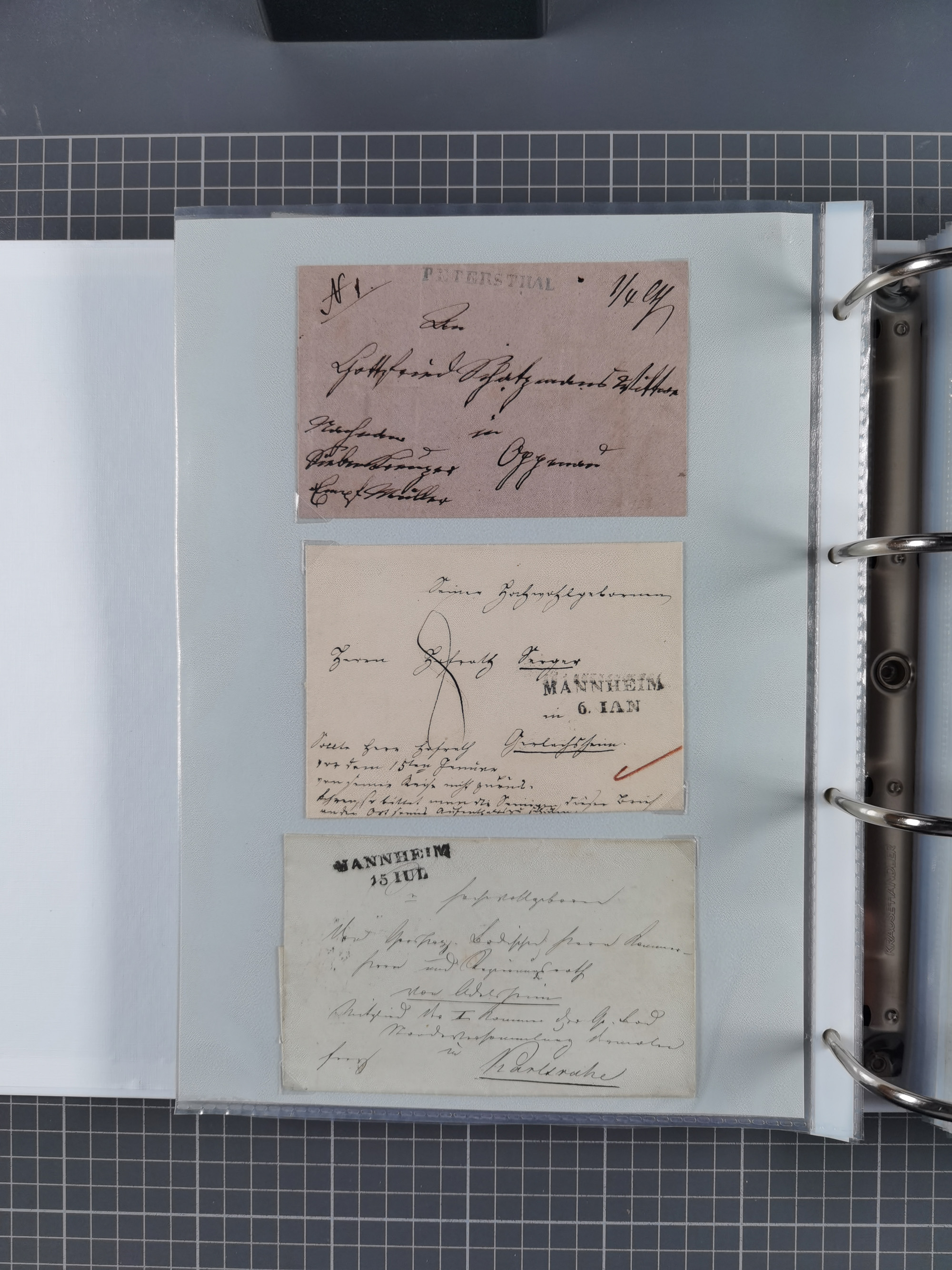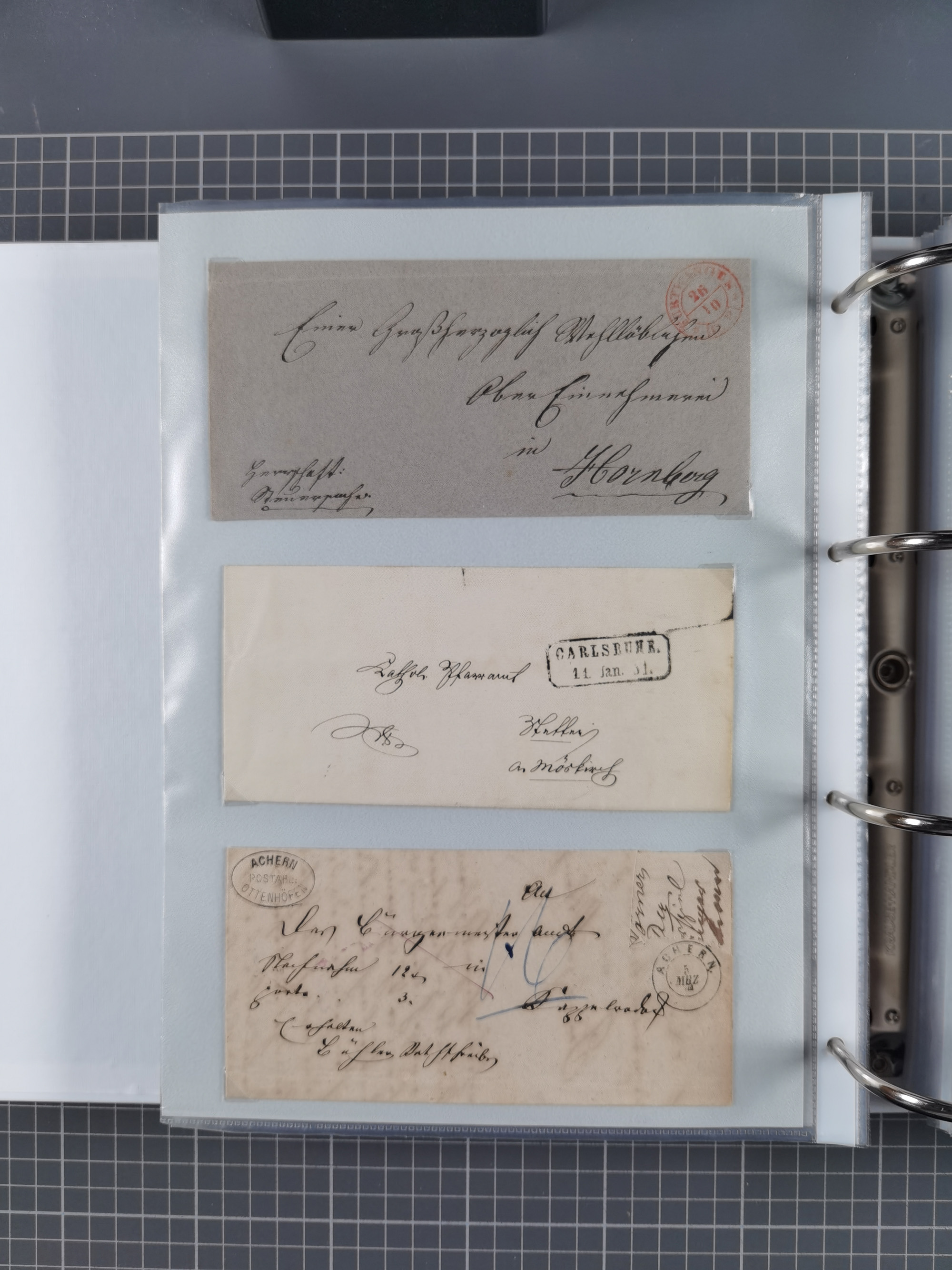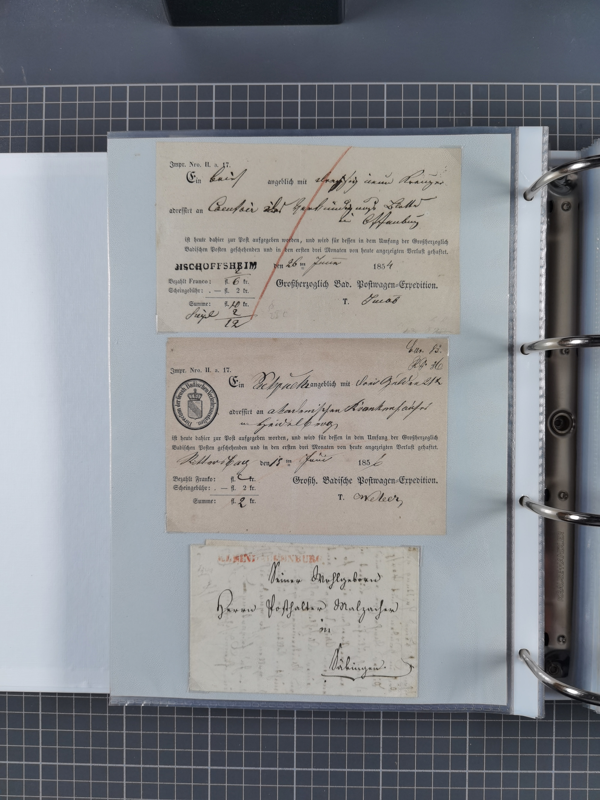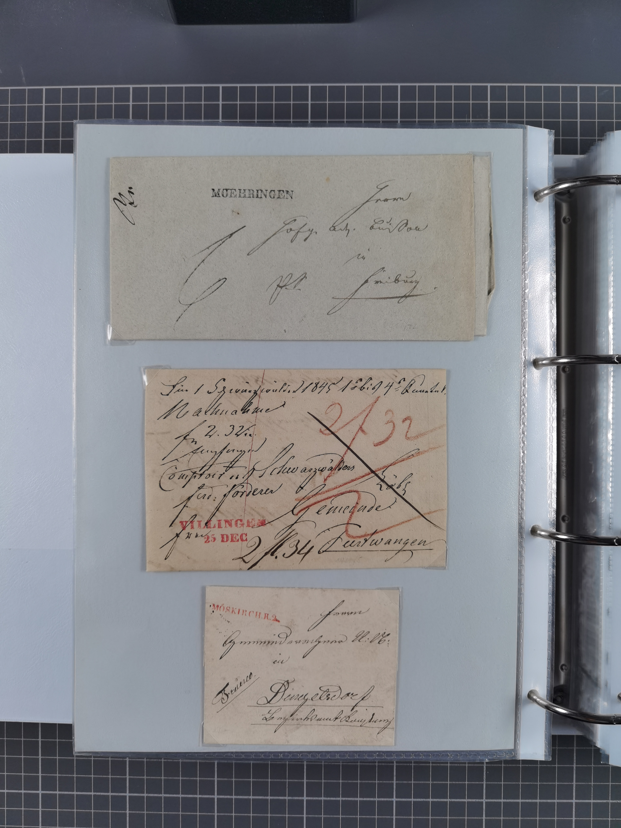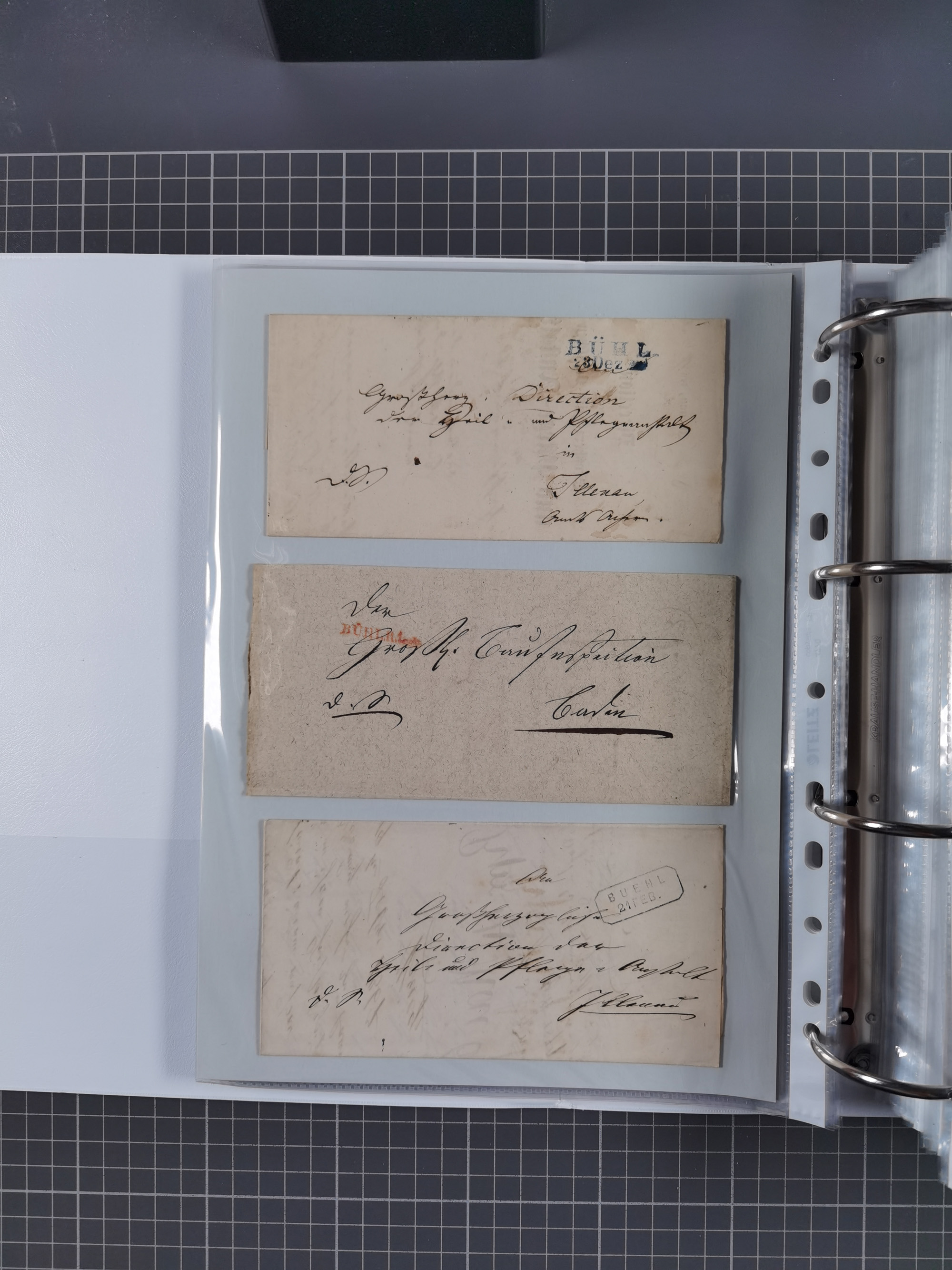 1830/86 (ca.), über 45 meist markenlose Briefe mit Steigbügelstempeln mit Schwerpunkt Württemberg, dabei u.a. HAIGERLOCH in rot auf Vorderseite, ALTSHAUSEN in blau (1844), BLAUFELDEN in waidblau (1850), ECHTERDINGEN in blau (1847), PLOCHINGEN, etc., auch einige Postscheine und Einzelmarken, im Album