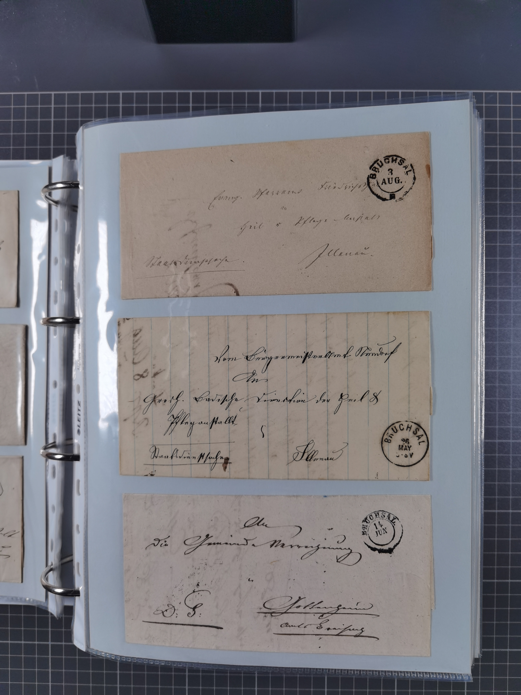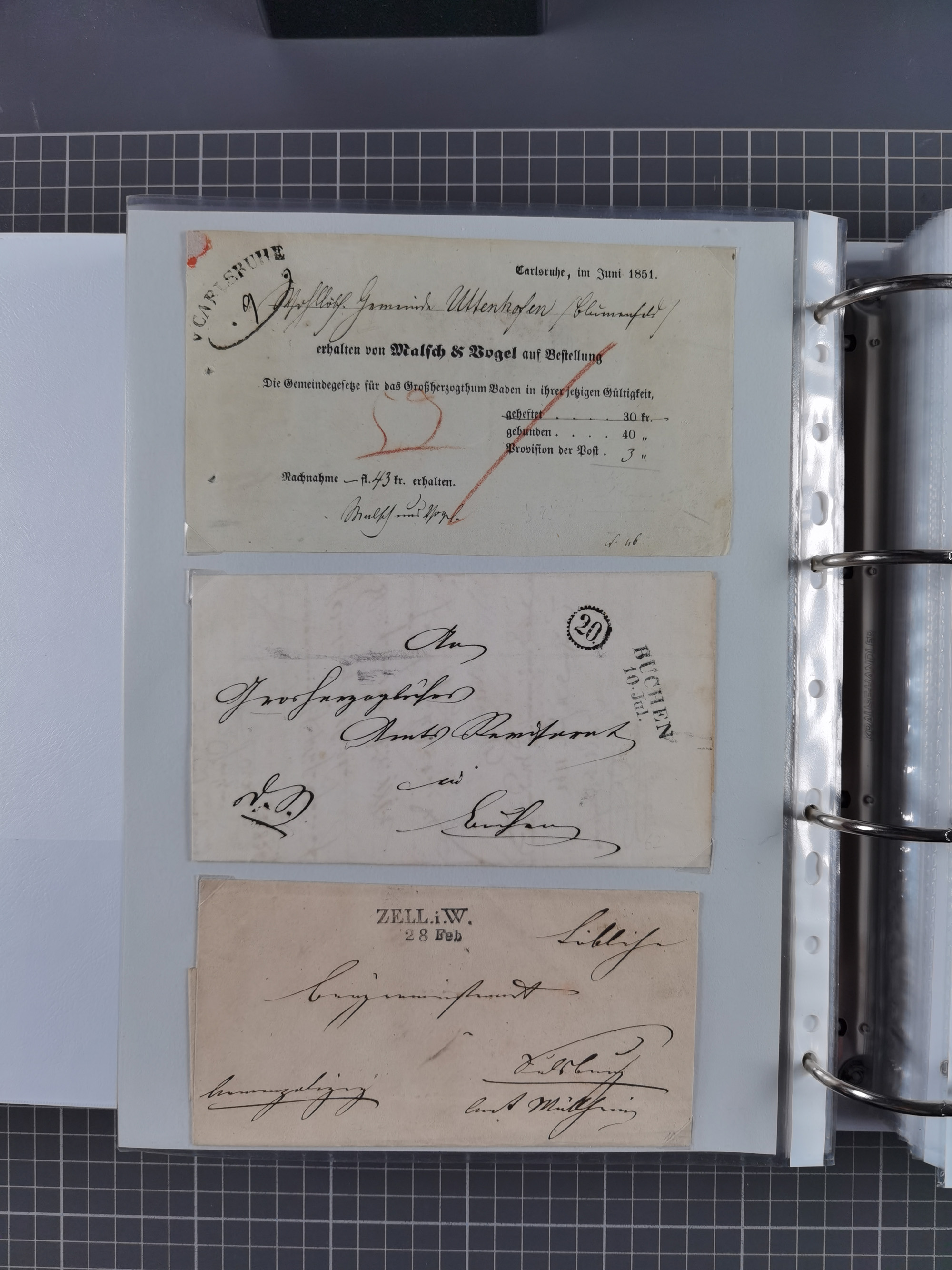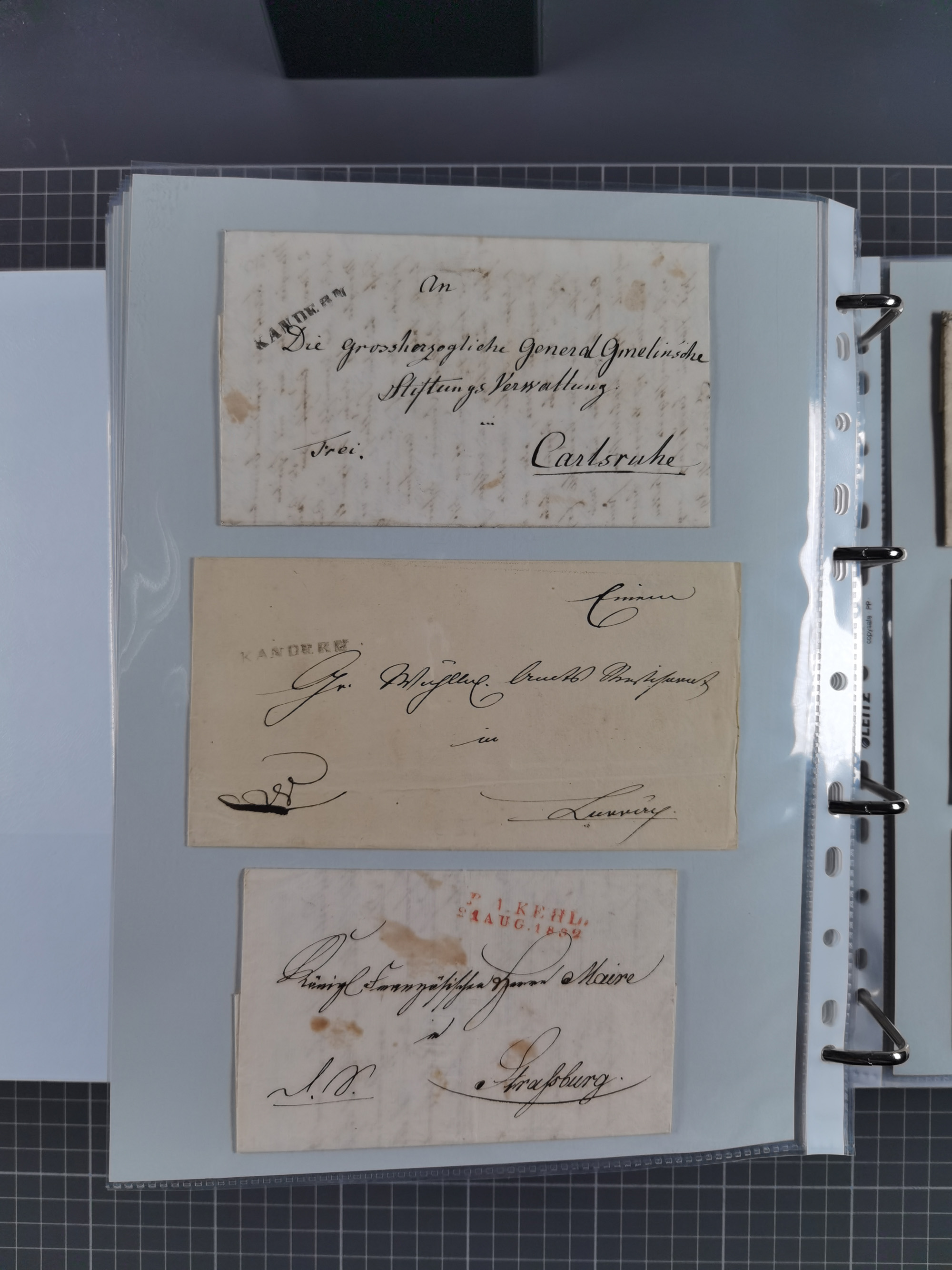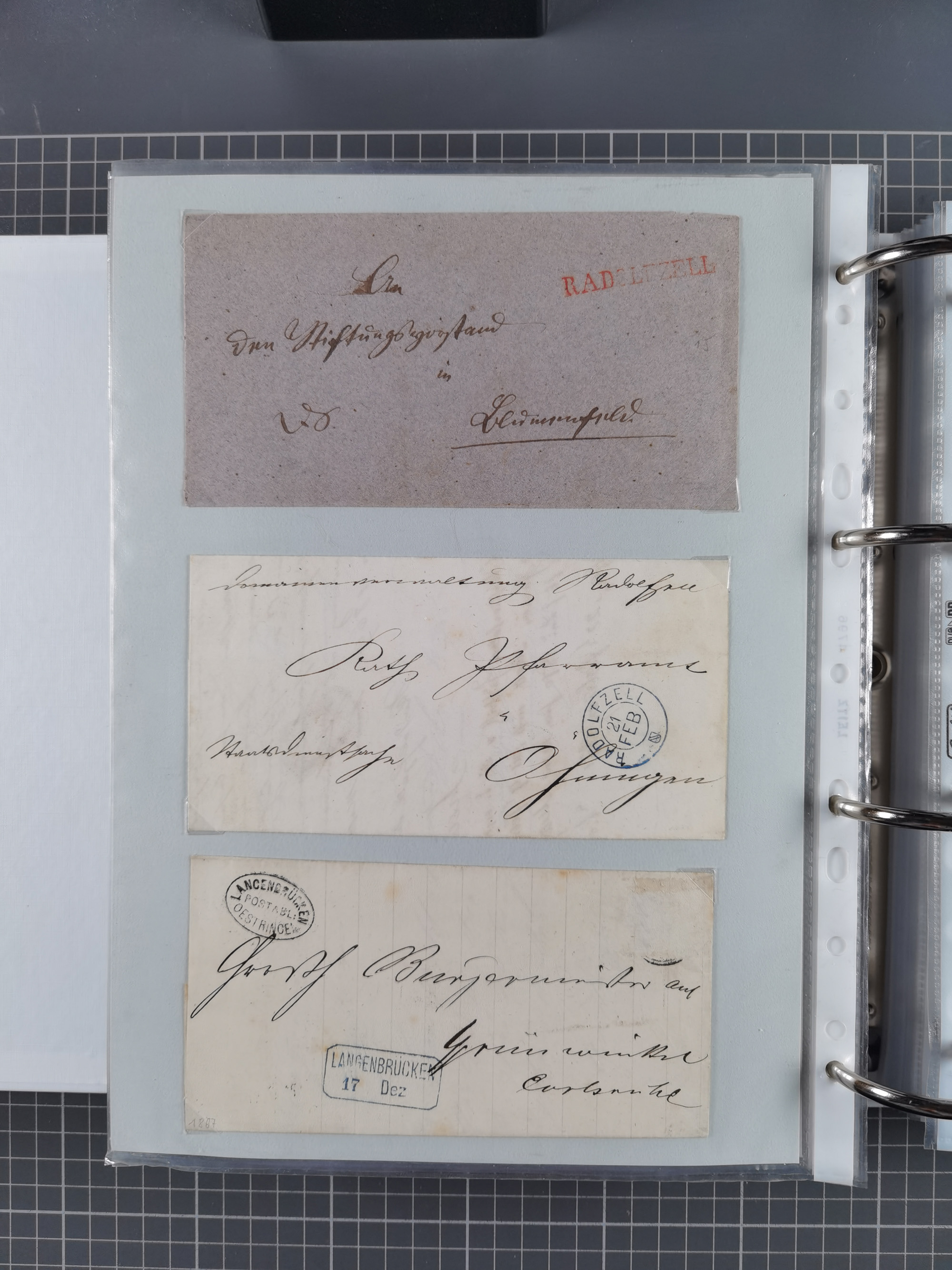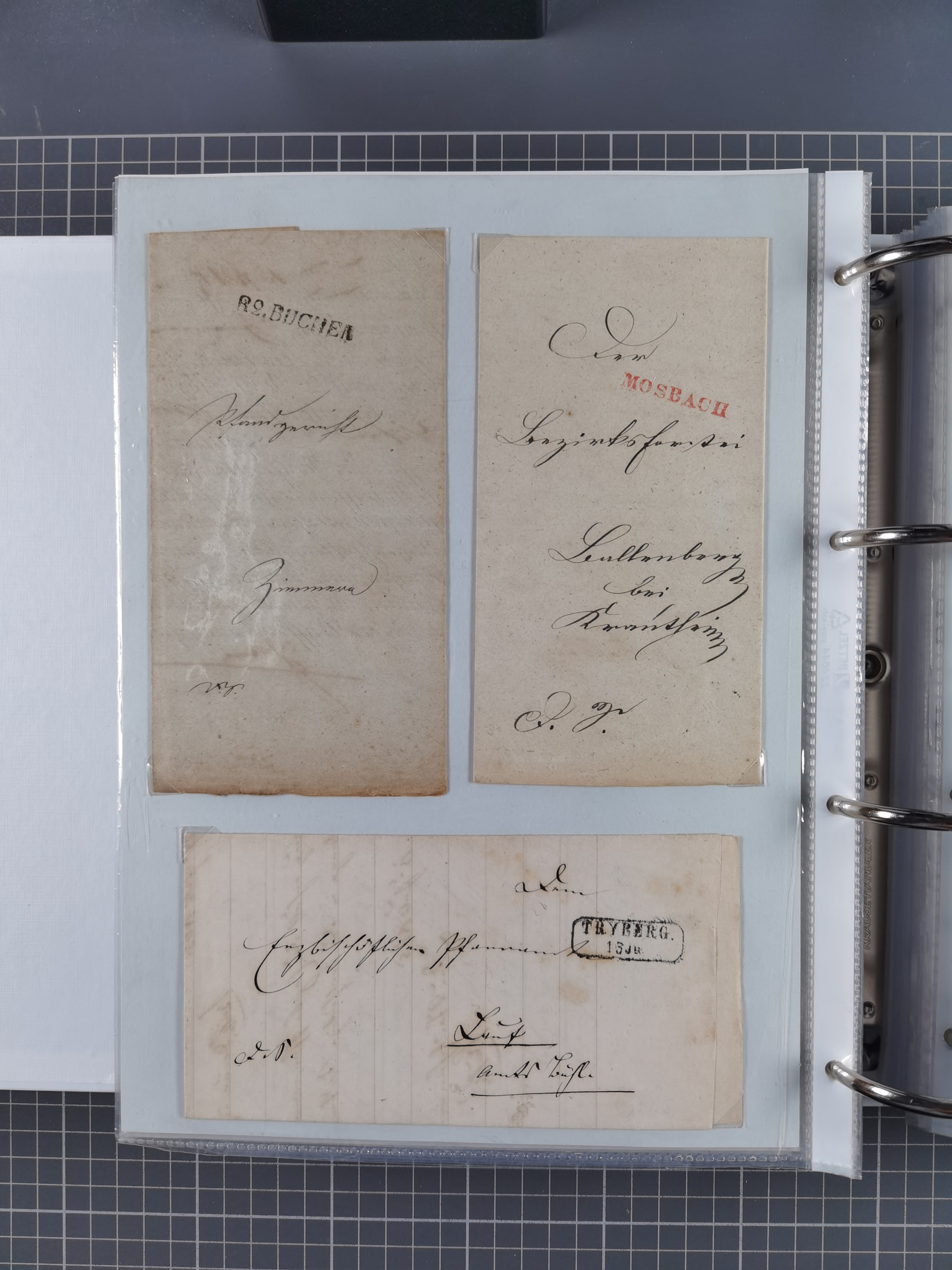1830/86 (ca.), über 45 meist markenlose Briefe mit Steigbügelstempeln mit Schwerpunkt Württemberg, dabei u.a. HAIGERLOCH in rot auf Vorderseite, ALTSHAUSEN in blau (1844), BLAUFELDEN in waidblau (1850), ECHTERDINGEN in blau (1847), PLOCHINGEN, etc., auch einige Postscheine und Einzelmarken, im Album