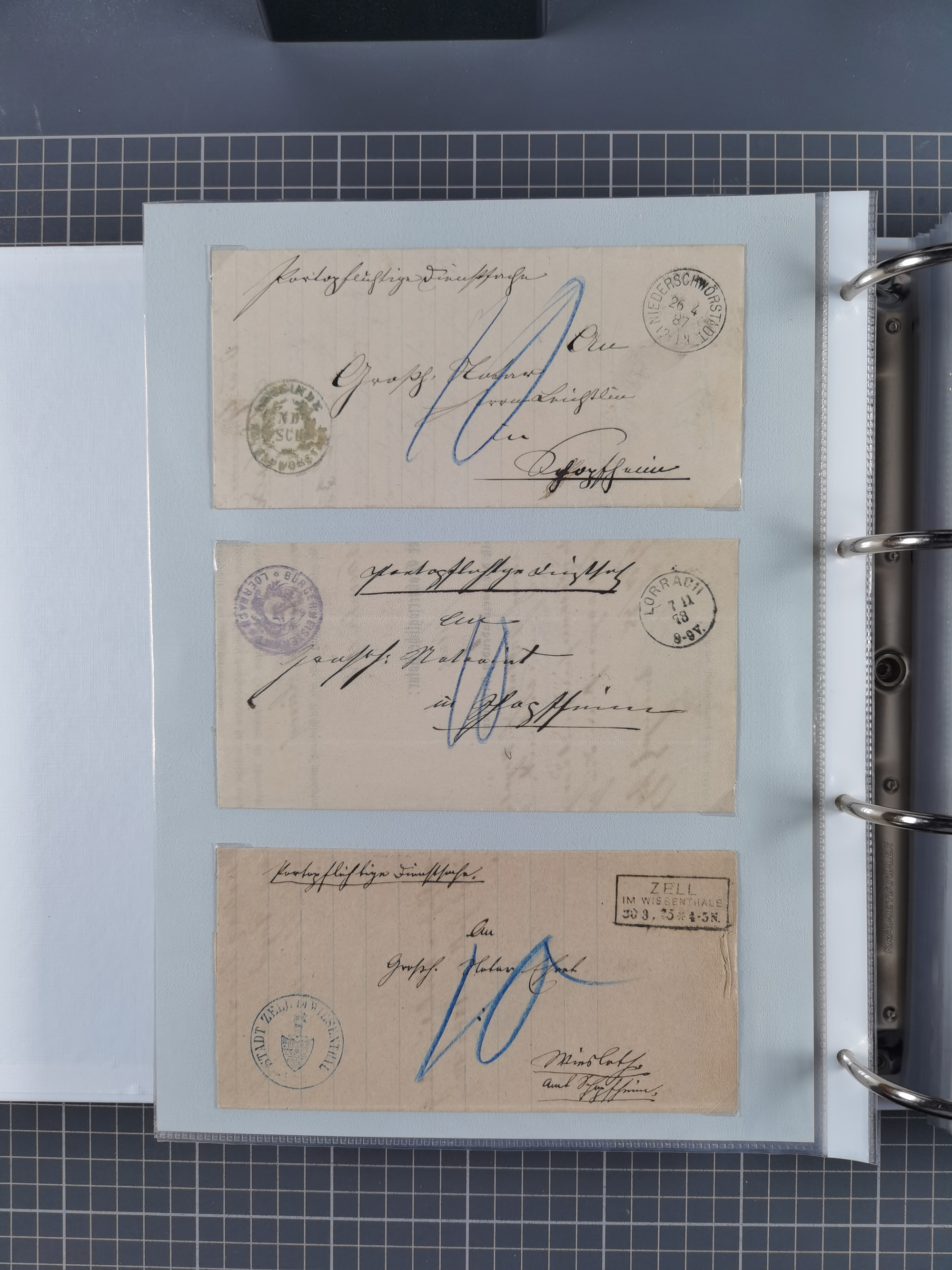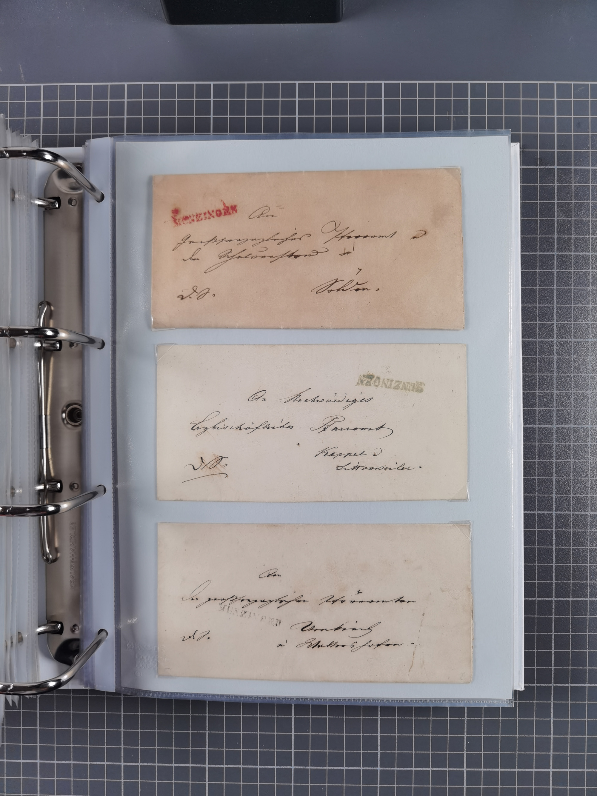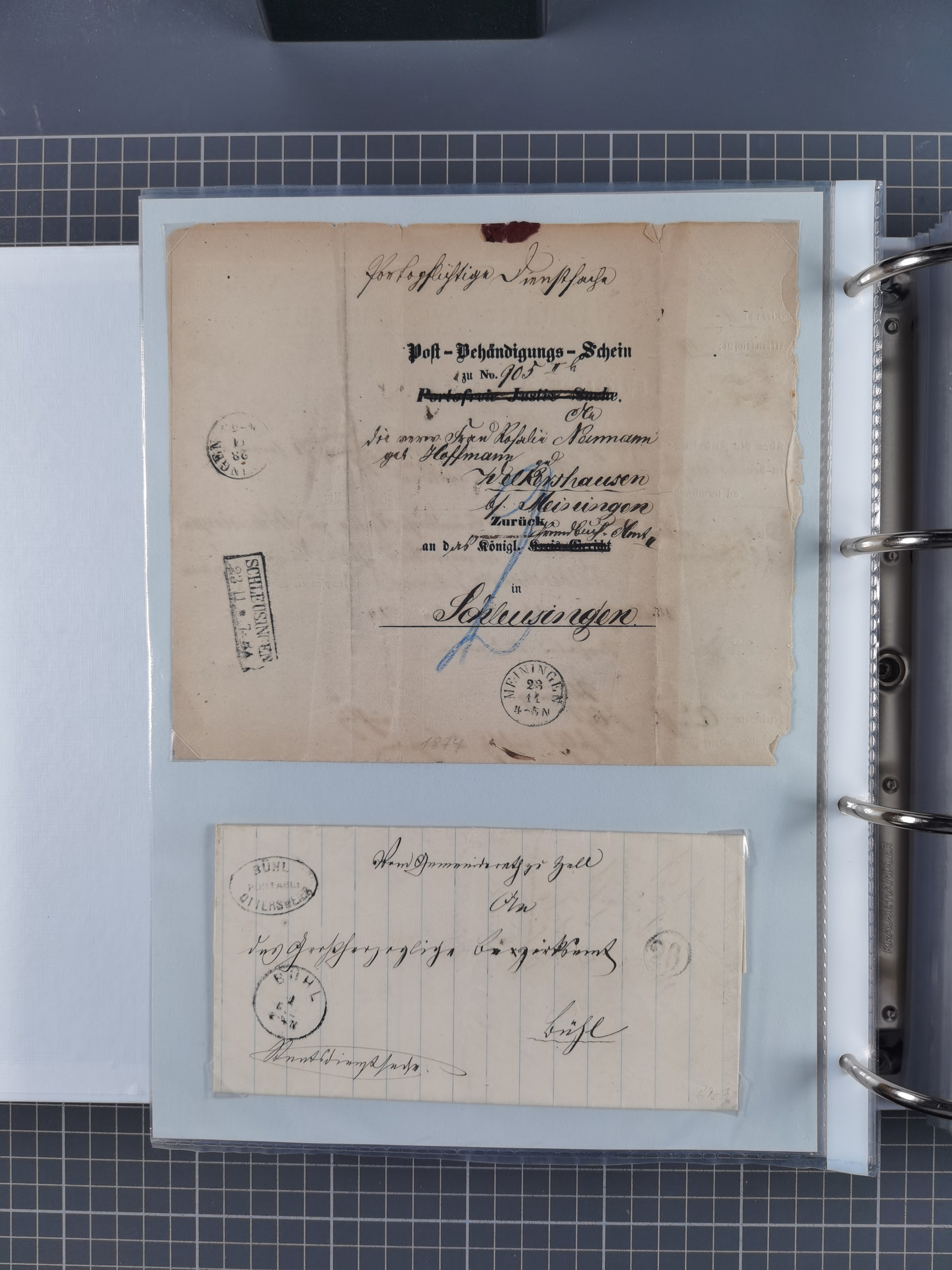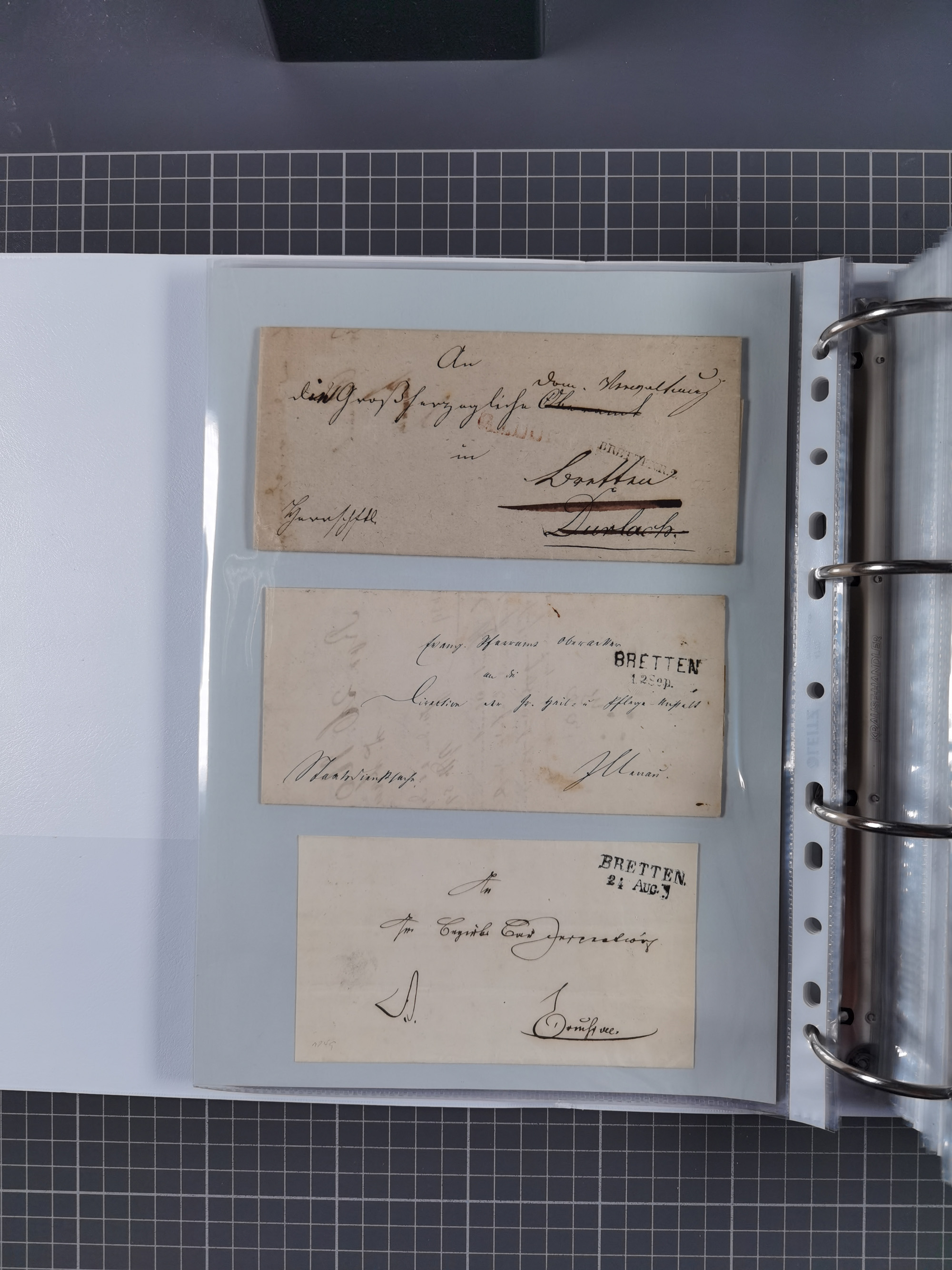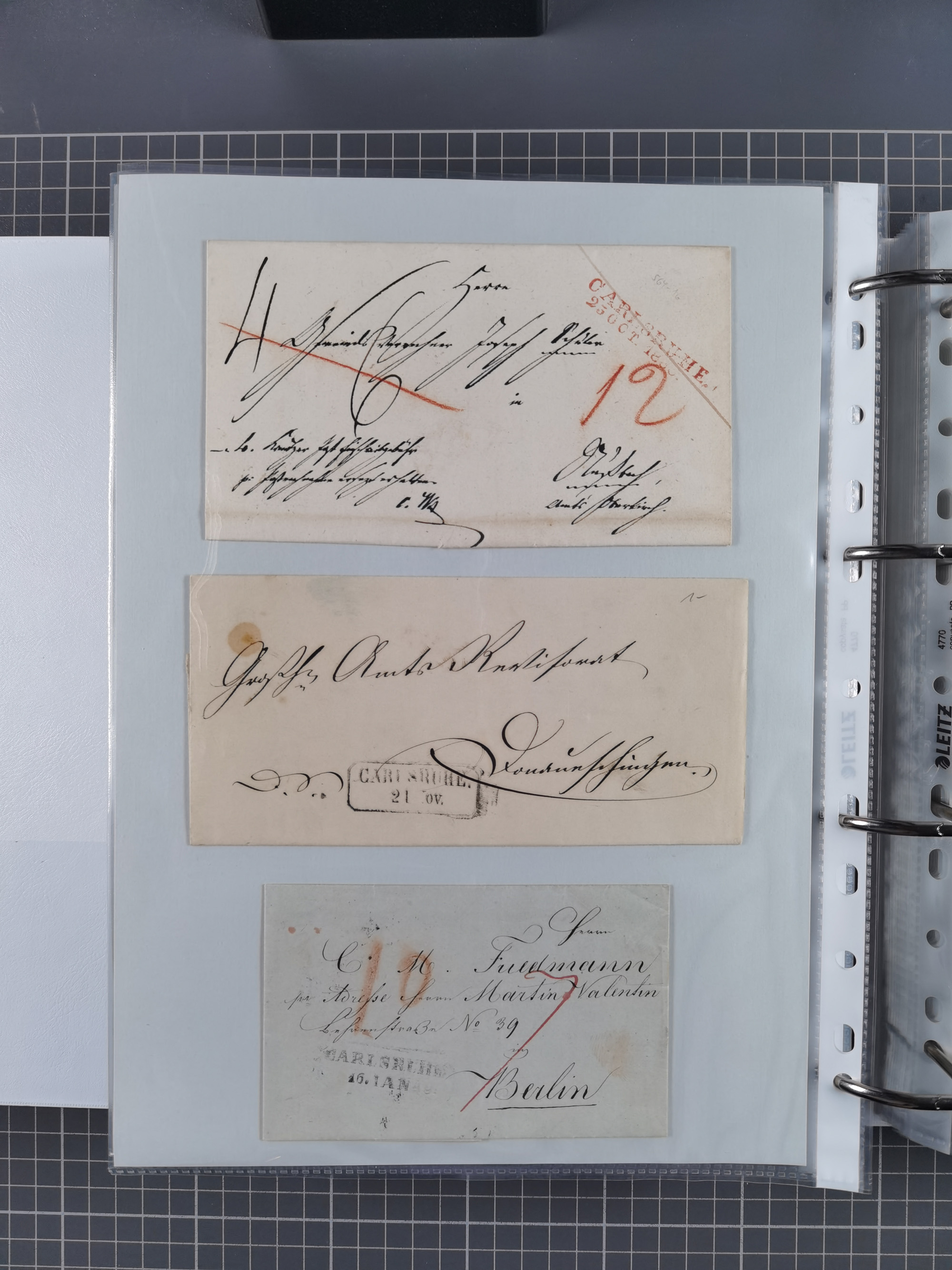 1830/86 (ca.), über 45 meist markenlose Briefe mit Steigbügelstempeln mit Schwerpunkt Württemberg, dabei u.a. HAIGERLOCH in rot auf Vorderseite, ALTSHAUSEN in blau (1844), BLAUFELDEN in waidblau (1850), ECHTERDINGEN in blau (1847), PLOCHINGEN, etc., auch einige Postscheine und Einzelmarken, im Album