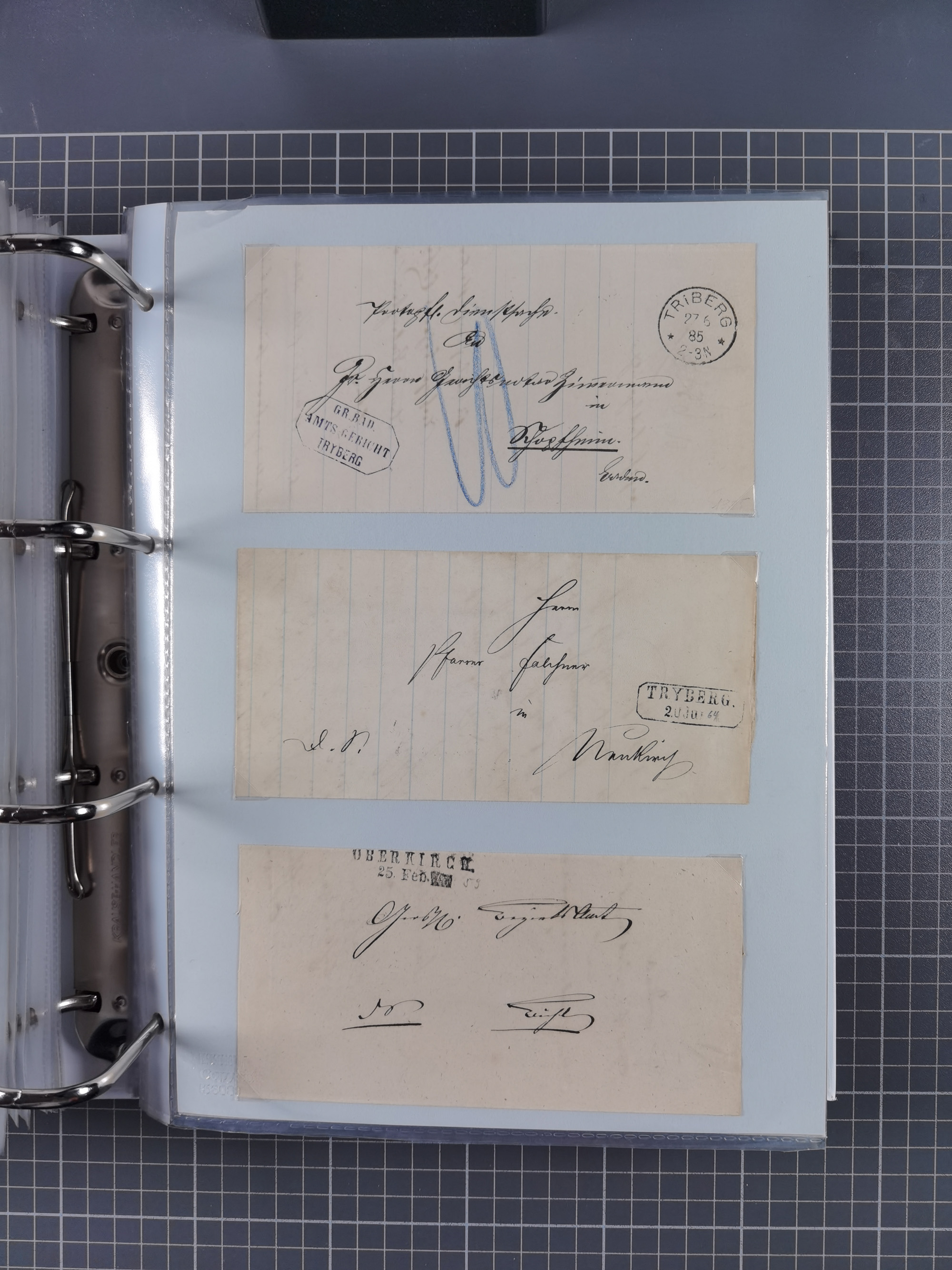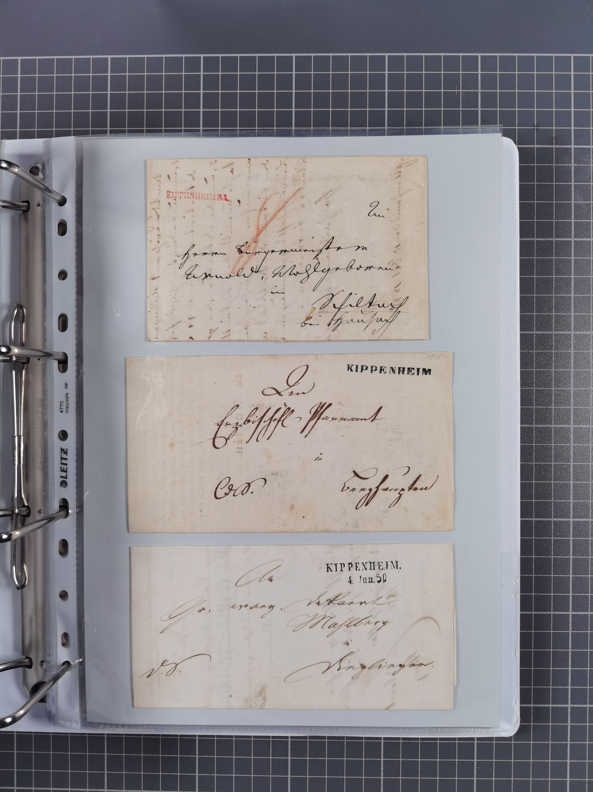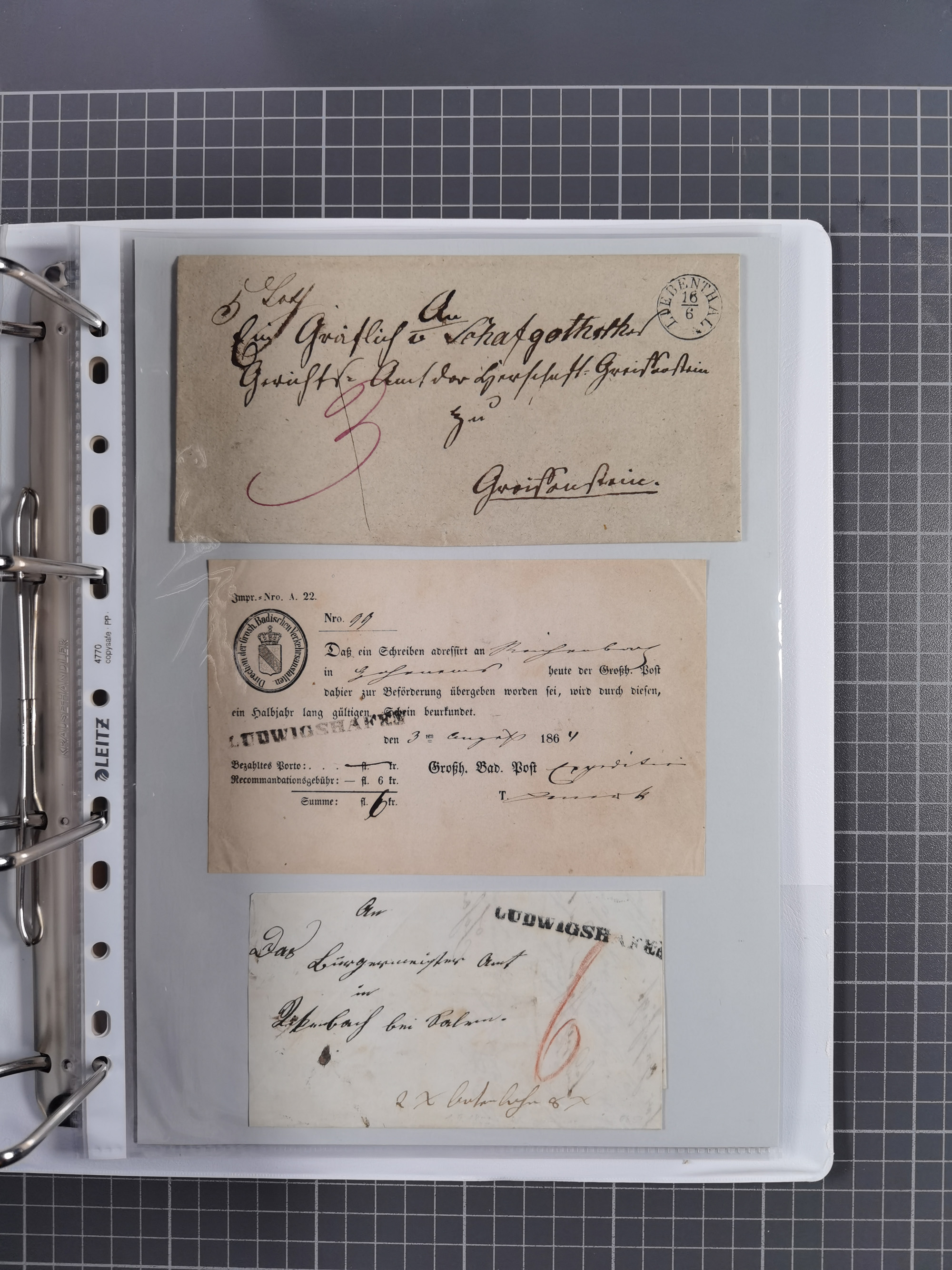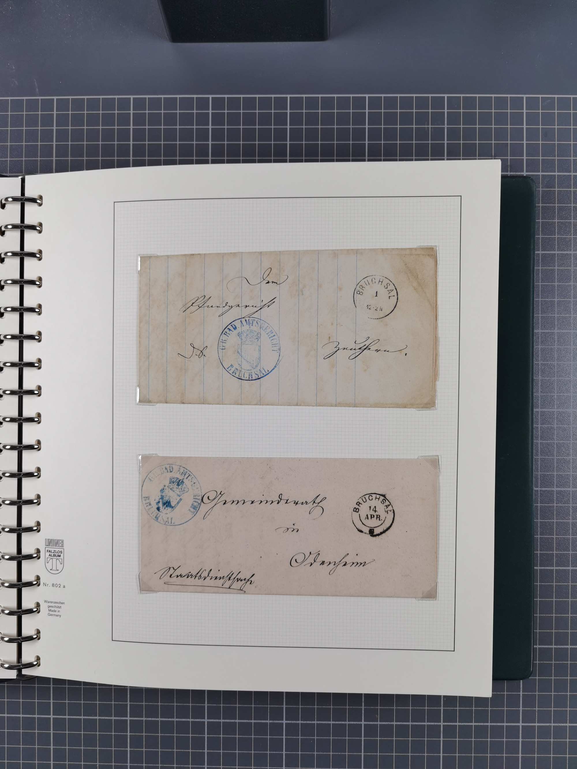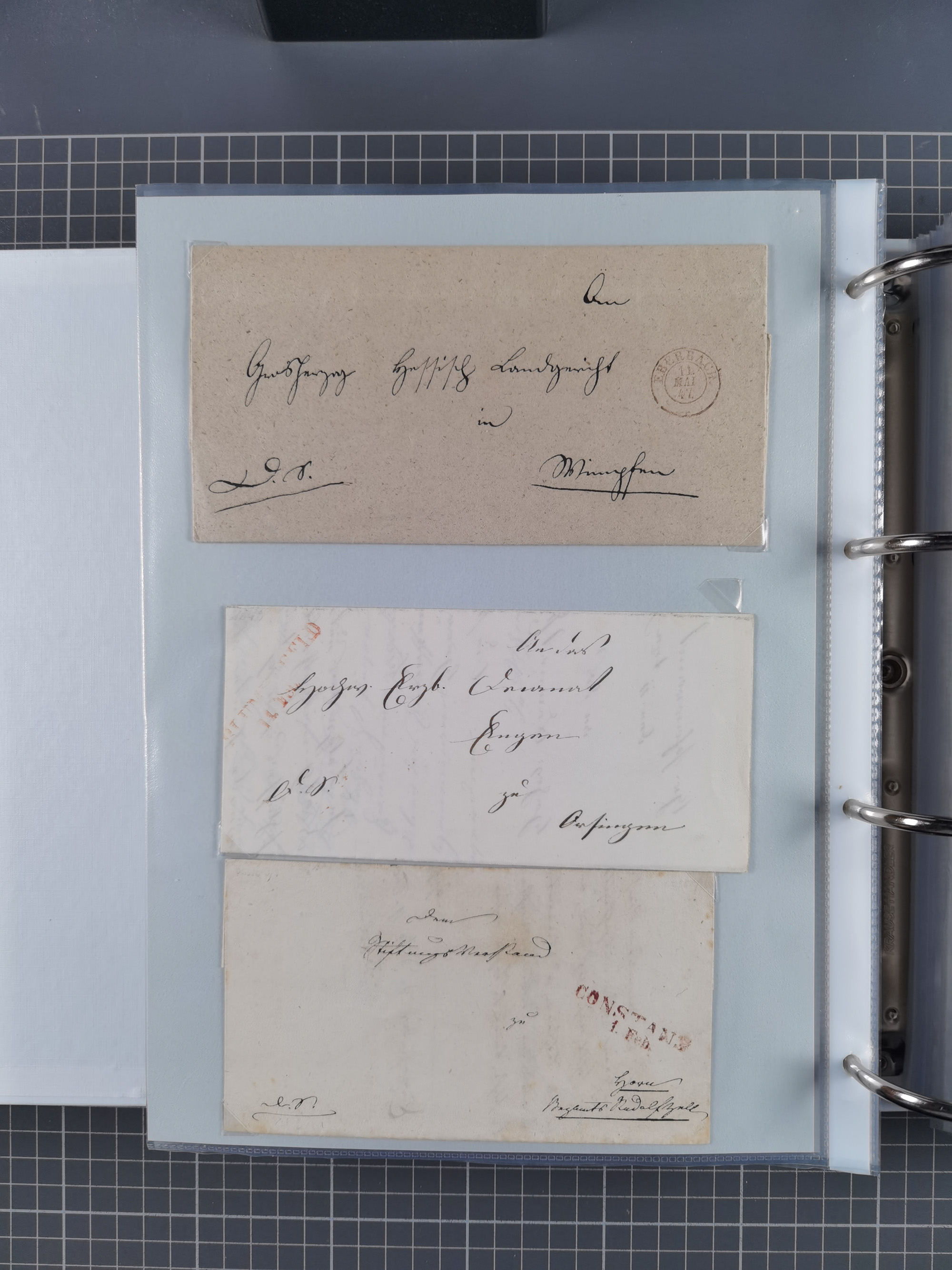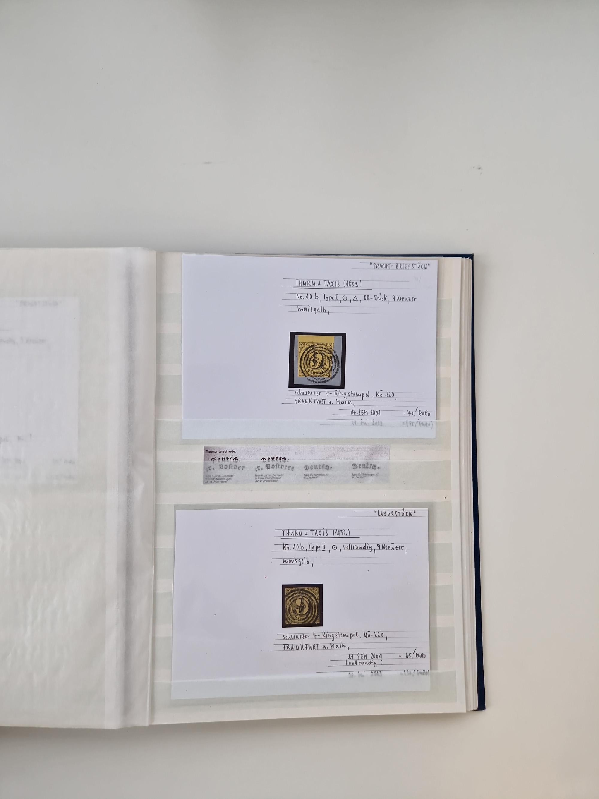 1830/86 (ca.), über 45 meist markenlose Briefe mit Steigbügelstempeln mit Schwerpunkt Württemberg, dabei u.a. HAIGERLOCH in rot auf Vorderseite, ALTSHAUSEN in blau (1844), BLAUFELDEN in waidblau (1850), ECHTERDINGEN in blau (1847), PLOCHINGEN, etc., auch einige Postscheine und Einzelmarken, im Album