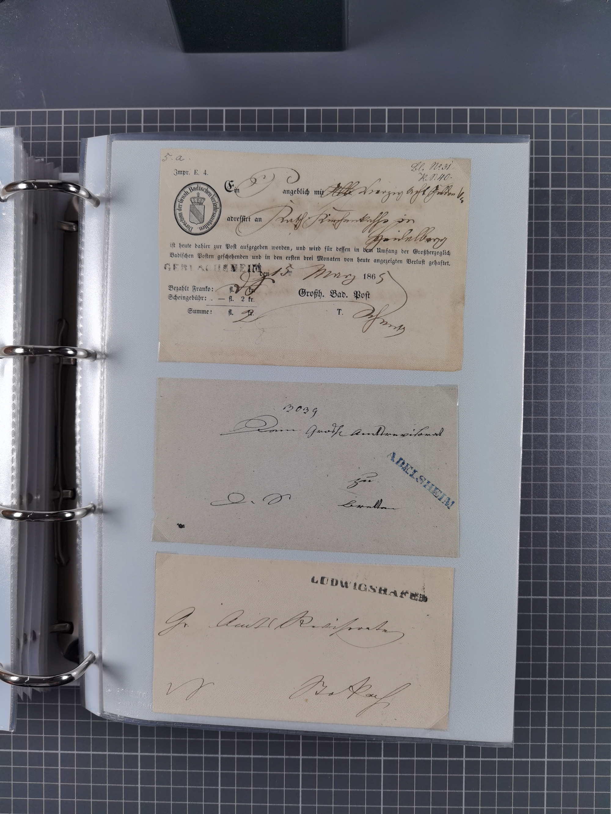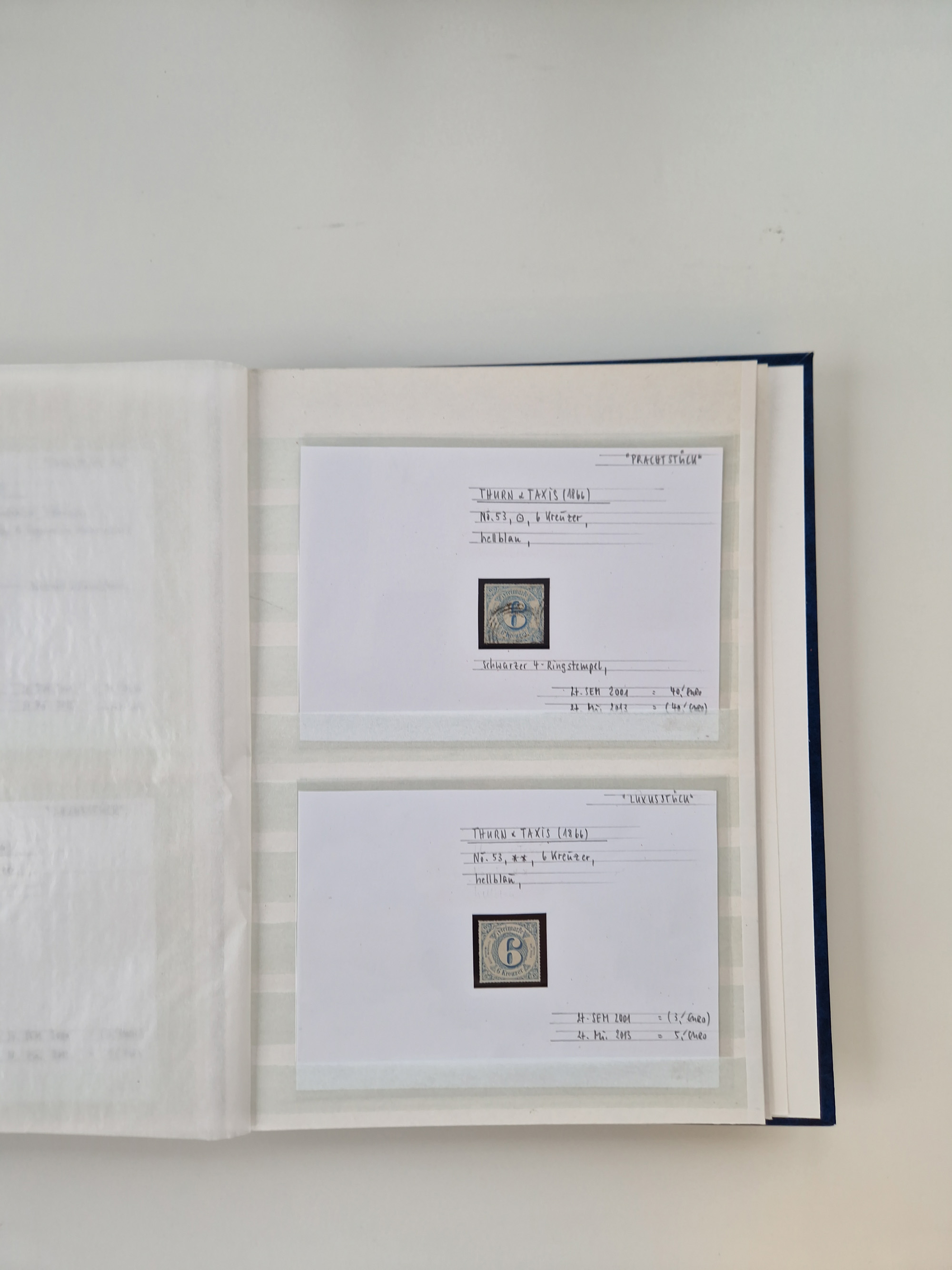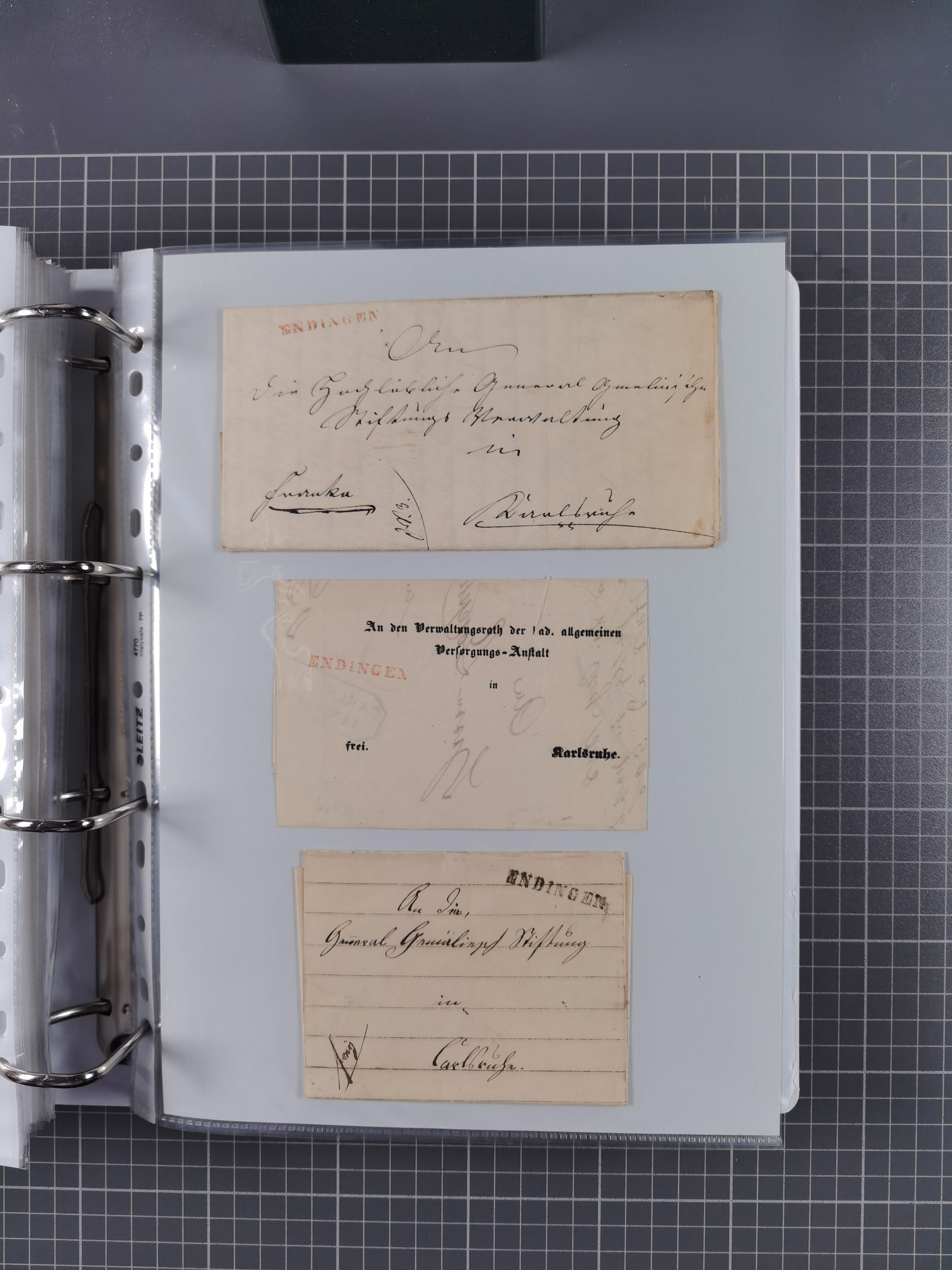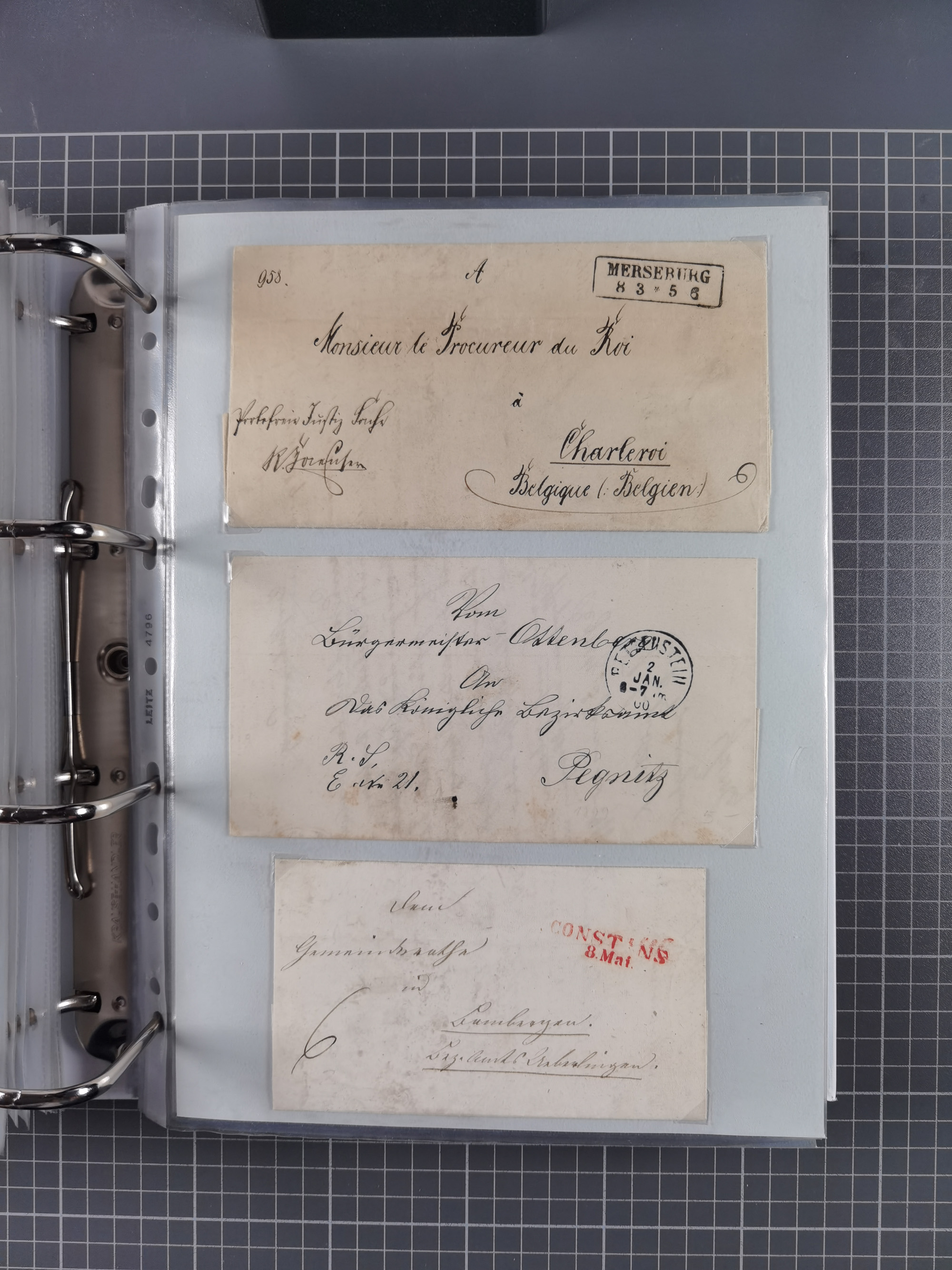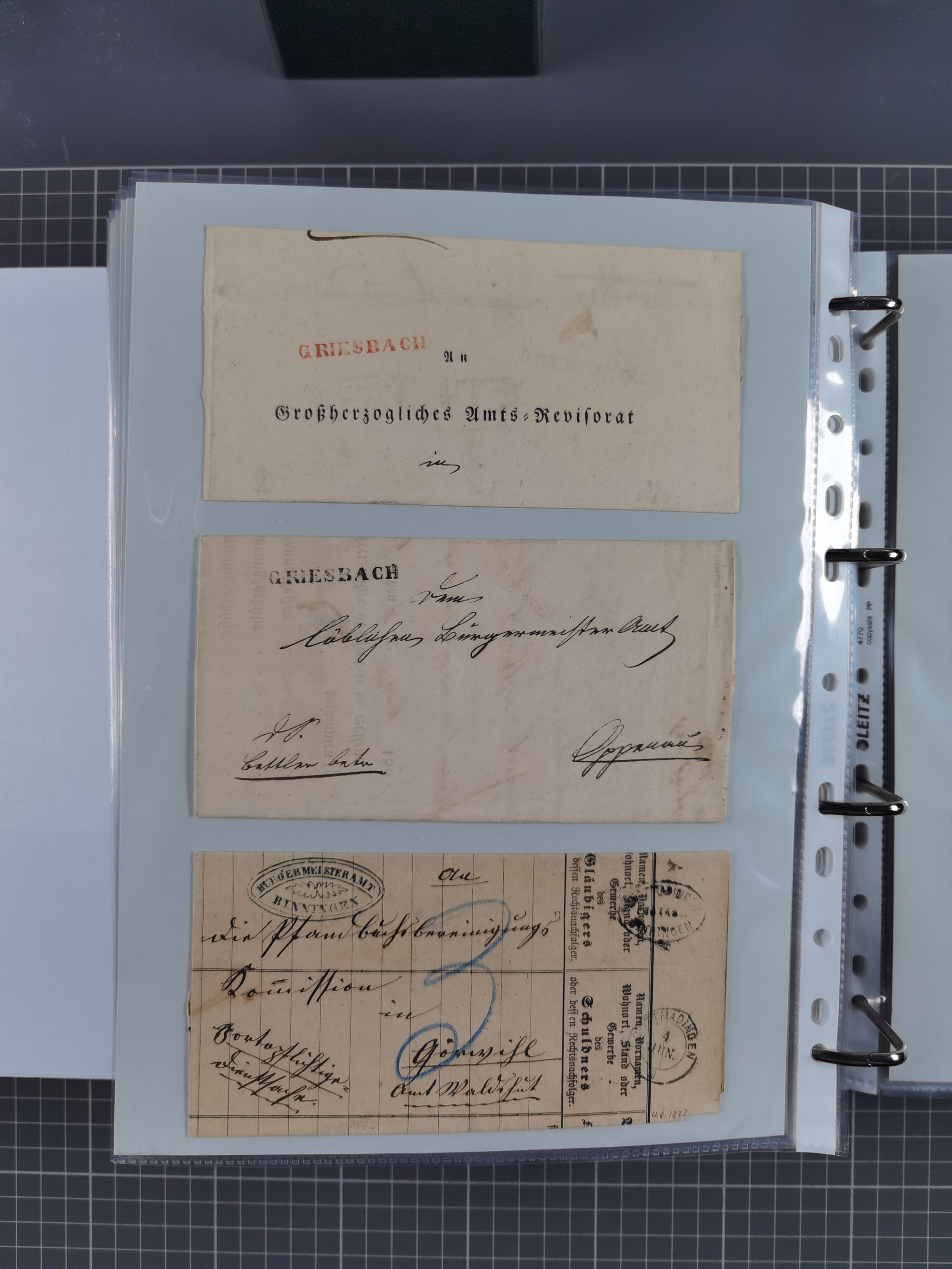 1830/86 (ca.), über 45 meist markenlose Briefe mit Steigbügelstempeln mit Schwerpunkt Württemberg, dabei u.a. HAIGERLOCH in rot auf Vorderseite, ALTSHAUSEN in blau (1844), BLAUFELDEN in waidblau (1850), ECHTERDINGEN in blau (1847), PLOCHINGEN, etc., auch einige Postscheine und Einzelmarken, im Album