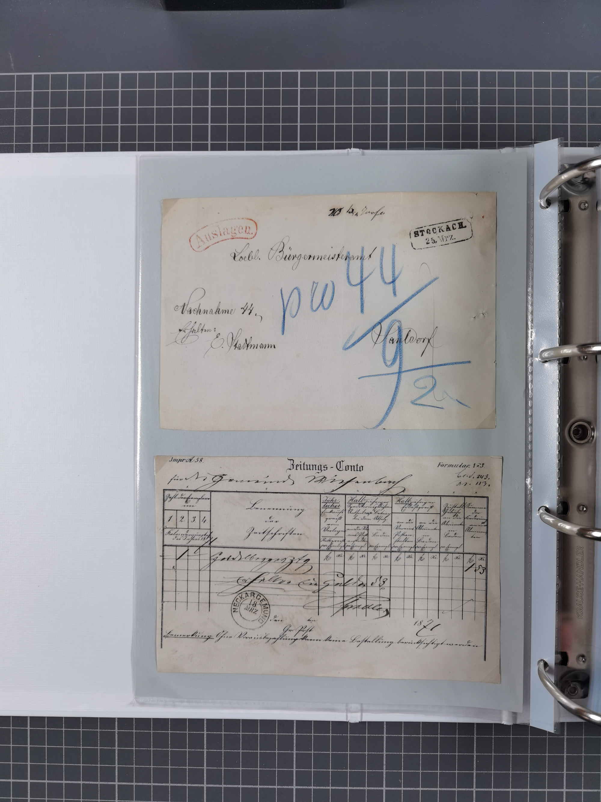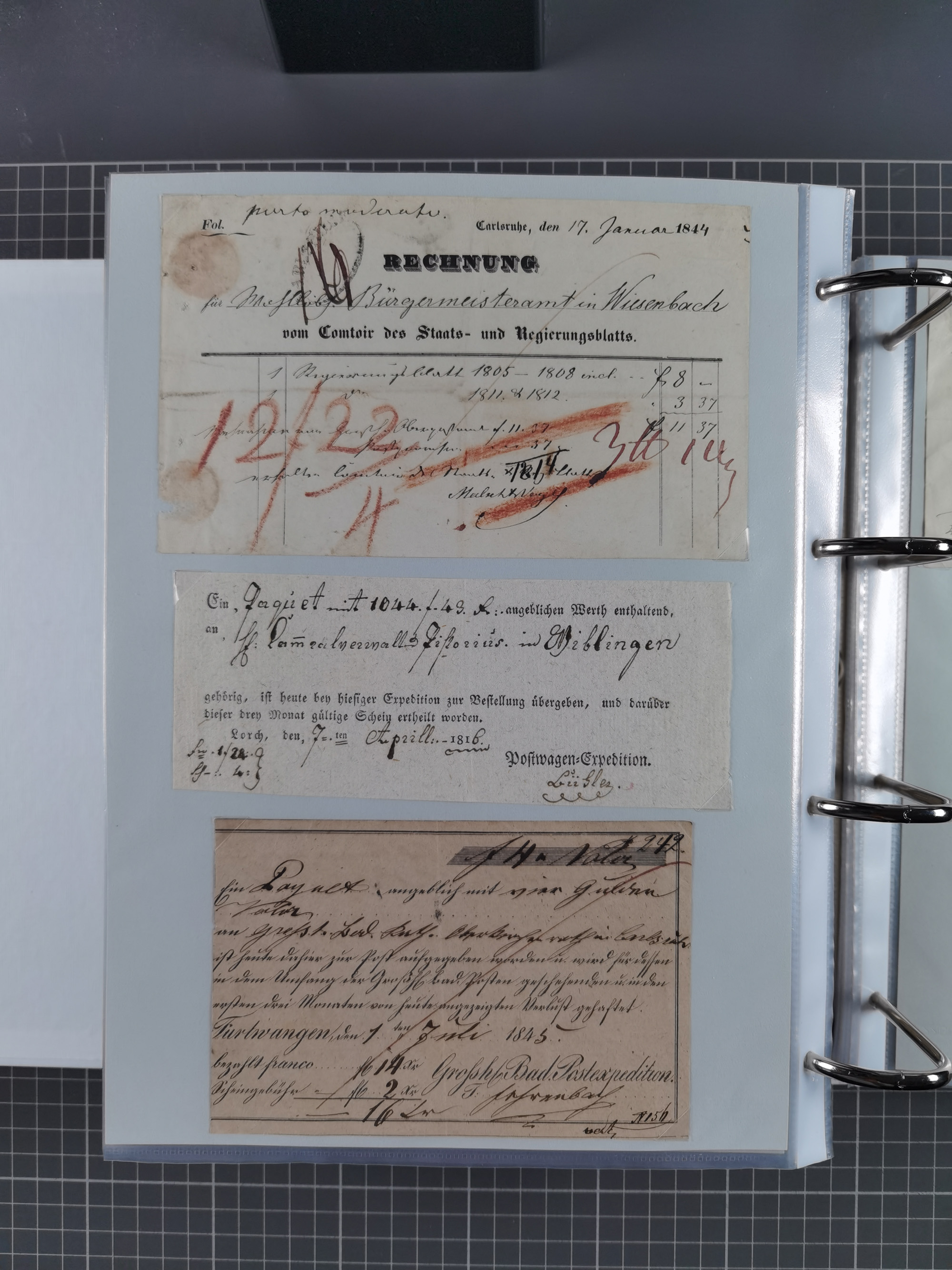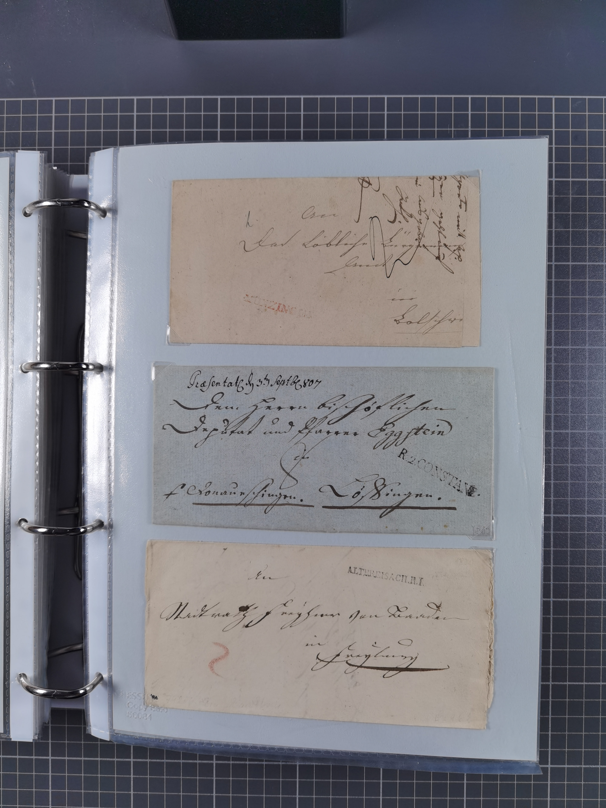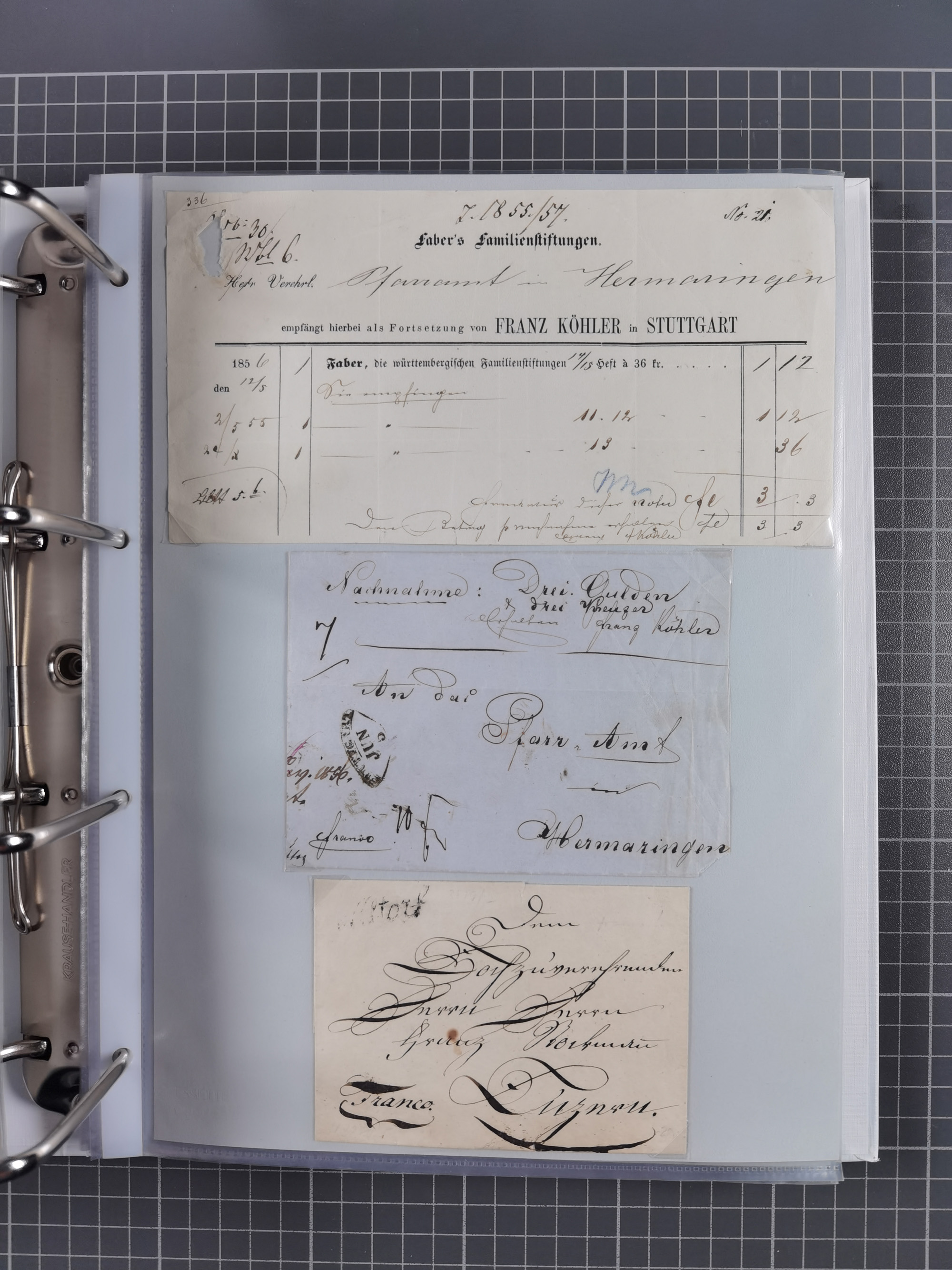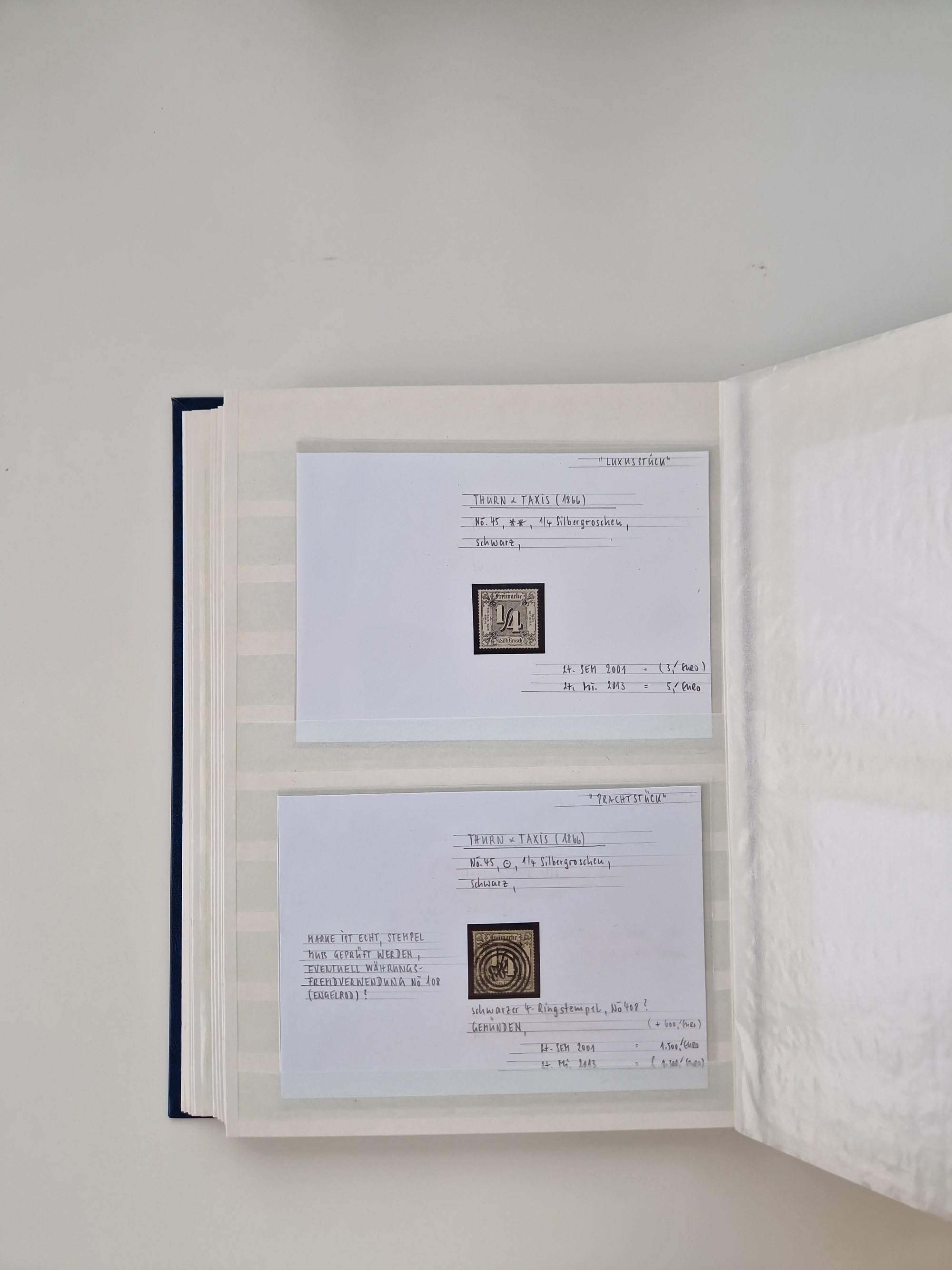1830/86 (ca.), über 45 meist markenlose Briefe mit Steigbügelstempeln mit Schwerpunkt Württemberg, dabei u.a. HAIGERLOCH in rot auf Vorderseite, ALTSHAUSEN in blau (1844), BLAUFELDEN in waidblau (1850), ECHTERDINGEN in blau (1847), PLOCHINGEN, etc., auch einige Postscheine und Einzelmarken, im Album