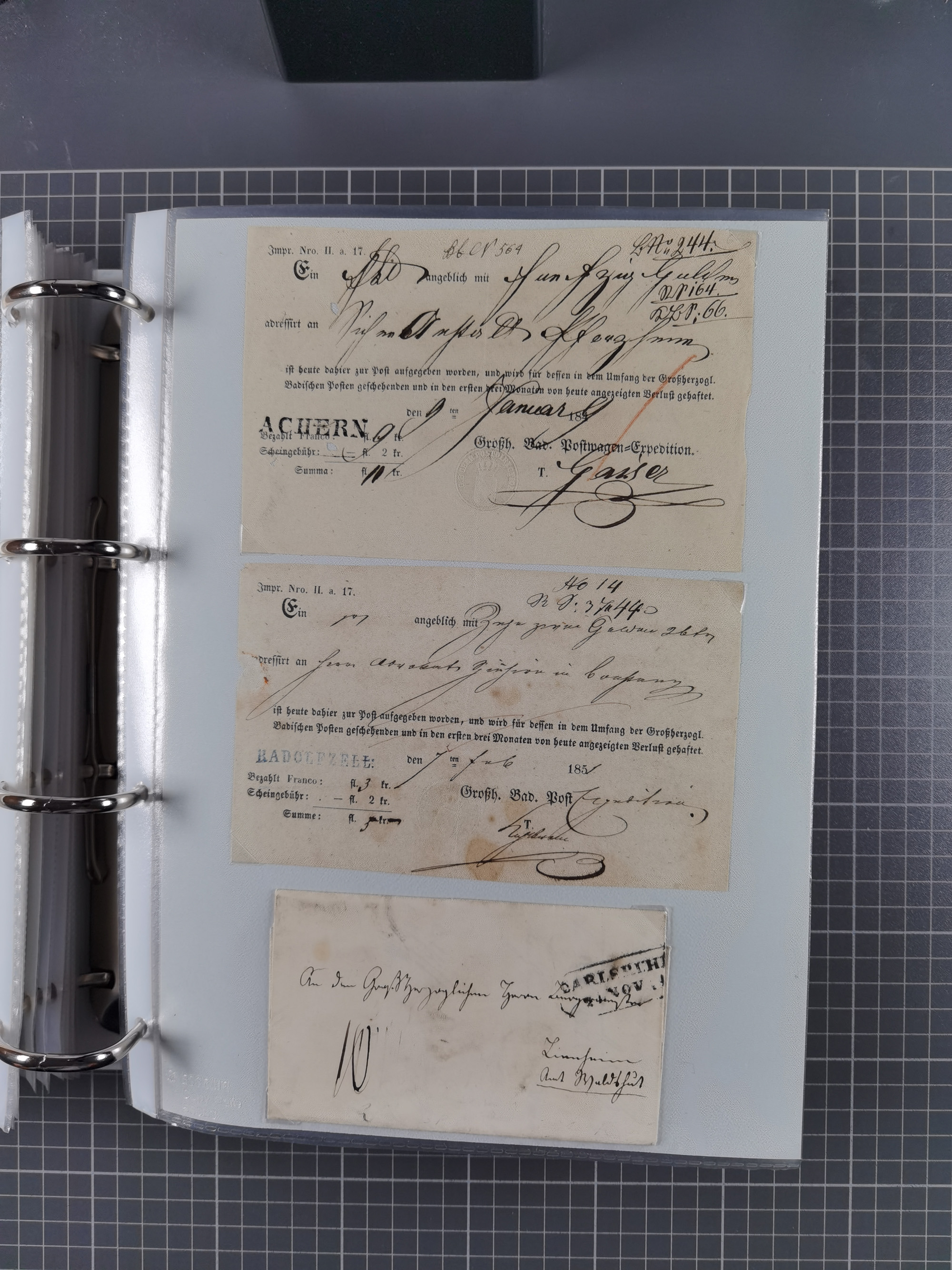 AACH bis ZELL, große Stempelsammlung von Vorphilatelie bis Nachverwendungen in 15 Schubern, mit über 900 Belegen und vielen losen Marken und Briefstücken, dabei seltene Nummernstempel auf Belegen, wie z.B. "9" BEROLZHEIM "10" BEUGGEN, "64" HEMSBACH (Vorderseite), "65" ICHENHEIM, "117" RIEDERN in schwarz und blau, "140" STOLLHOFEN, viele besondere Stempel, rote und blaue Nummernstempel, Bahnpost, daneben Frankatur-Besonderheiten, 'Muster ohne Wert', Reco, Ortsstempel auf geschnittenen Ausgaben, Ortsbrief der 3.Gewichtsstufe, Mischfrankatur nach Italien, etc. etc. vieles signiert, einige Atteste und Befunde. Ex Dr. Heinz Jaeger.
