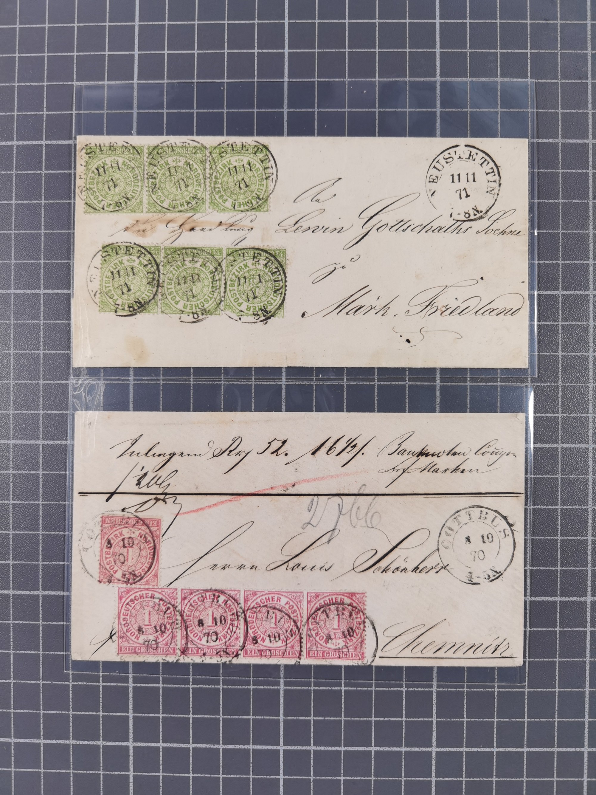 1870/71, 2 Briefe mit Mehrfachfrankaturen. 1 Brief von Neustettin 11.11.71 nach Mark Friedland mit 6 x 1/3 Groschen Mi. Nr. 14 (2 Marken wurden bereits fehlerhaft aufgeklebt) 1 Brief von Cottbus 1.10.70 nach Chemnitz (Banknoten Couvert Briefmarken") mit 5 x 1 Groschen Mi. Nr. 16