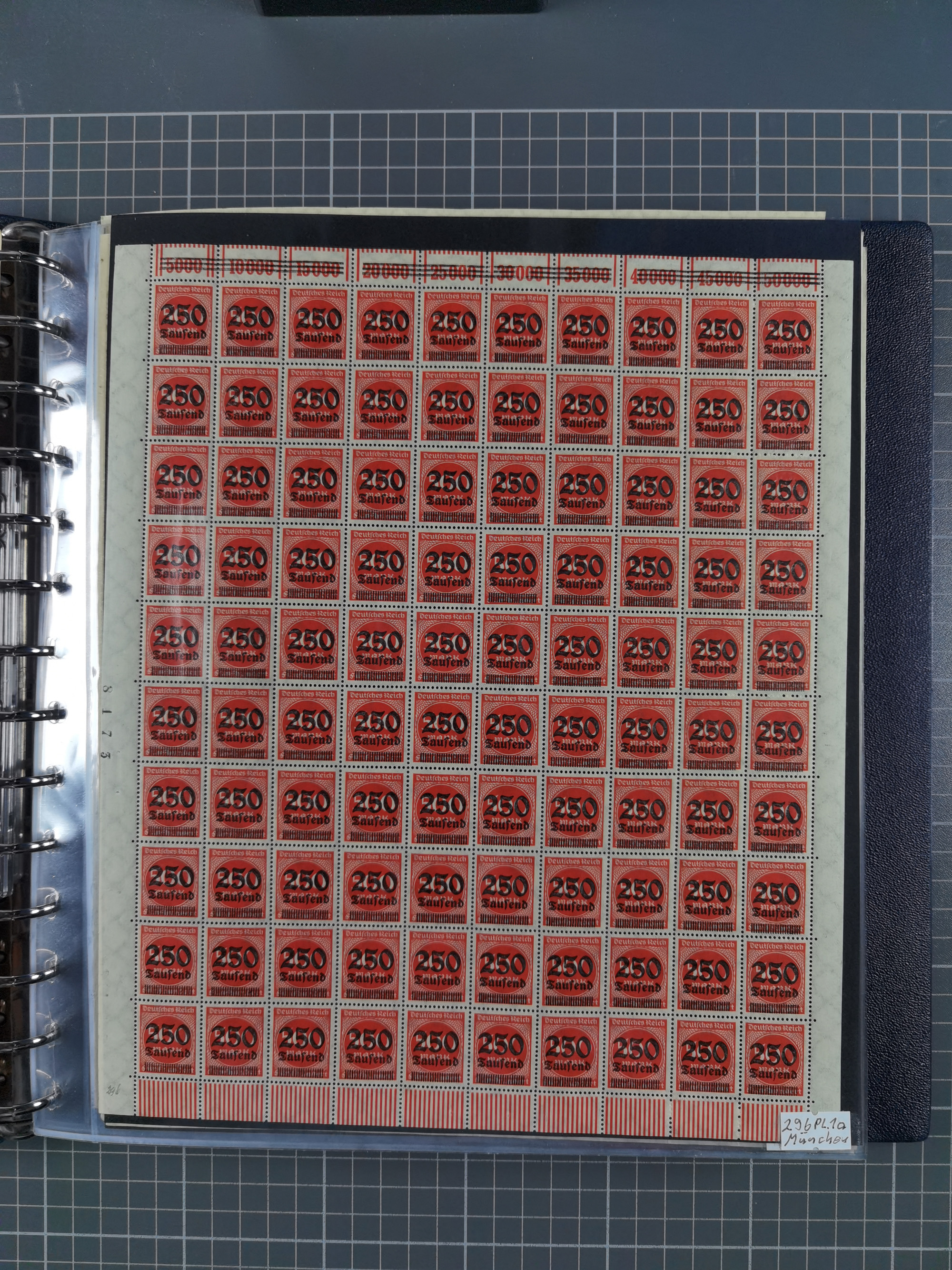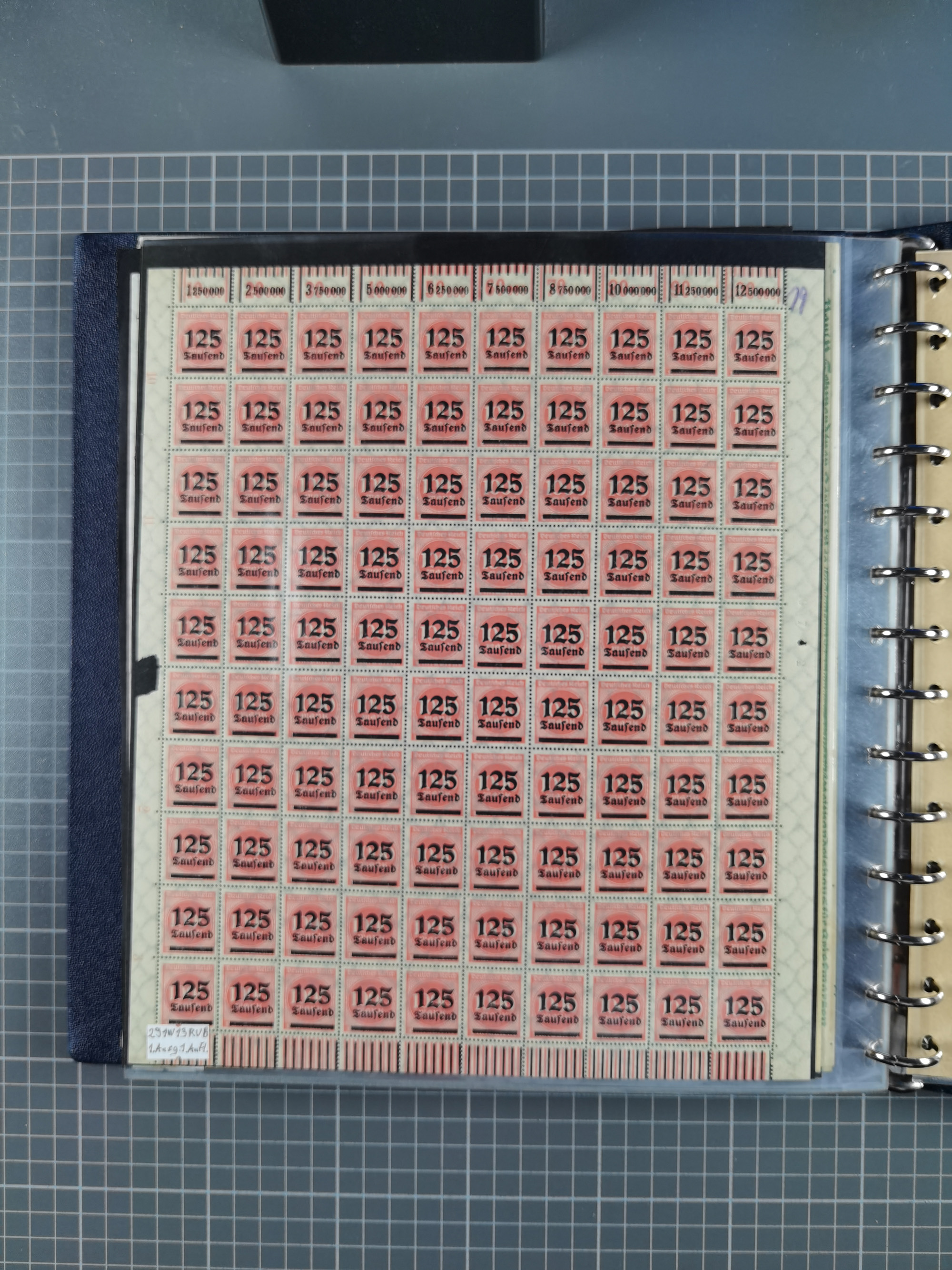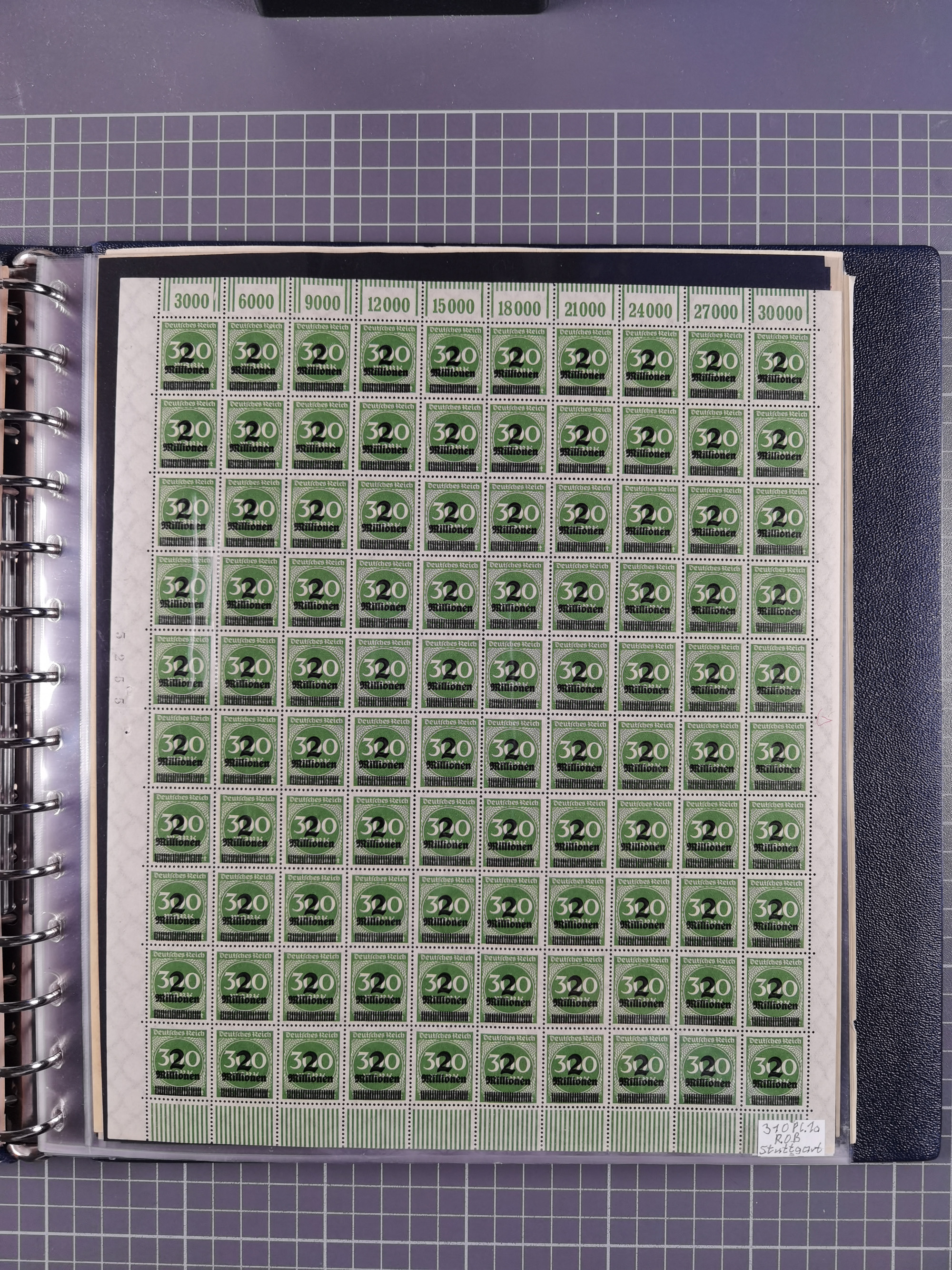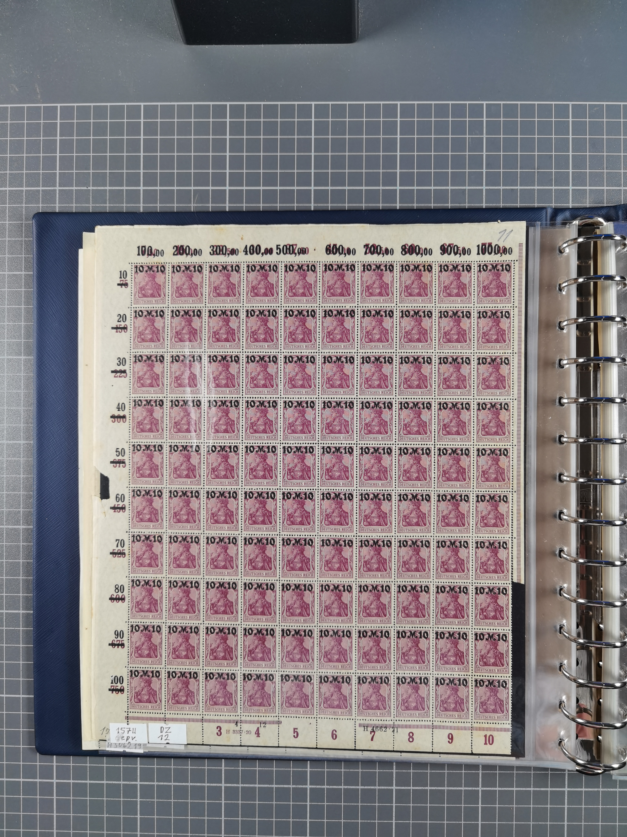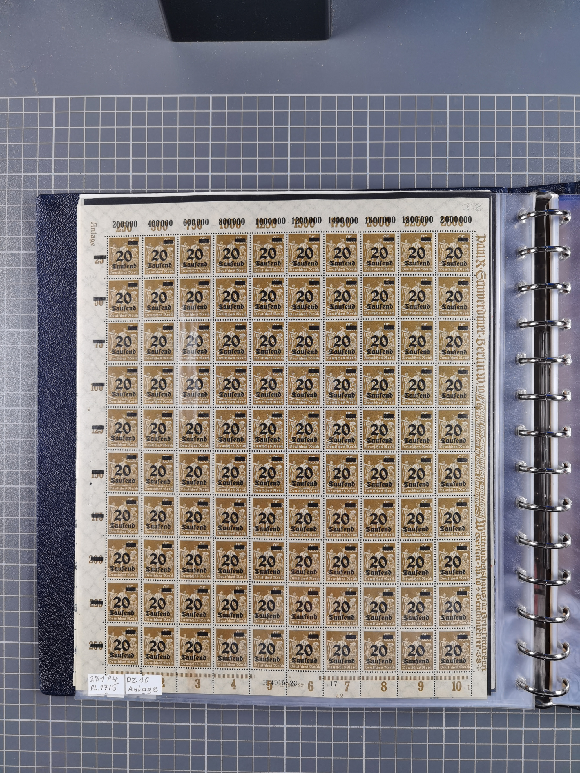 1920, meist postfrischer Bestand mit Mi.-Nr. 115 in 12 verschiedenen Bogen mit HAN “4891.20” mit geschlossener “4”, Plattenfehler XI, XV-XVII, unterschiedliche Farben, ein Bogen sign. Infla Berlin f, ein Bogen mit leichten Anhaftungen, einige leicht fleckig bzw. Randfehler
