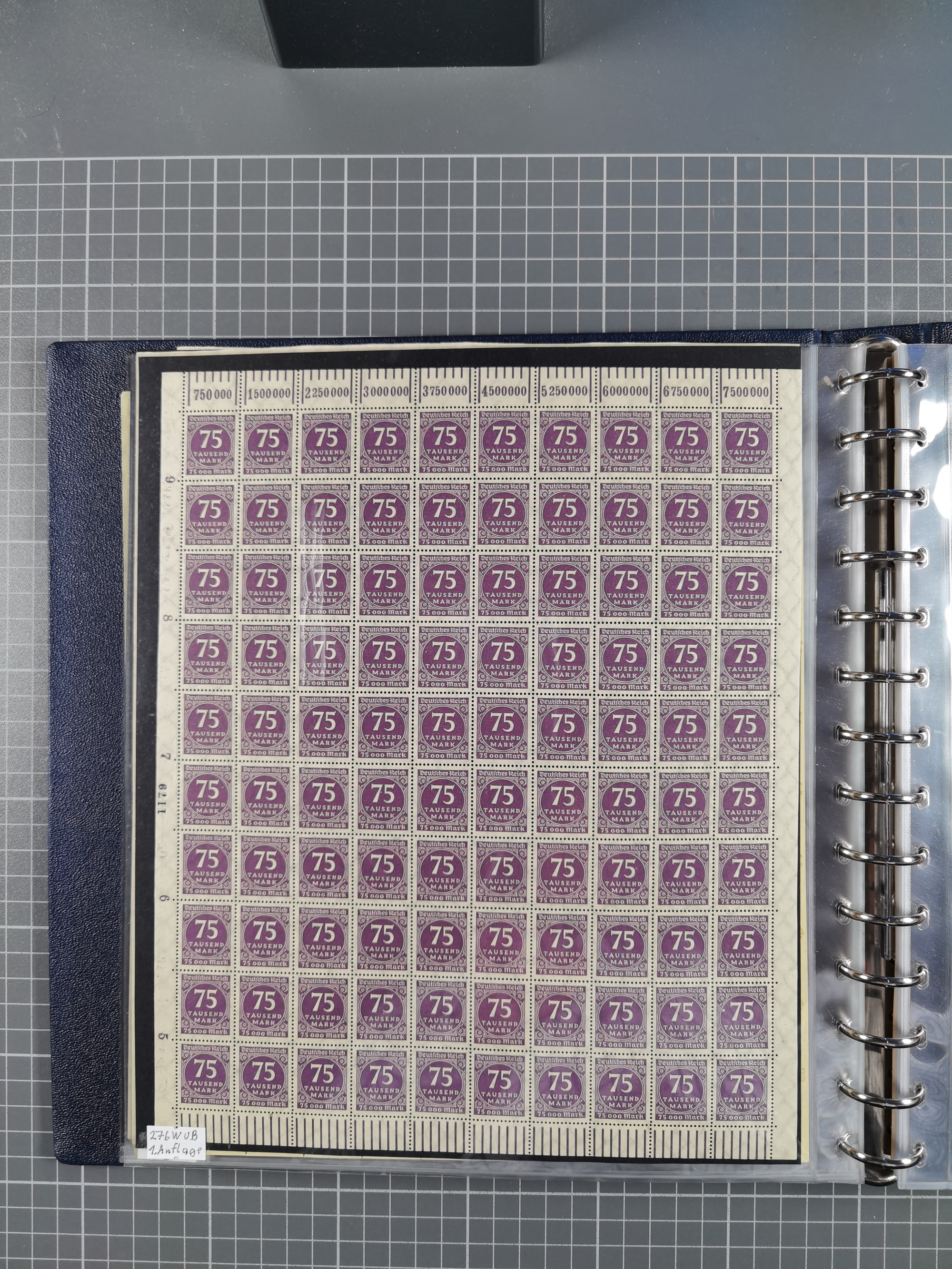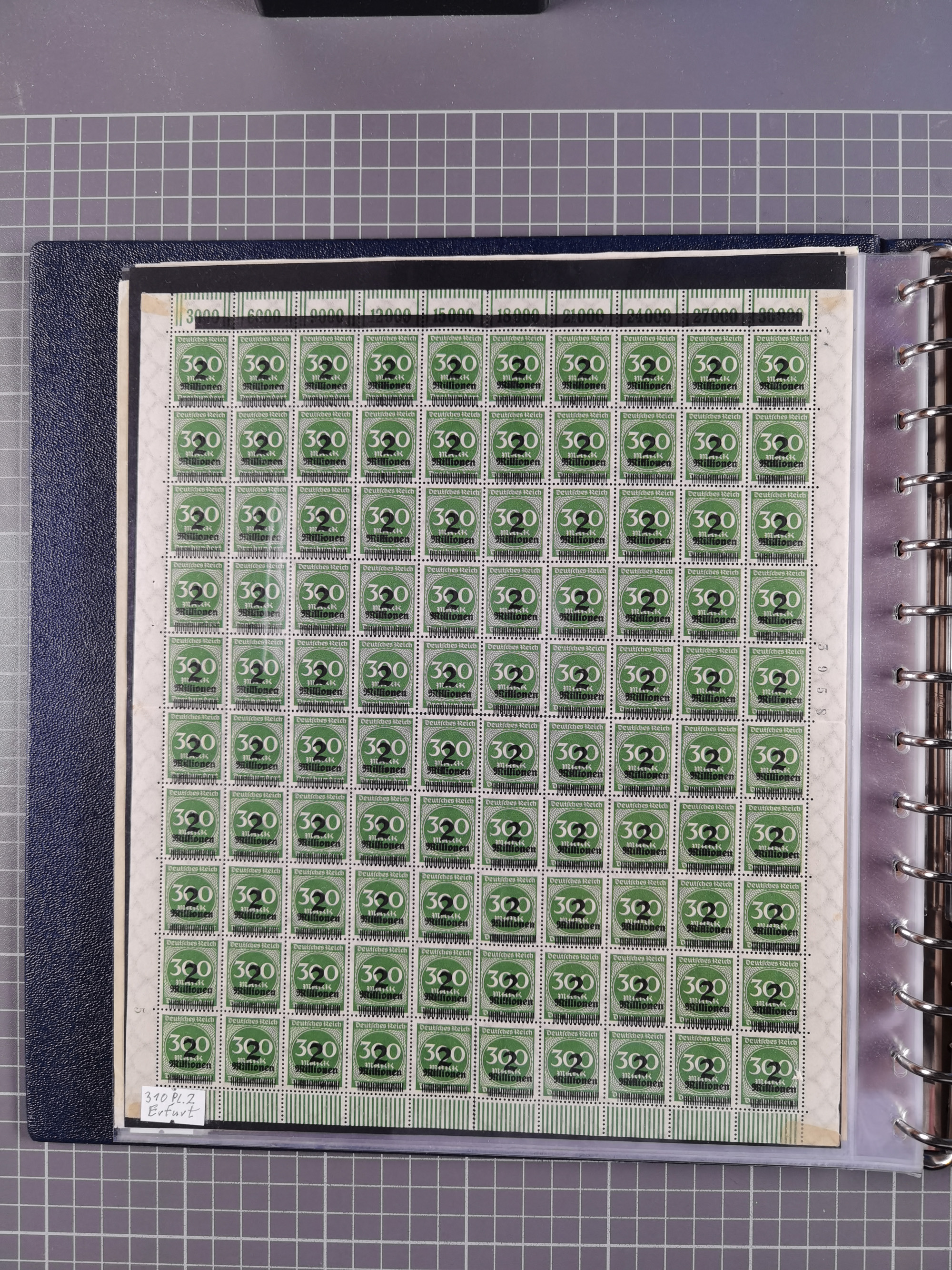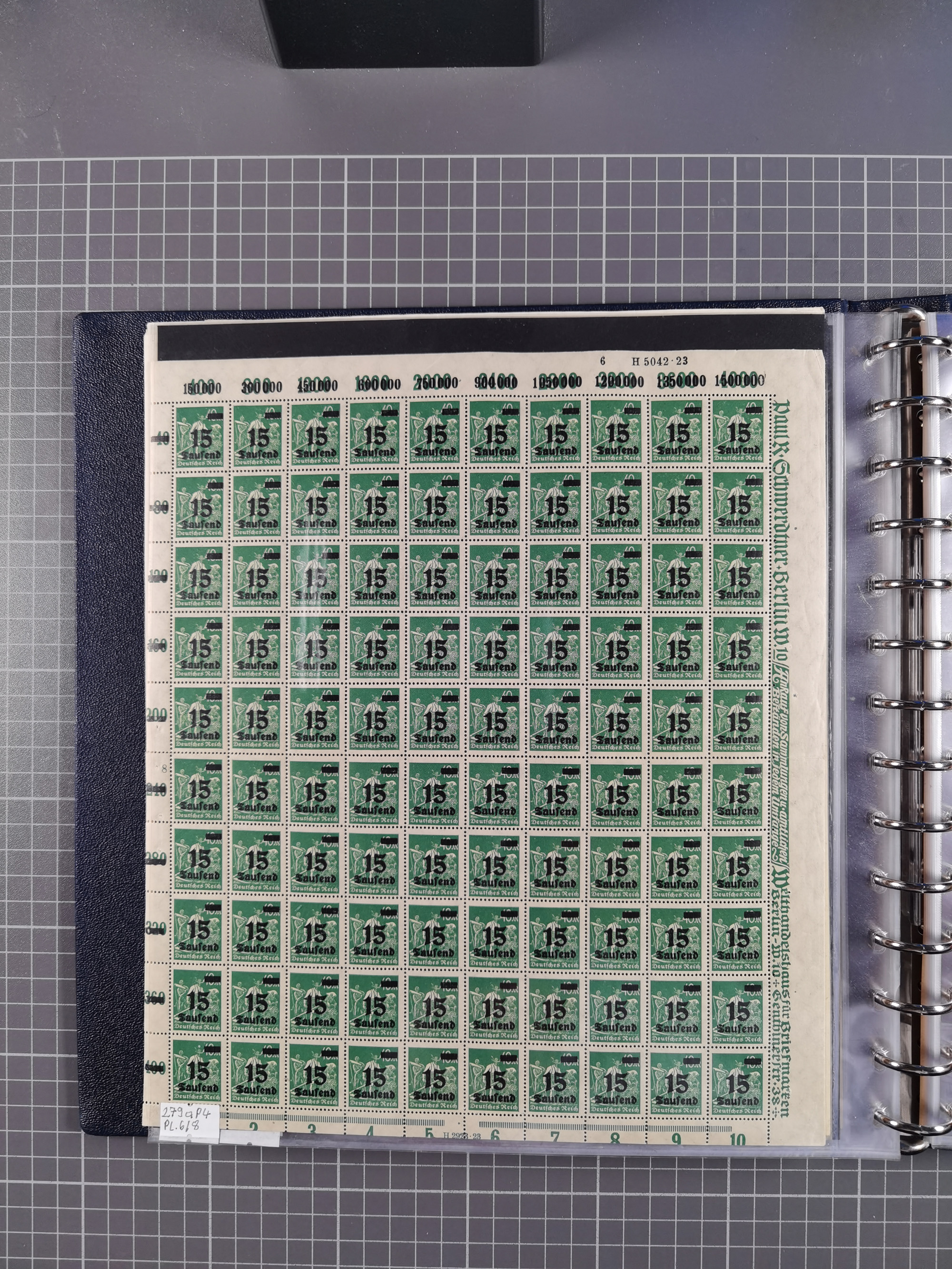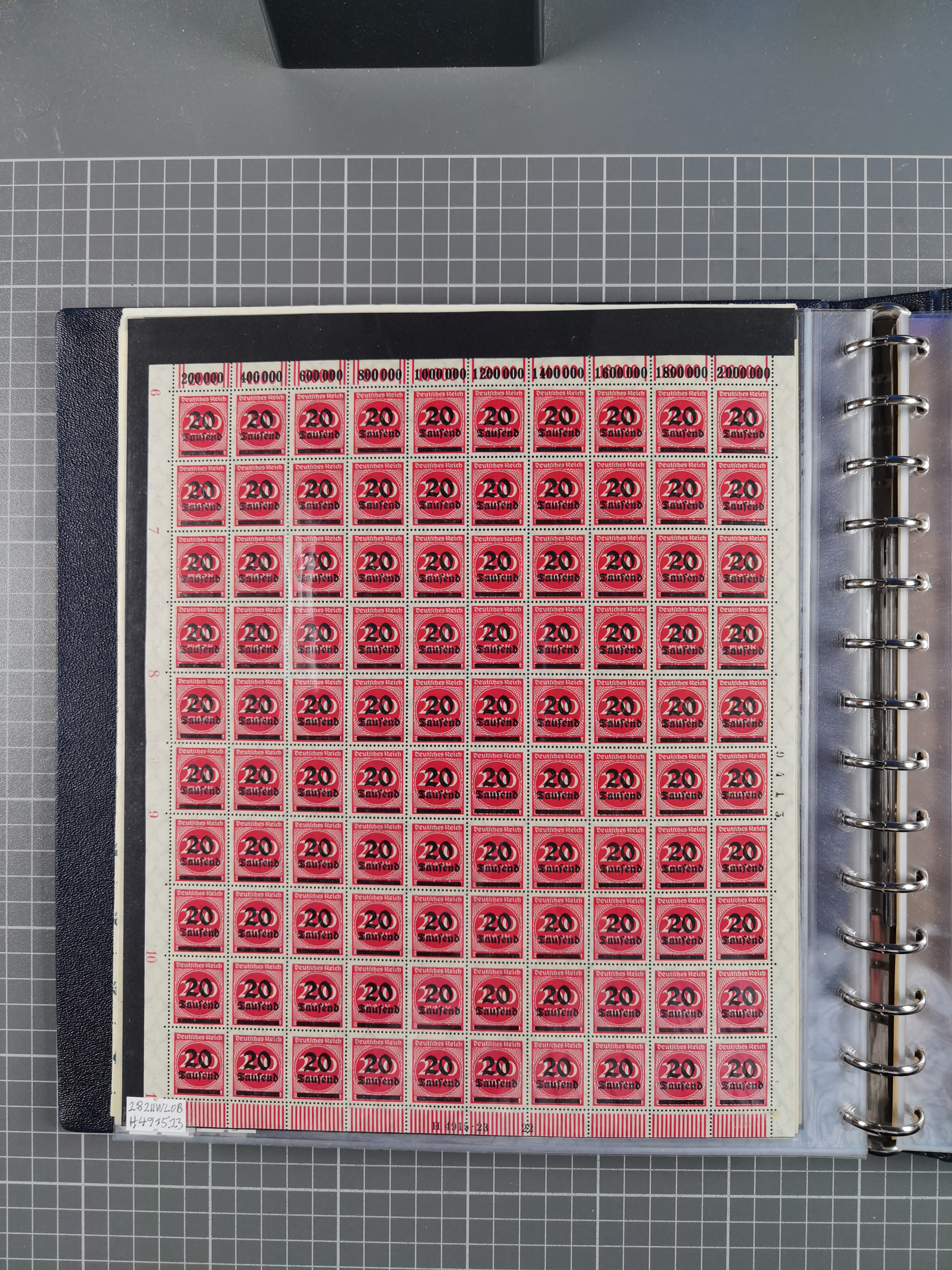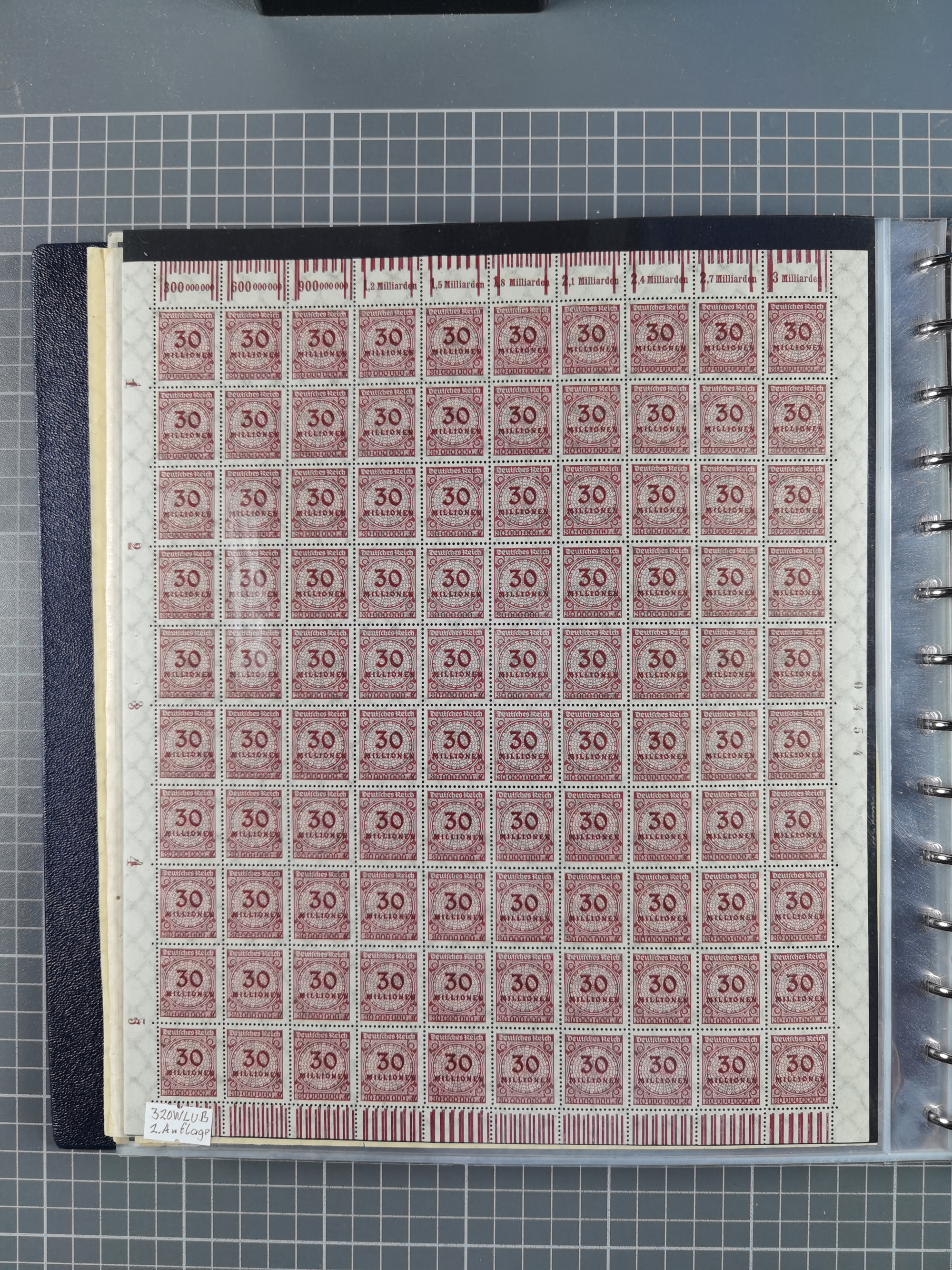 1920, meist postfrischer Bestand mit Mi.-Nr. 115 in 12 verschiedenen Bogen mit HAN “4891.20” mit geschlossener “4”, Plattenfehler XI, XV-XVII, unterschiedliche Farben, ein Bogen sign. Infla Berlin f, ein Bogen mit leichten Anhaftungen, einige leicht fleckig bzw. Randfehler