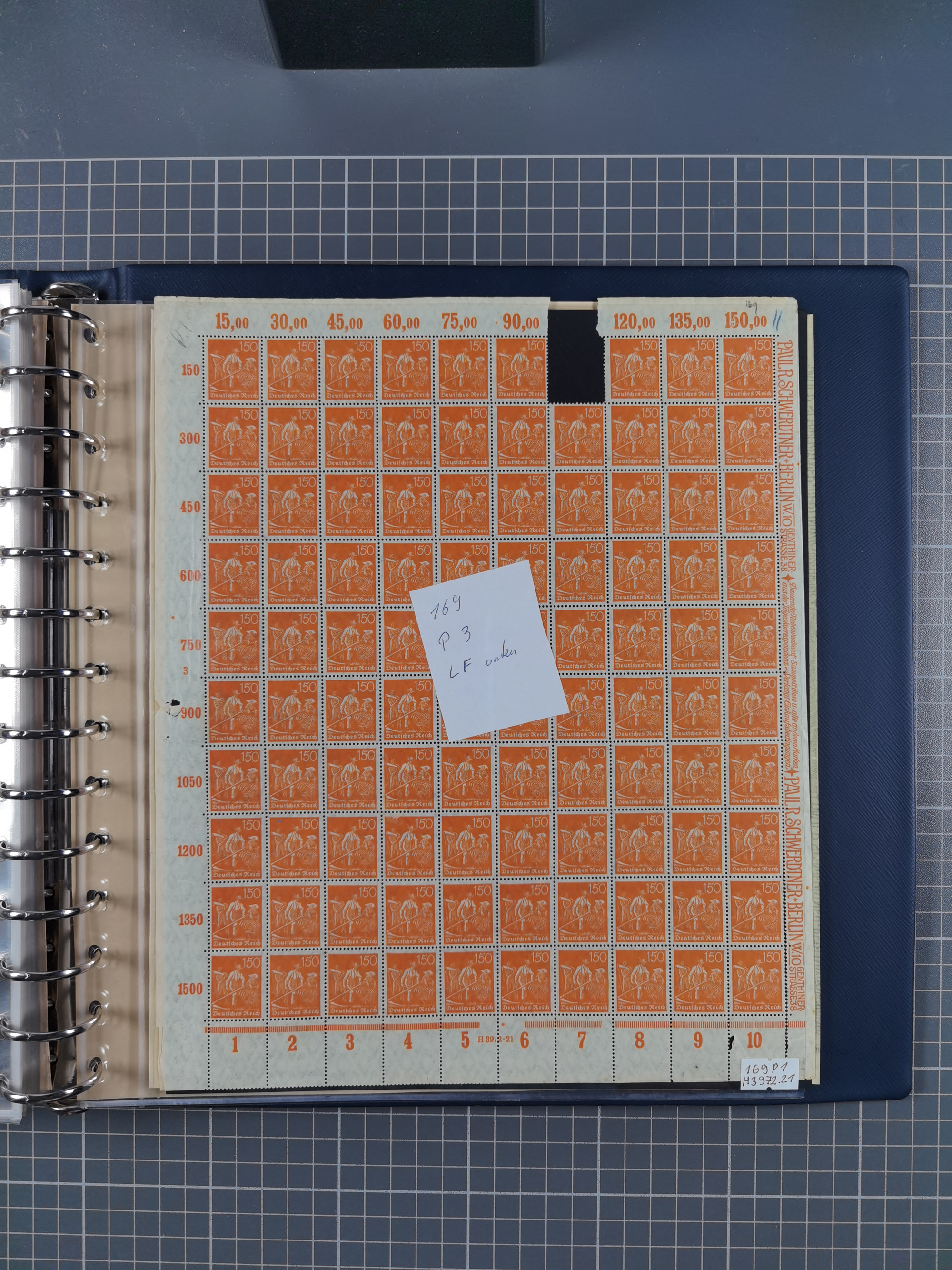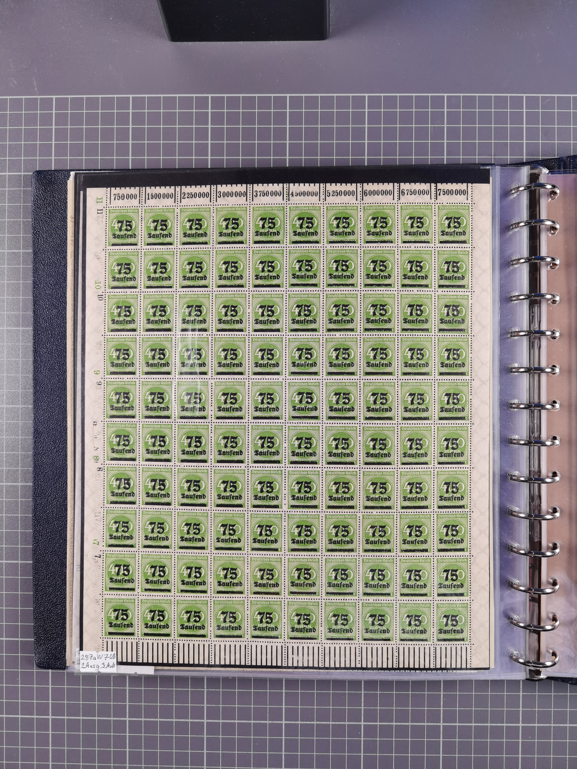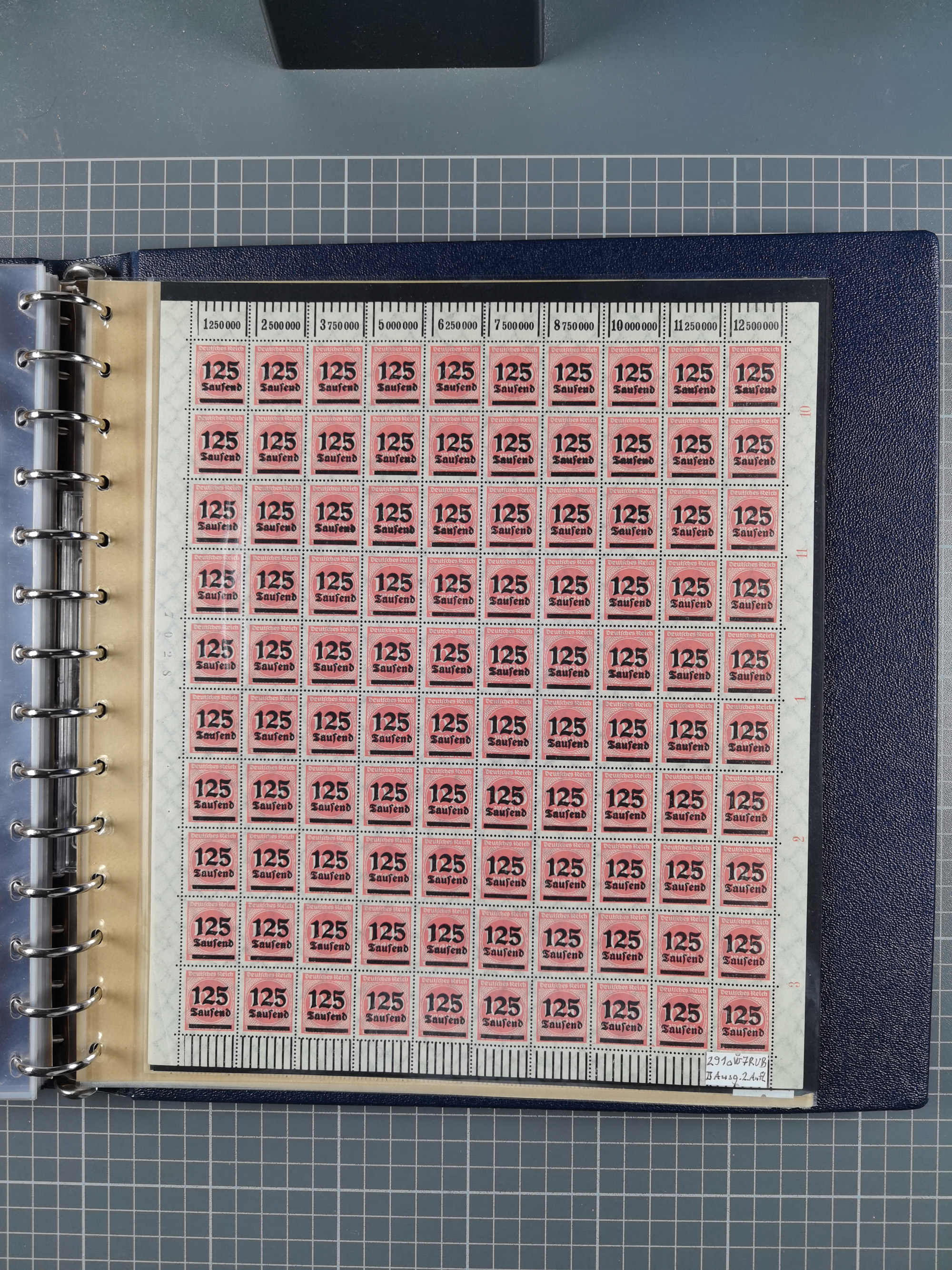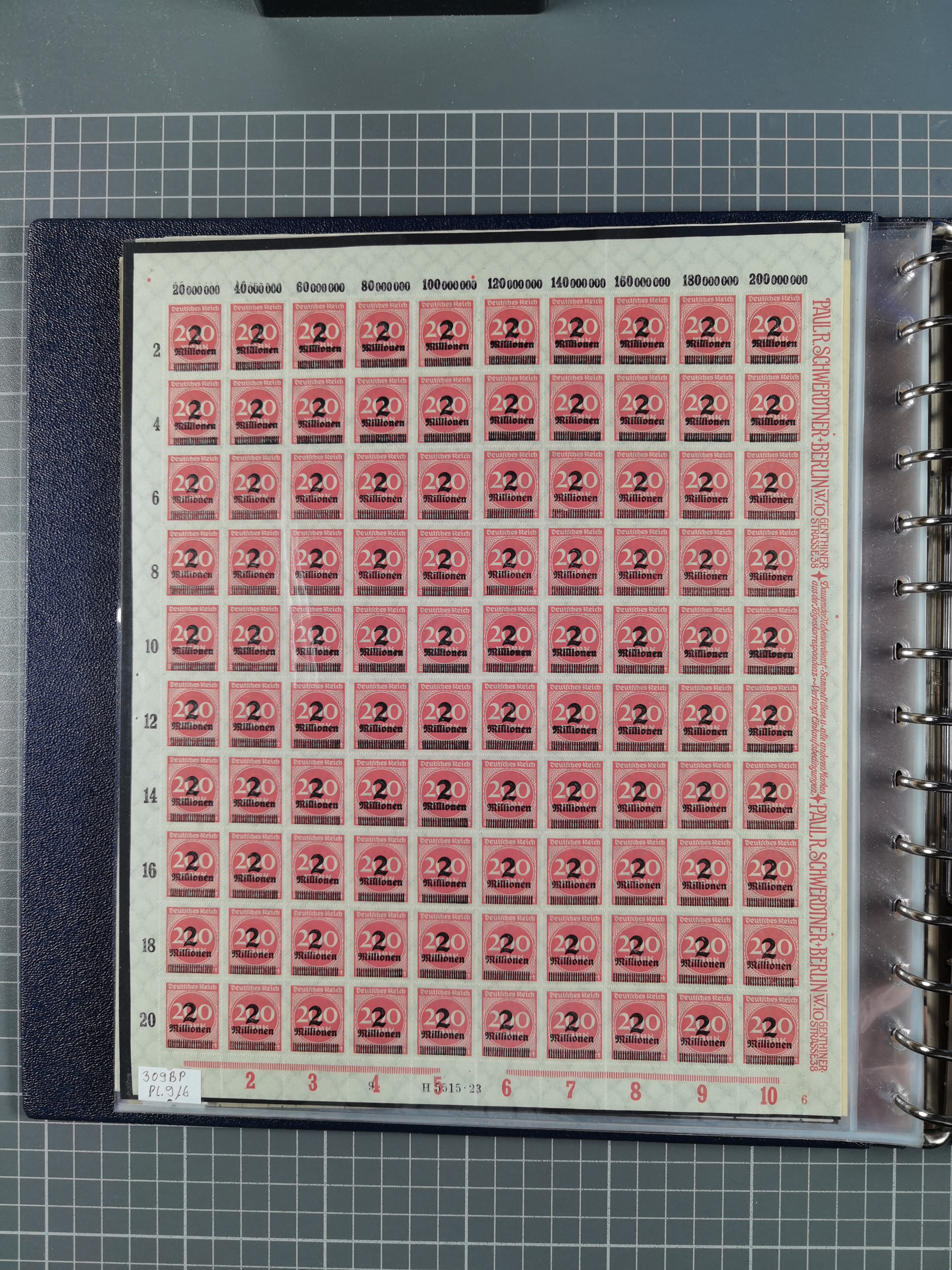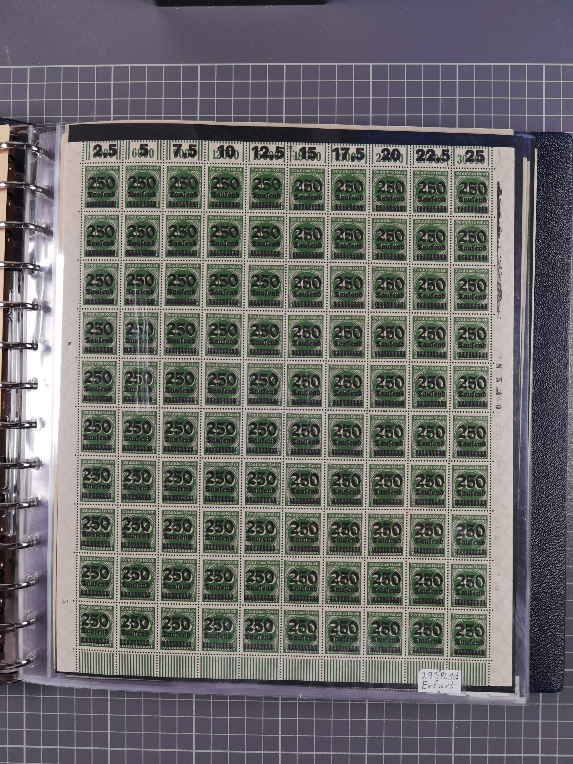 1920, meist postfrischer Bestand mit Mi.-Nr. 115 in 12 verschiedenen Bogen mit HAN “4891.20” mit geschlossener “4”, Plattenfehler XI, XV-XVII, unterschiedliche Farben, ein Bogen sign. Infla Berlin f, ein Bogen mit leichten Anhaftungen, einige leicht fleckig bzw. Randfehler