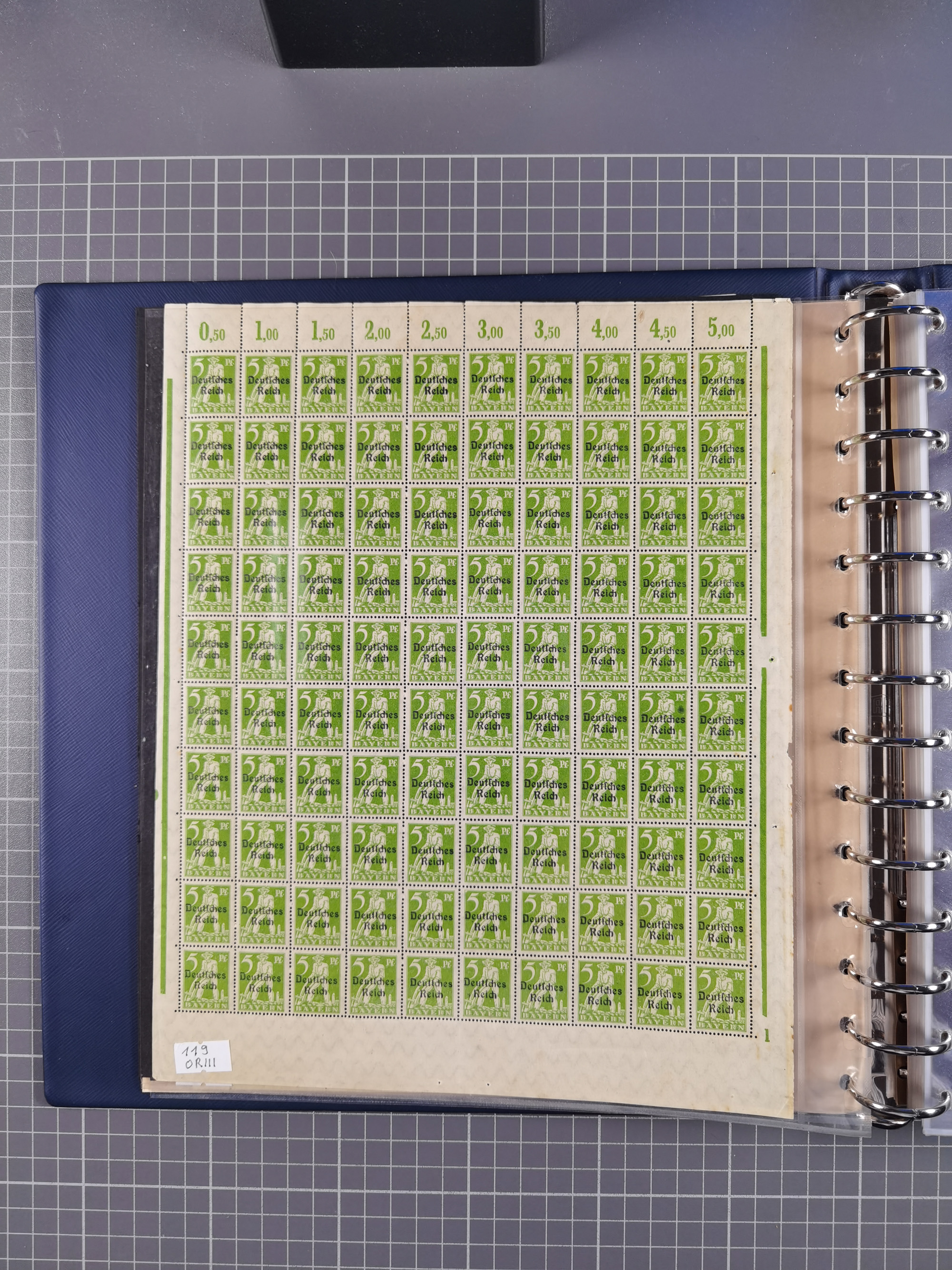 1920, postfrischer Bestand Germania 1.25 auf 1M. (2), 1.5 auf 1 M. (2) sowie 2.5 auf 2 M. (1), in kompletten Bögen, postfrisch, teils gefaltet mit Randfehlern (Mi.-Nr. 116-118)