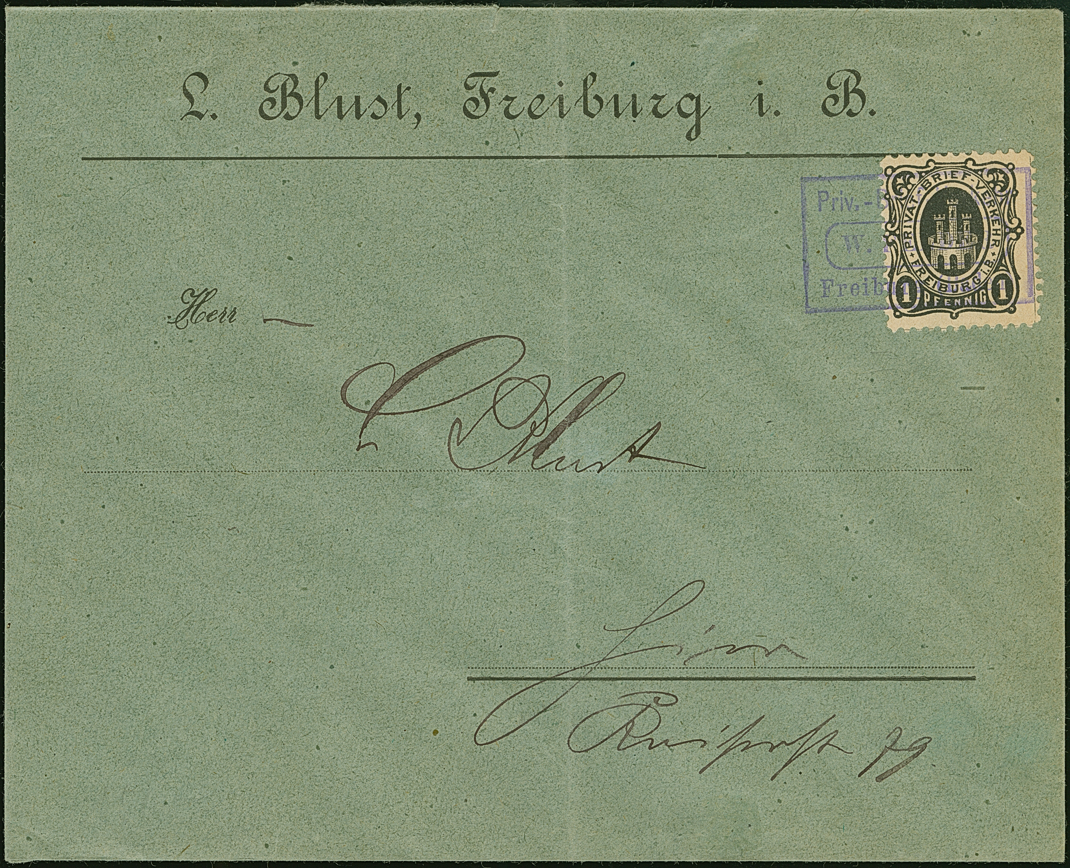 Freiburg-Privat-Brief-Verkehr: 1886, 1 Pfg. schwarz mit violettem Stempel “Priv.-Brief-Verkehr Freiburg (Baden) W. Felder” auf Vordruckbrief “L. BLust, Freiburg i. B.”. Der Umschlag mit senkrechter Faltung und rückseitig mit Einriss, ansonsten in guter Erhaltung