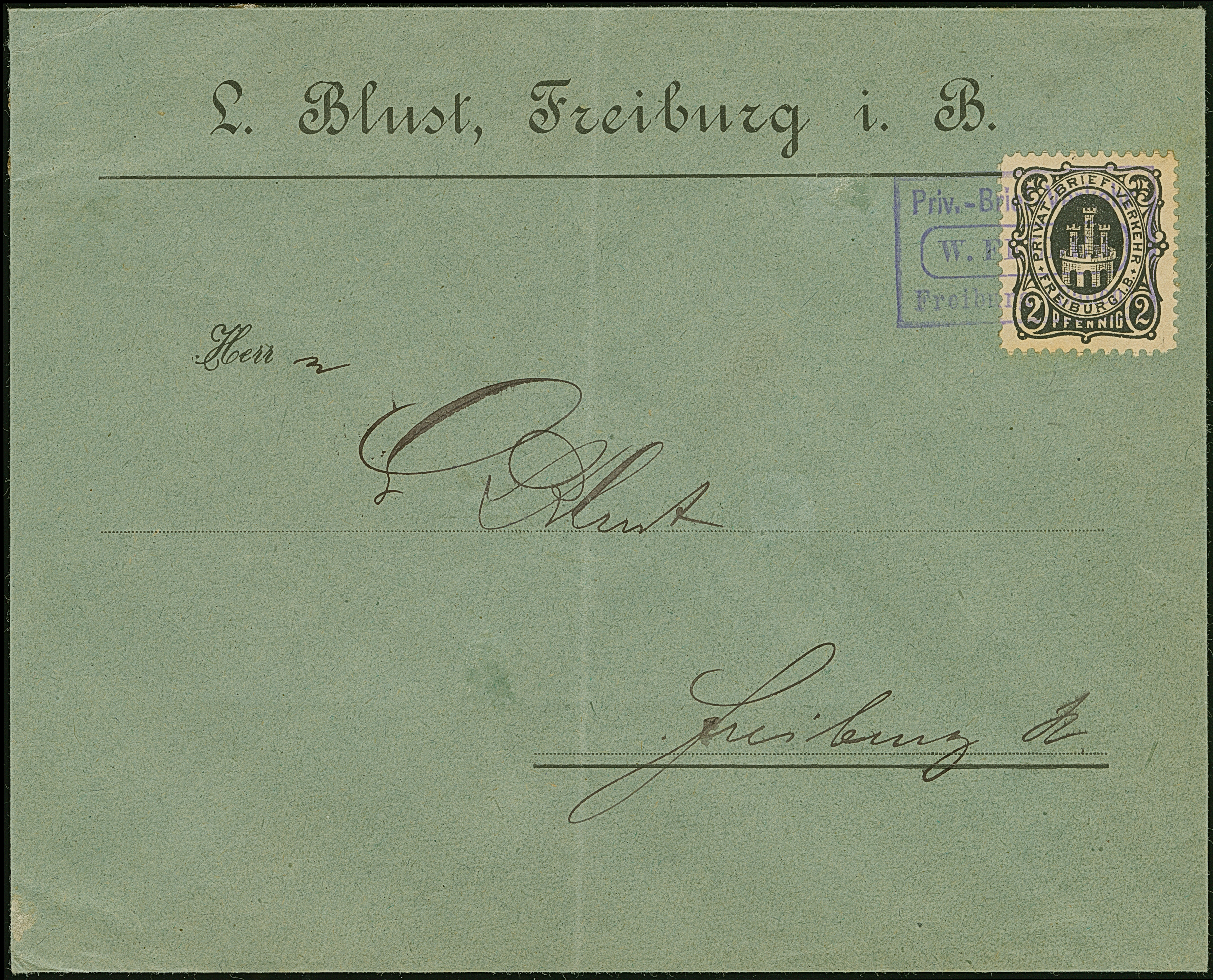 Freiburg-Privat-Brief-Verkehr: 1886, 2 Pfg. schwarz mit violettem Stempel “Priv.-Brief-Verkehr Freiburg (Baden) W. Felder” auf Vordruckbrief “L. BLust, Freiburg i. B.” im Ortsverkehr. Der Umschlag mit senkrechter Faltung und rückseitig mit verklebten Öffnungsfehlern, ansonsten in guter Erhaltung