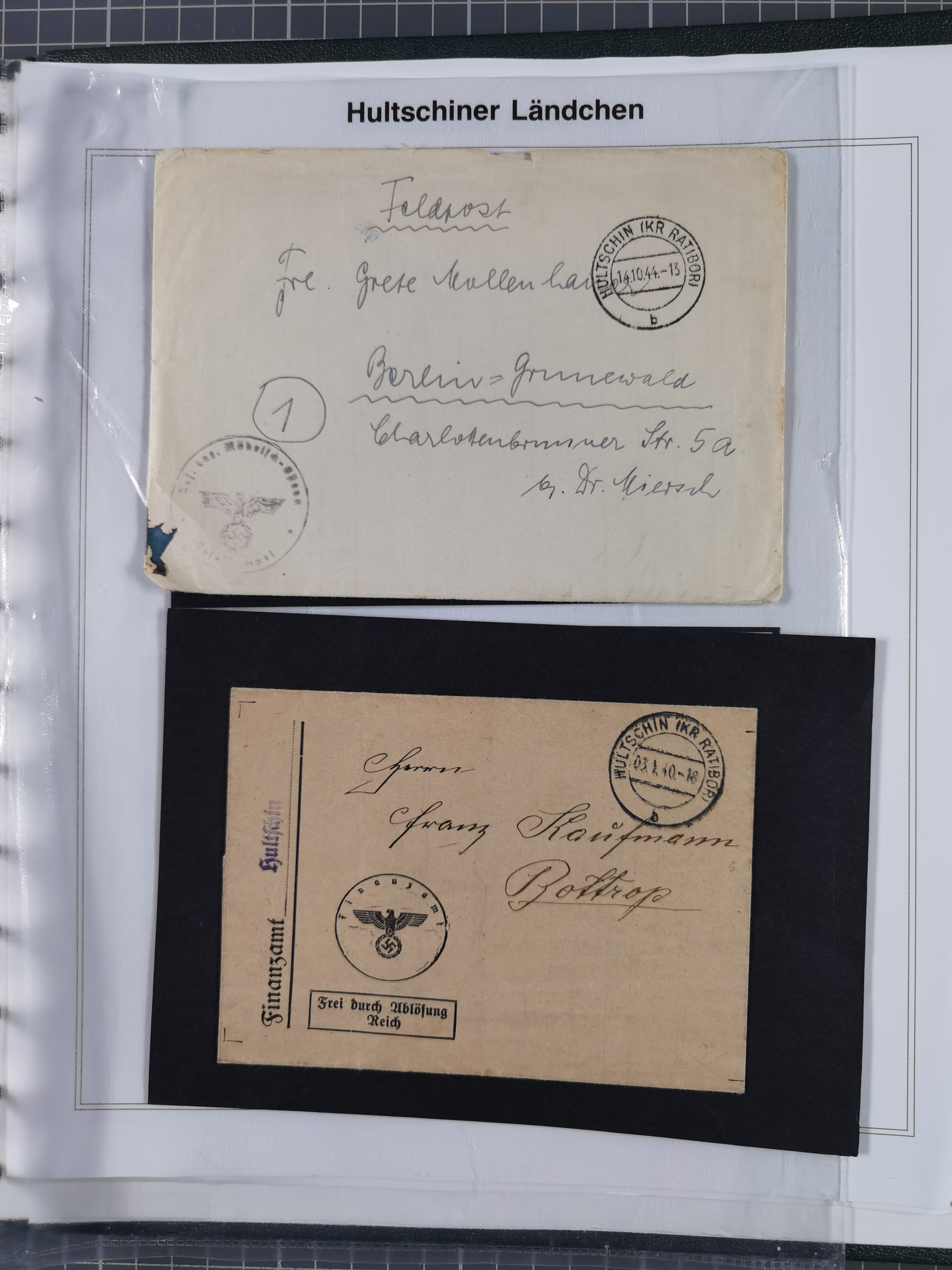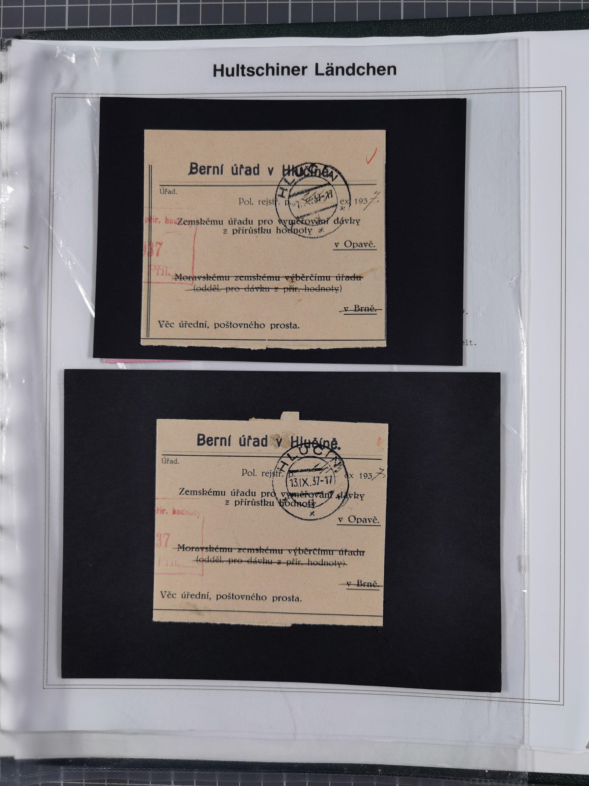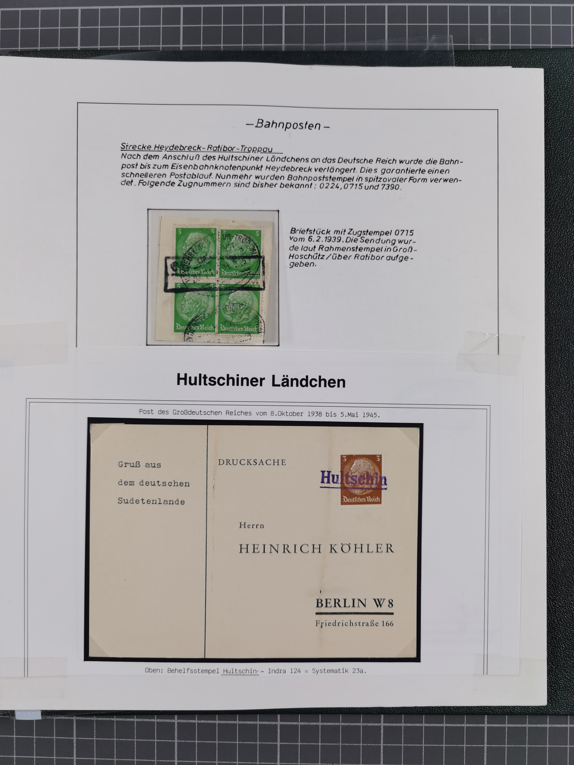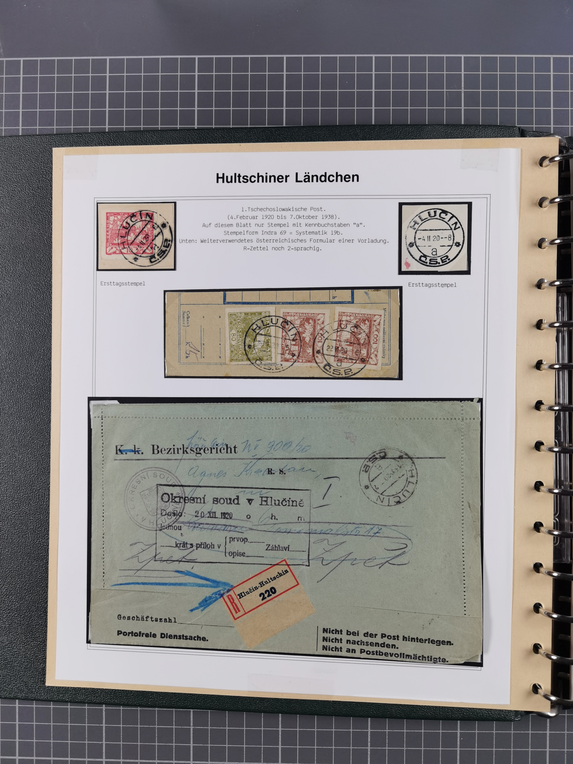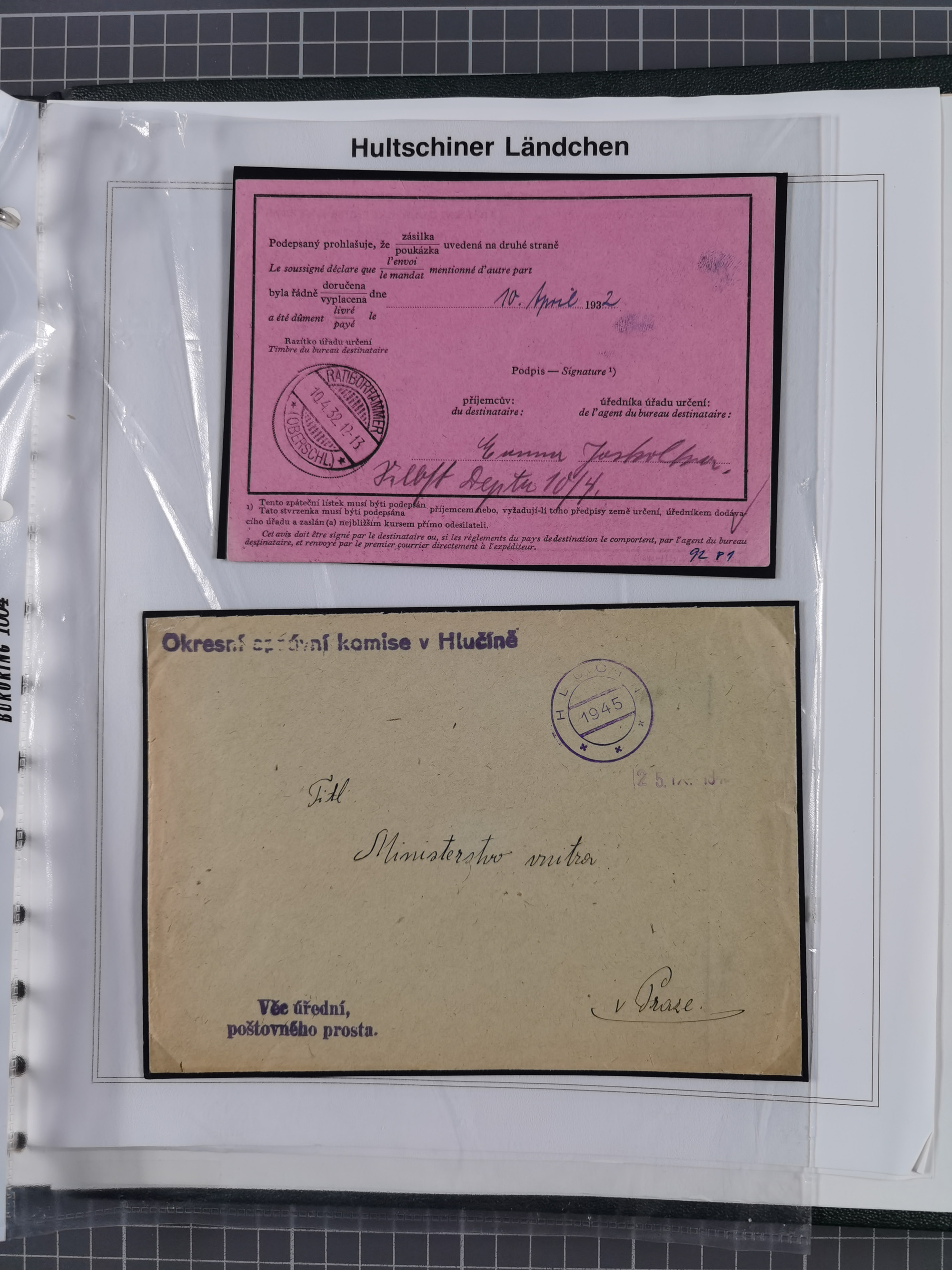 1920/45, HLUCIN - 'Hultschiner Ländchen' collection on 30 album leaves in album, starting with first Czechoslovakian post 4.2.1920, registered and official mail, receipts, postage due, postcards, german occupation, many different railway cancellation types, provisional cancellation 31.6.1945 coat of arms, overall a lovely collection.