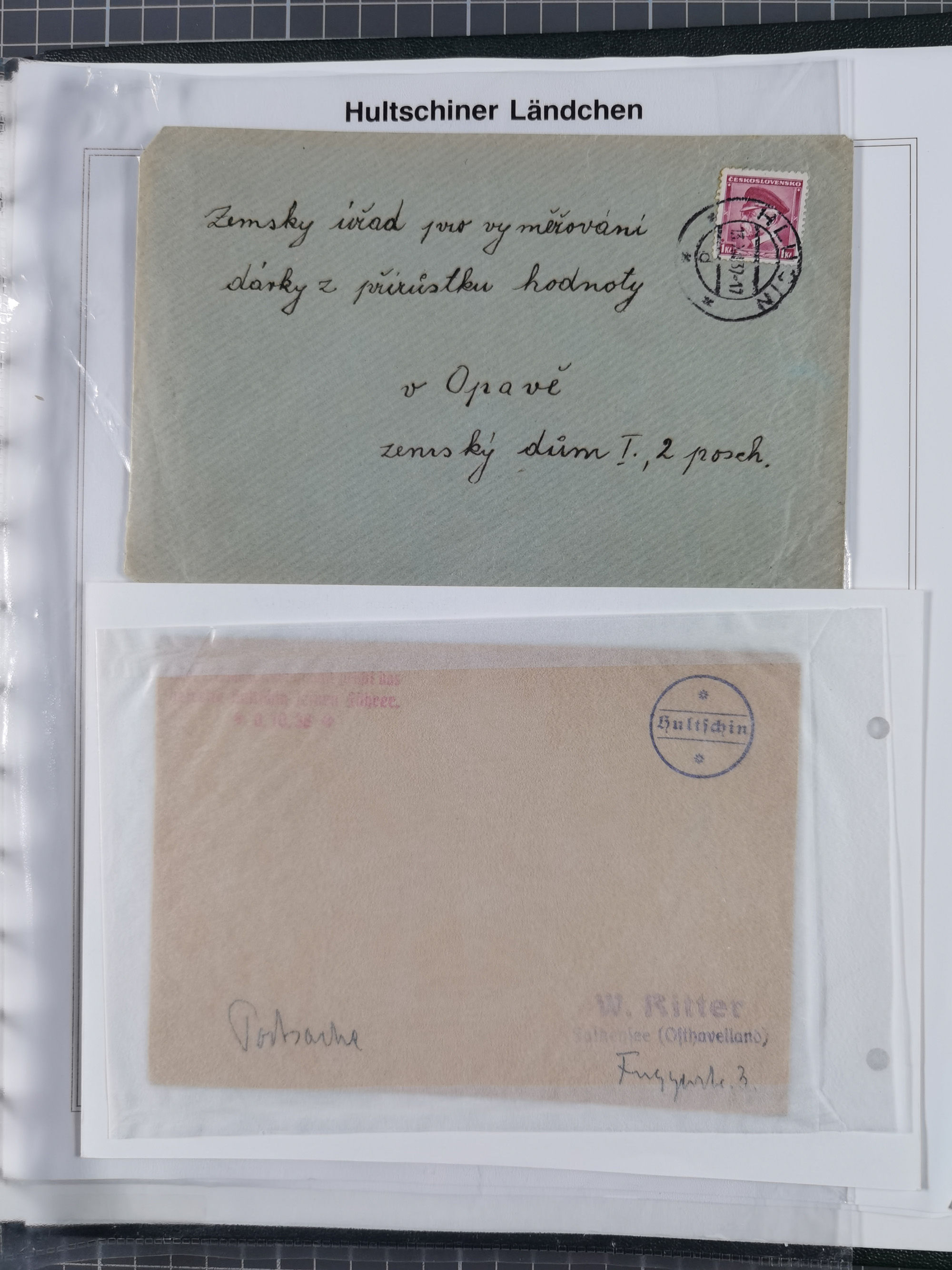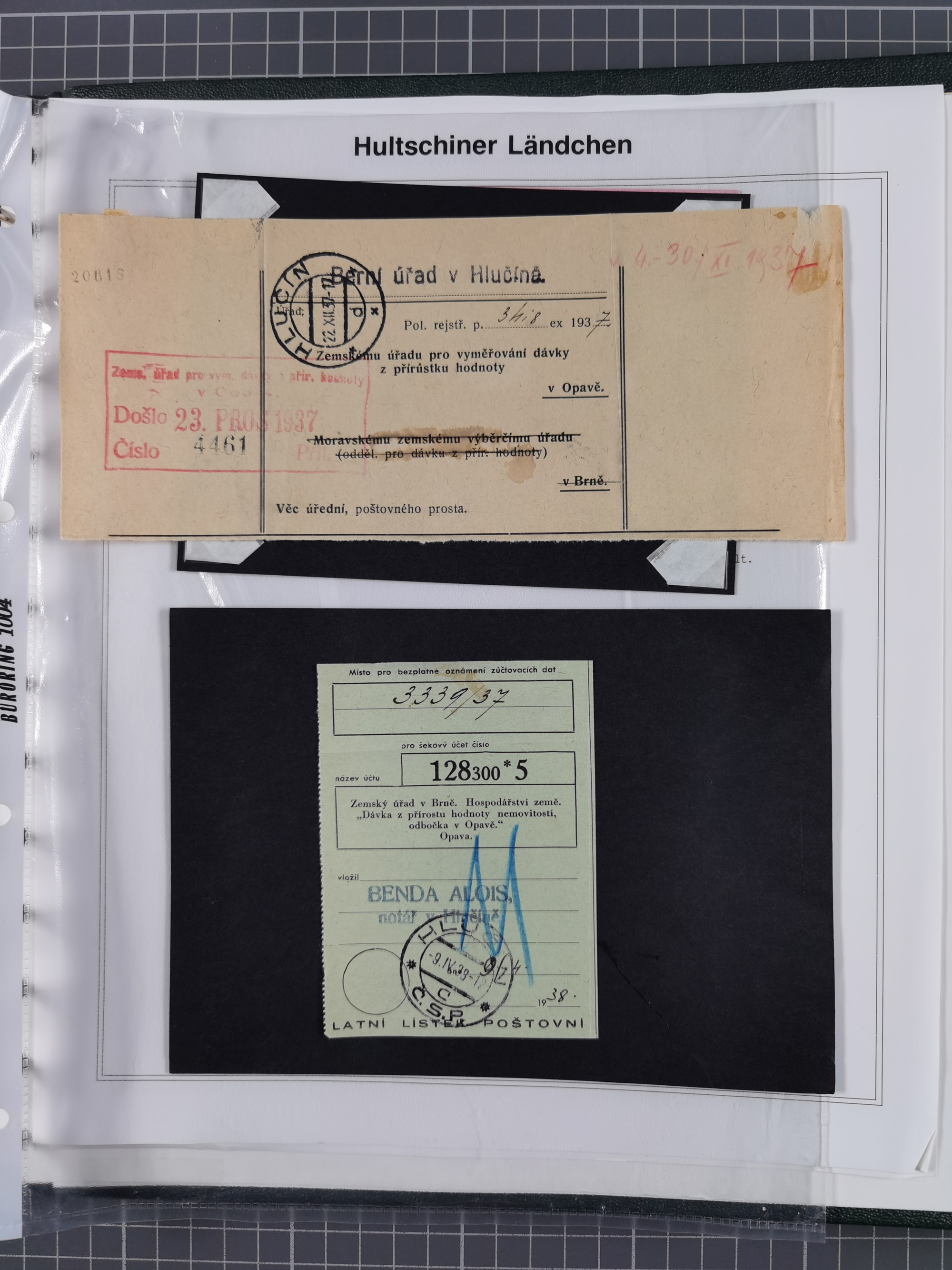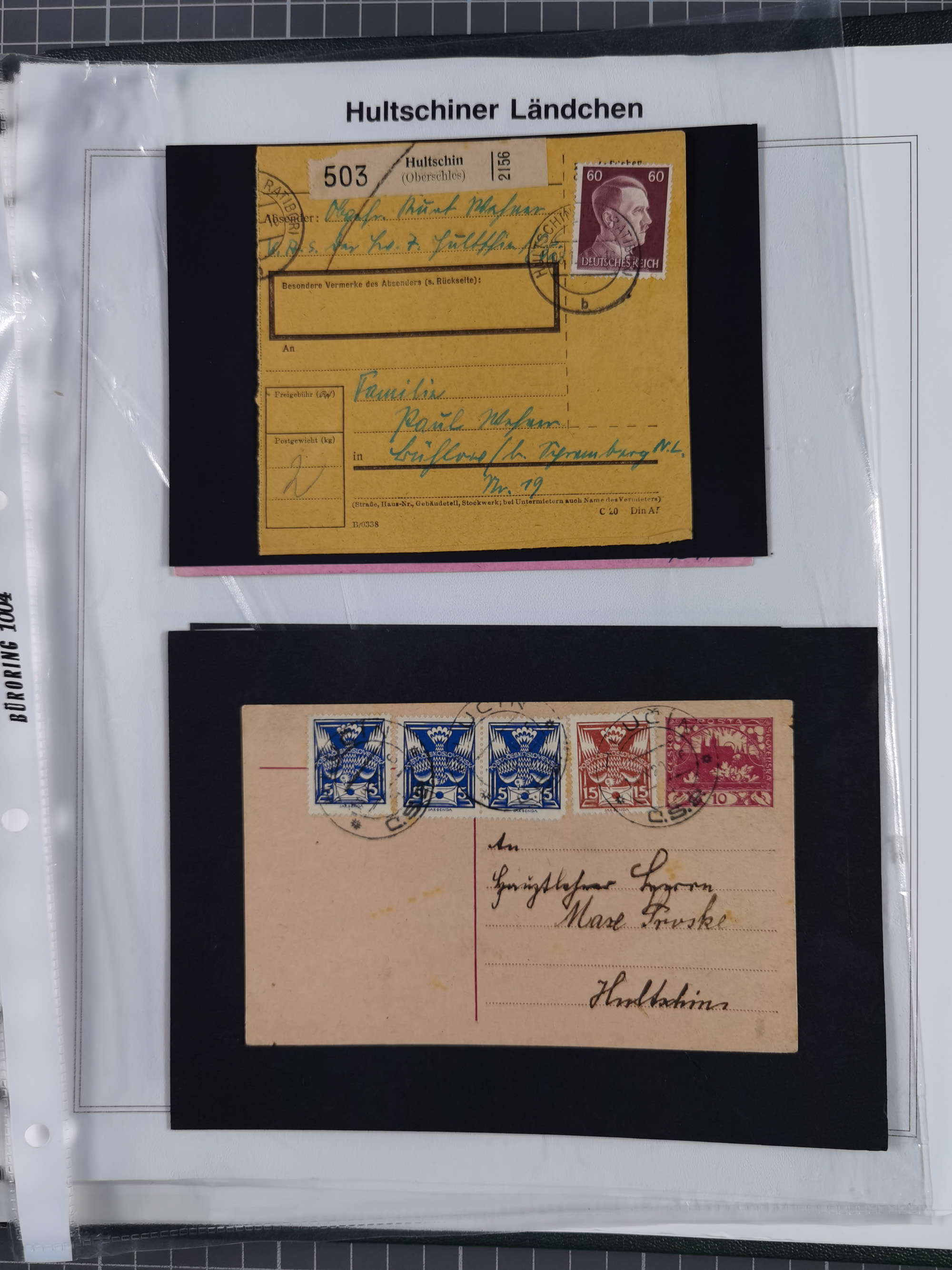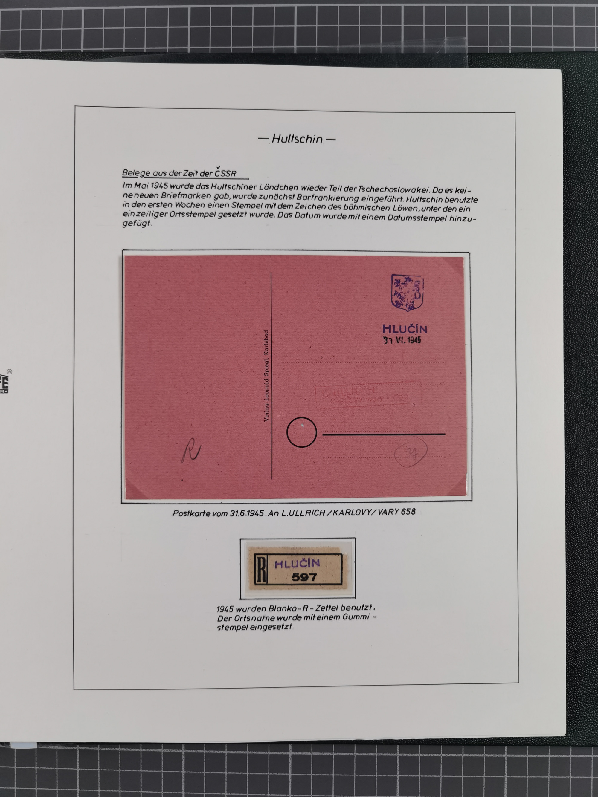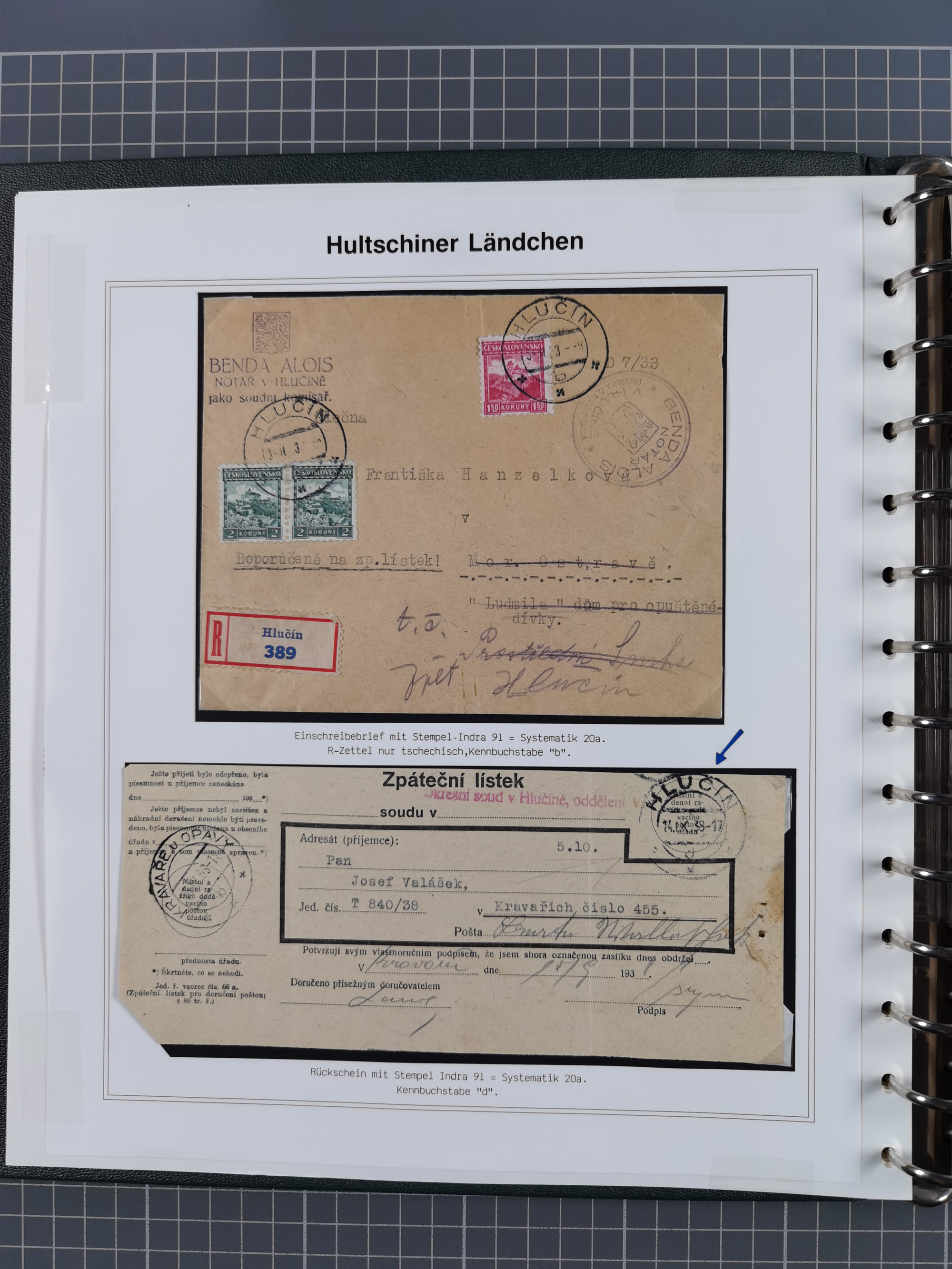 1920/45, HLUCIN - 'Hultschiner Ländchen' collection on 30 album leaves in album, starting with first Czechoslovakian post 4.2.1920, registered and official mail, receipts, postage due, postcards, german occupation, many different railway cancellation types, provisional cancellation 31.6.1945 coat of arms, overall a lovely collection.