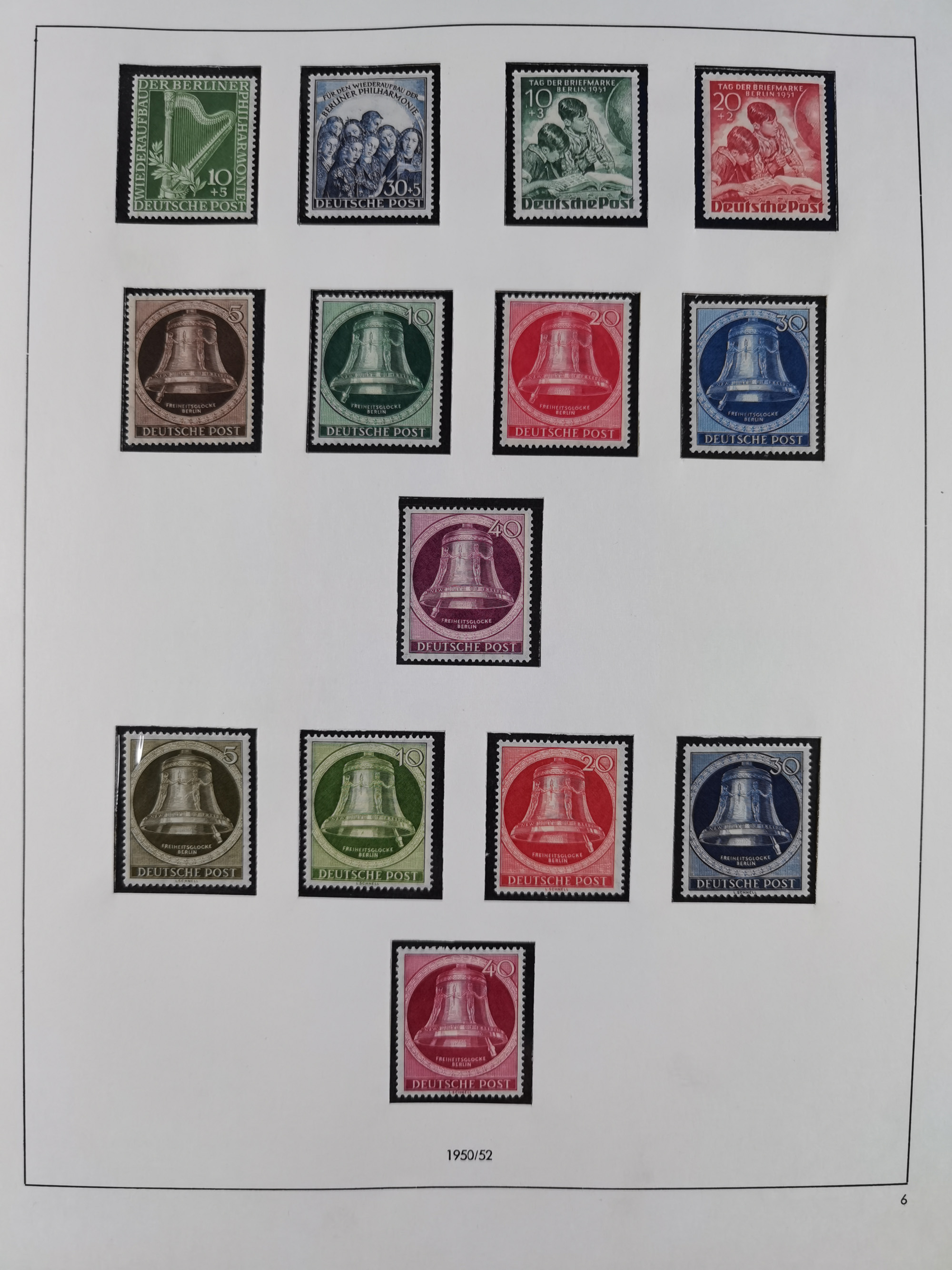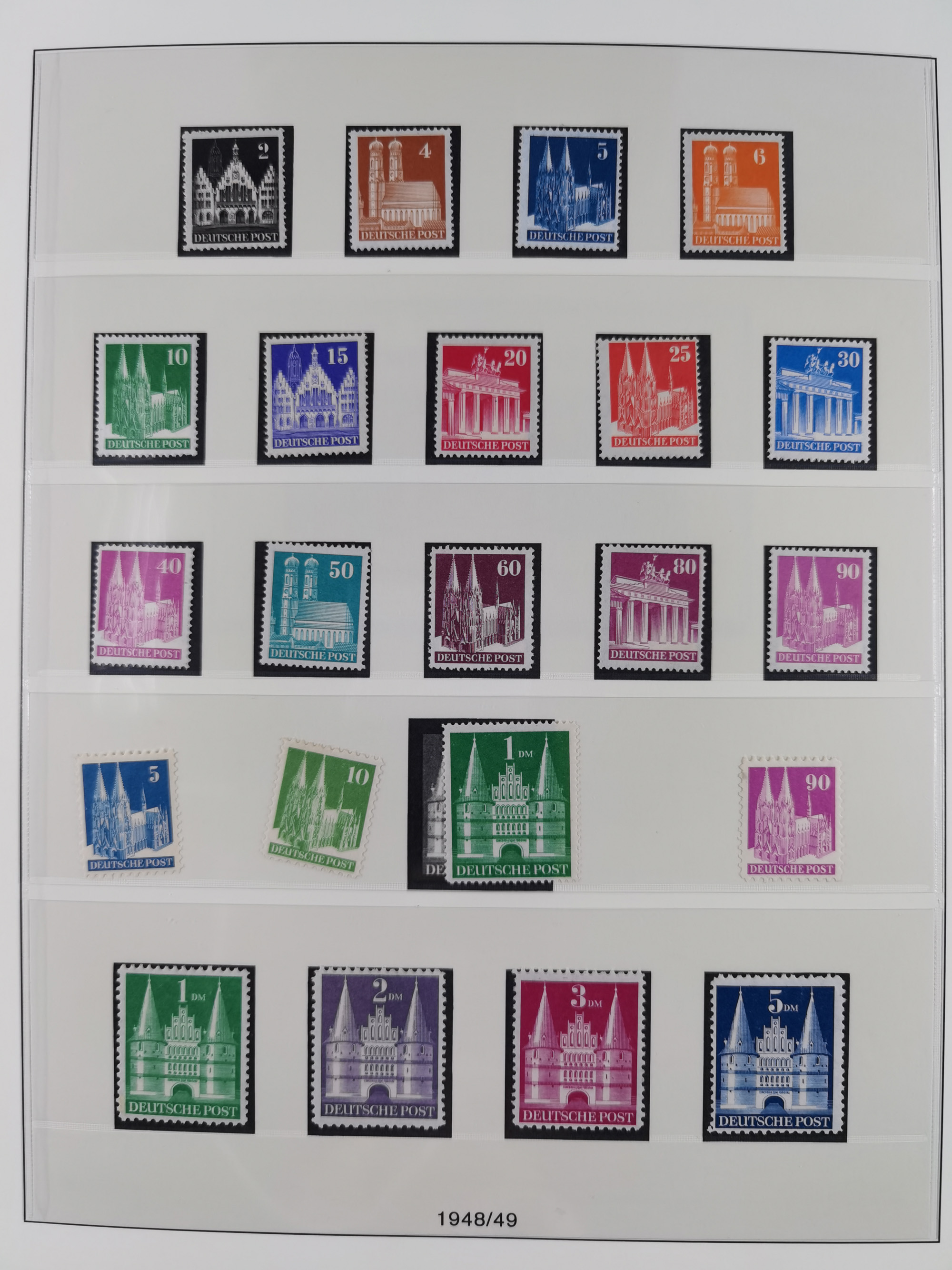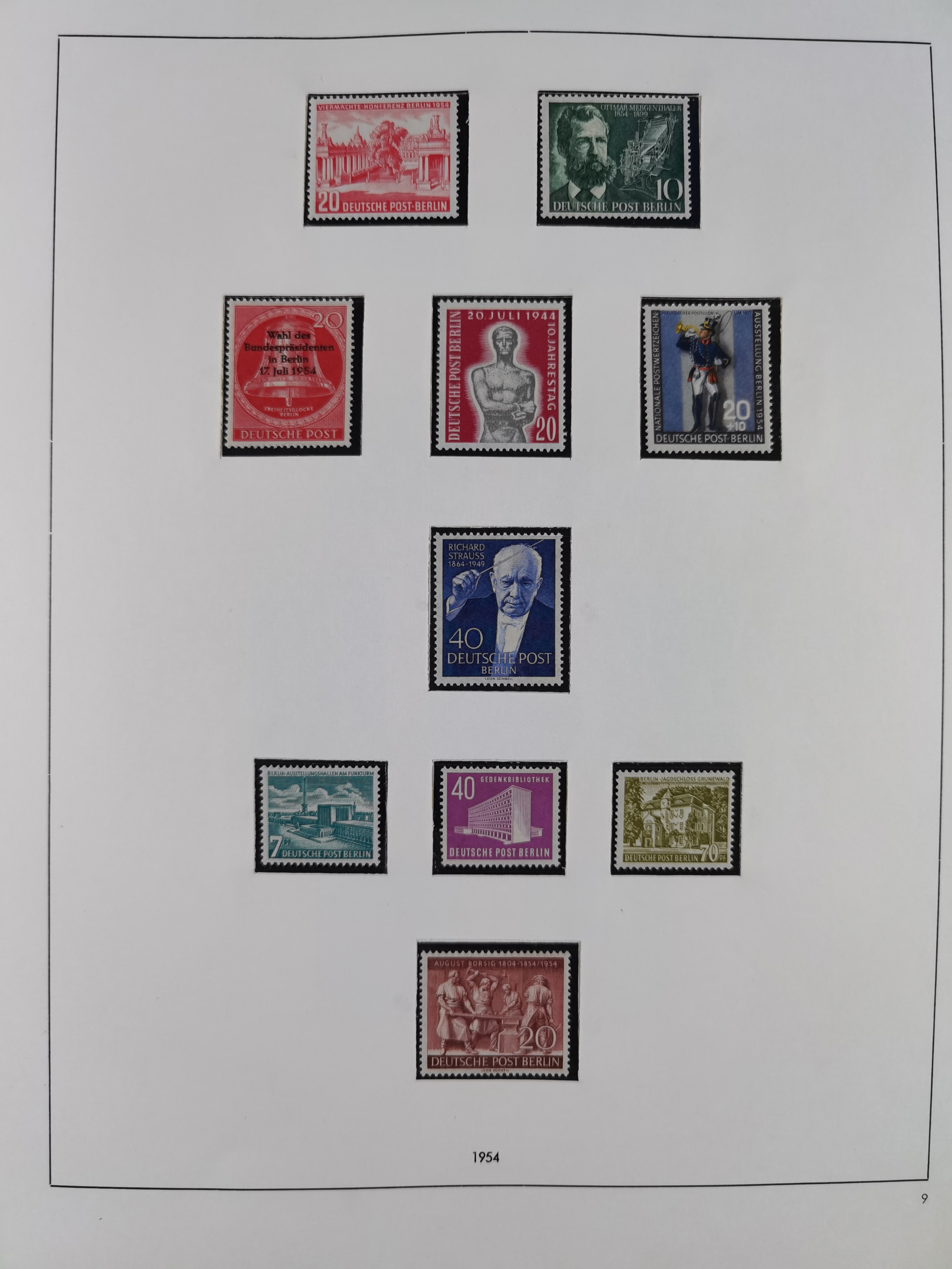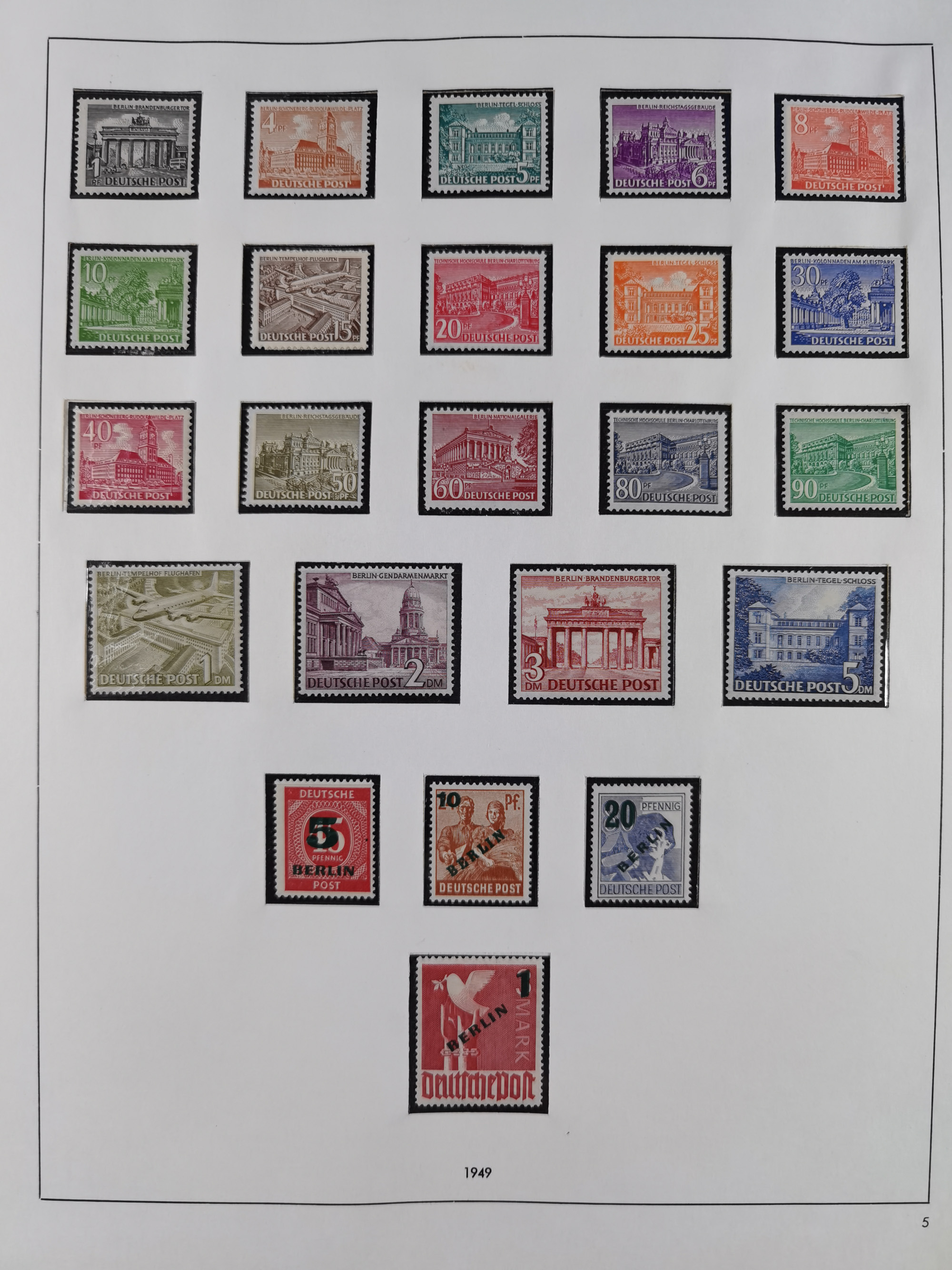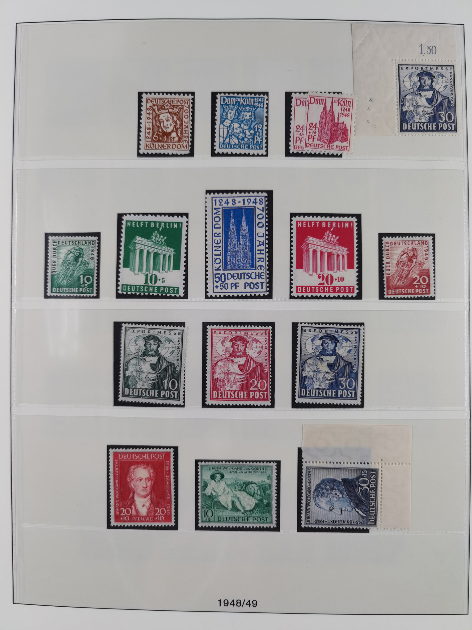 1948/90, in den Hauptnummern bis 1960 komplette postfrische Sammlungen Berlin 1948-90 inkl. Schwarzaufdruck, Rotaufdruck sign. Dub und Block 1, Bundesrepublik 1949-72 inkl. Posthornsatz, sowie DDR 1949-71 inkl. ausgiebigen Teilen Zusammendrucke, es fehlen bei den späten modernen Ausgaben teils einzelne Werte oder Sätze, gute Erhaltung, Alben mit Lagerspuren, in 11 Vordruckalben