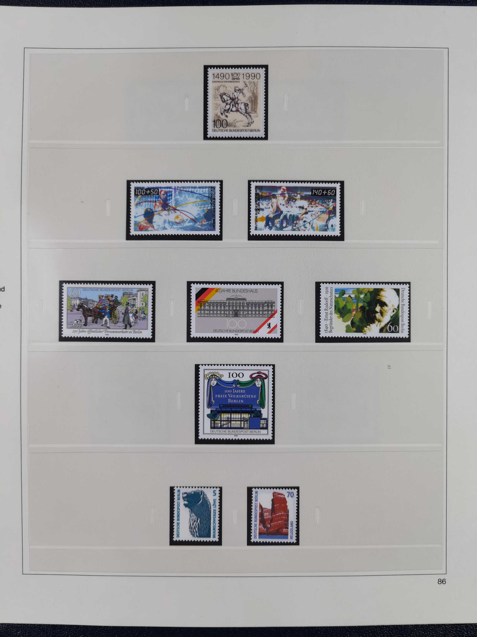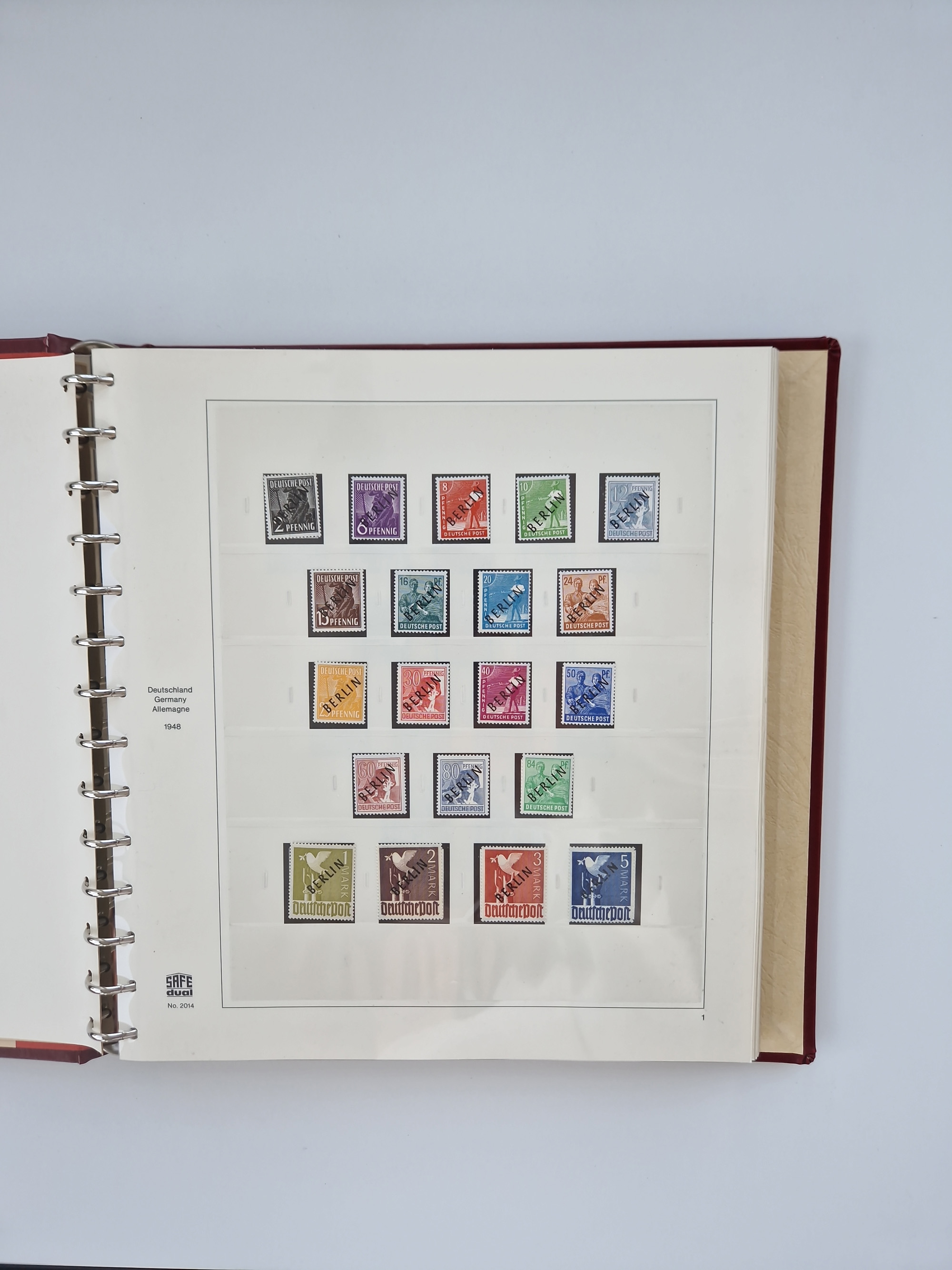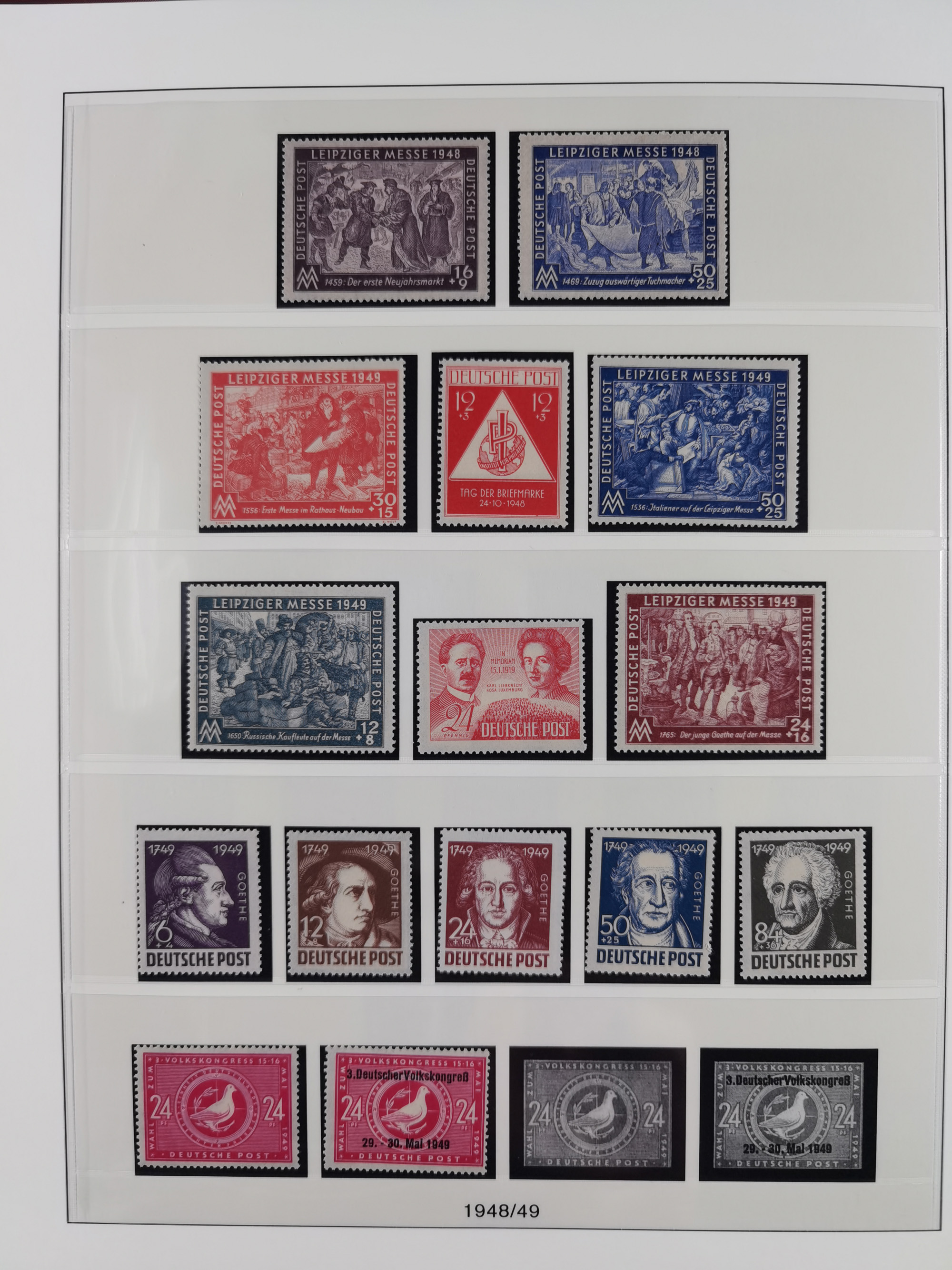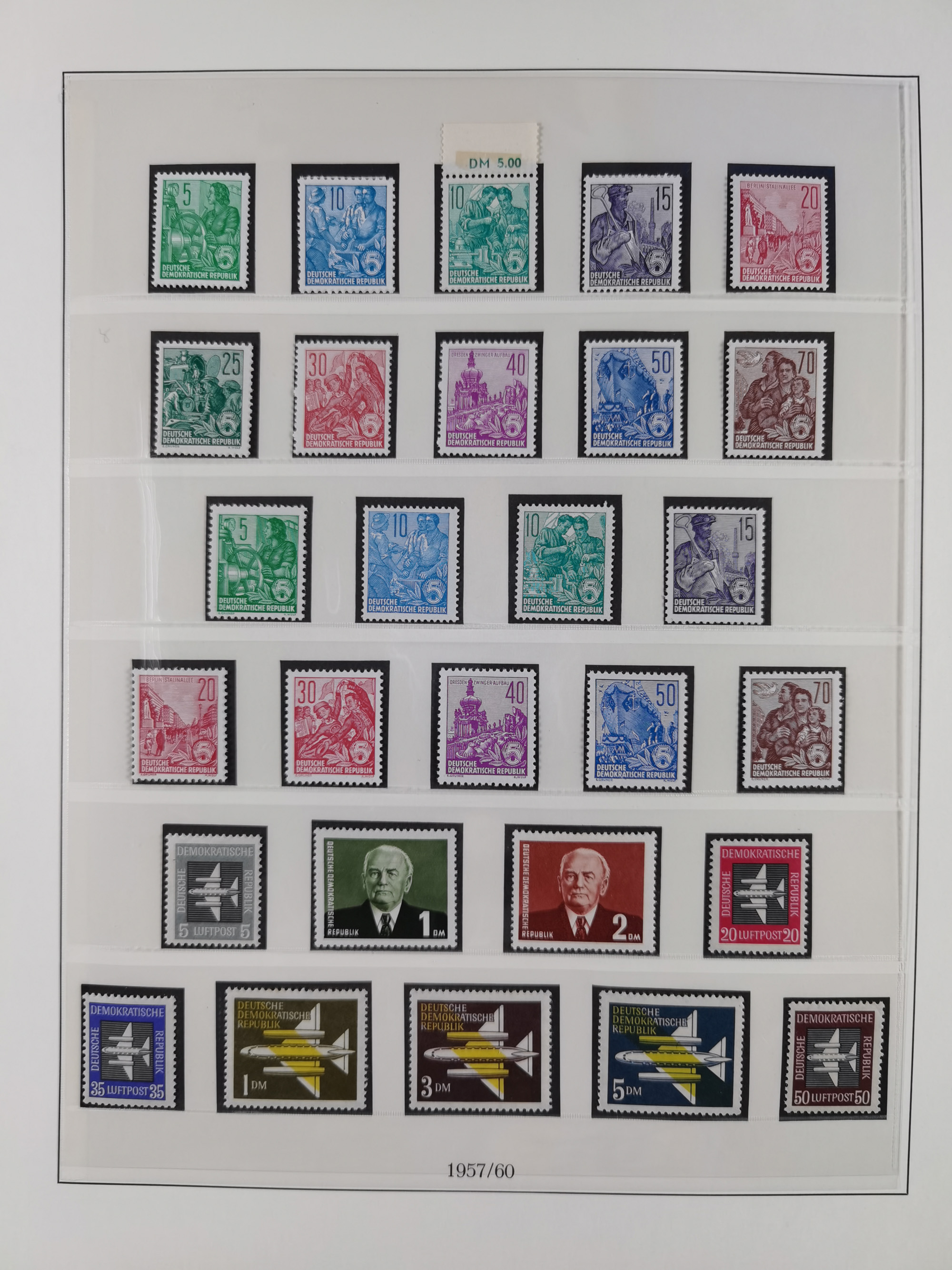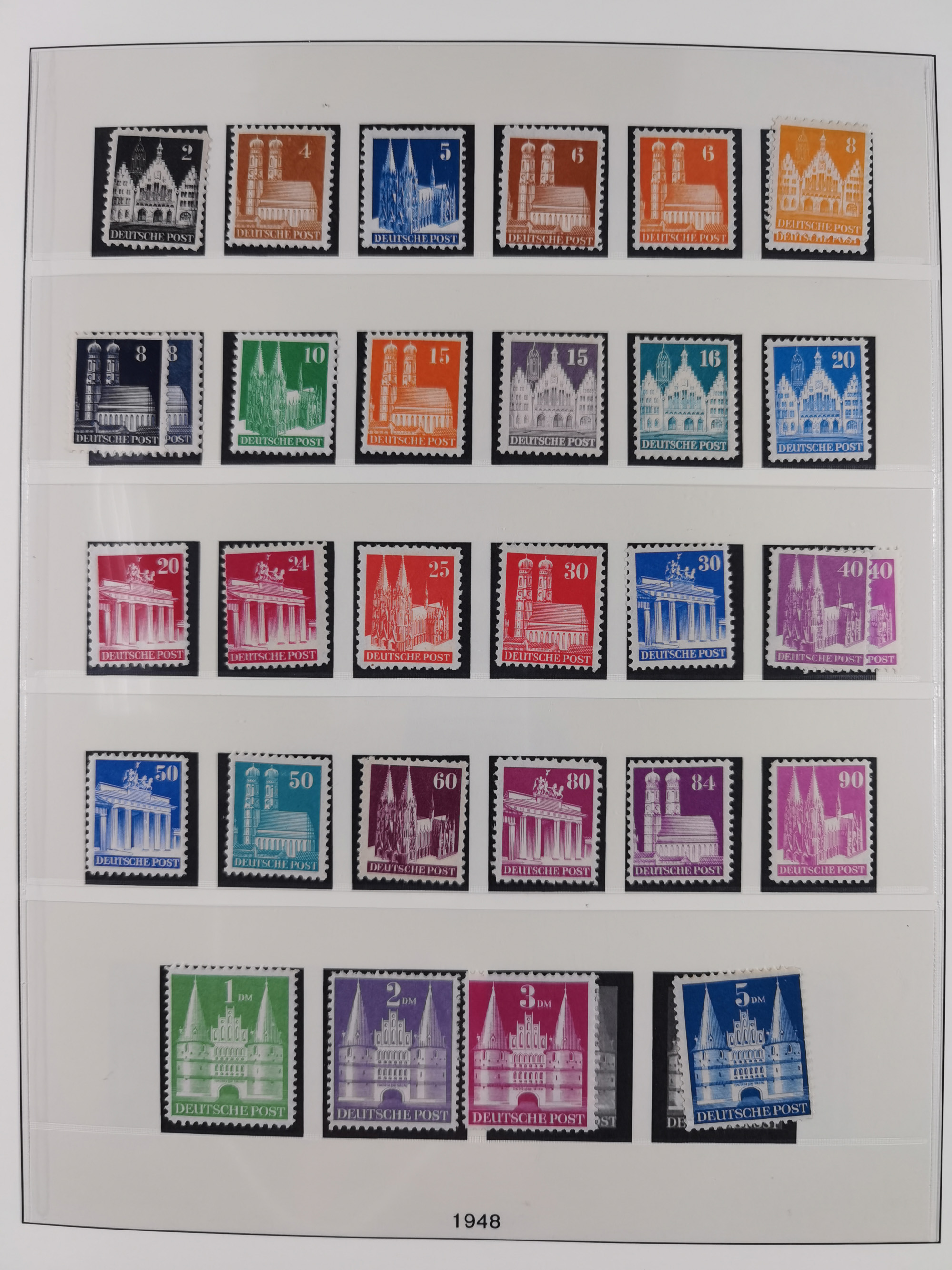 1948/90, in den Hauptnummern bis 1960 komplette postfrische Sammlungen Berlin 1948-90 inkl. Schwarzaufdruck, Rotaufdruck sign. Dub und Block 1, Bundesrepublik 1949-72 inkl. Posthornsatz, sowie DDR 1949-71 inkl. ausgiebigen Teilen Zusammendrucke, es fehlen bei den späten modernen Ausgaben teils einzelne Werte oder Sätze, gute Erhaltung, Alben mit Lagerspuren, in 11 Vordruckalben