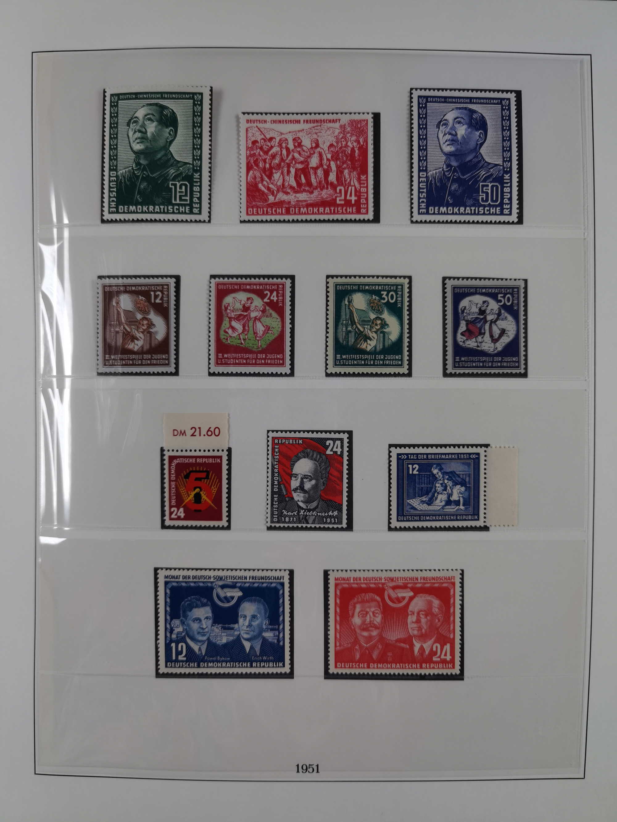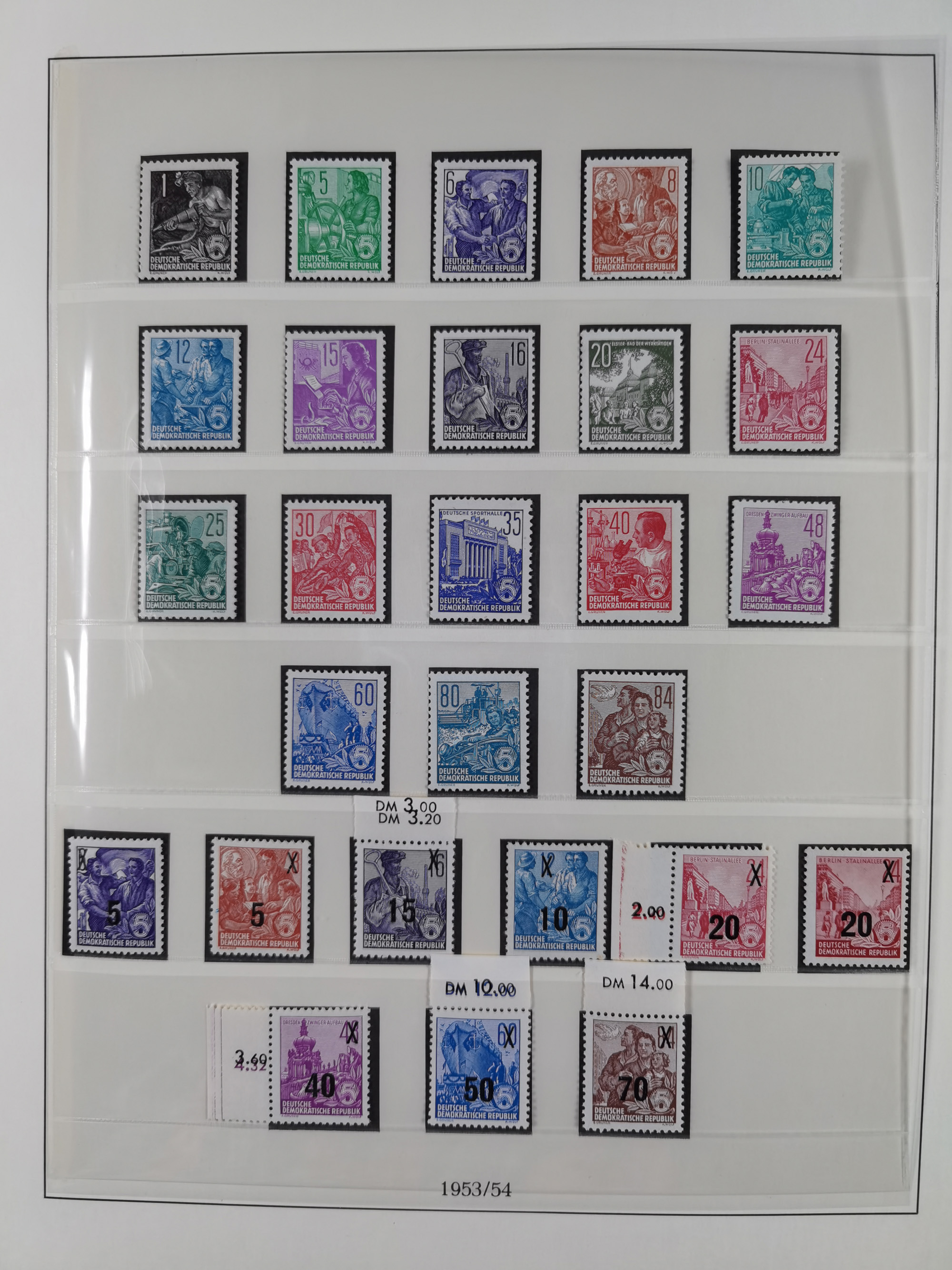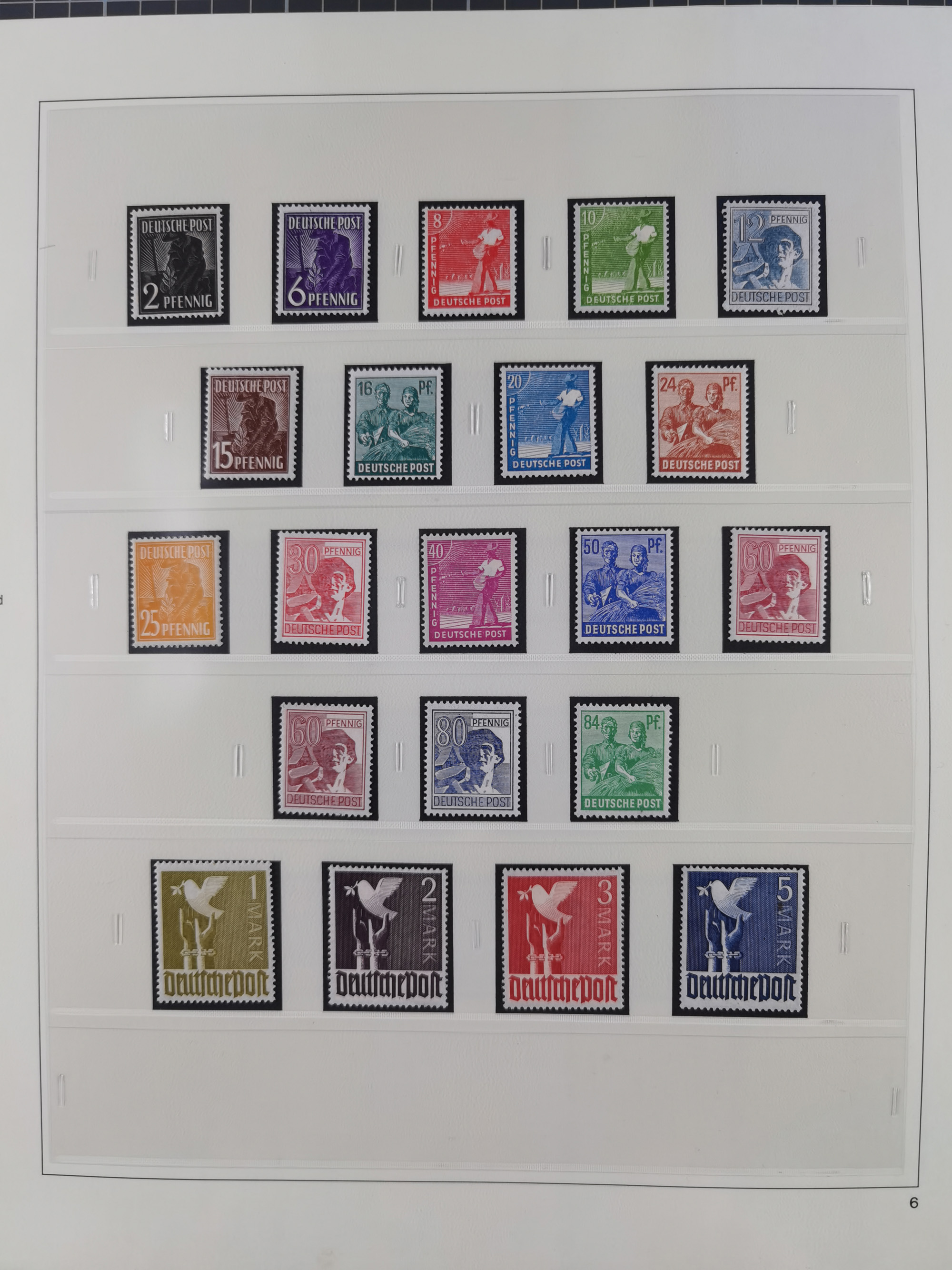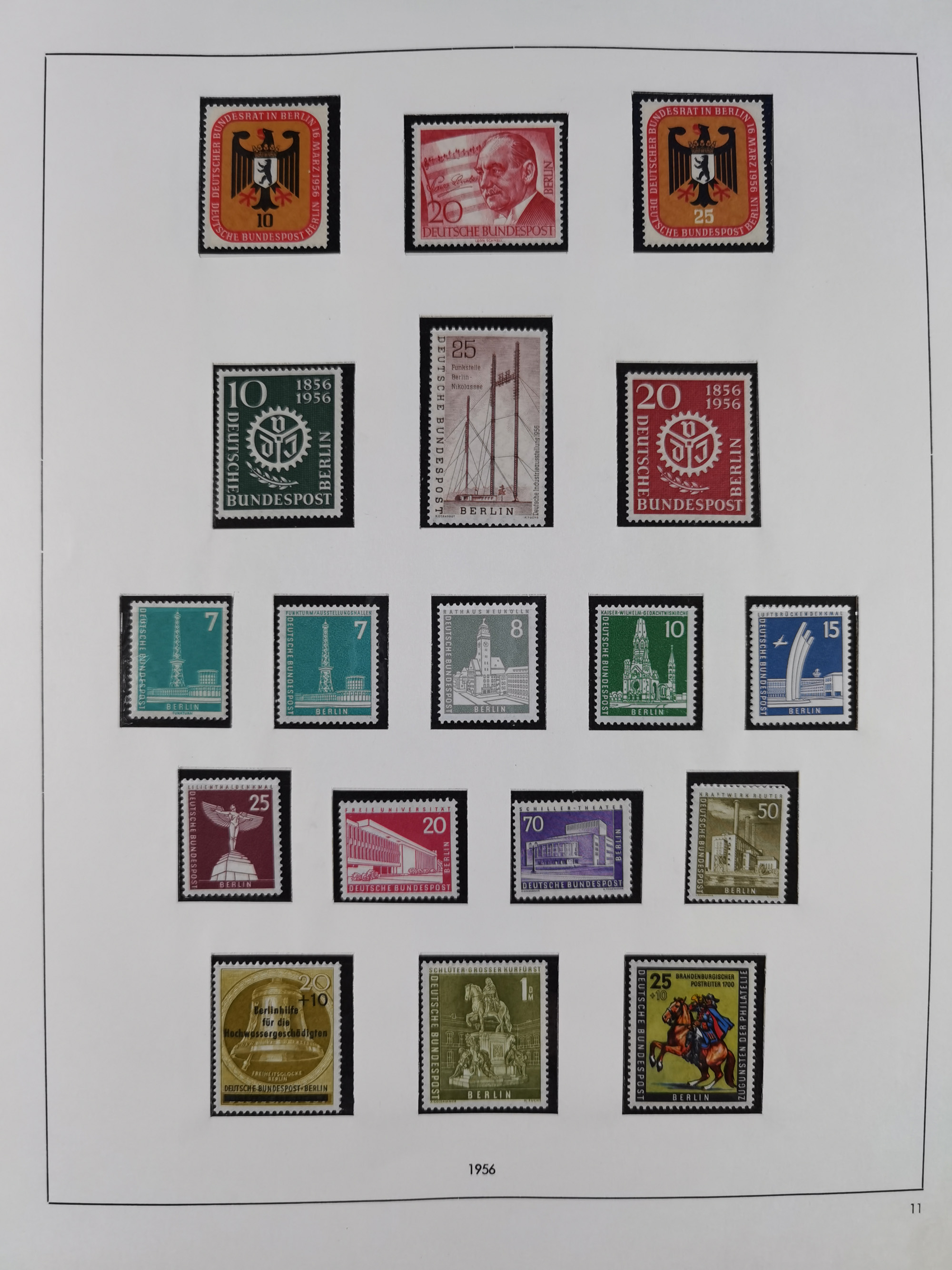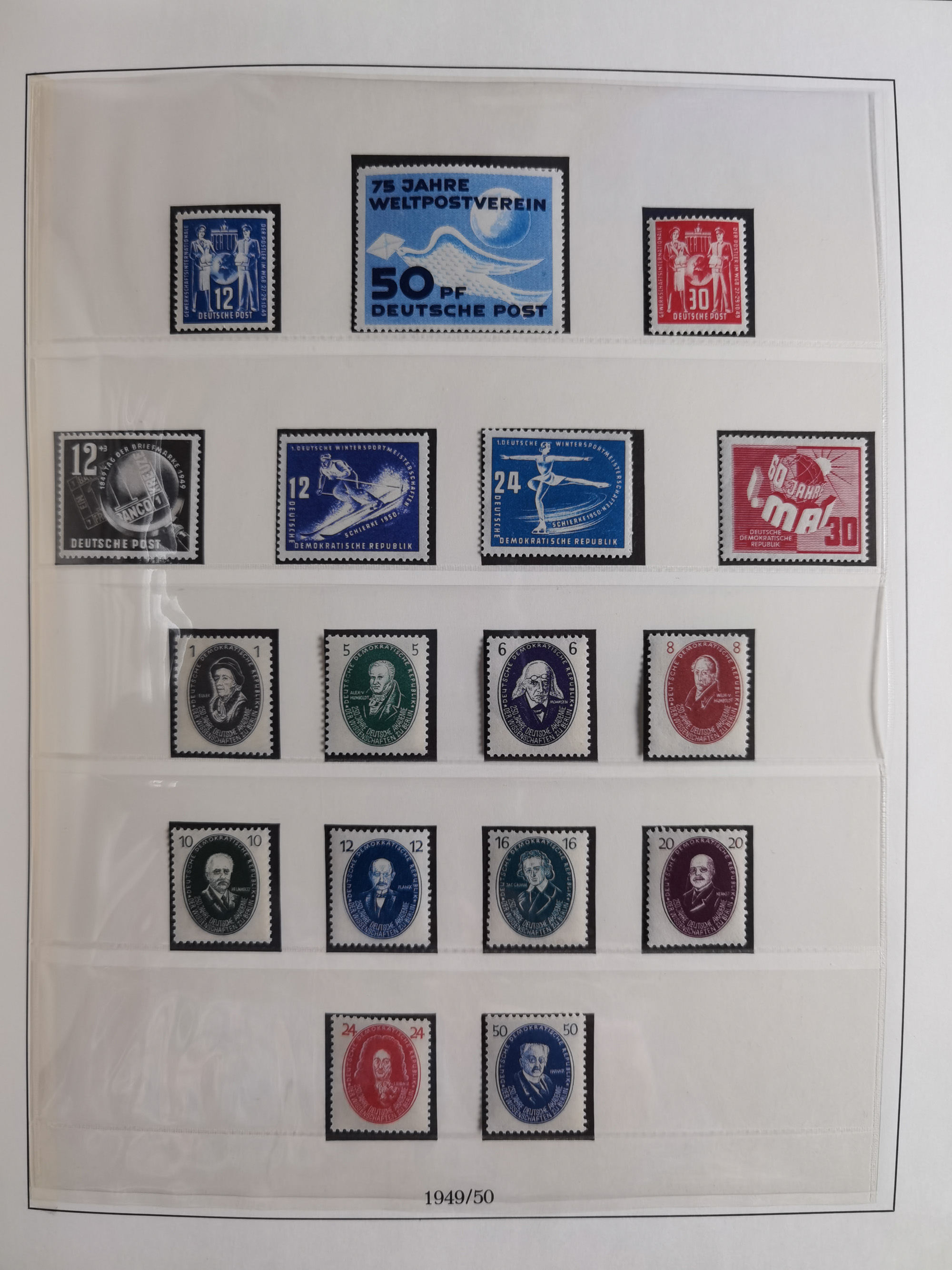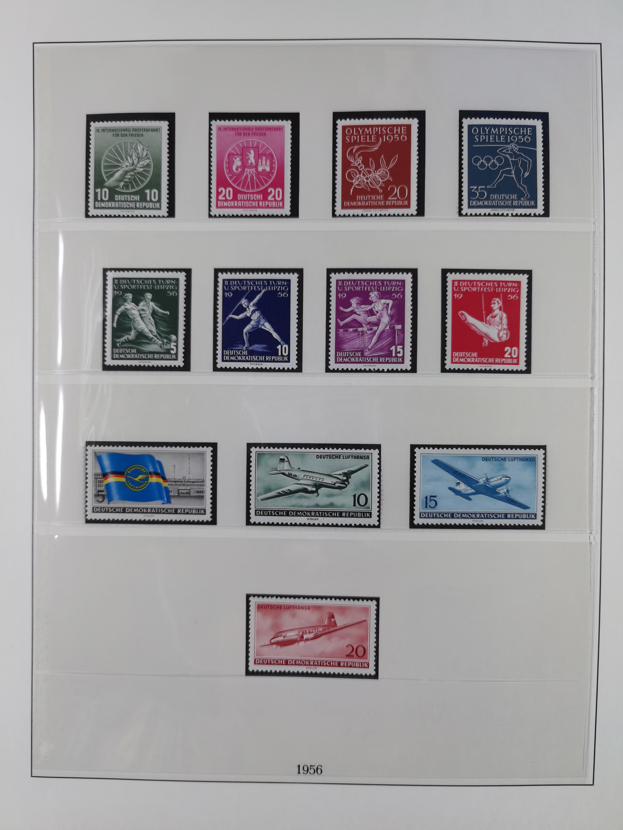 1948/90, in den Hauptnummern bis 1960 komplette postfrische Sammlungen Berlin 1948-90 inkl. Schwarzaufdruck, Rotaufdruck sign. Dub und Block 1, Bundesrepublik 1949-72 inkl. Posthornsatz, sowie DDR 1949-71 inkl. ausgiebigen Teilen Zusammendrucke, es fehlen bei den späten modernen Ausgaben teils einzelne Werte oder Sätze, gute Erhaltung, Alben mit Lagerspuren, in 11 Vordruckalben