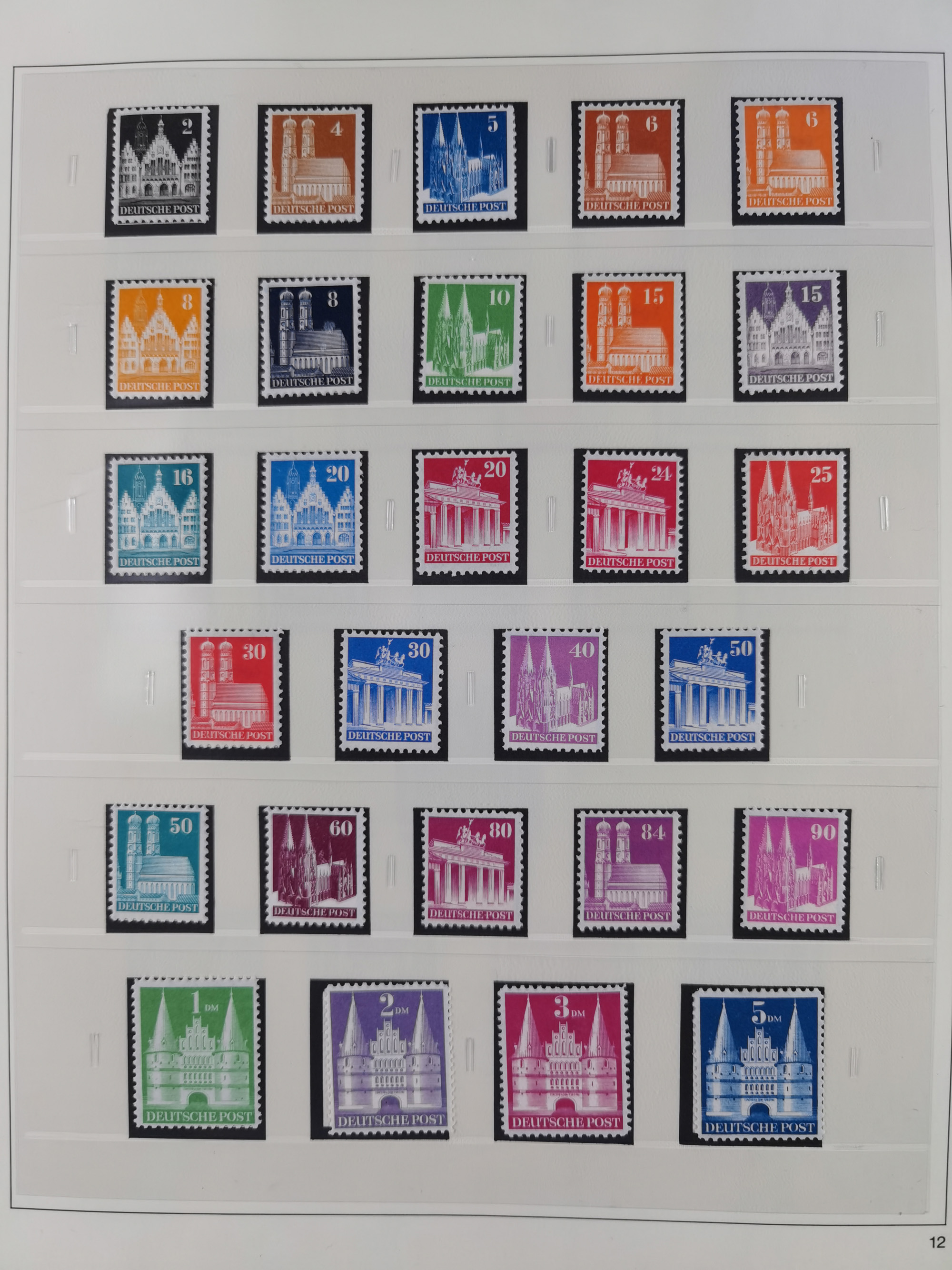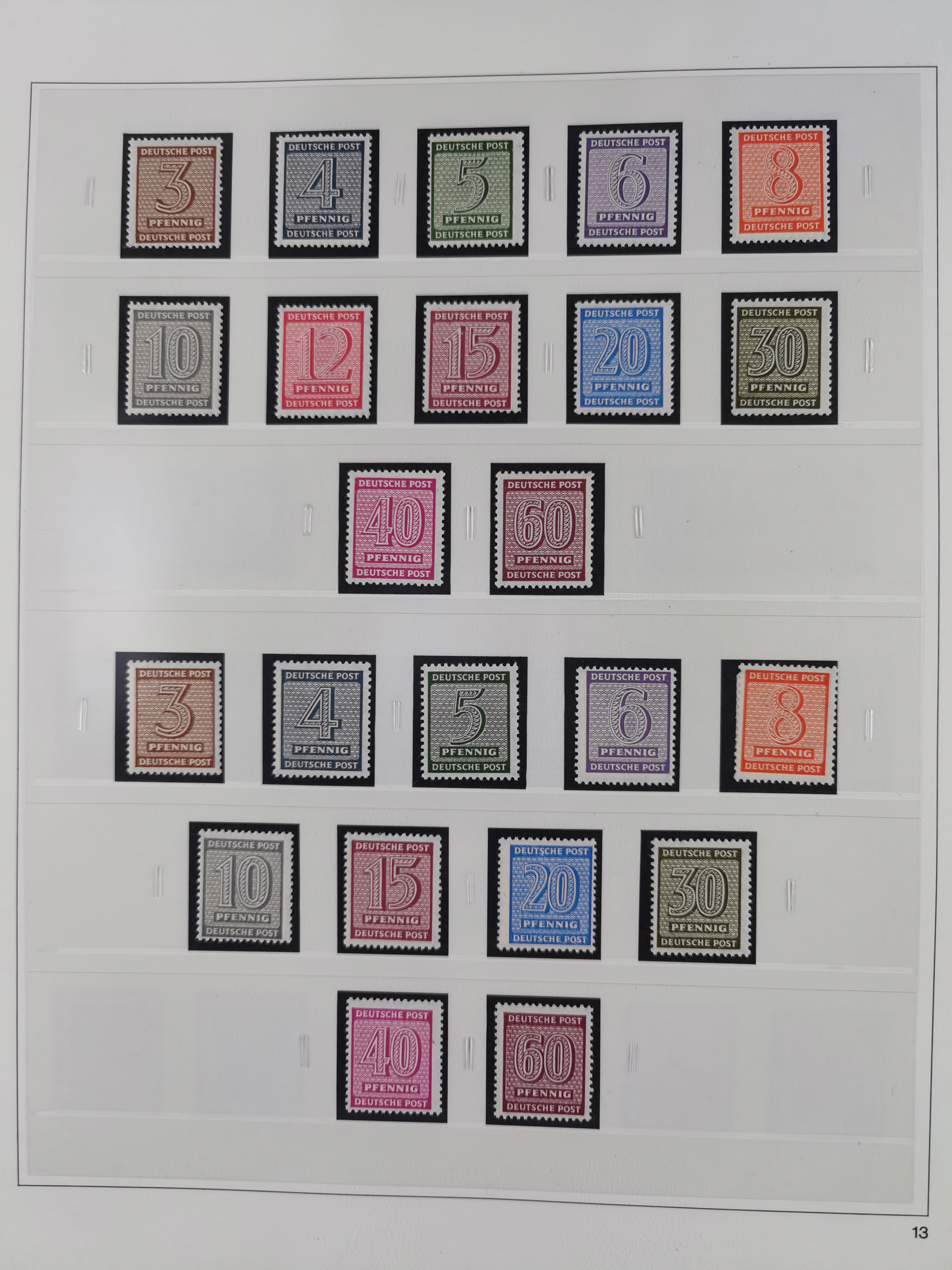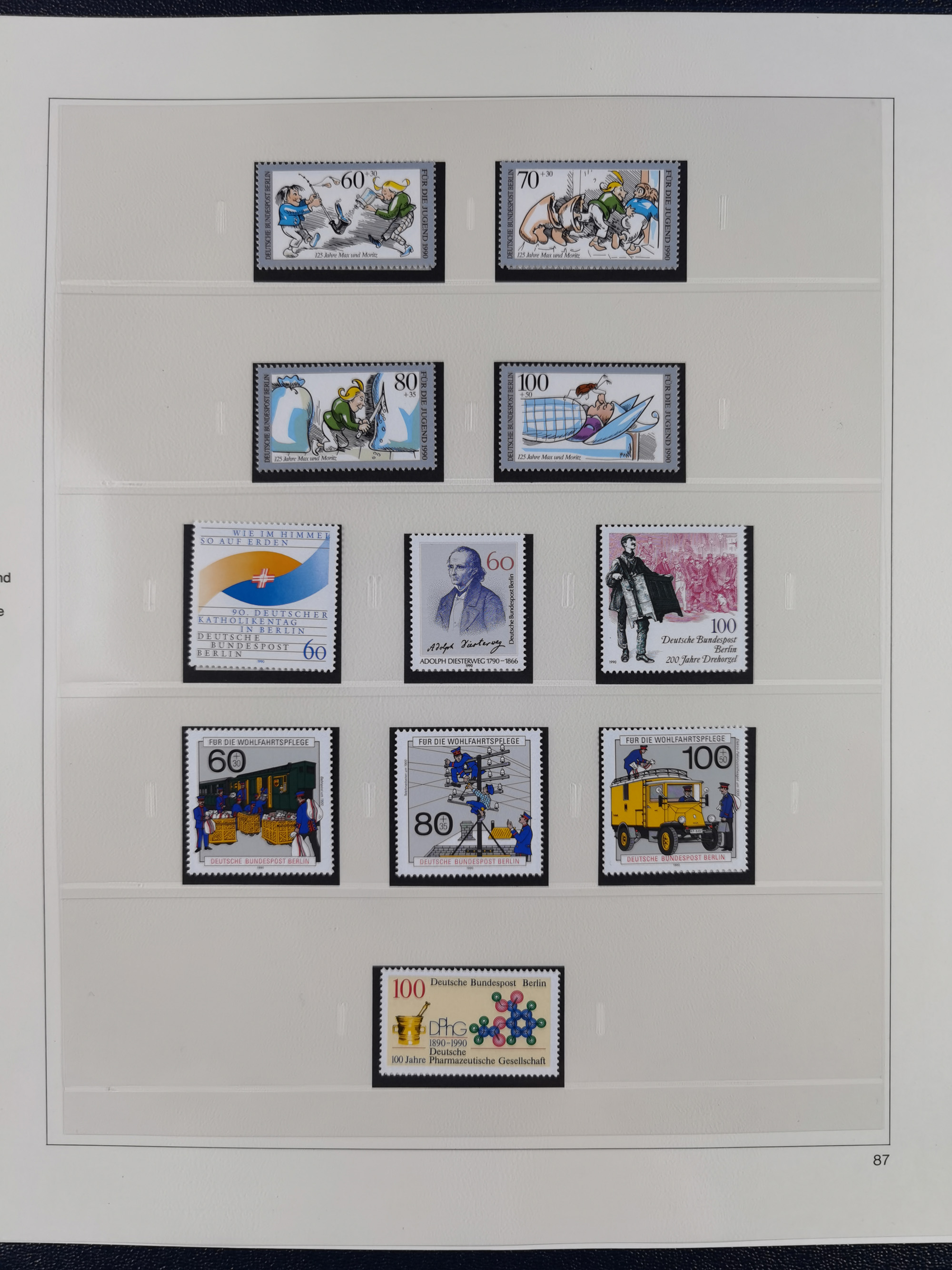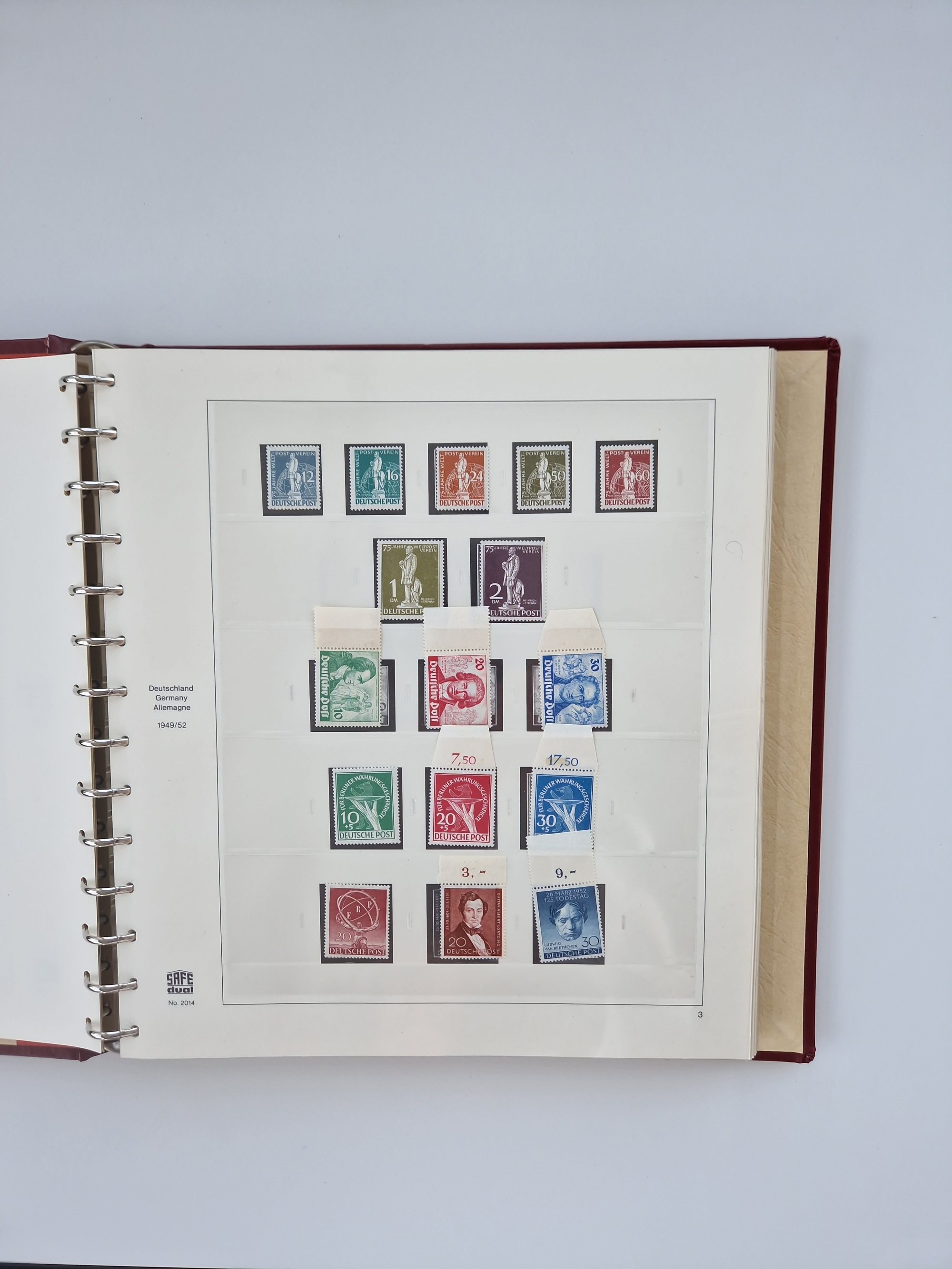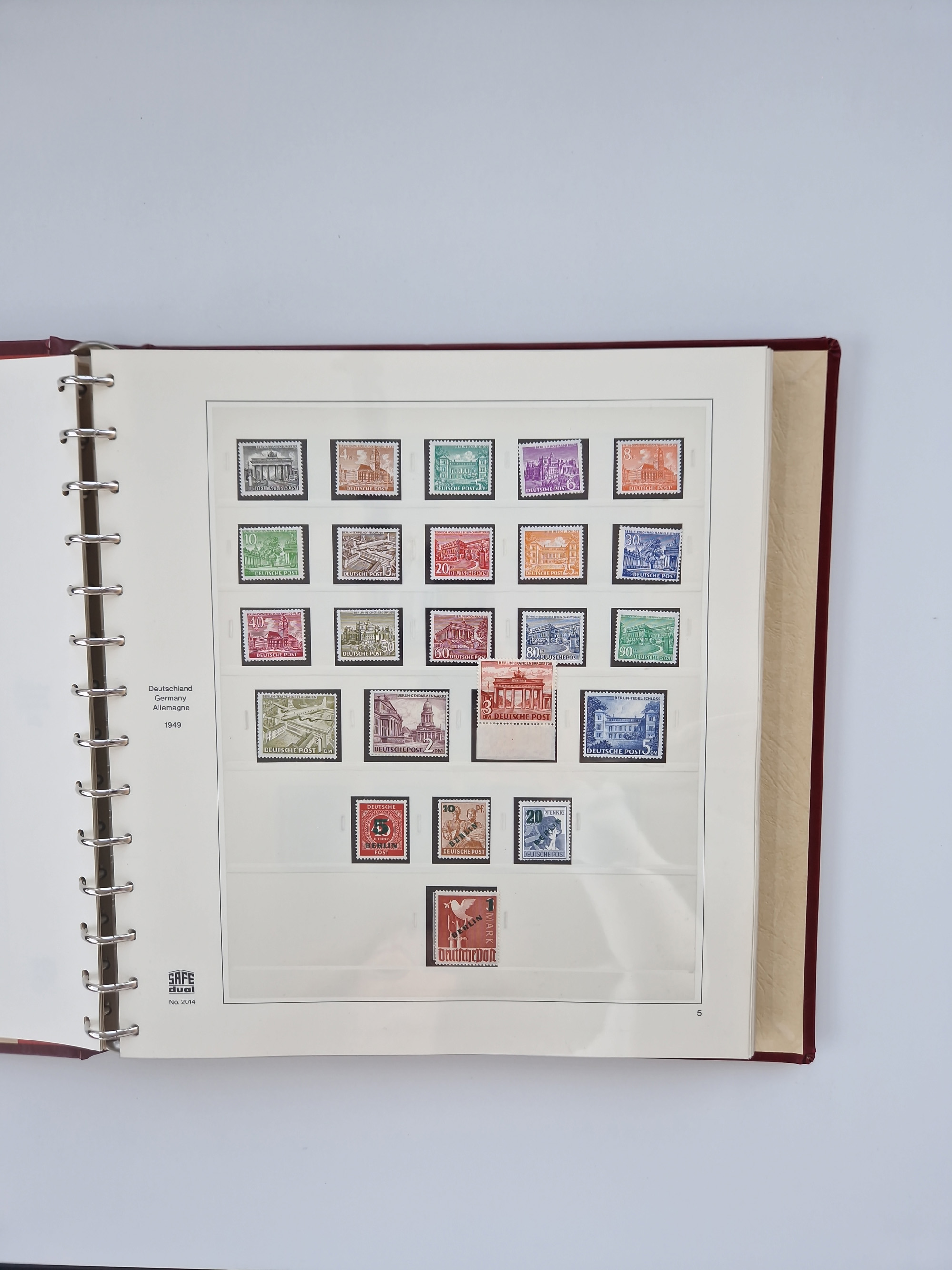 1948/90, in den Hauptnummern bis 1960 komplette postfrische Sammlungen Berlin 1948-90 inkl. Schwarzaufdruck, Rotaufdruck sign. Dub und Block 1, Bundesrepublik 1949-72 inkl. Posthornsatz, sowie DDR 1949-71 inkl. ausgiebigen Teilen Zusammendrucke, es fehlen bei den späten modernen Ausgaben teils einzelne Werte oder Sätze, gute Erhaltung, Alben mit Lagerspuren, in 11 Vordruckalben