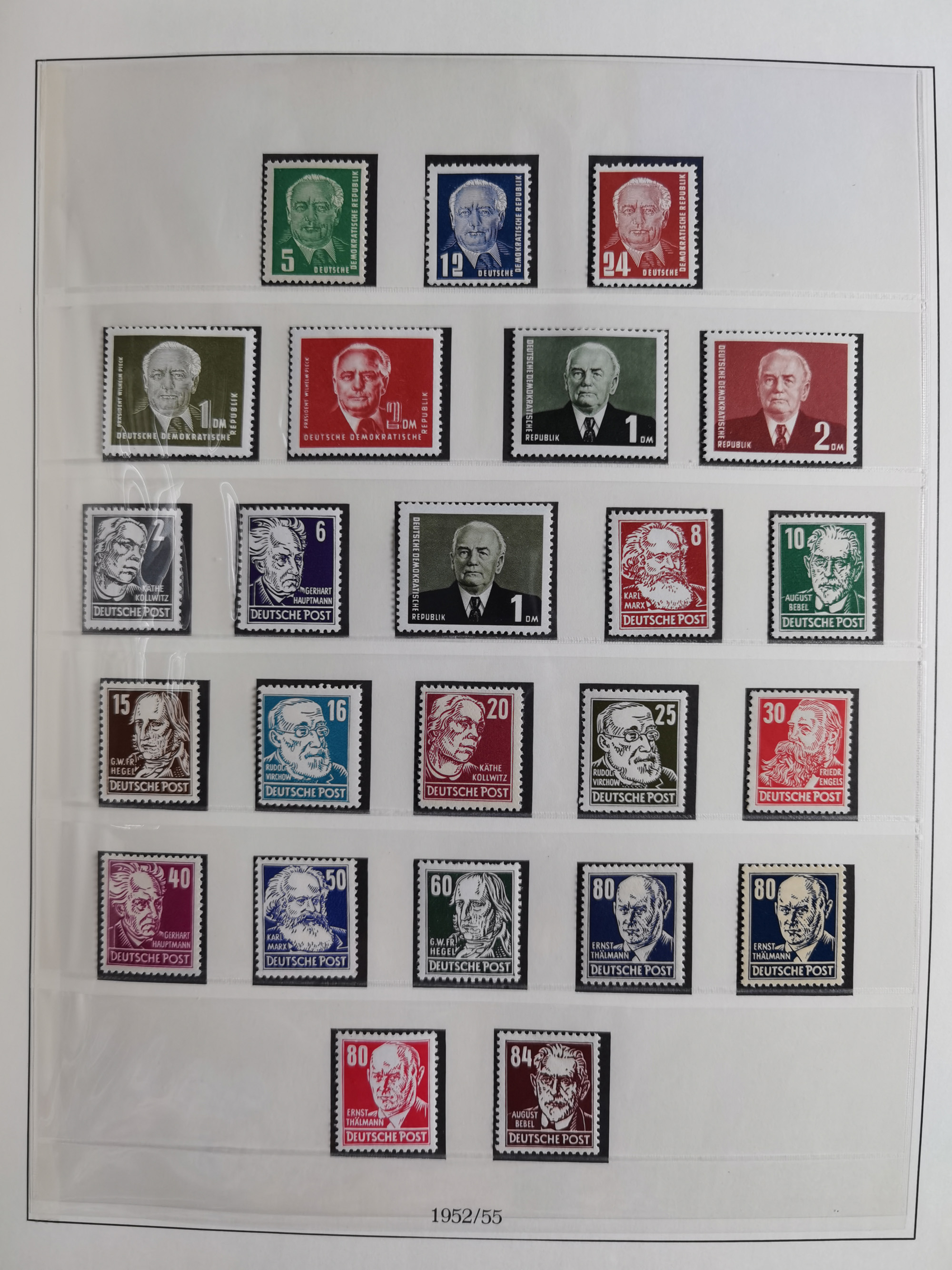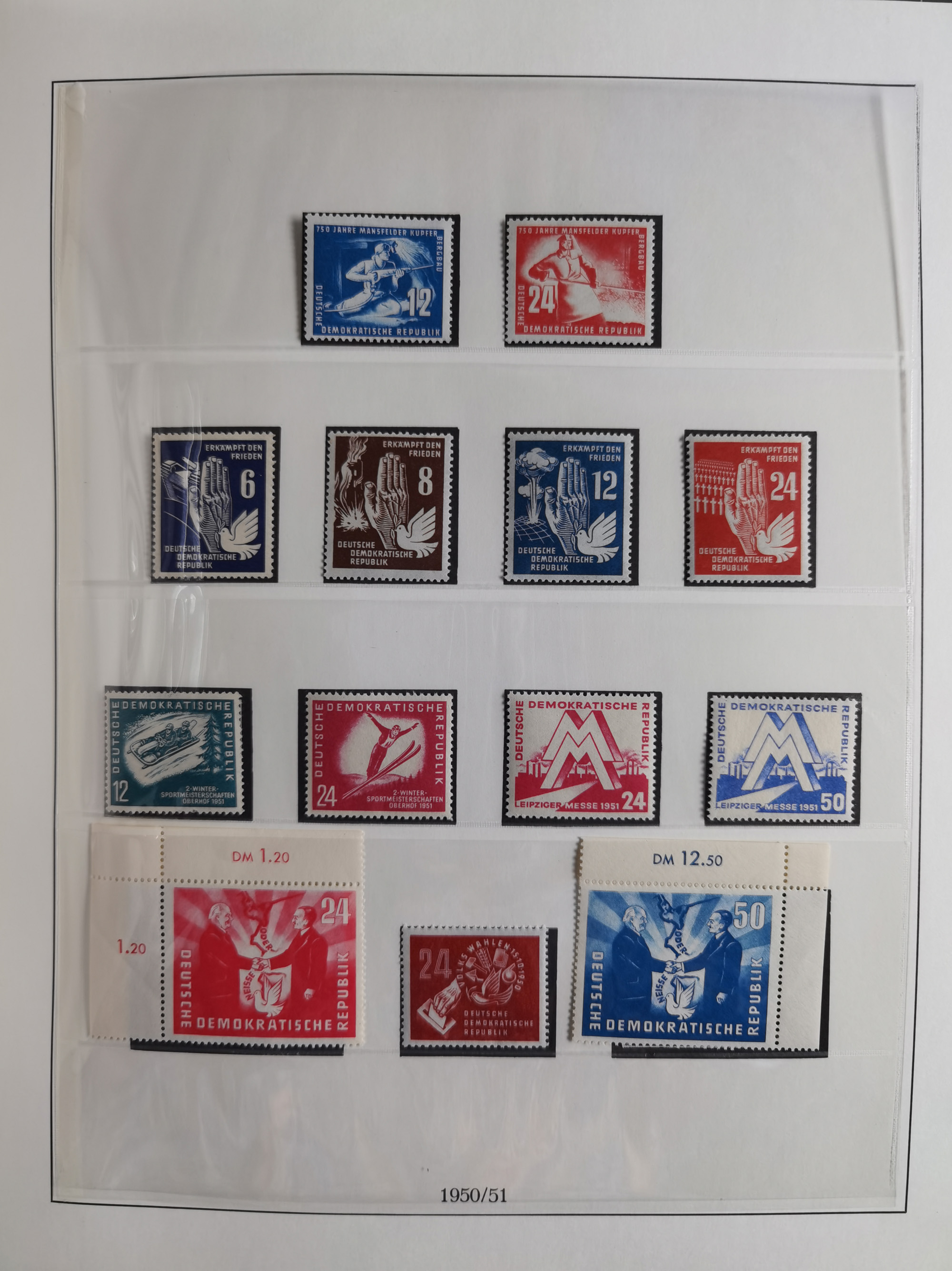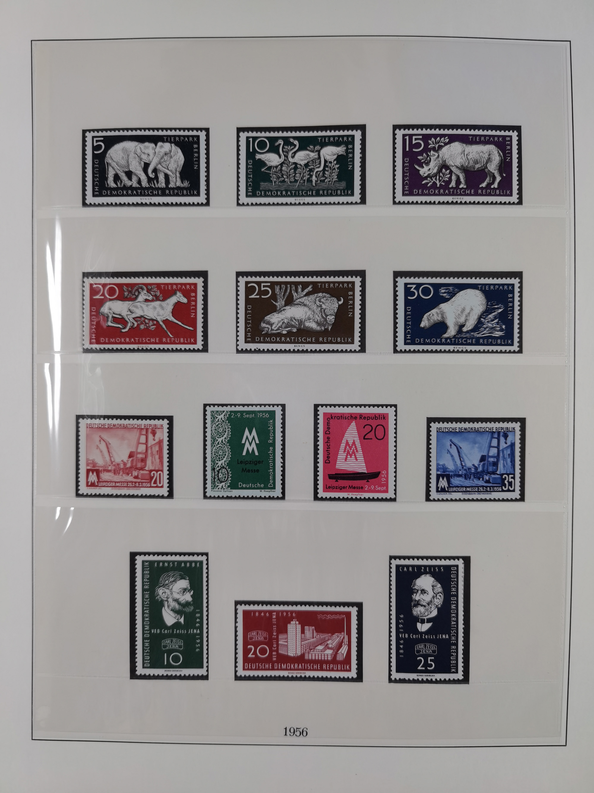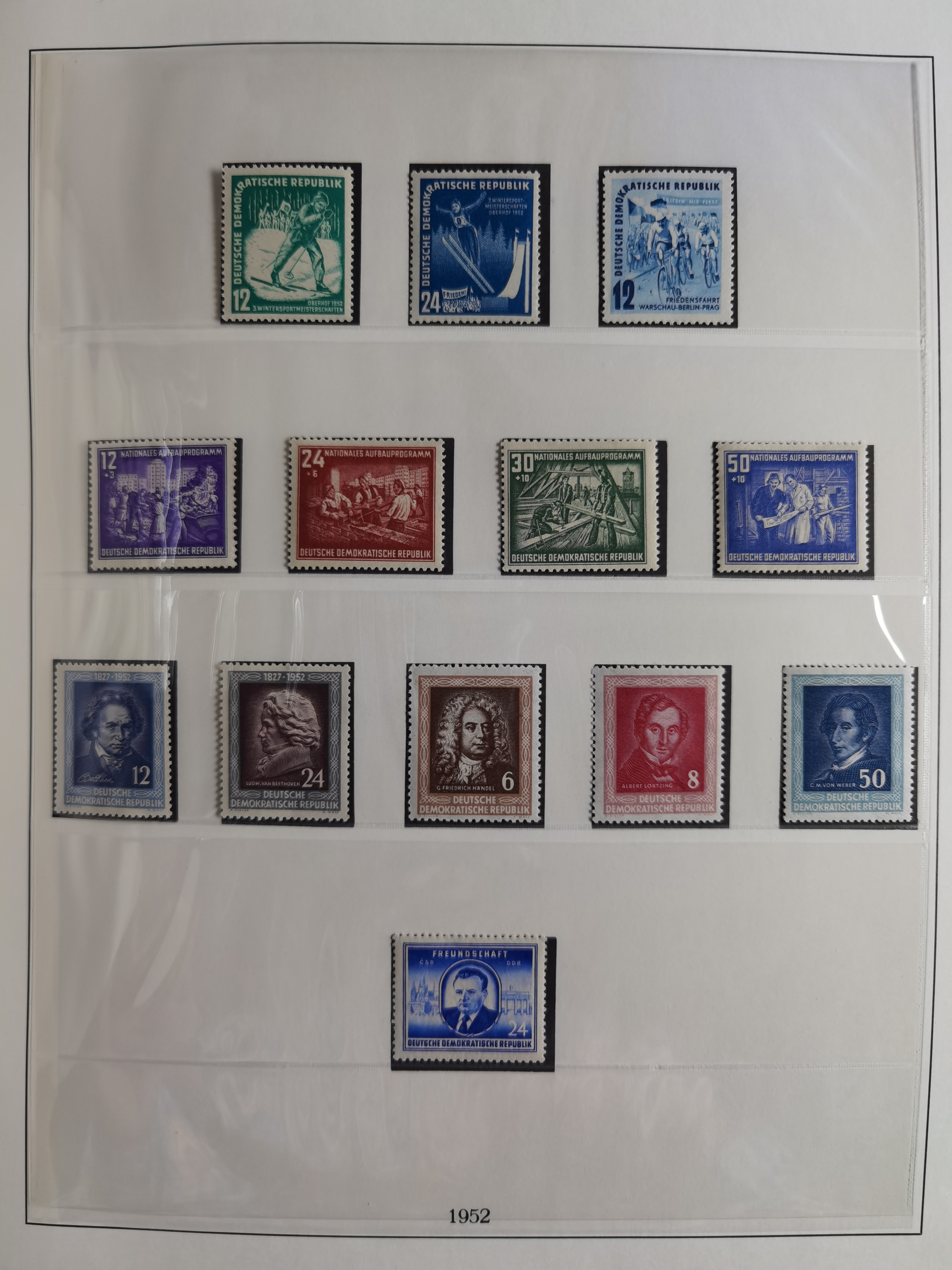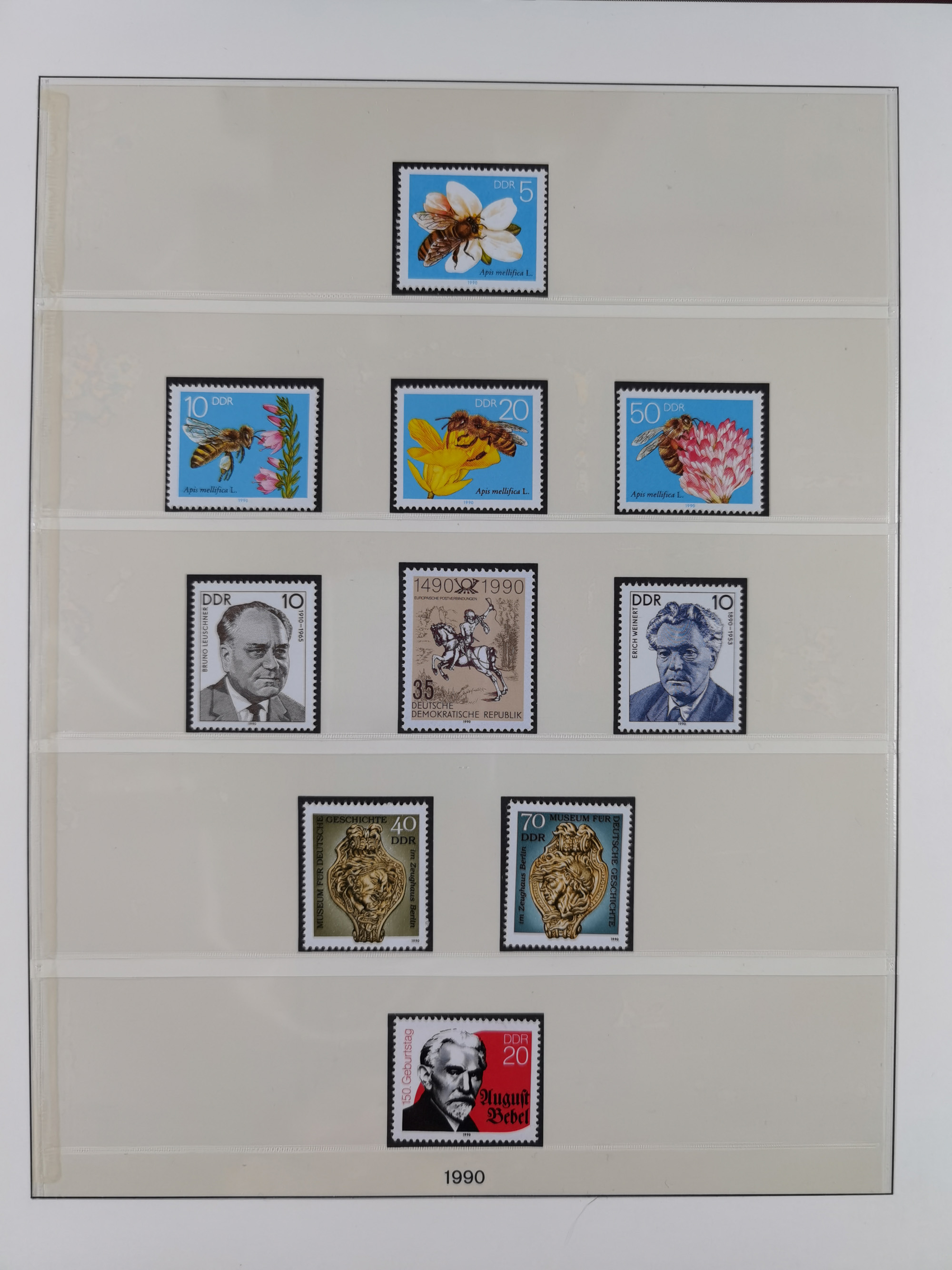 1948/90, in den Hauptnummern bis 1960 komplette postfrische Sammlungen Berlin 1948-90 inkl. Schwarzaufdruck, Rotaufdruck sign. Dub und Block 1, Bundesrepublik 1949-72 inkl. Posthornsatz, sowie DDR 1949-71 inkl. ausgiebigen Teilen Zusammendrucke, es fehlen bei den späten modernen Ausgaben teils einzelne Werte oder Sätze, gute Erhaltung, Alben mit Lagerspuren, in 11 Vordruckalben