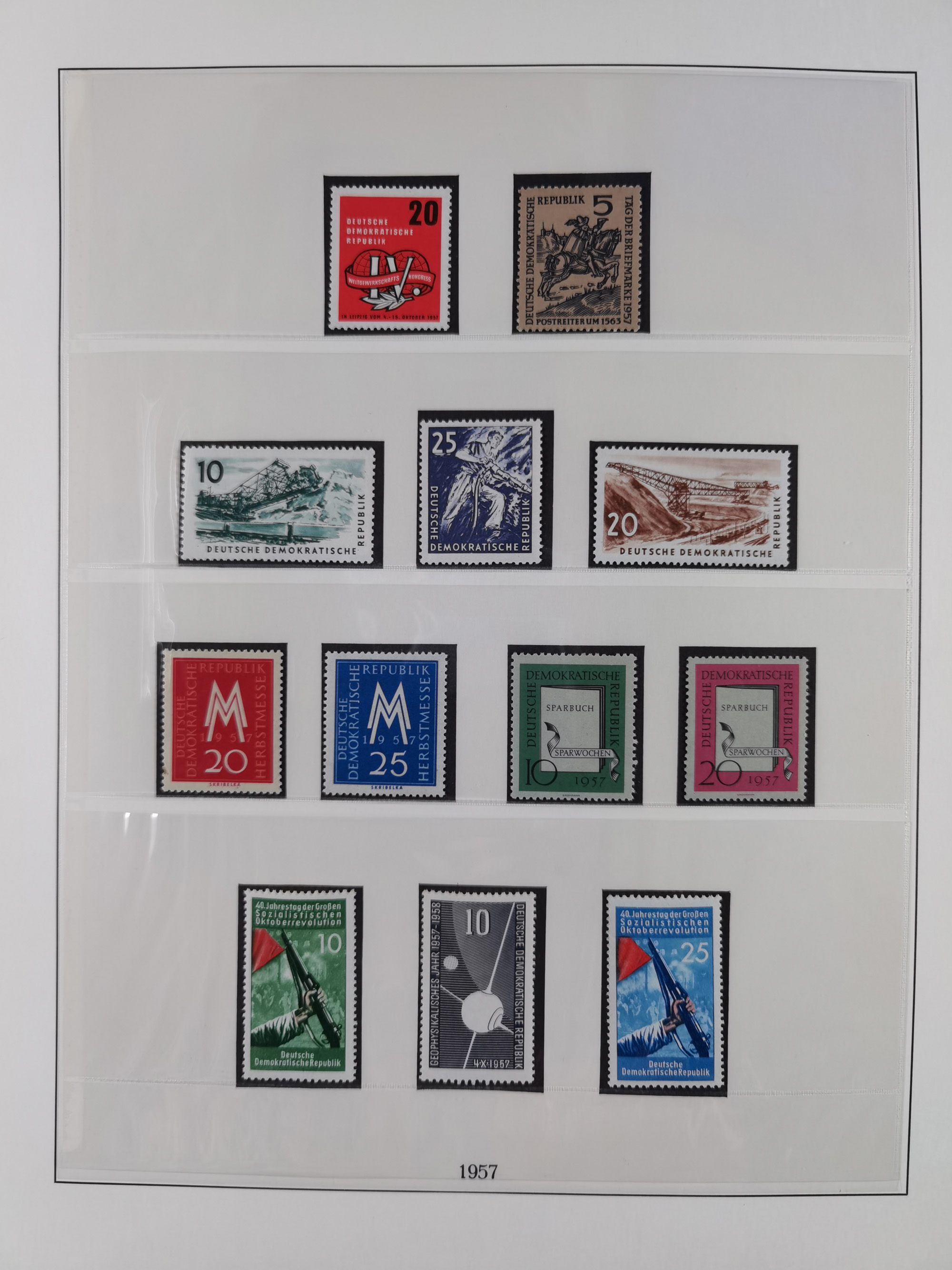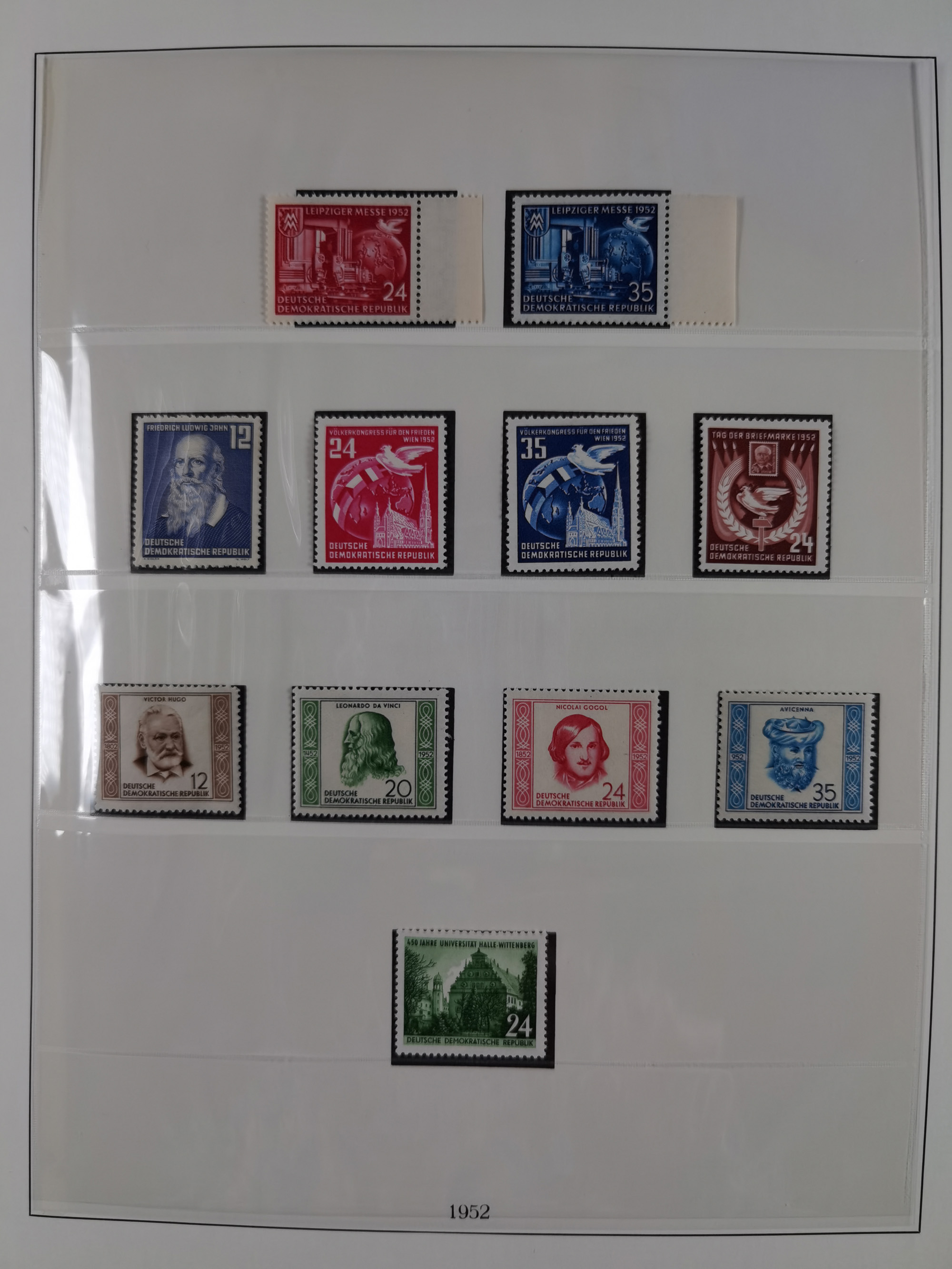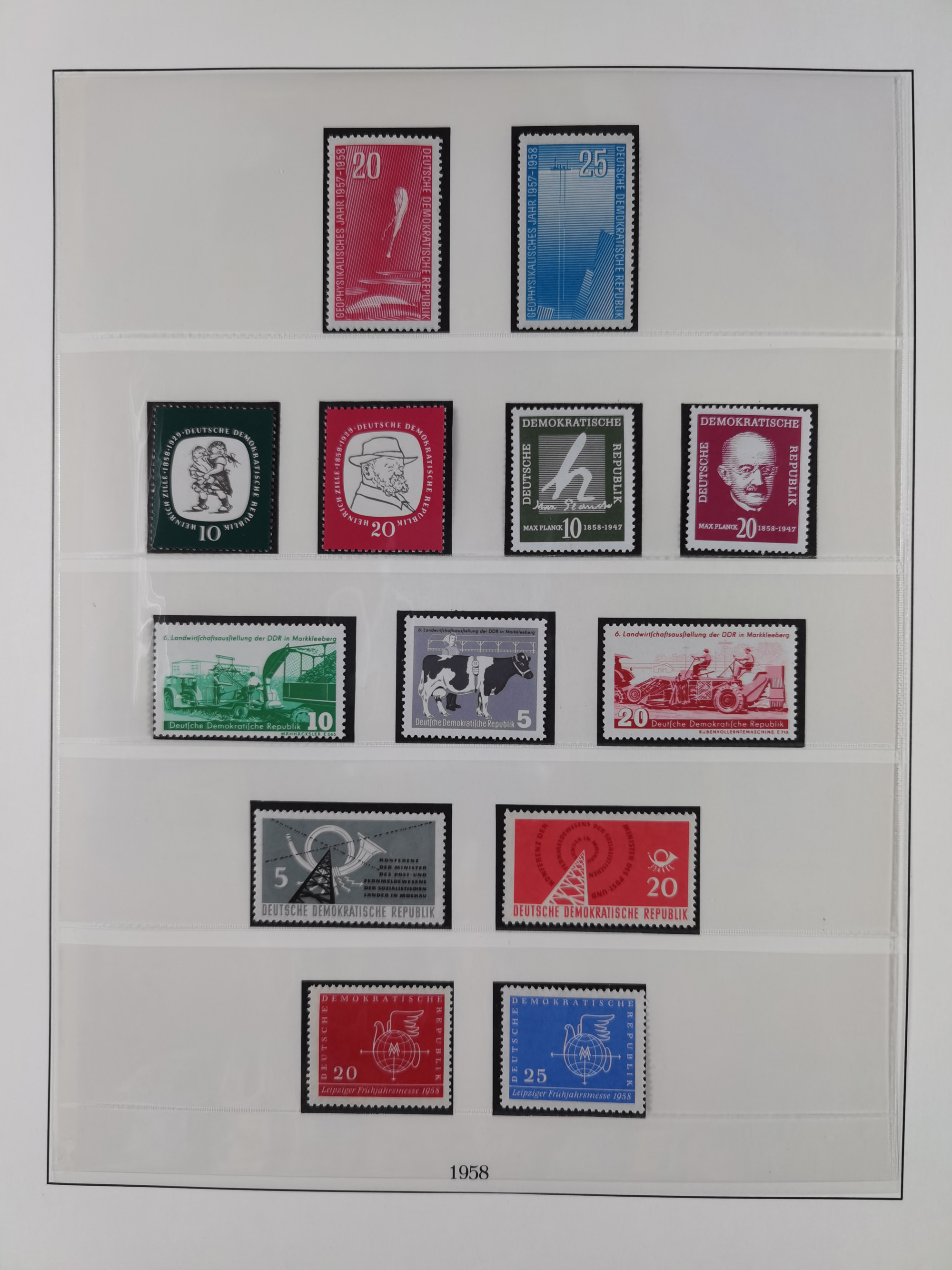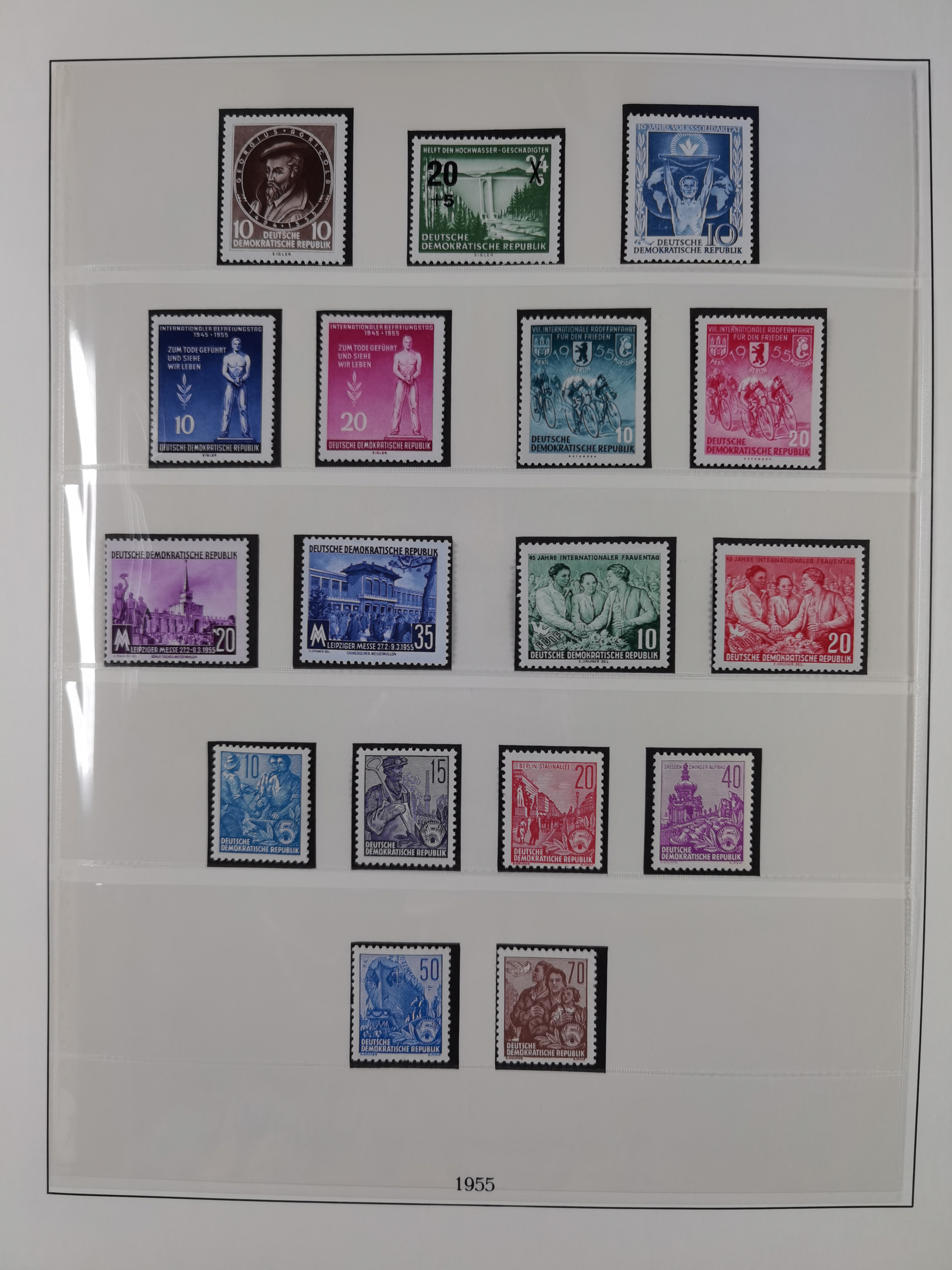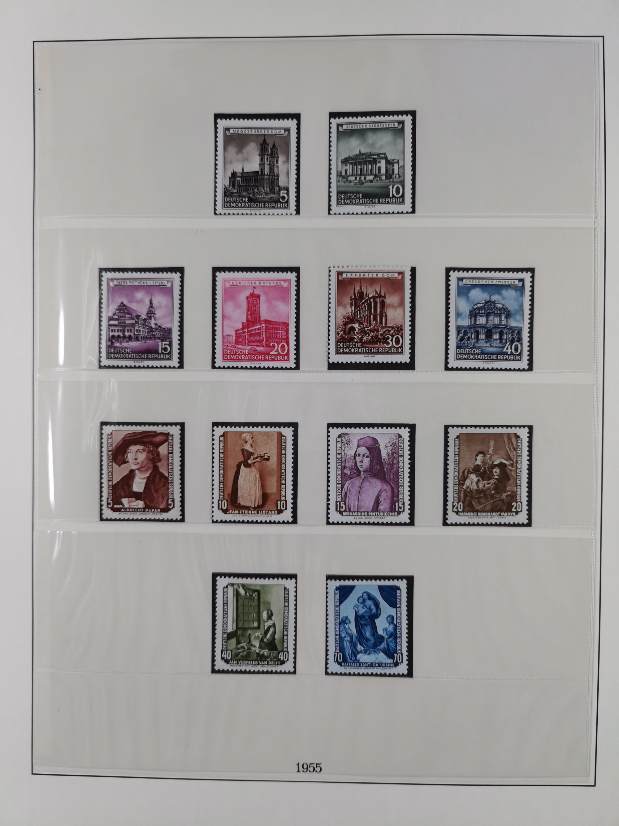 1948/90, in den Hauptnummern bis 1960 komplette postfrische Sammlungen Berlin 1948-90 inkl. Schwarzaufdruck, Rotaufdruck sign. Dub und Block 1, Bundesrepublik 1949-72 inkl. Posthornsatz, sowie DDR 1949-71 inkl. ausgiebigen Teilen Zusammendrucke, es fehlen bei den späten modernen Ausgaben teils einzelne Werte oder Sätze, gute Erhaltung, Alben mit Lagerspuren, in 11 Vordruckalben