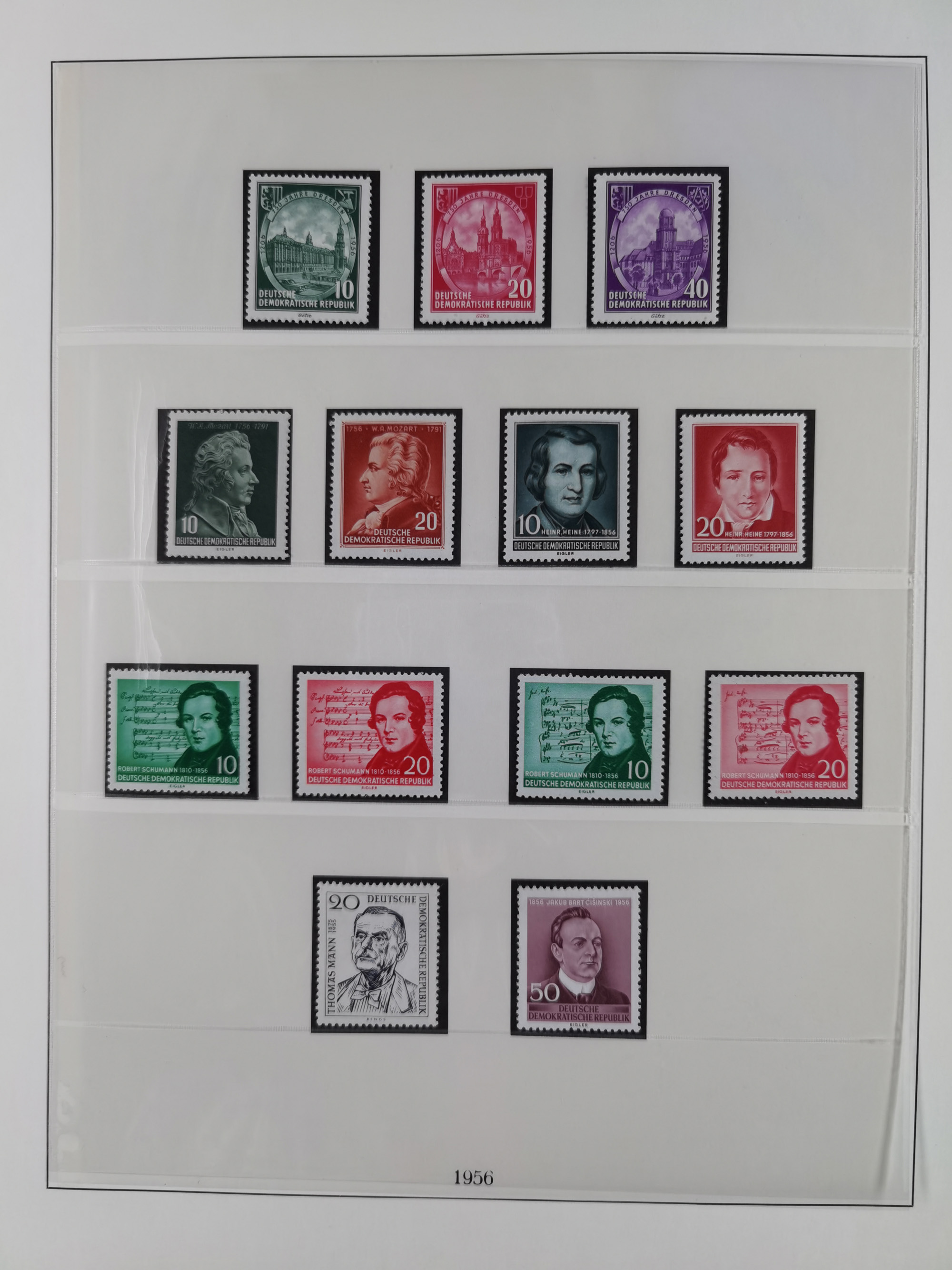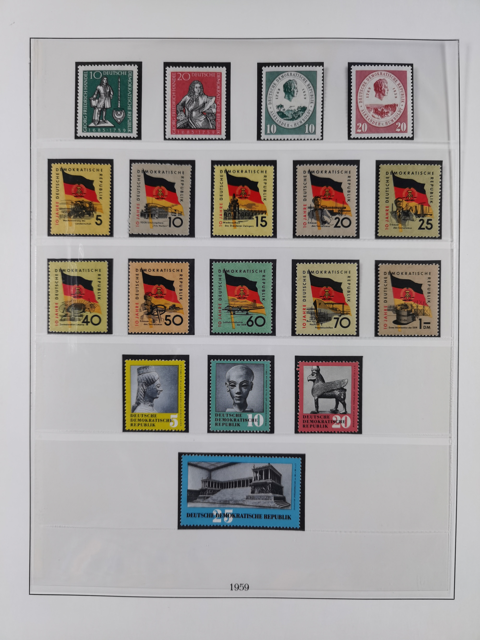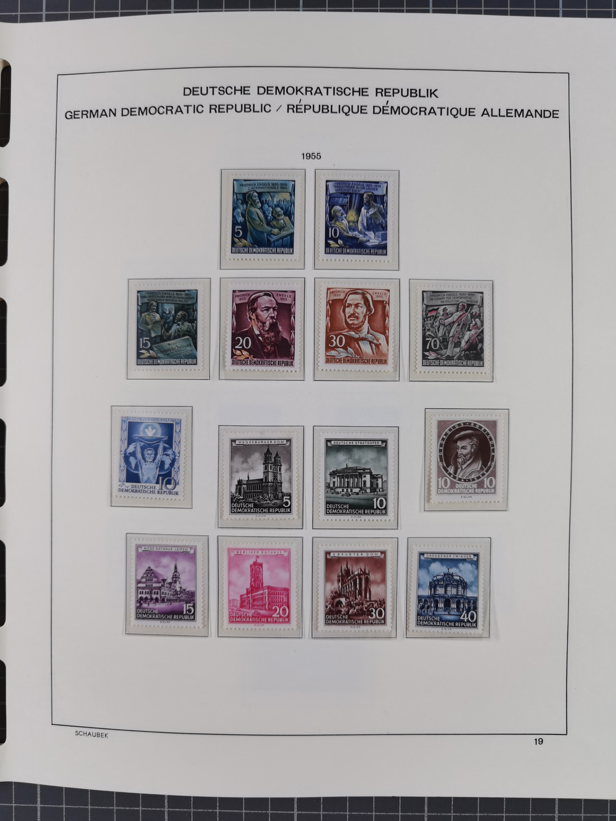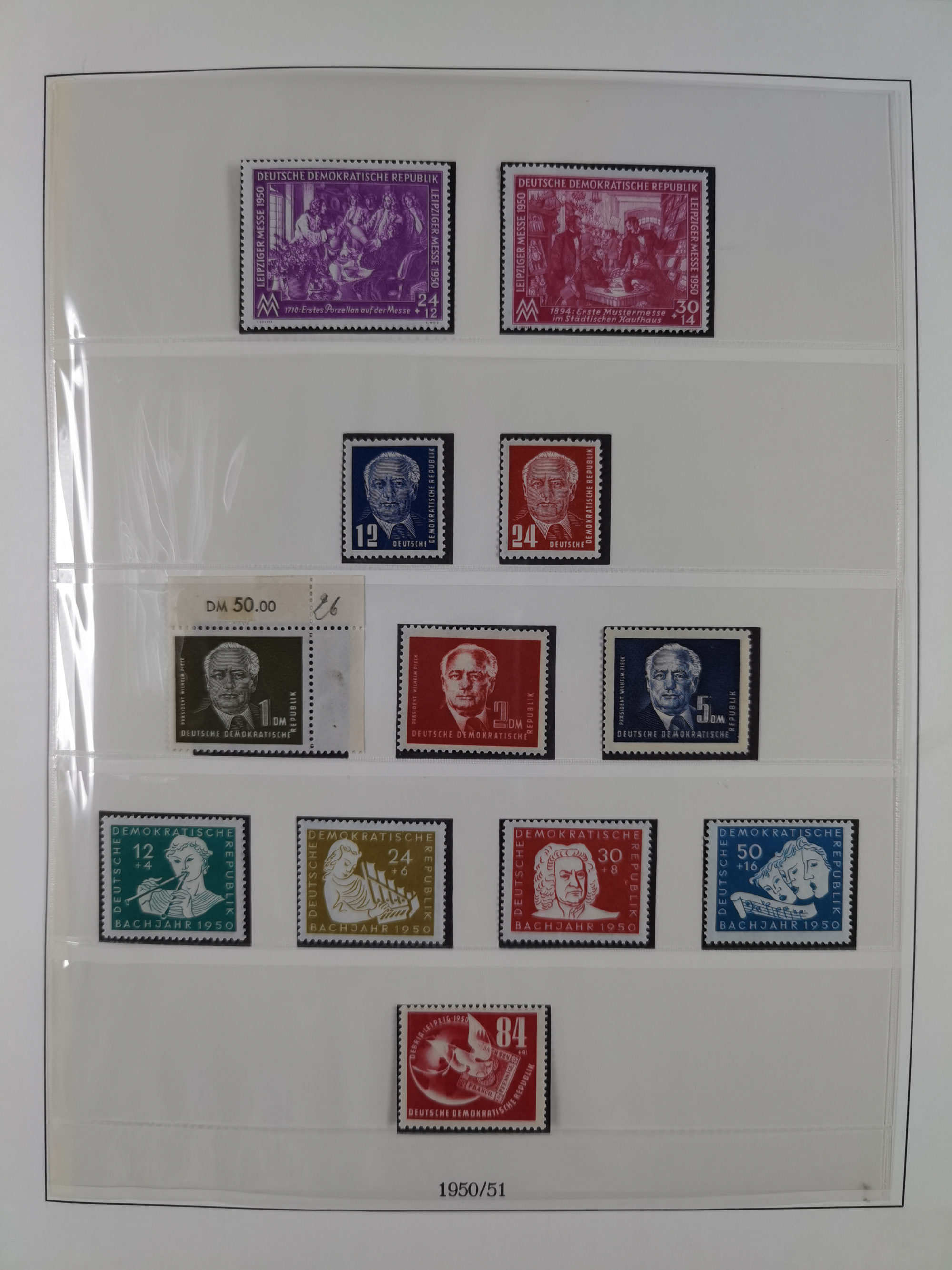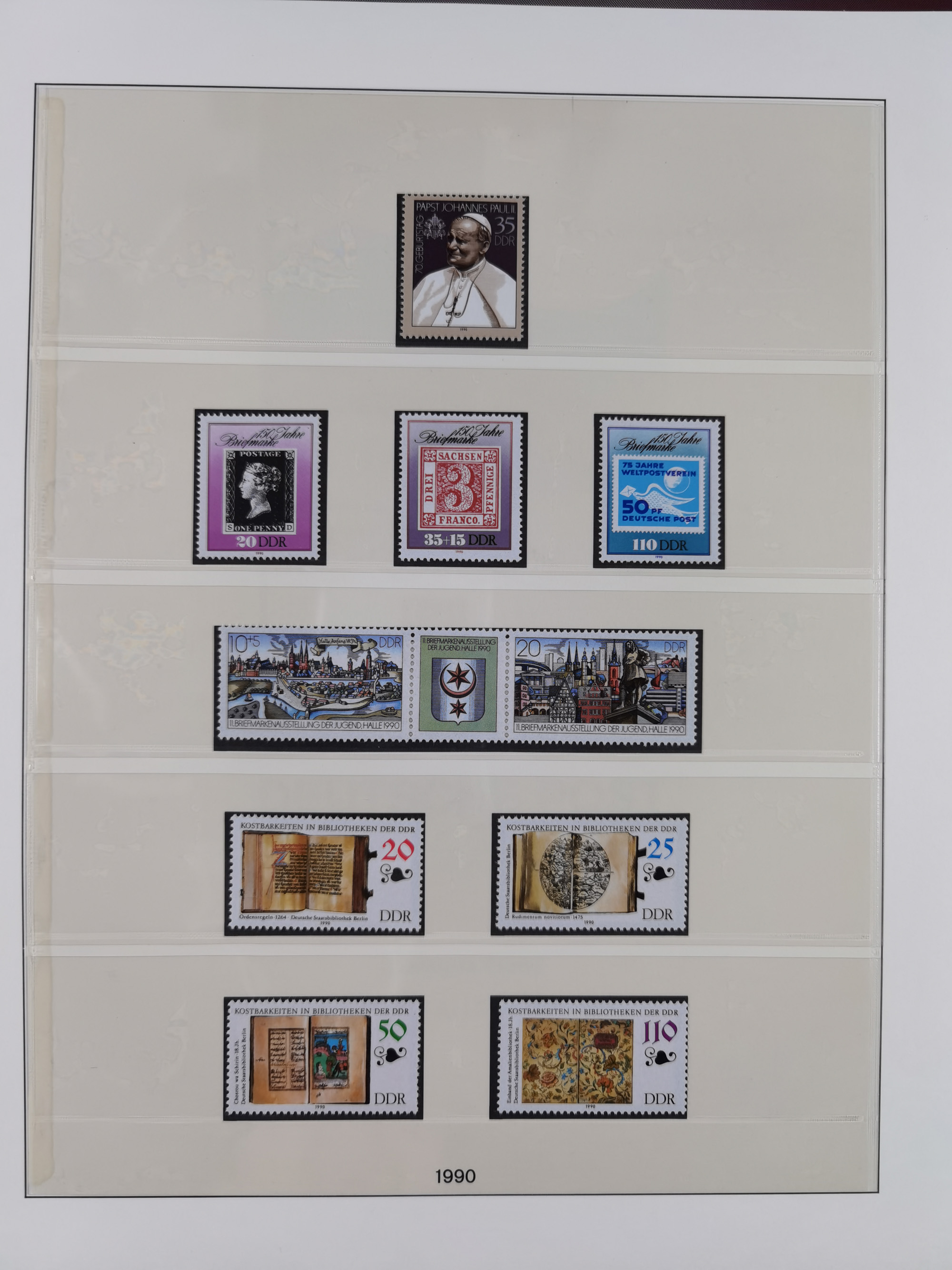 1948/90, in den Hauptnummern bis 1960 komplette postfrische Sammlungen Berlin 1948-90 inkl. Schwarzaufdruck, Rotaufdruck sign. Dub und Block 1, Bundesrepublik 1949-72 inkl. Posthornsatz, sowie DDR 1949-71 inkl. ausgiebigen Teilen Zusammendrucke, es fehlen bei den späten modernen Ausgaben teils einzelne Werte oder Sätze, gute Erhaltung, Alben mit Lagerspuren, in 11 Vordruckalben