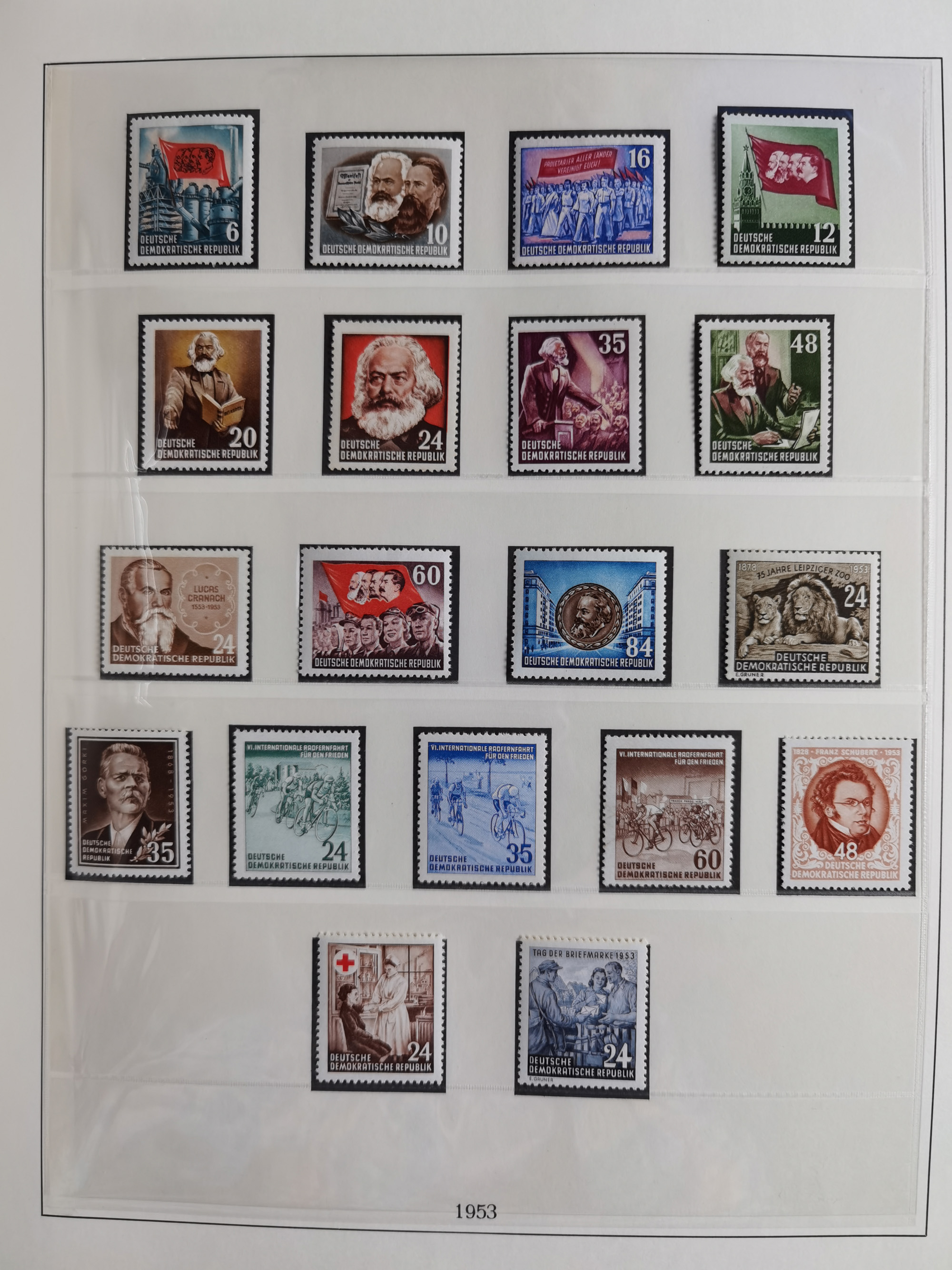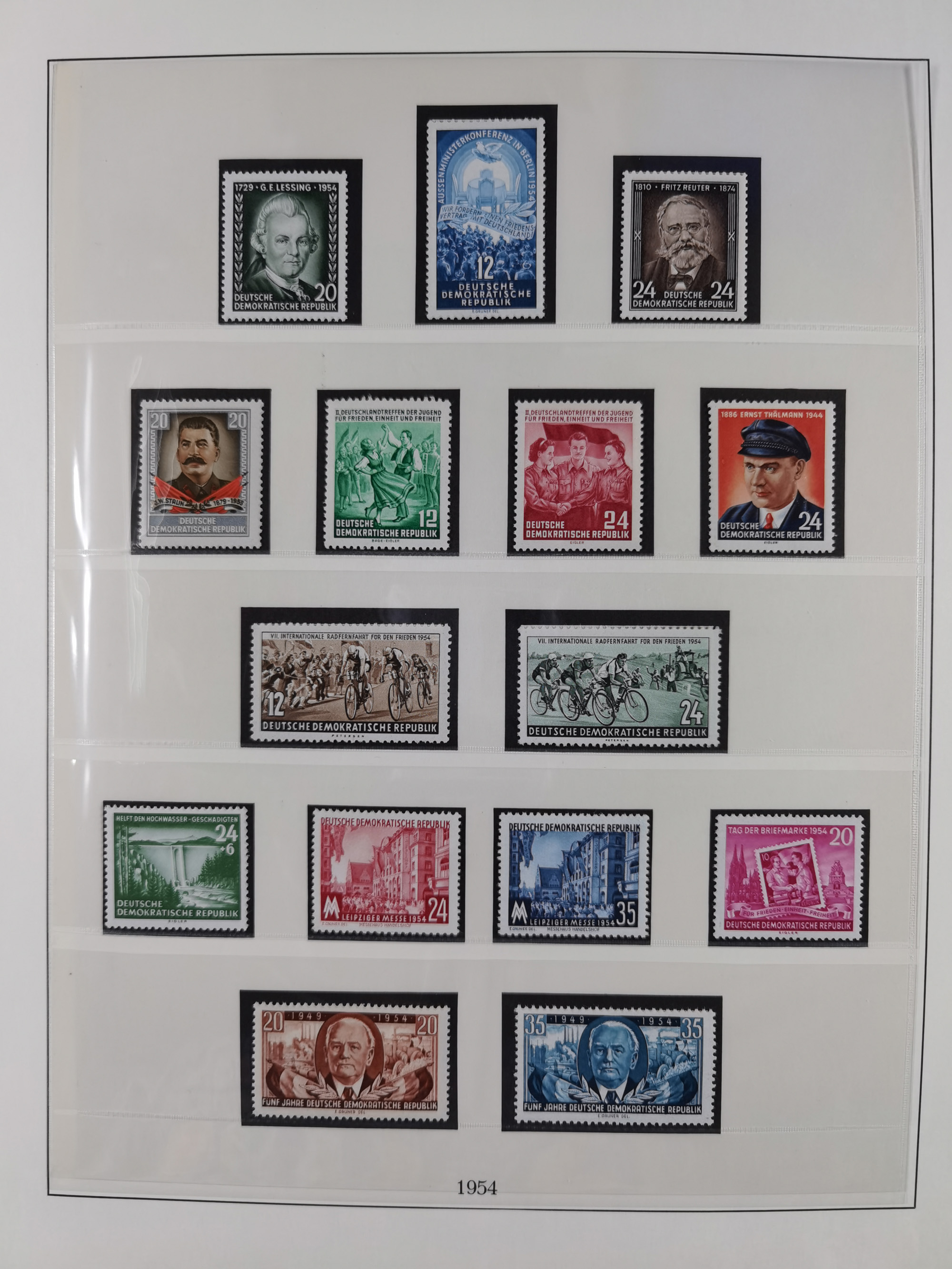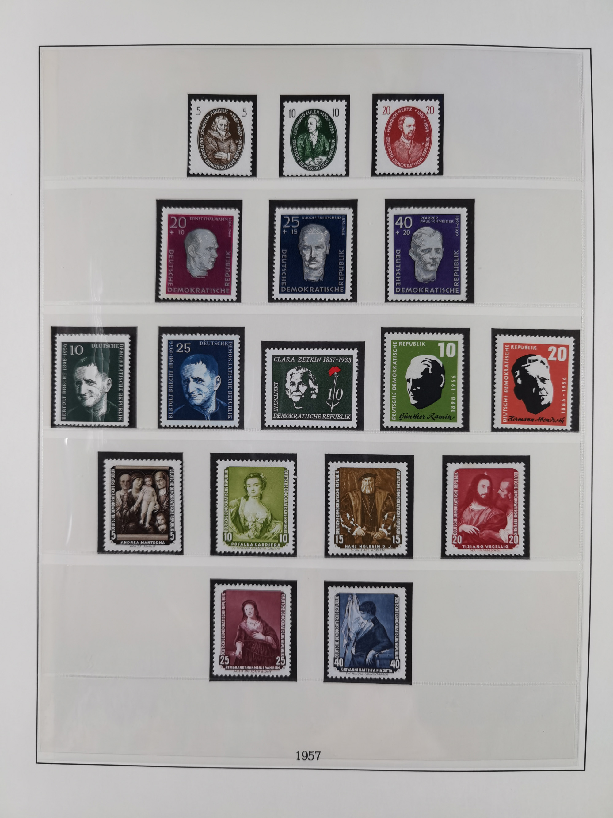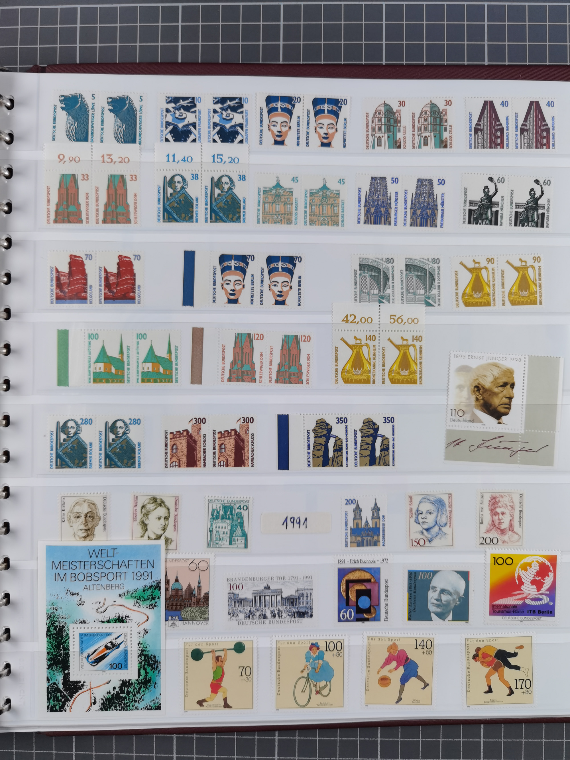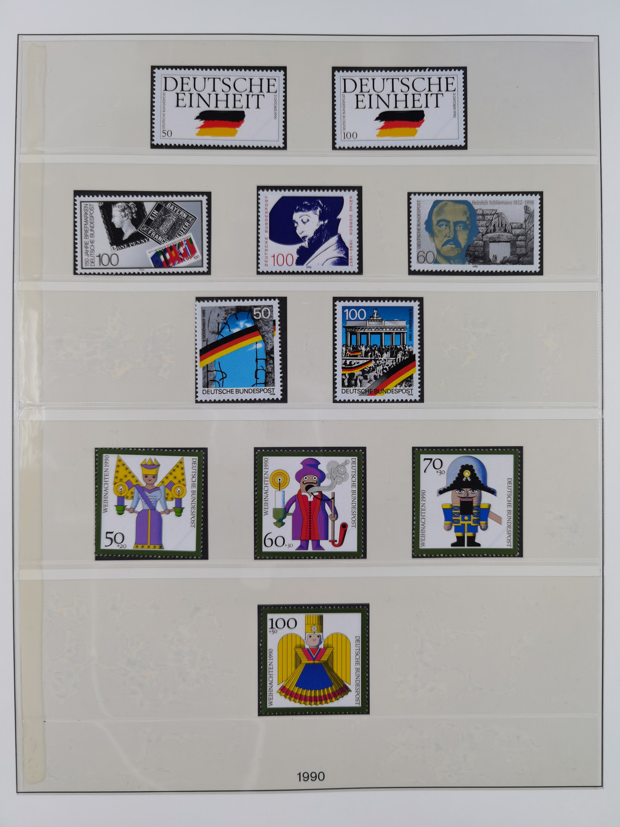 1948/90, in den Hauptnummern bis 1960 komplette postfrische Sammlungen Berlin 1948-90 inkl. Schwarzaufdruck, Rotaufdruck sign. Dub und Block 1, Bundesrepublik 1949-72 inkl. Posthornsatz, sowie DDR 1949-71 inkl. ausgiebigen Teilen Zusammendrucke, es fehlen bei den späten modernen Ausgaben teils einzelne Werte oder Sätze, gute Erhaltung, Alben mit Lagerspuren, in 11 Vordruckalben