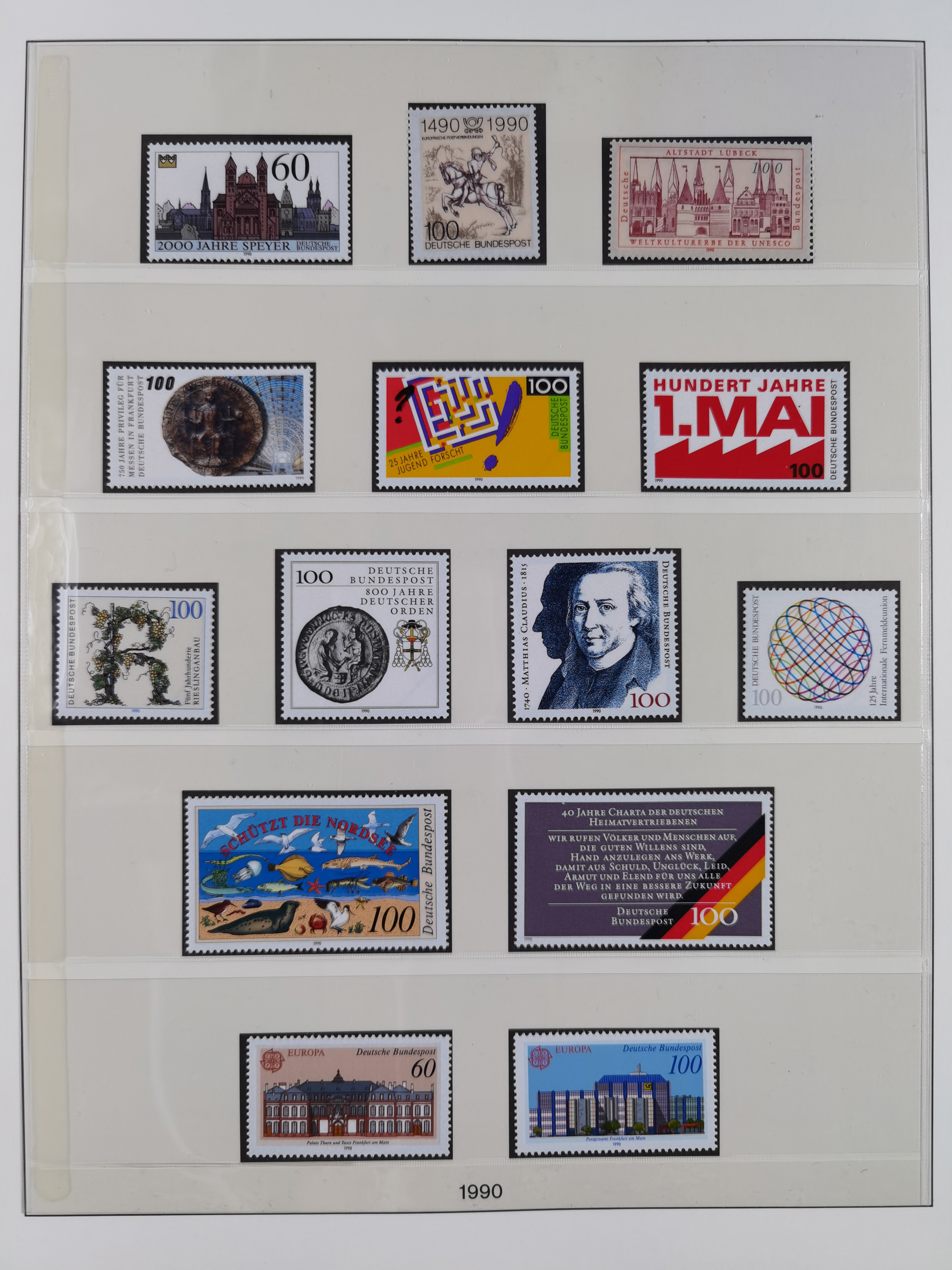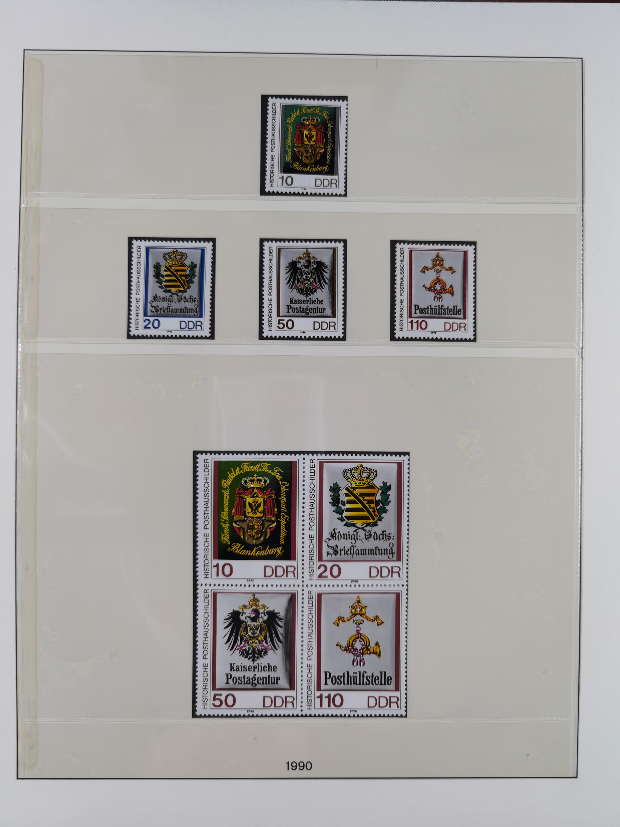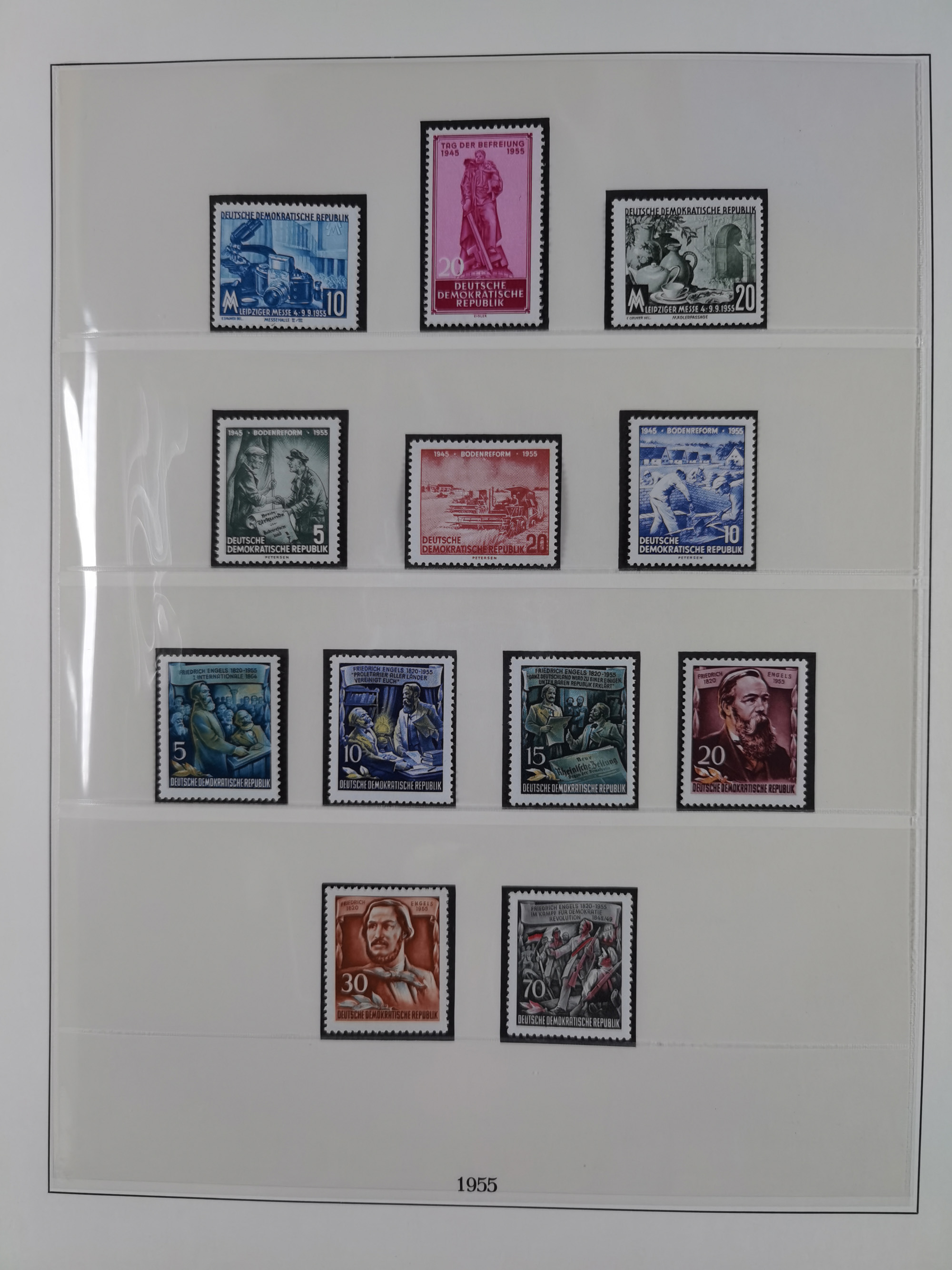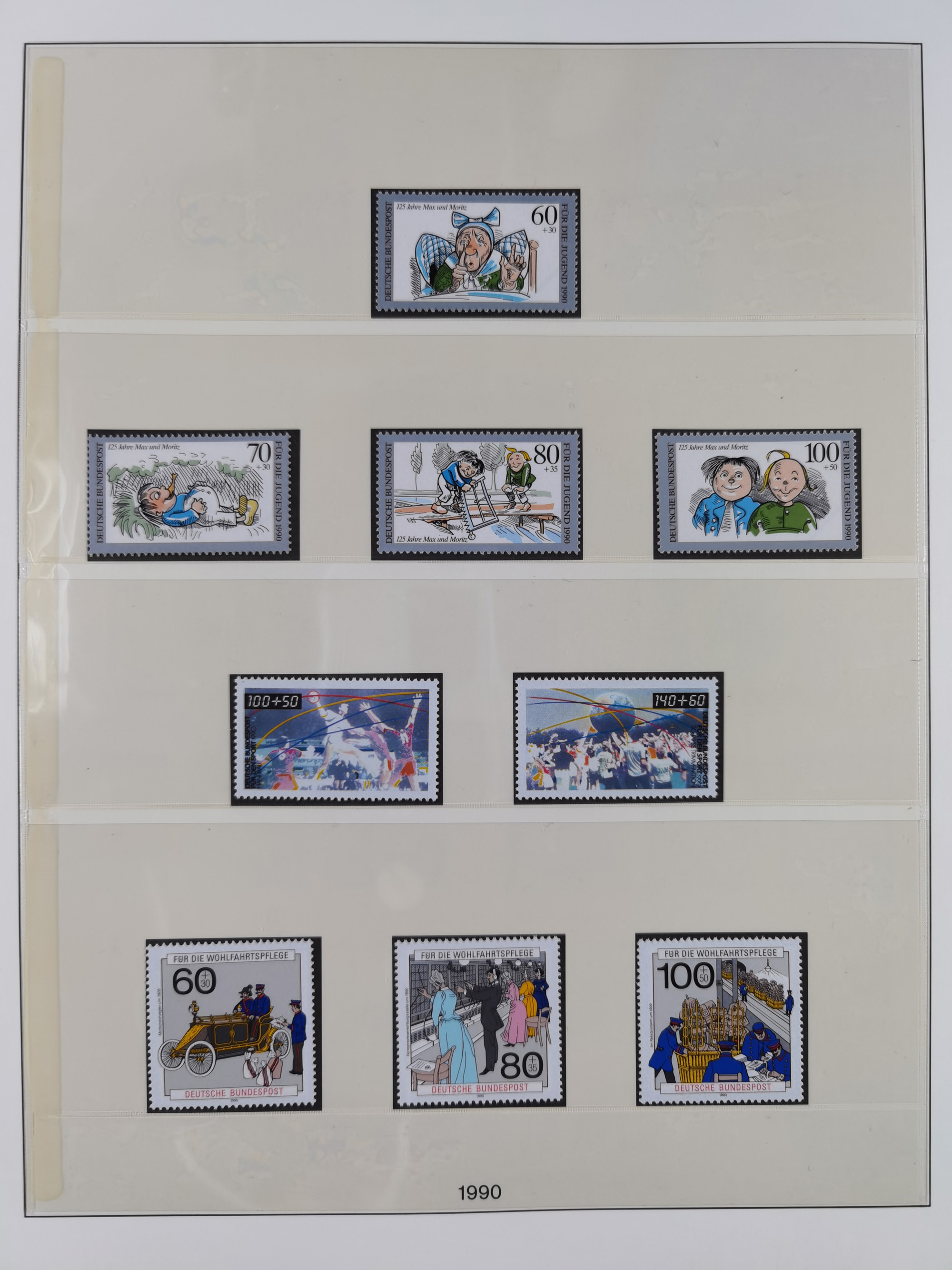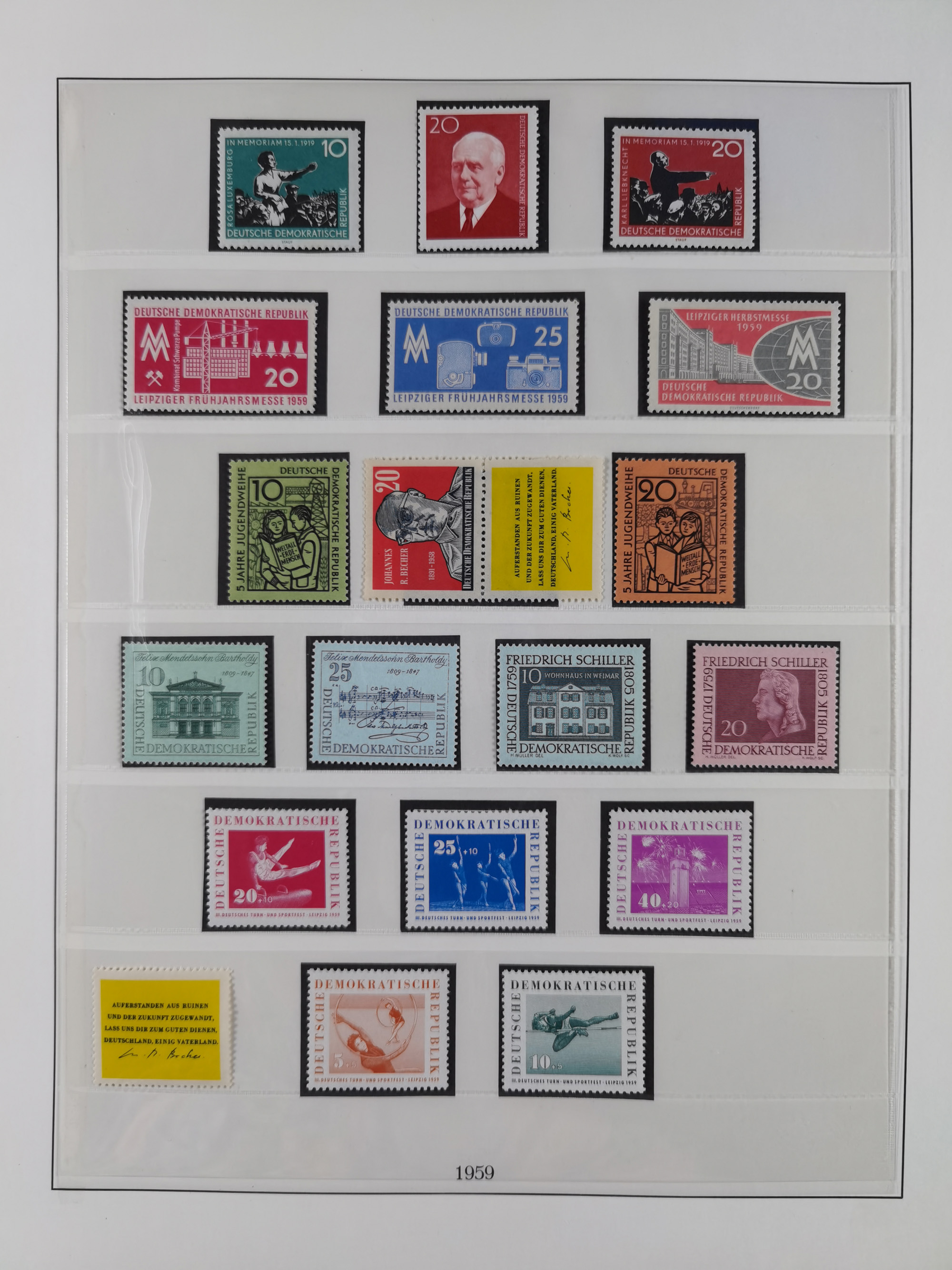 1948/90, in den Hauptnummern bis 1960 komplette postfrische Sammlungen Berlin 1948-90 inkl. Schwarzaufdruck, Rotaufdruck sign. Dub und Block 1, Bundesrepublik 1949-72 inkl. Posthornsatz, sowie DDR 1949-71 inkl. ausgiebigen Teilen Zusammendrucke, es fehlen bei den späten modernen Ausgaben teils einzelne Werte oder Sätze, gute Erhaltung, Alben mit Lagerspuren, in 11 Vordruckalben