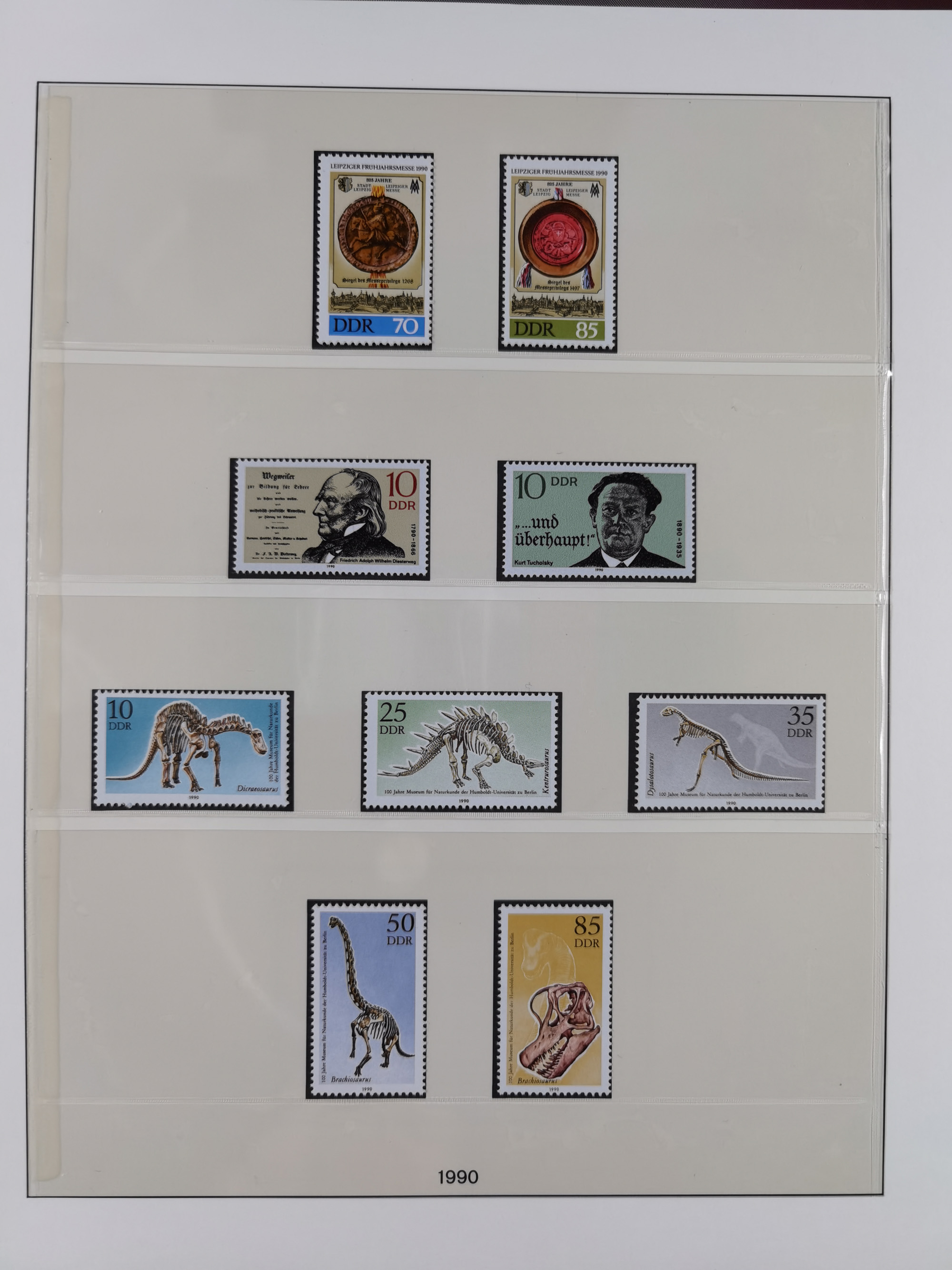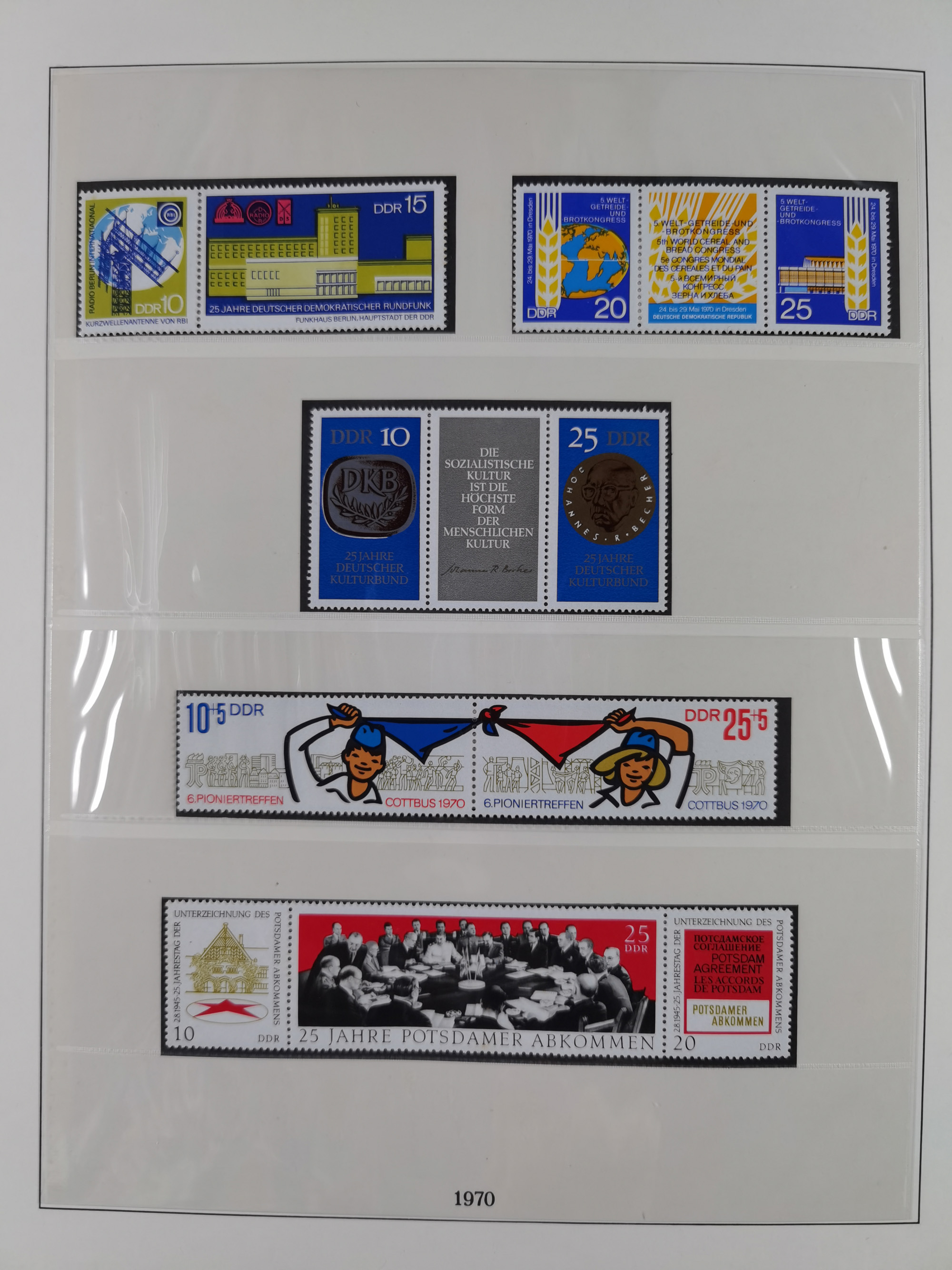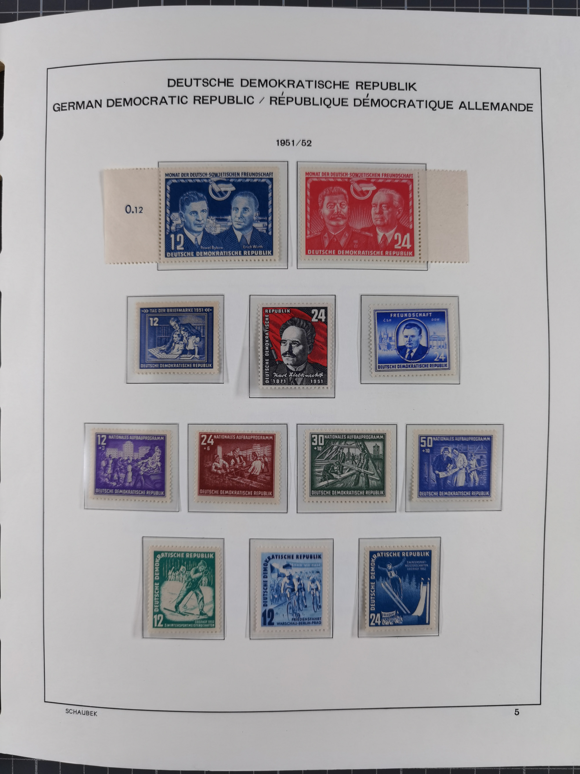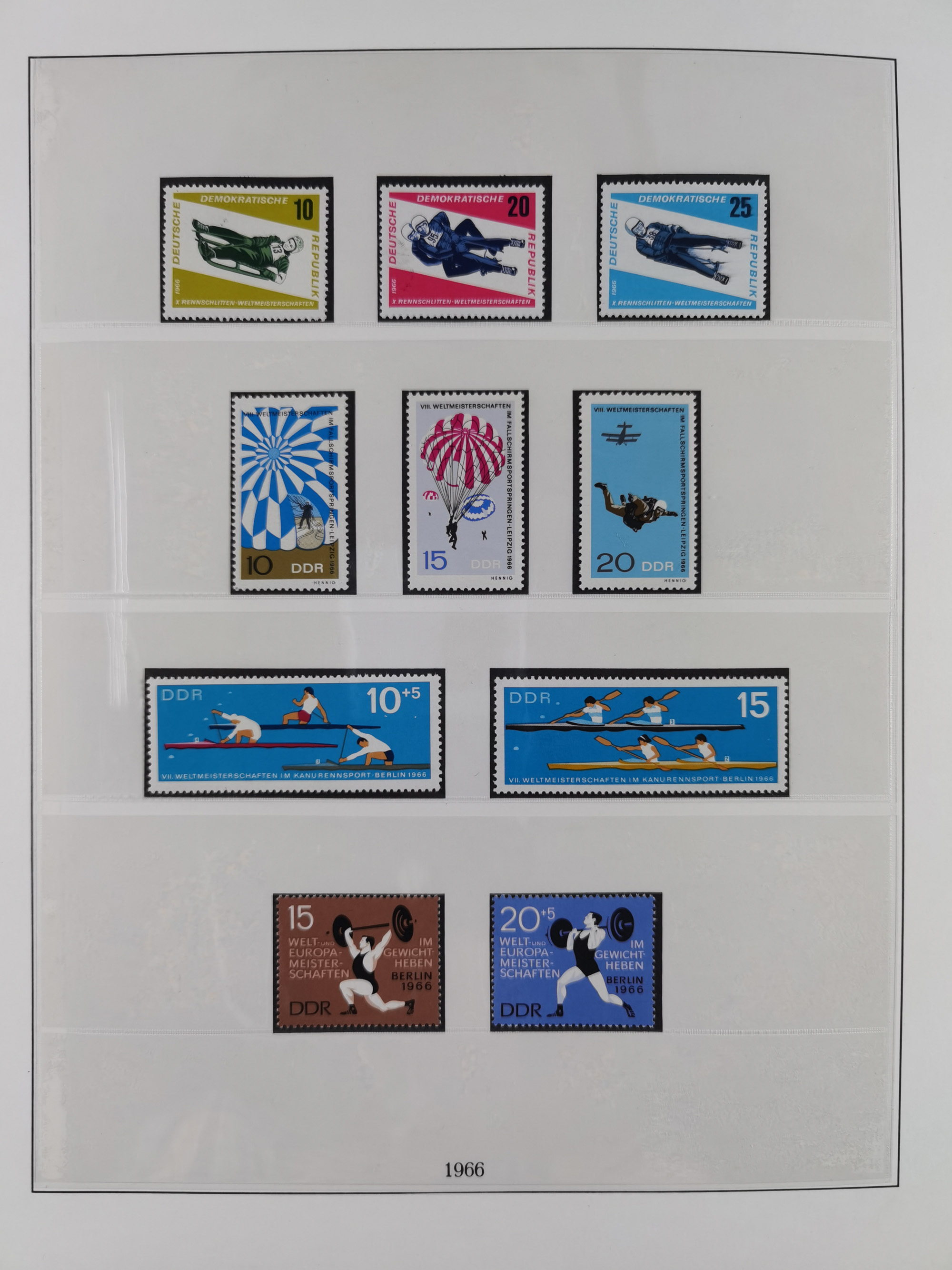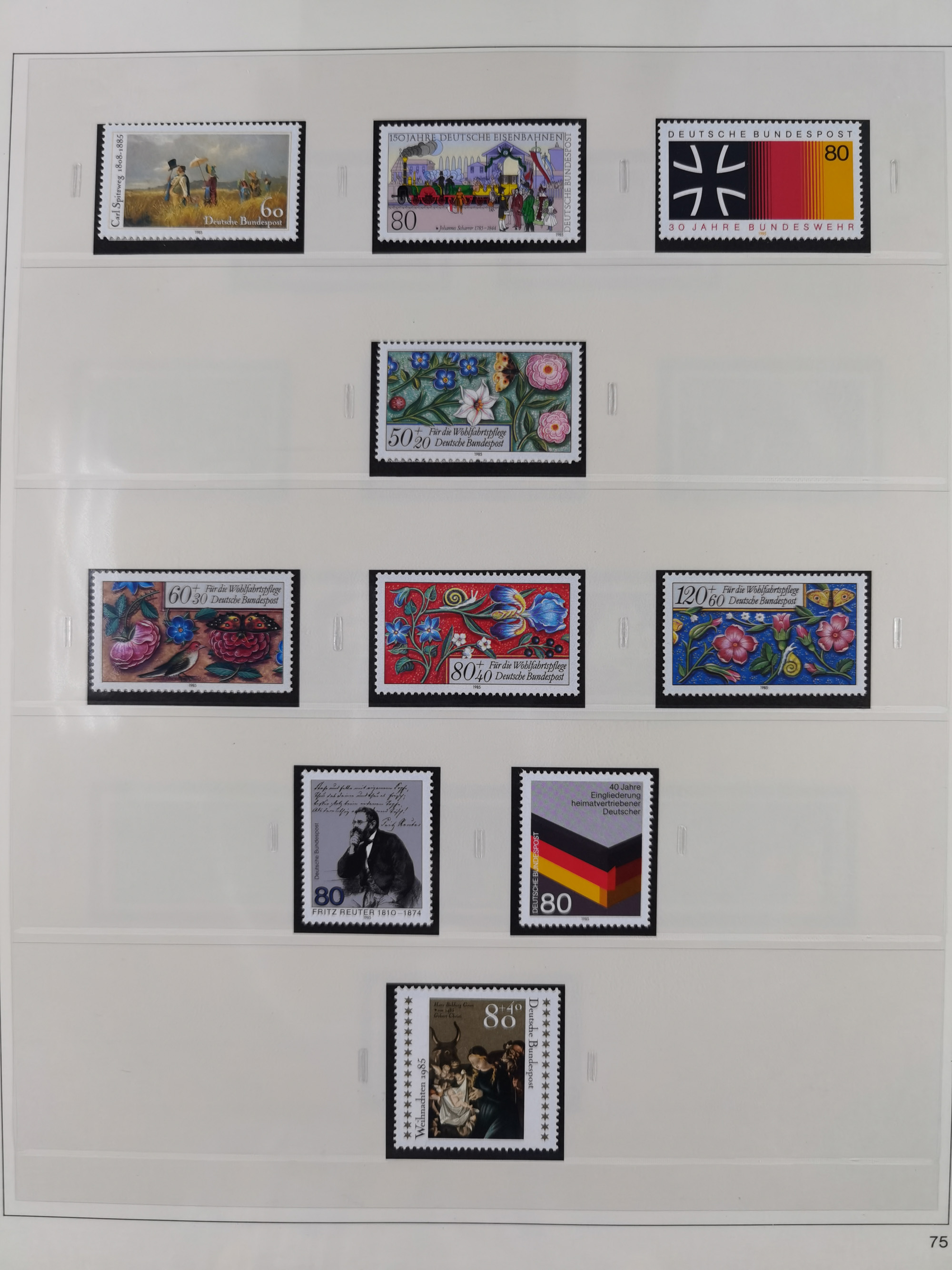 1948/90, in den Hauptnummern bis 1960 komplette postfrische Sammlungen Berlin 1948-90 inkl. Schwarzaufdruck, Rotaufdruck sign. Dub und Block 1, Bundesrepublik 1949-72 inkl. Posthornsatz, sowie DDR 1949-71 inkl. ausgiebigen Teilen Zusammendrucke, es fehlen bei den späten modernen Ausgaben teils einzelne Werte oder Sätze, gute Erhaltung, Alben mit Lagerspuren, in 11 Vordruckalben