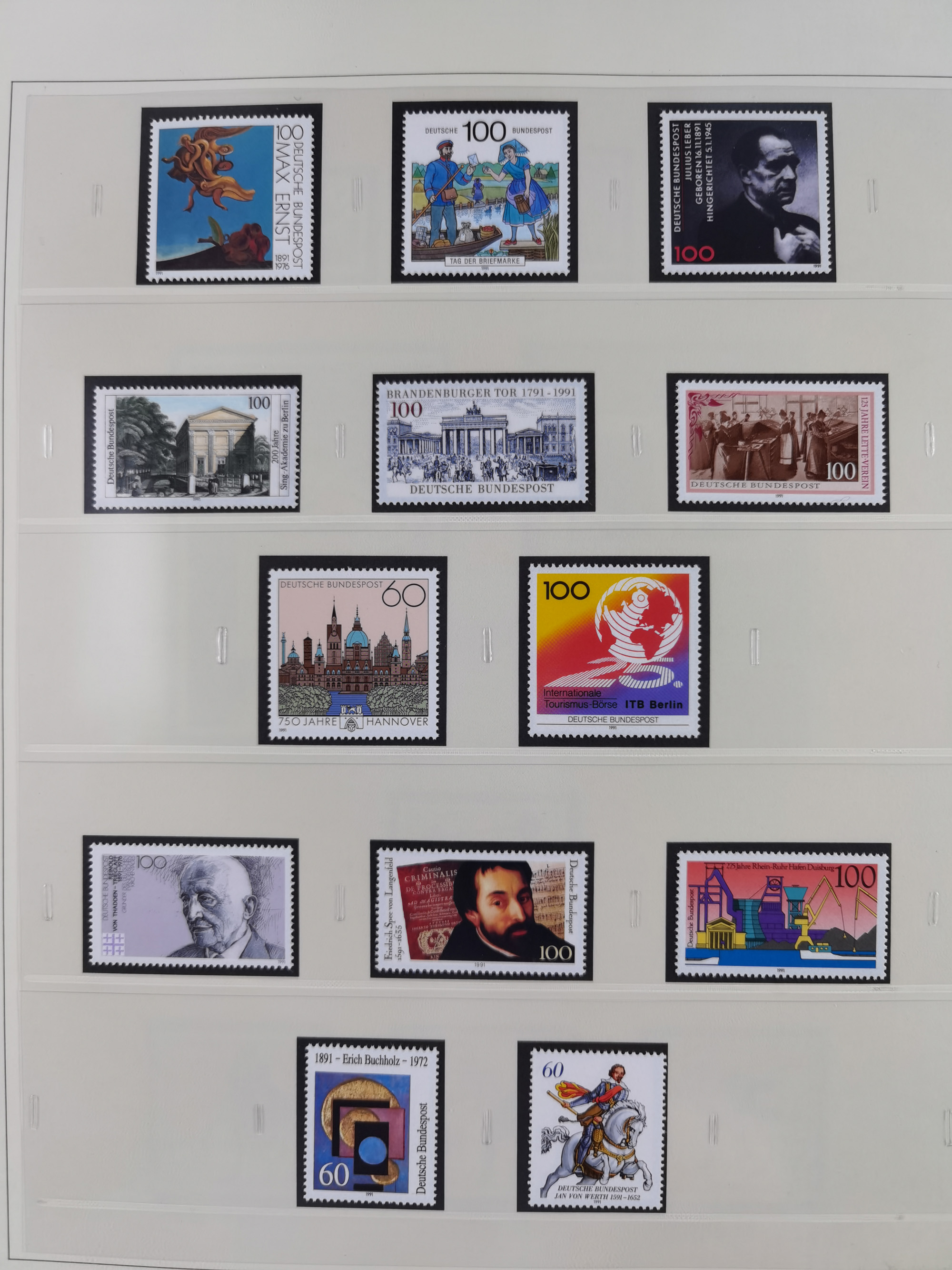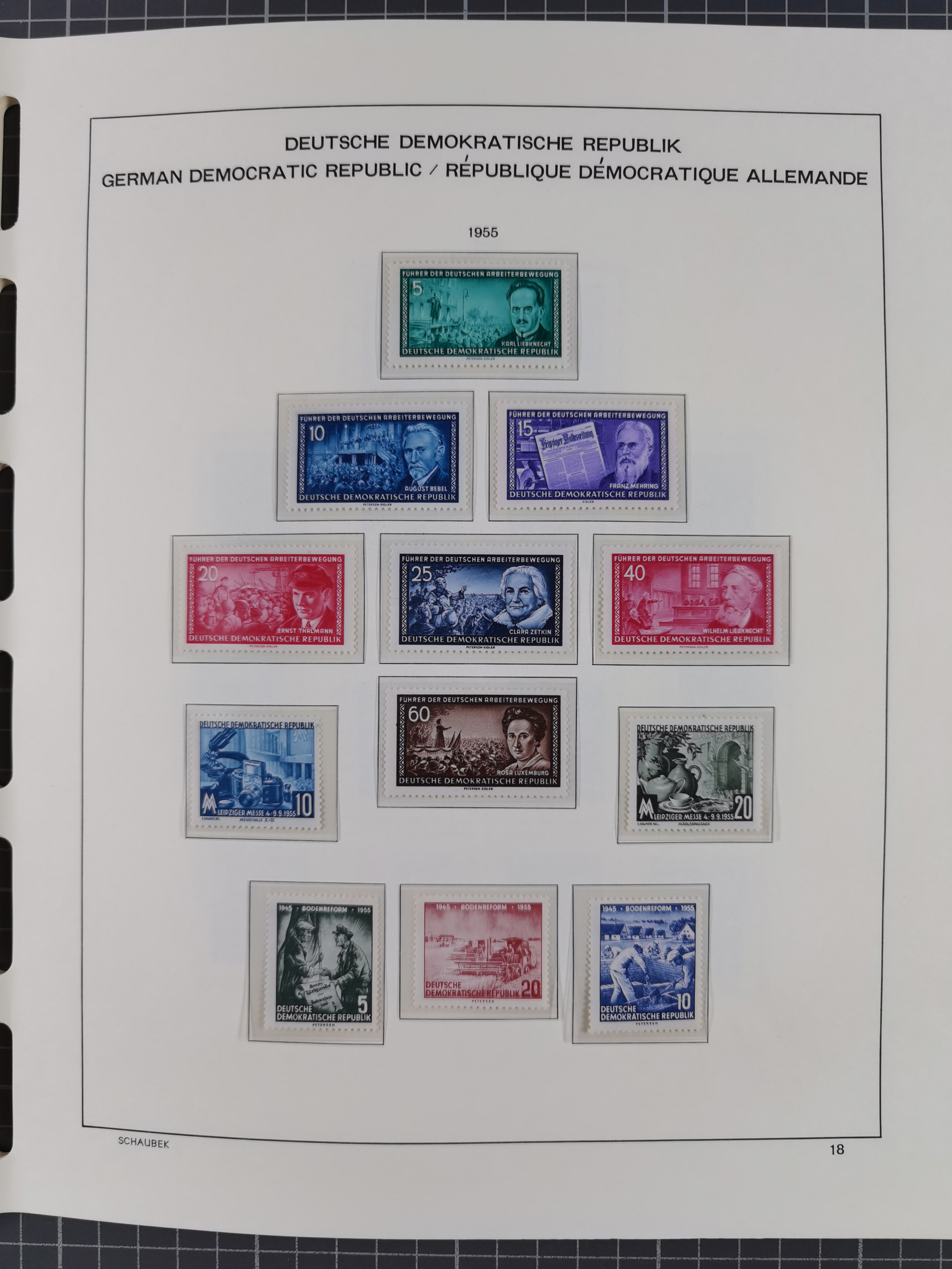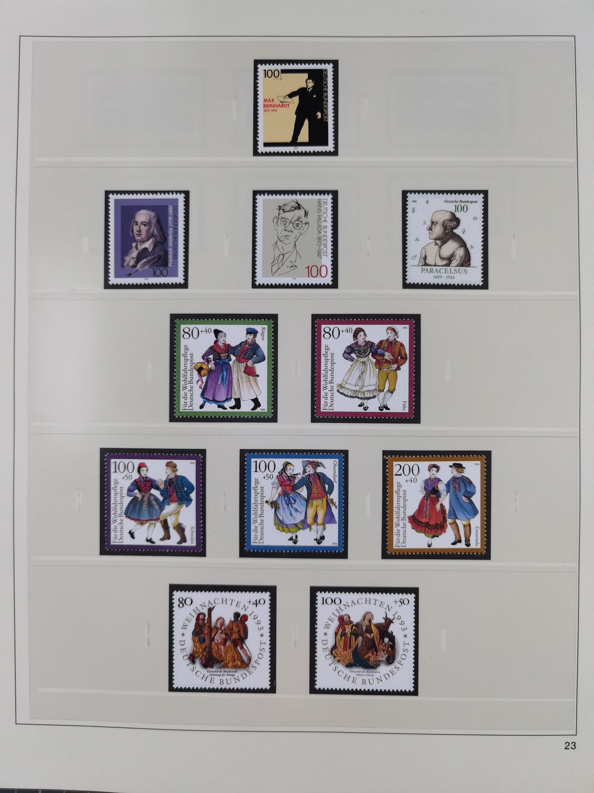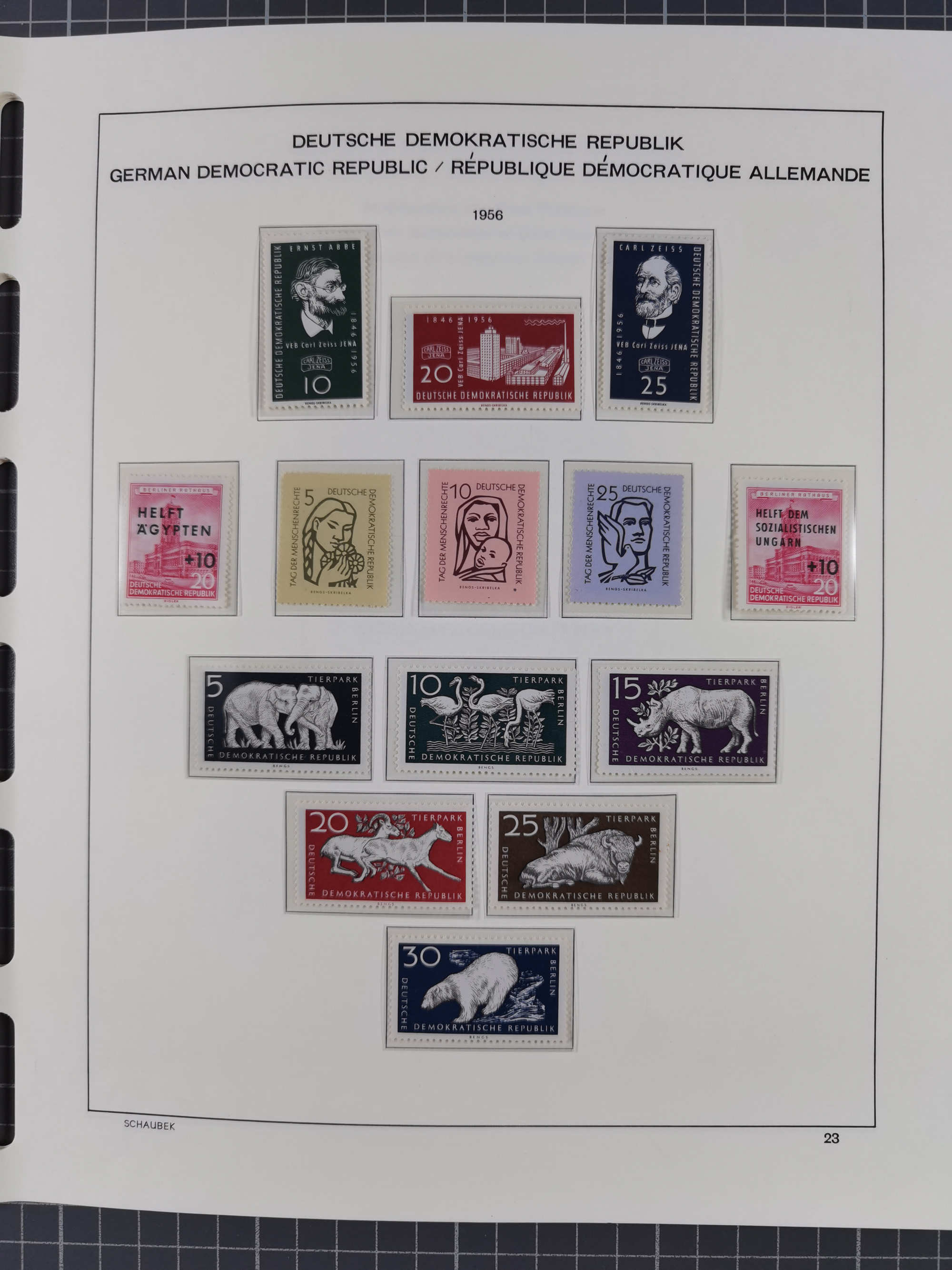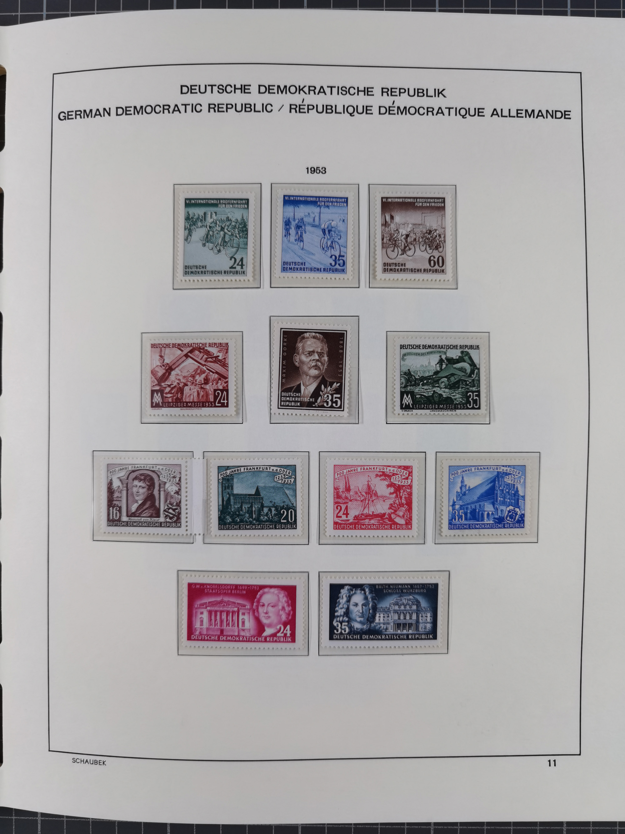 1948/90, in den Hauptnummern bis 1960 komplette postfrische Sammlungen Berlin 1948-90 inkl. Schwarzaufdruck, Rotaufdruck sign. Dub und Block 1, Bundesrepublik 1949-72 inkl. Posthornsatz, sowie DDR 1949-71 inkl. ausgiebigen Teilen Zusammendrucke, es fehlen bei den späten modernen Ausgaben teils einzelne Werte oder Sätze, gute Erhaltung, Alben mit Lagerspuren, in 11 Vordruckalben