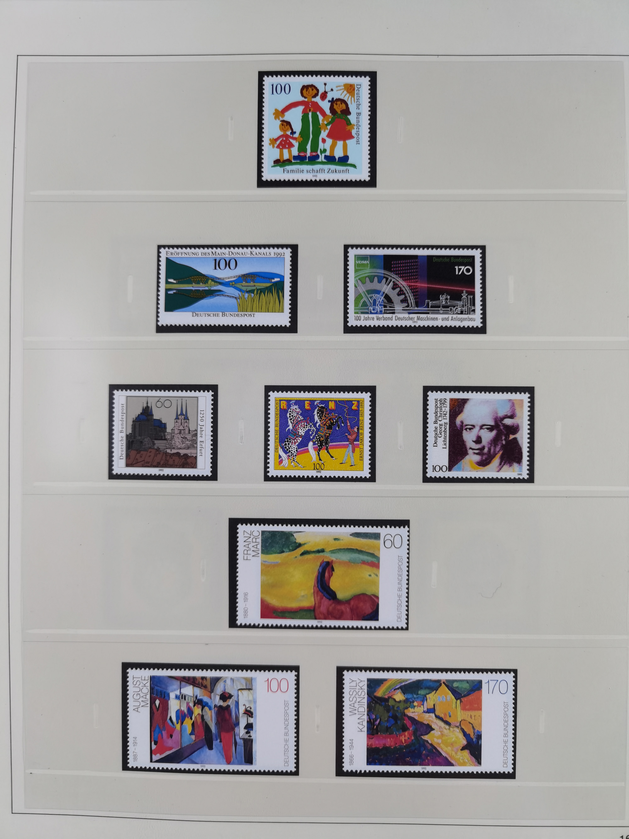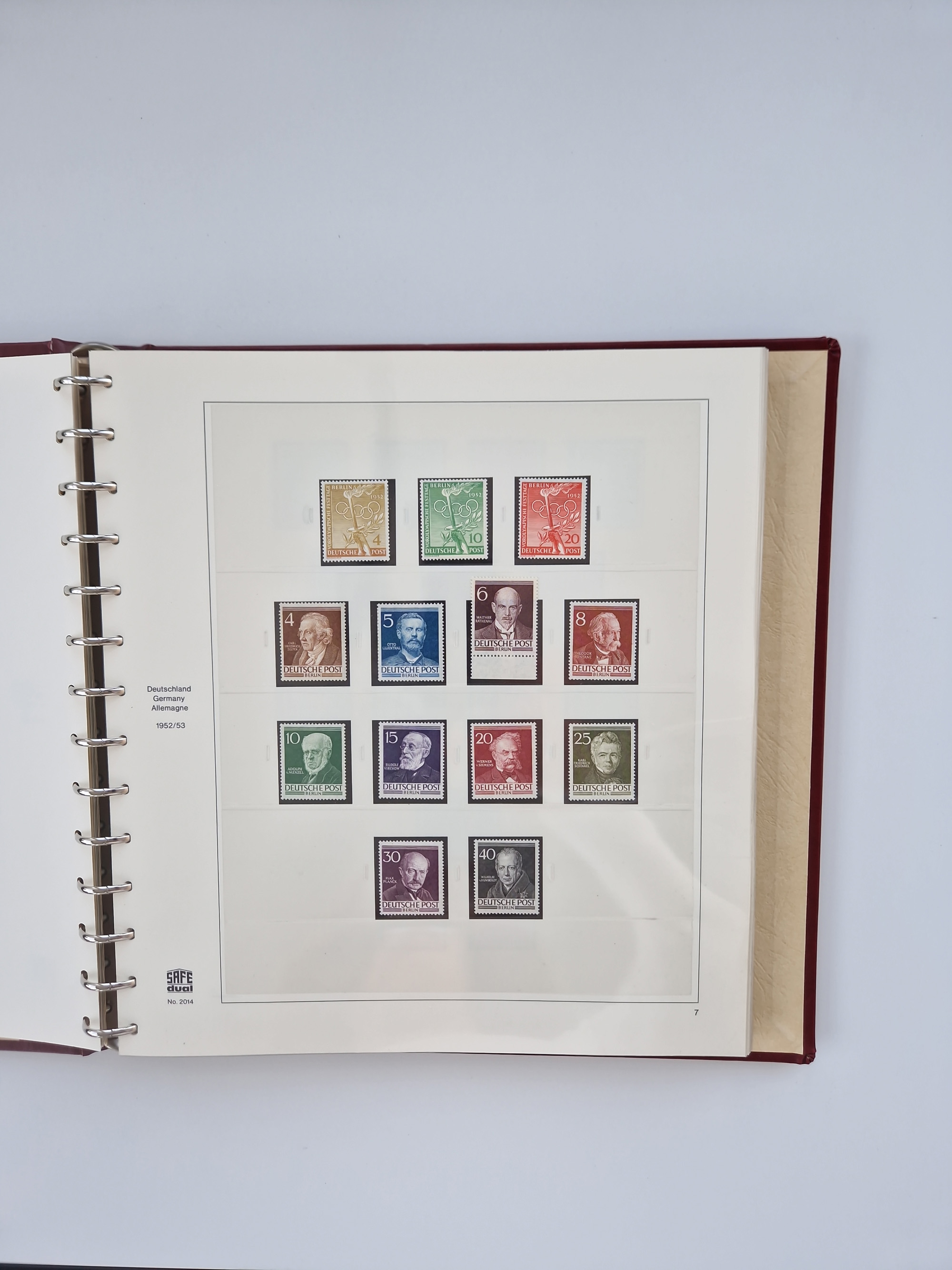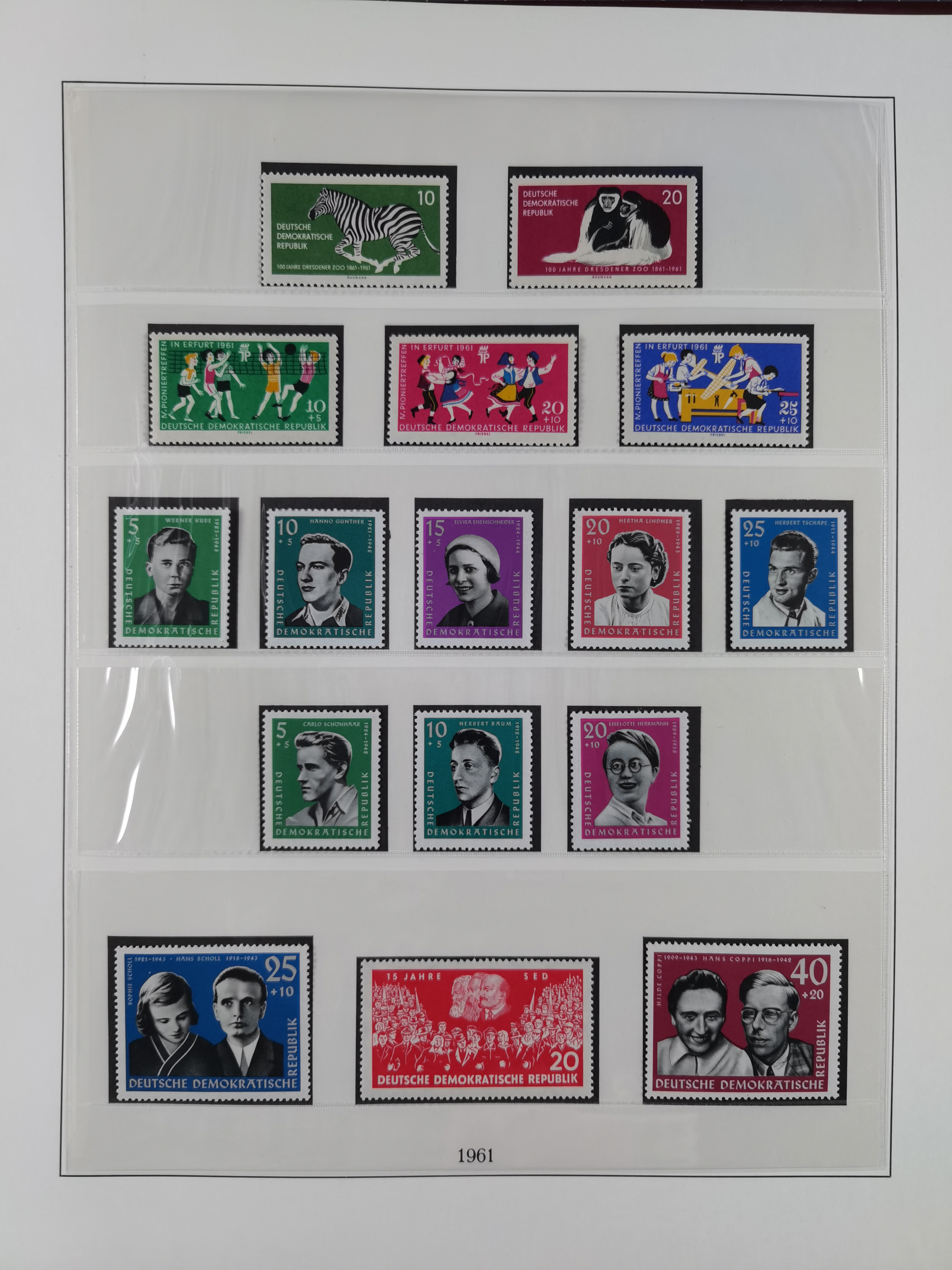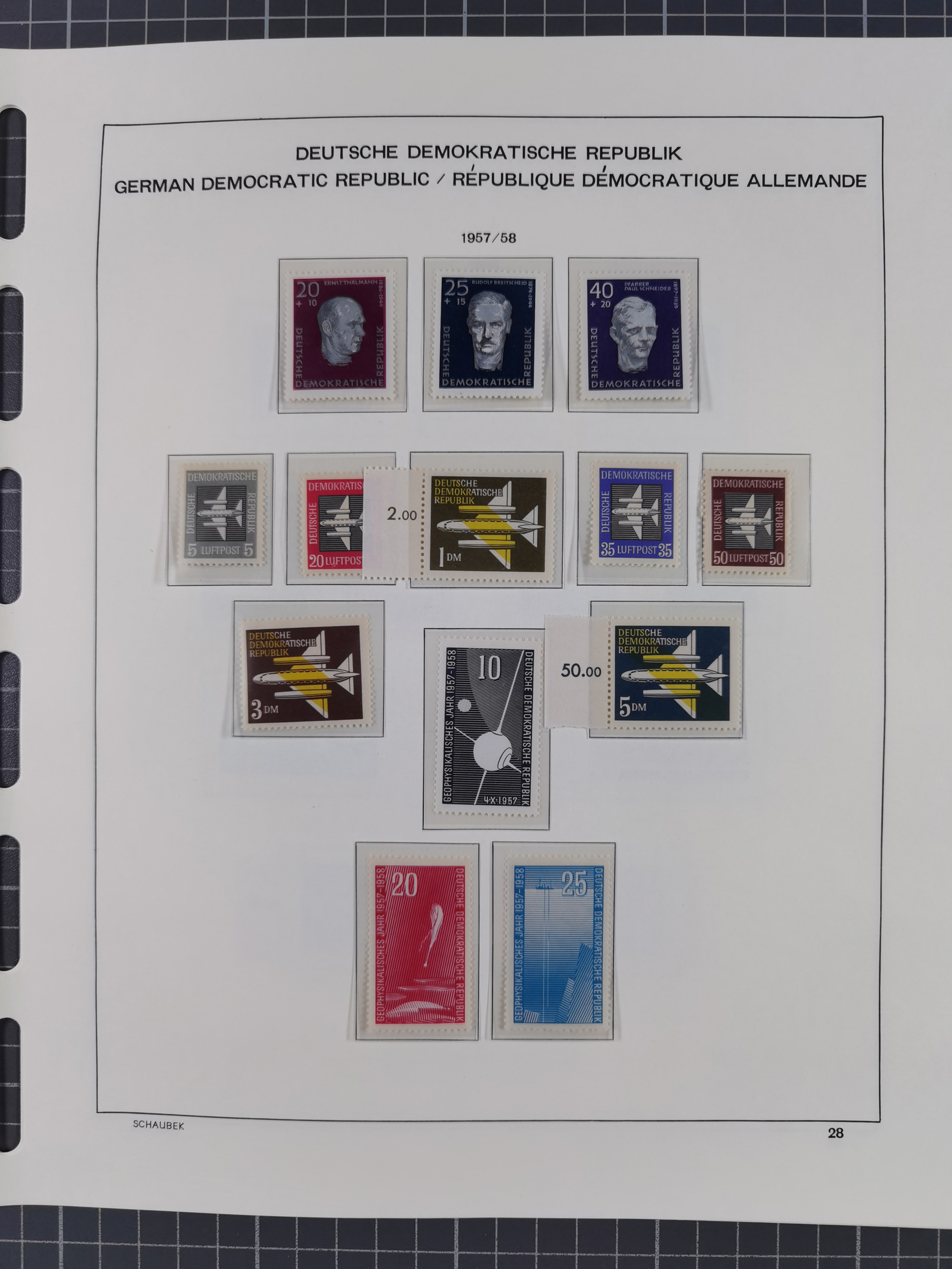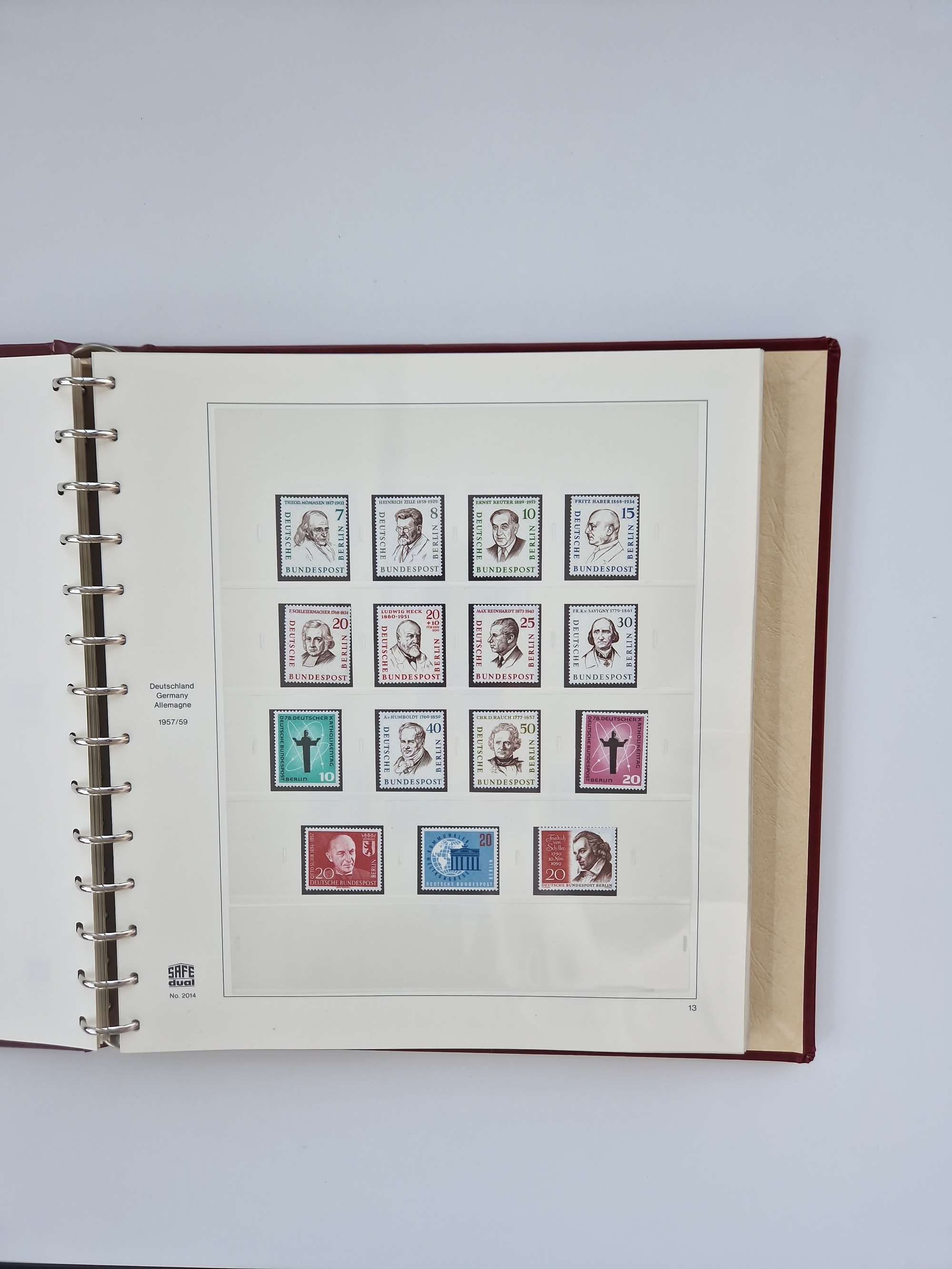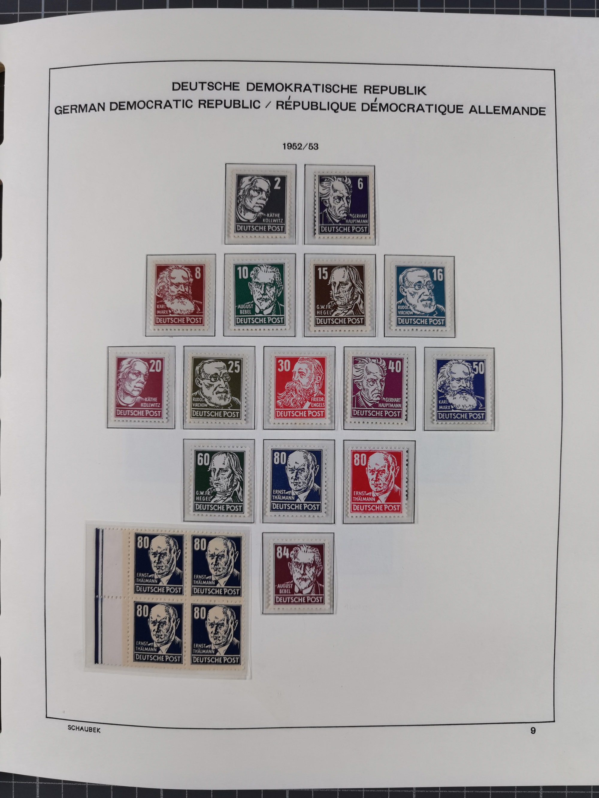 1948/90, in den Hauptnummern bis 1960 komplette postfrische Sammlungen Berlin 1948-90 inkl. Schwarzaufdruck, Rotaufdruck sign. Dub und Block 1, Bundesrepublik 1949-72 inkl. Posthornsatz, sowie DDR 1949-71 inkl. ausgiebigen Teilen Zusammendrucke, es fehlen bei den späten modernen Ausgaben teils einzelne Werte oder Sätze, gute Erhaltung, Alben mit Lagerspuren, in 11 Vordruckalben