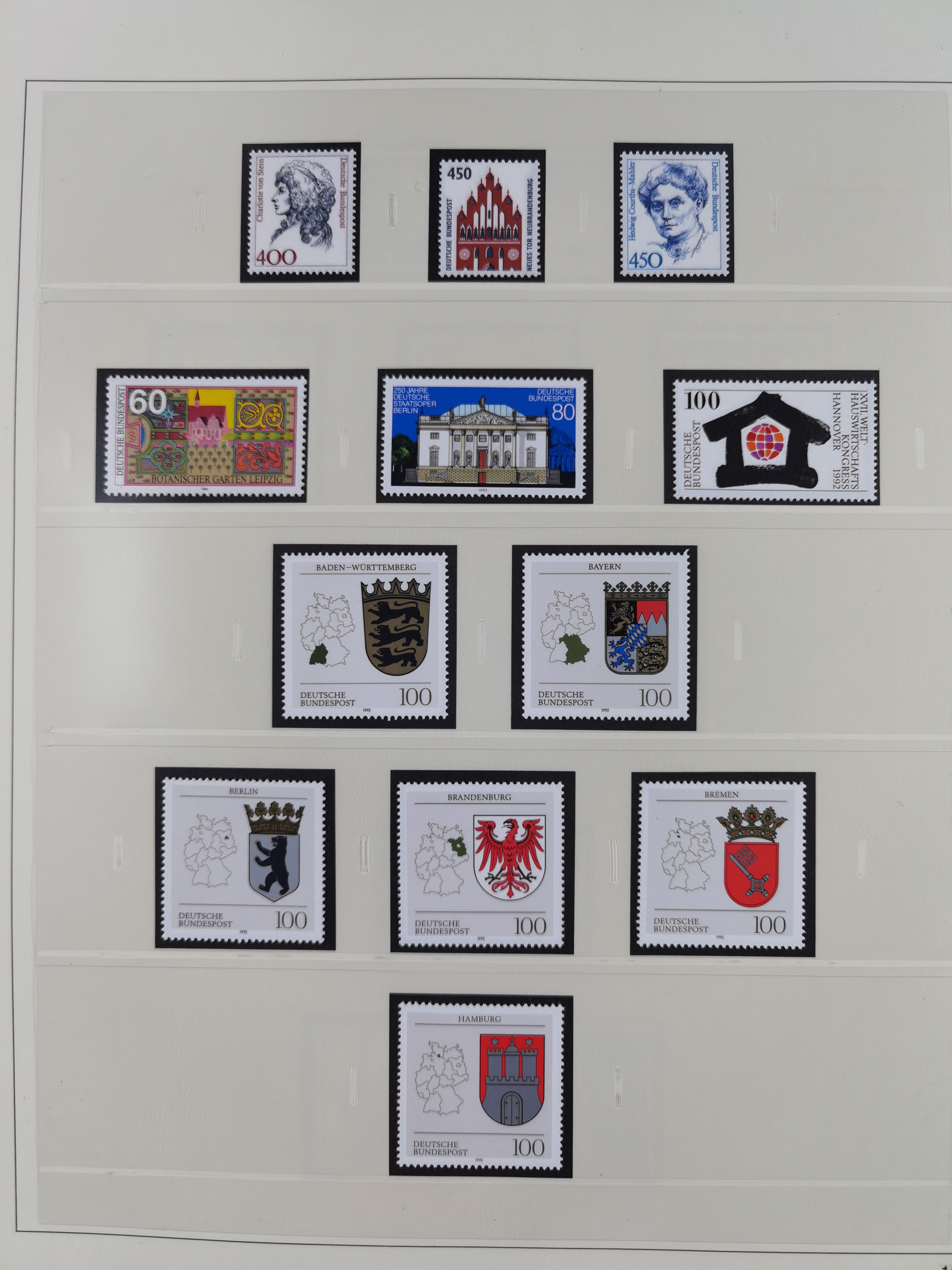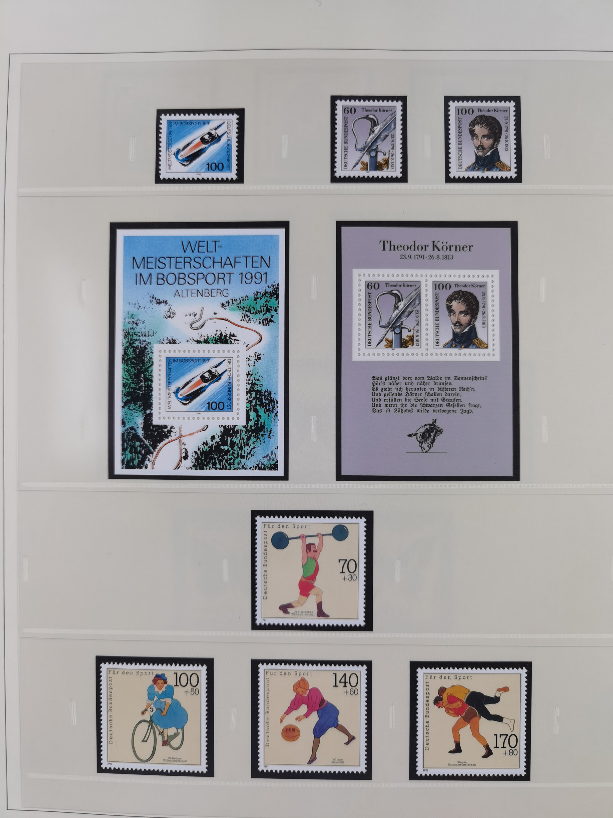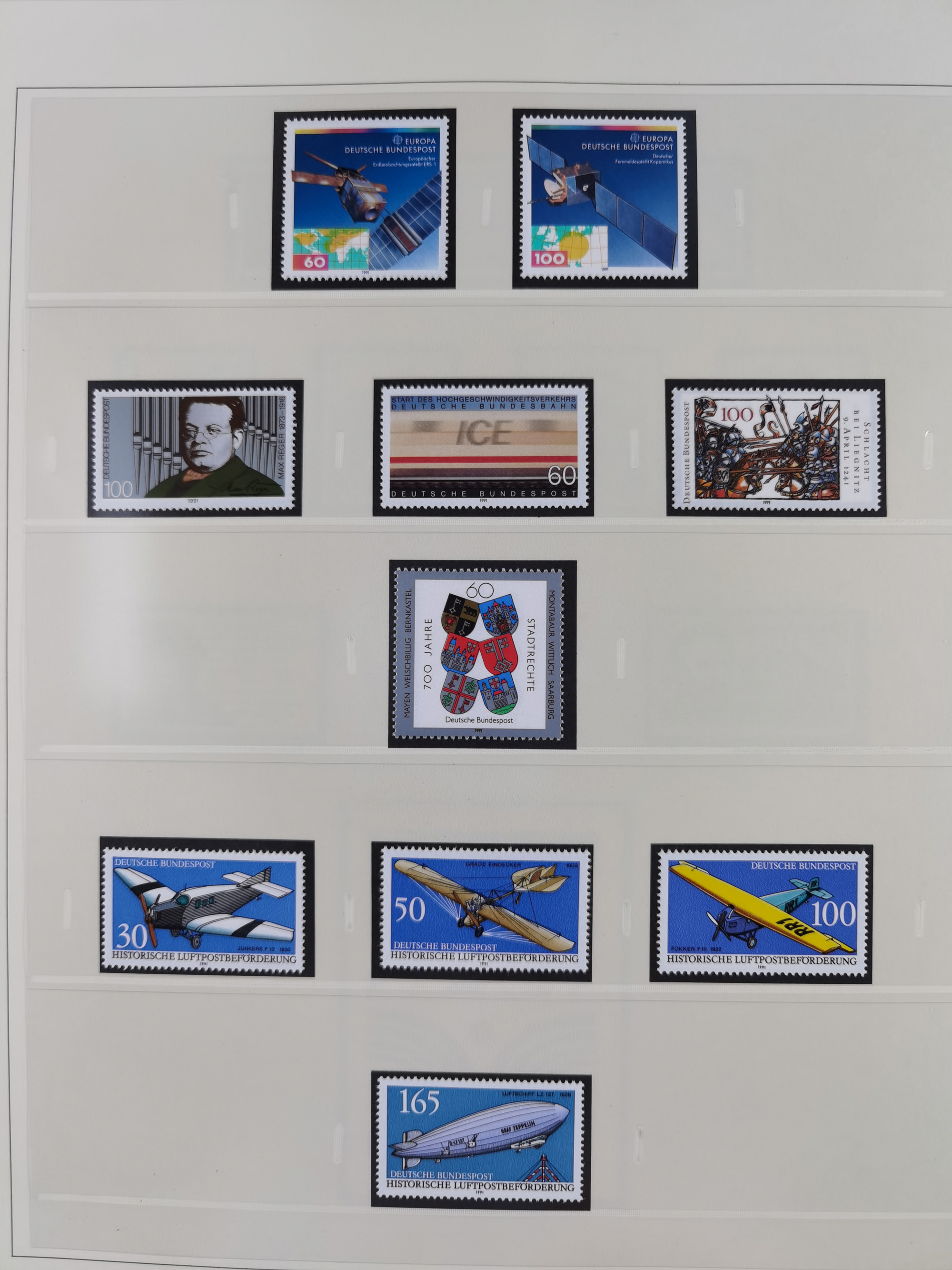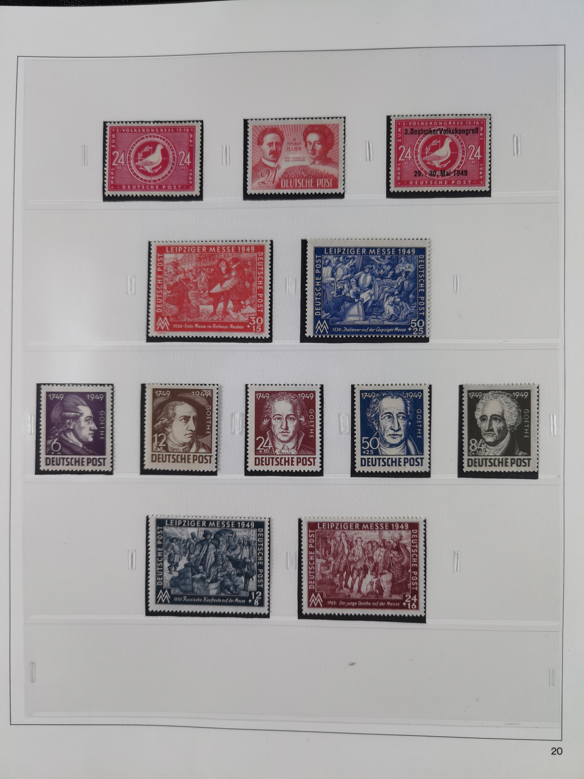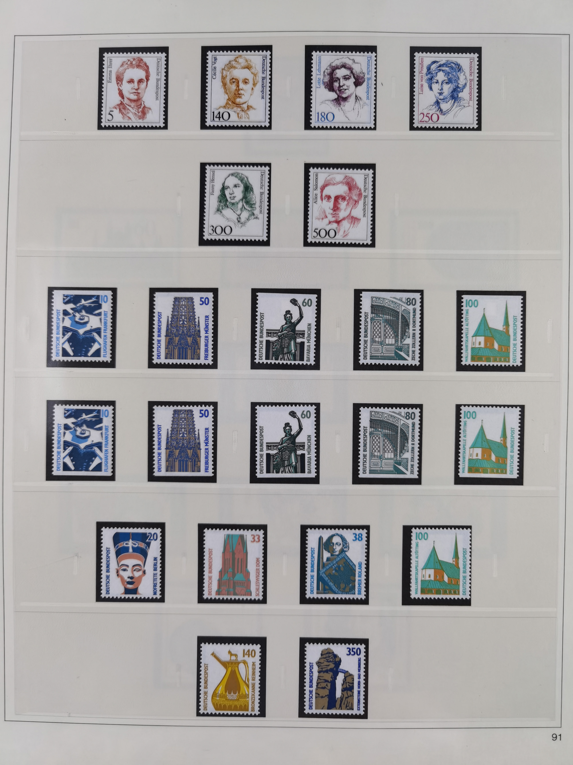 1948/90, in den Hauptnummern bis 1960 komplette postfrische Sammlungen Berlin 1948-90 inkl. Schwarzaufdruck, Rotaufdruck sign. Dub und Block 1, Bundesrepublik 1949-72 inkl. Posthornsatz, sowie DDR 1949-71 inkl. ausgiebigen Teilen Zusammendrucke, es fehlen bei den späten modernen Ausgaben teils einzelne Werte oder Sätze, gute Erhaltung, Alben mit Lagerspuren, in 11 Vordruckalben