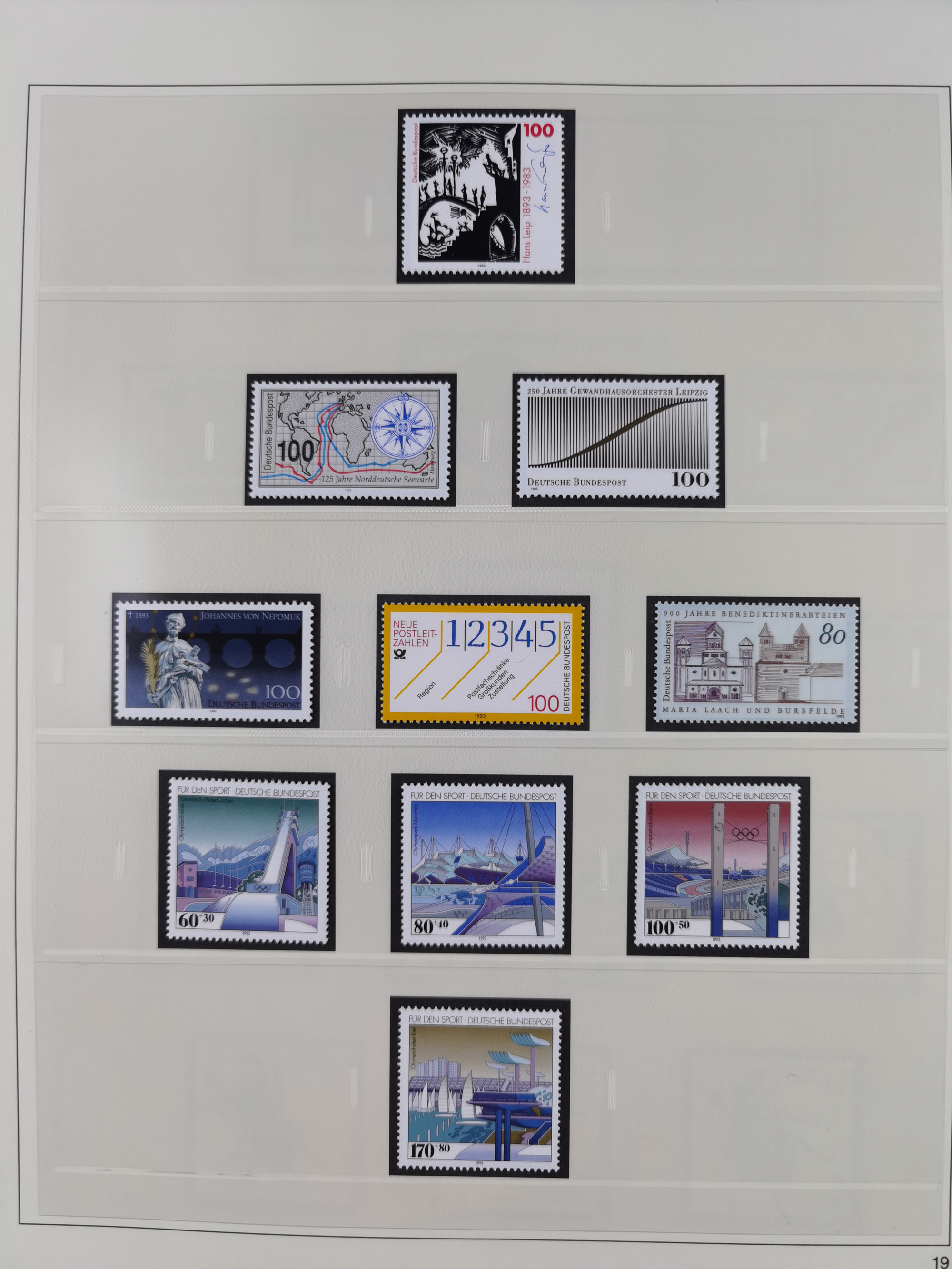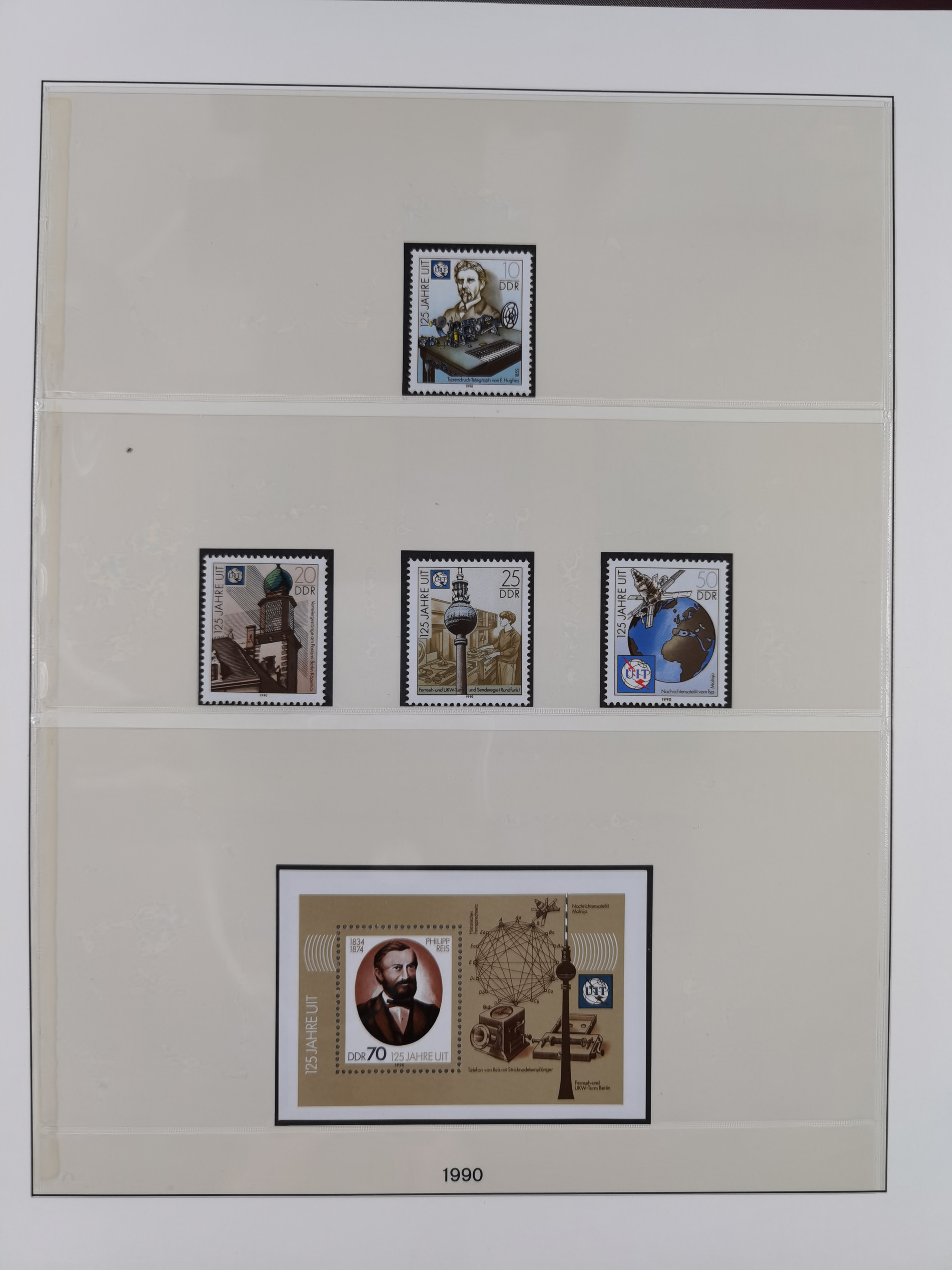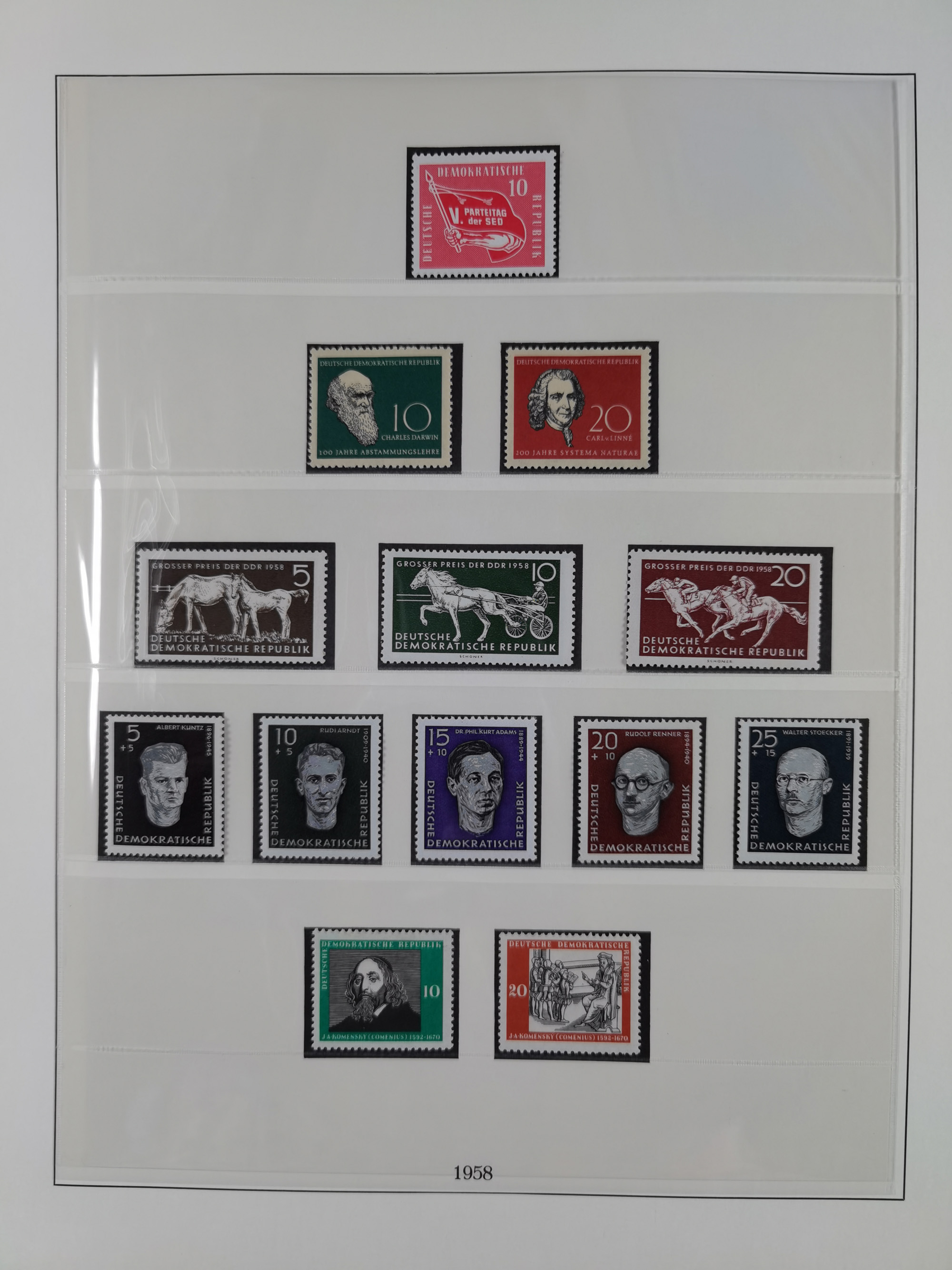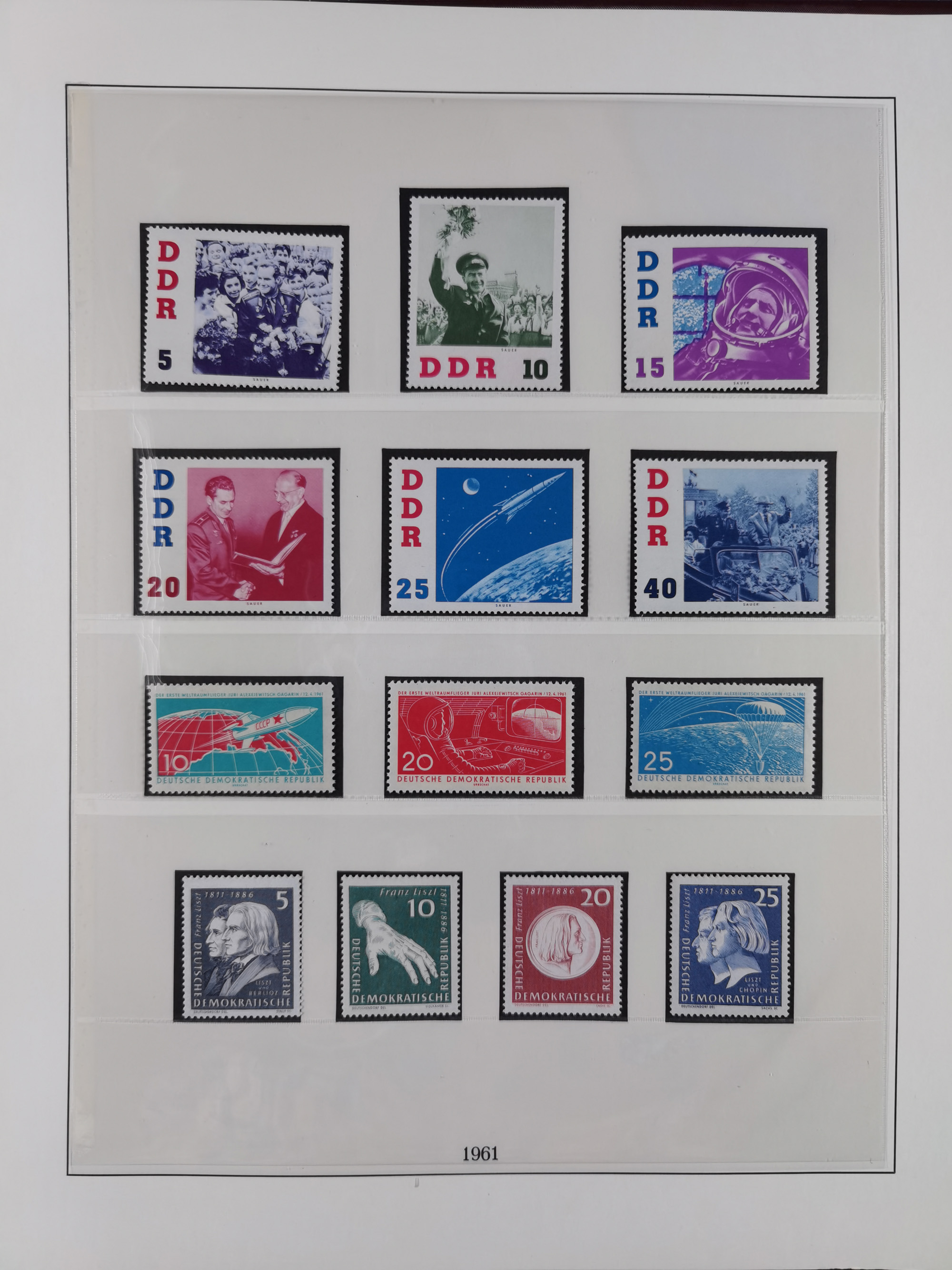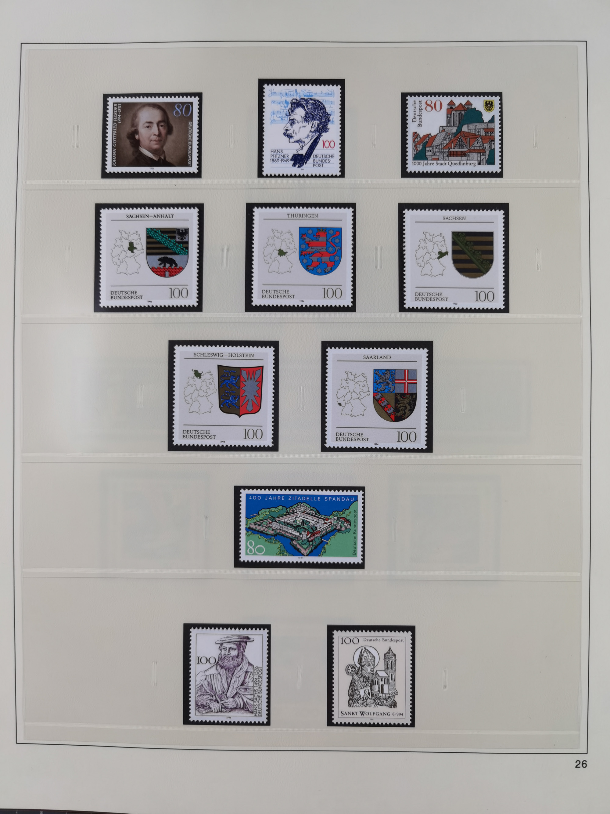 1948/90, in den Hauptnummern bis 1960 komplette postfrische Sammlungen Berlin 1948-90 inkl. Schwarzaufdruck, Rotaufdruck sign. Dub und Block 1, Bundesrepublik 1949-72 inkl. Posthornsatz, sowie DDR 1949-71 inkl. ausgiebigen Teilen Zusammendrucke, es fehlen bei den späten modernen Ausgaben teils einzelne Werte oder Sätze, gute Erhaltung, Alben mit Lagerspuren, in 11 Vordruckalben