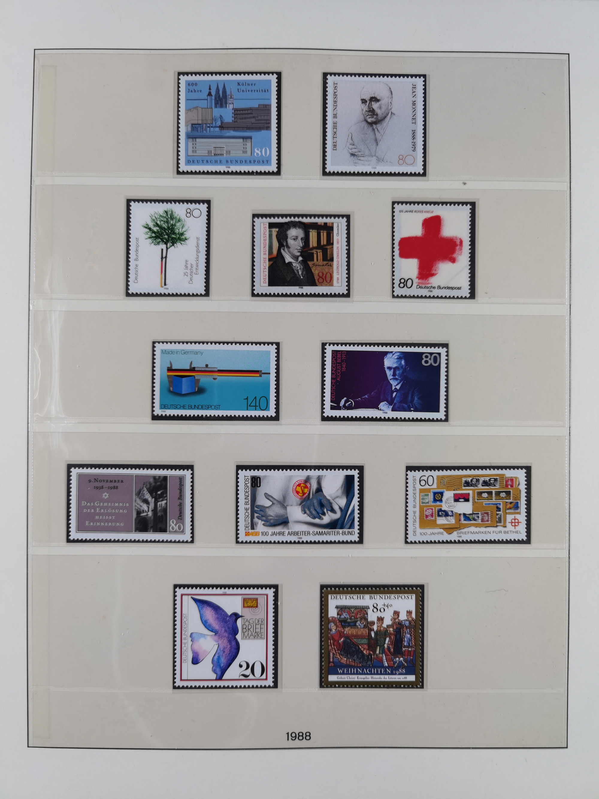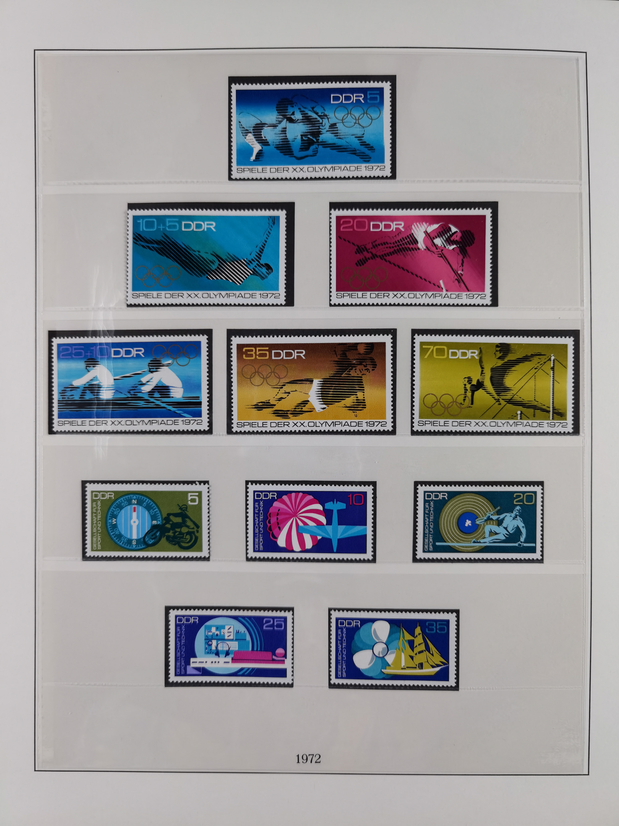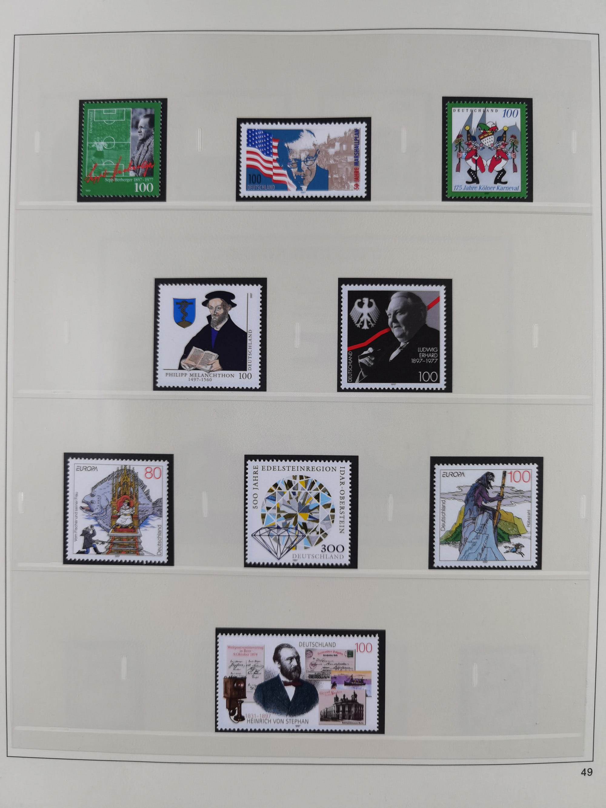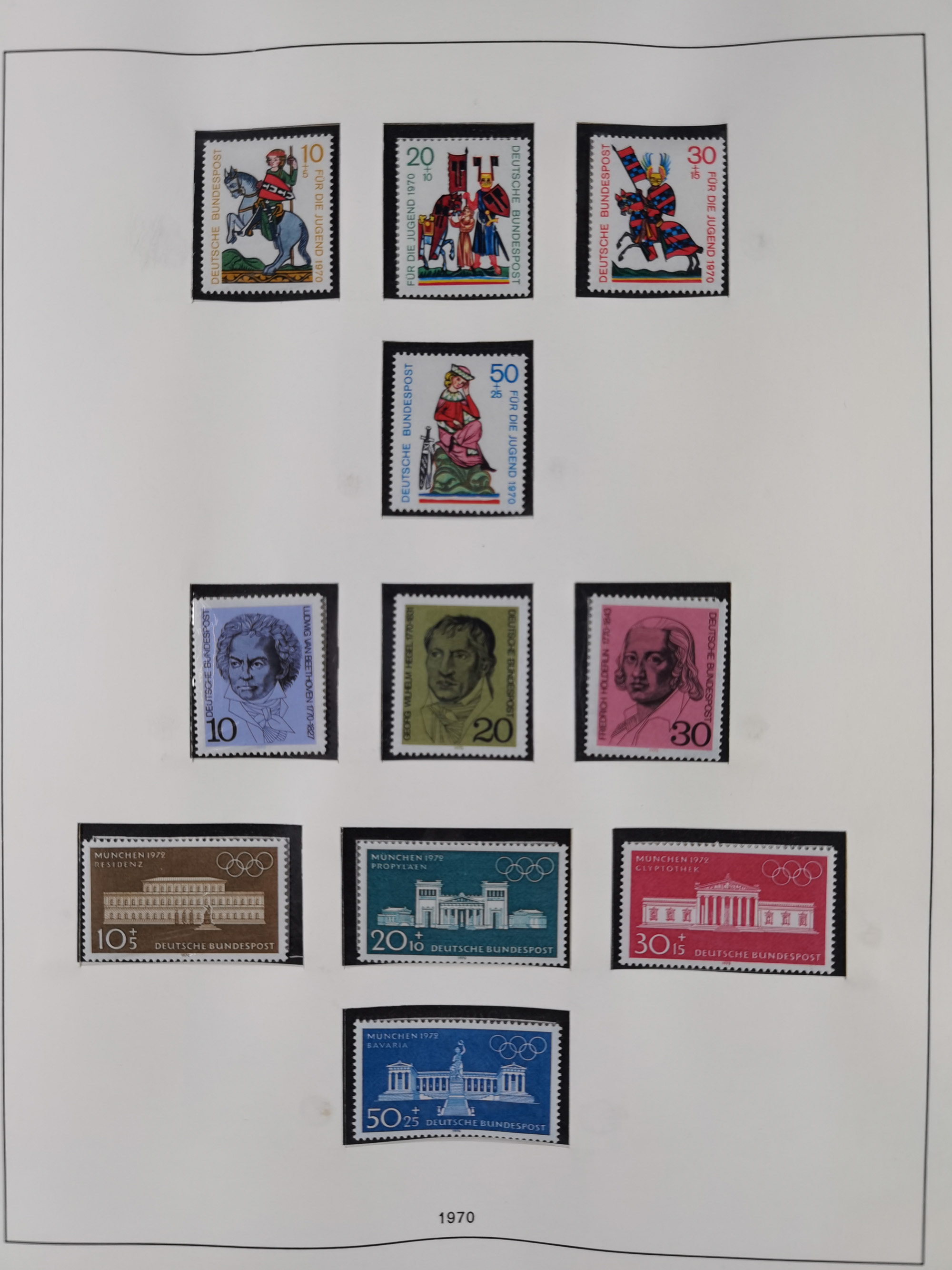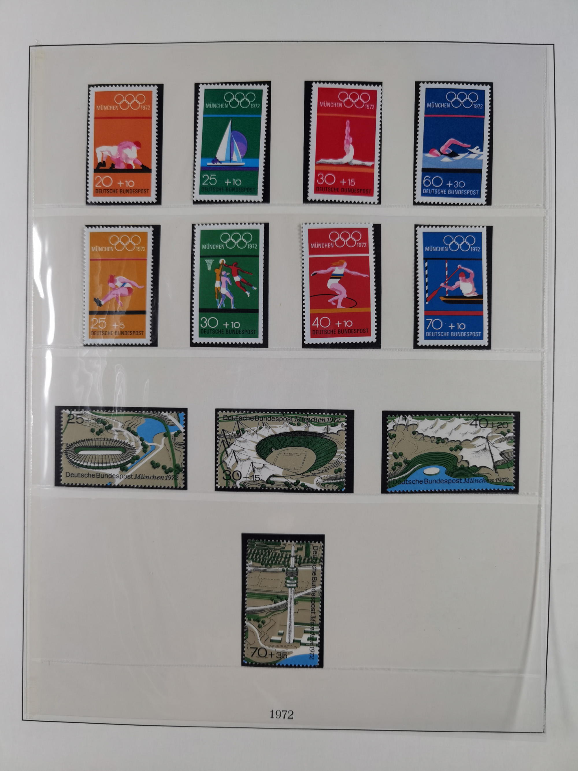 1948/90, in den Hauptnummern bis 1960 komplette postfrische Sammlungen Berlin 1948-90 inkl. Schwarzaufdruck, Rotaufdruck sign. Dub und Block 1, Bundesrepublik 1949-72 inkl. Posthornsatz, sowie DDR 1949-71 inkl. ausgiebigen Teilen Zusammendrucke, es fehlen bei den späten modernen Ausgaben teils einzelne Werte oder Sätze, gute Erhaltung, Alben mit Lagerspuren, in 11 Vordruckalben