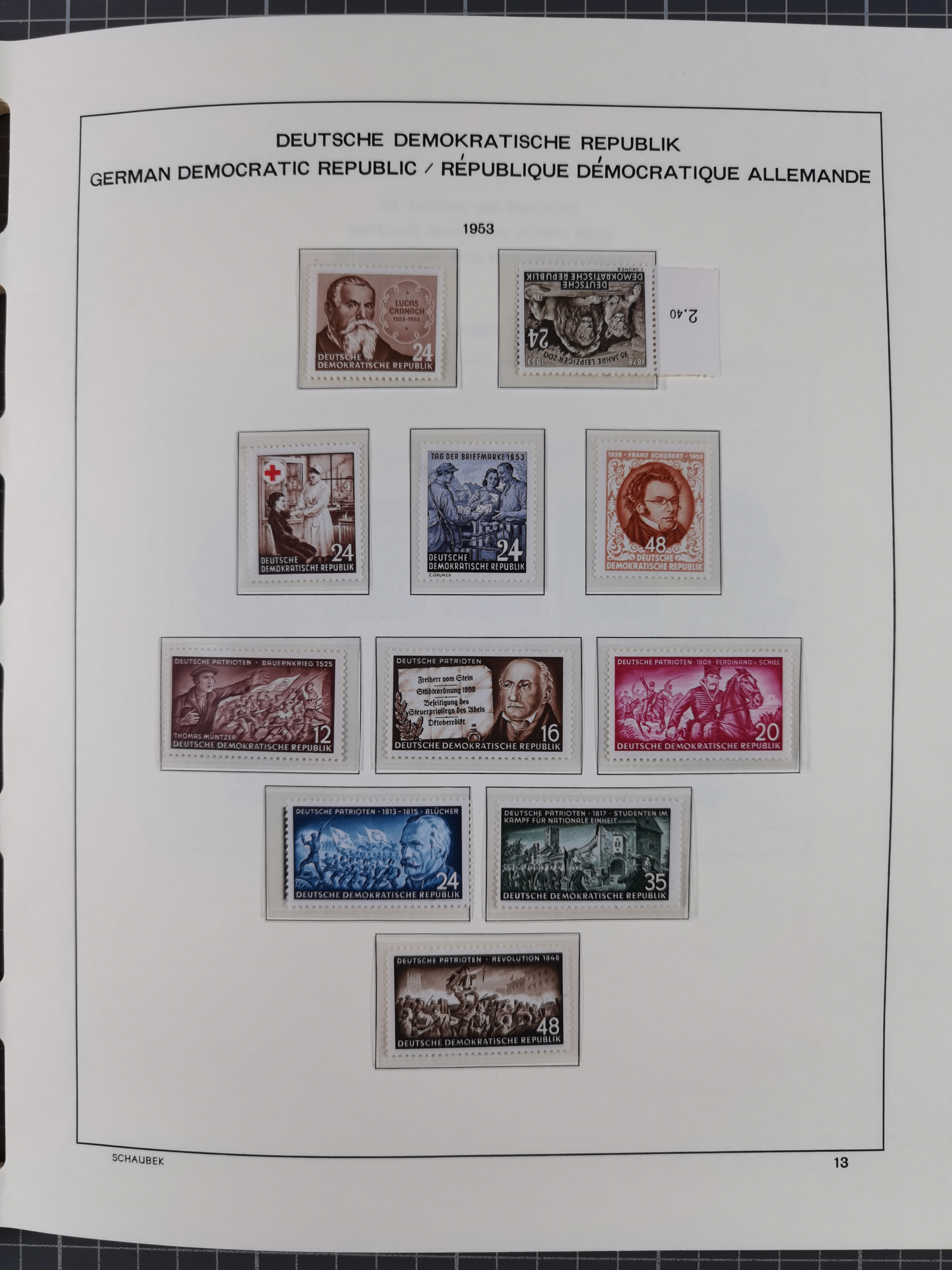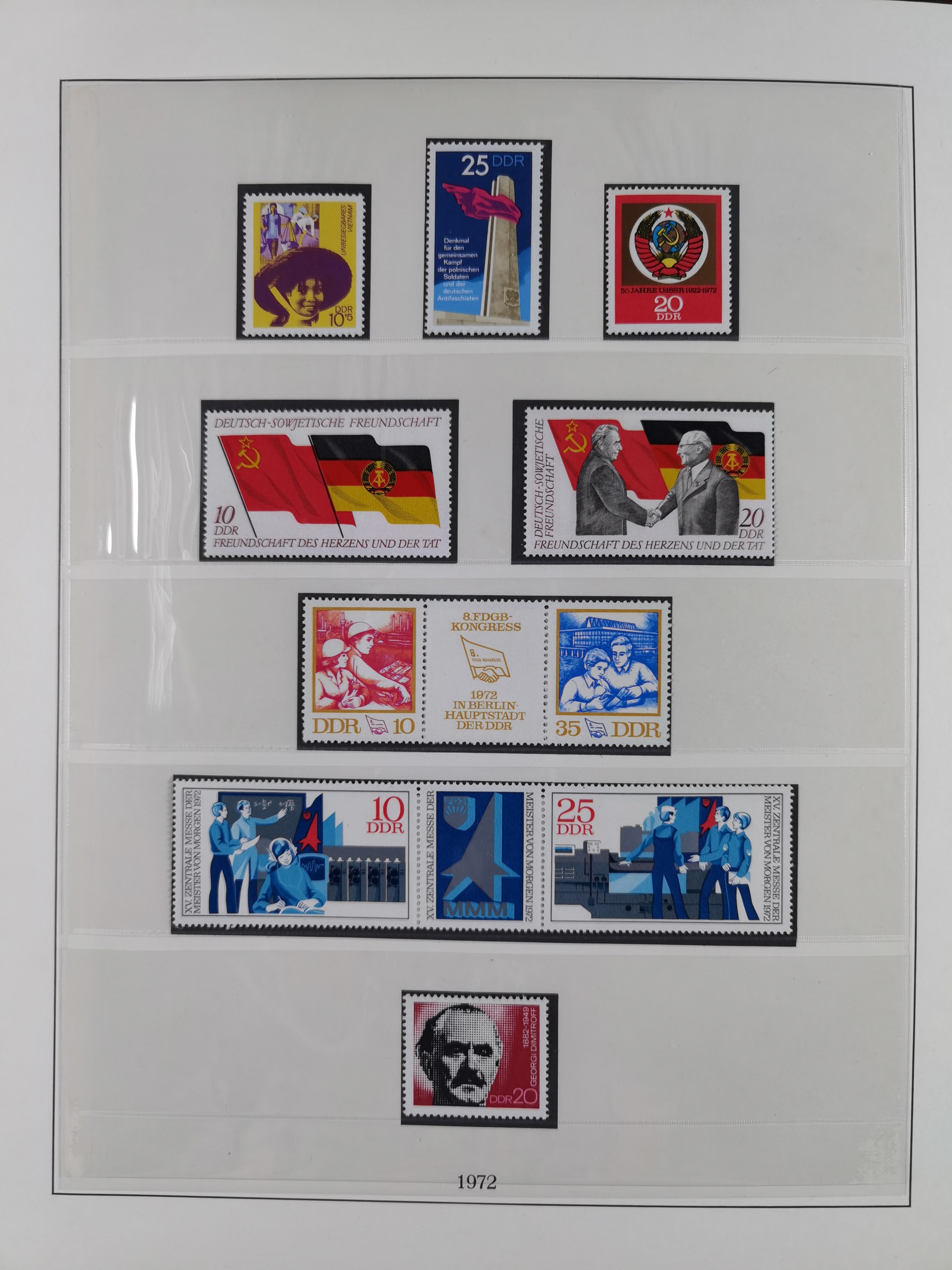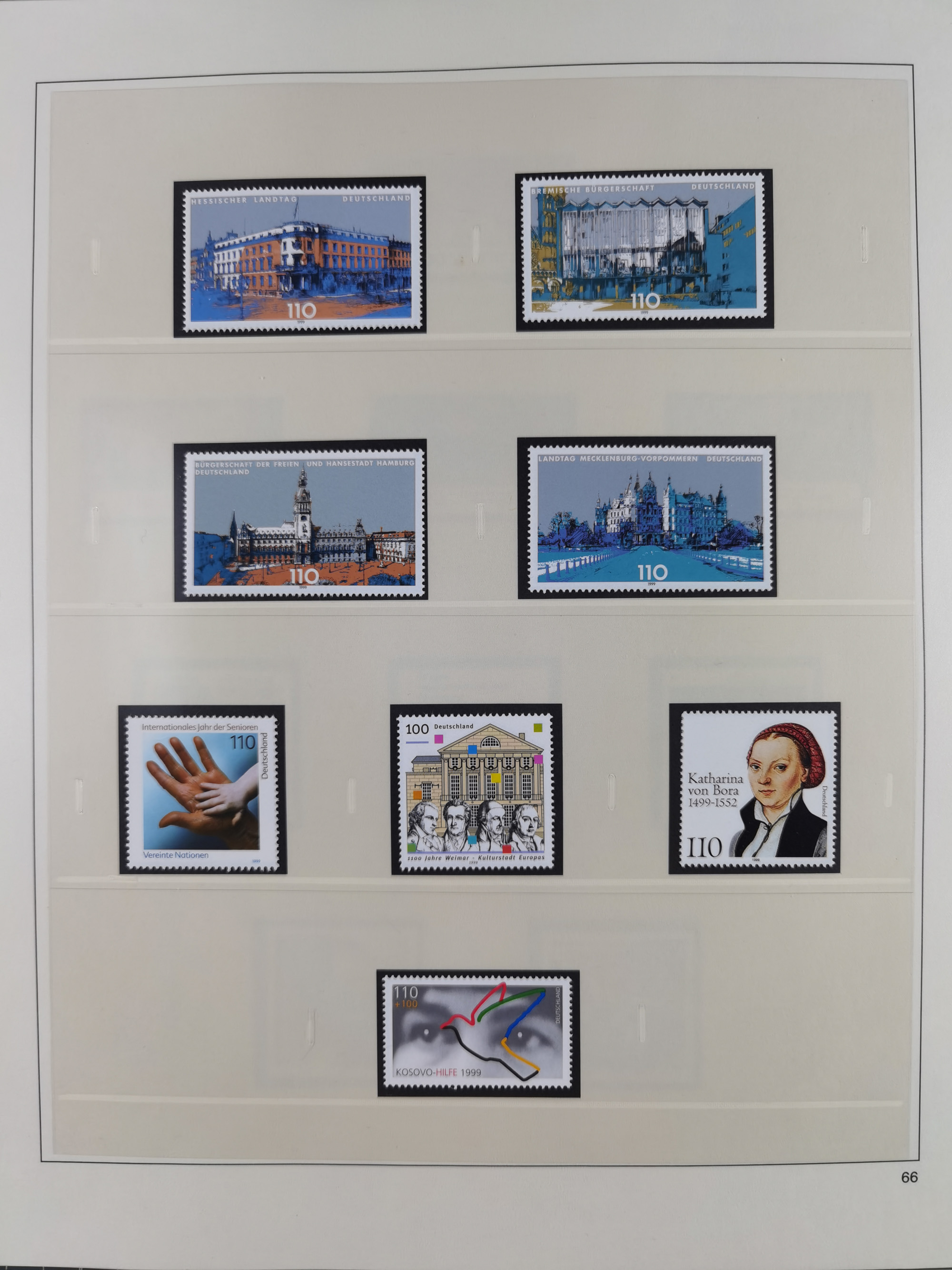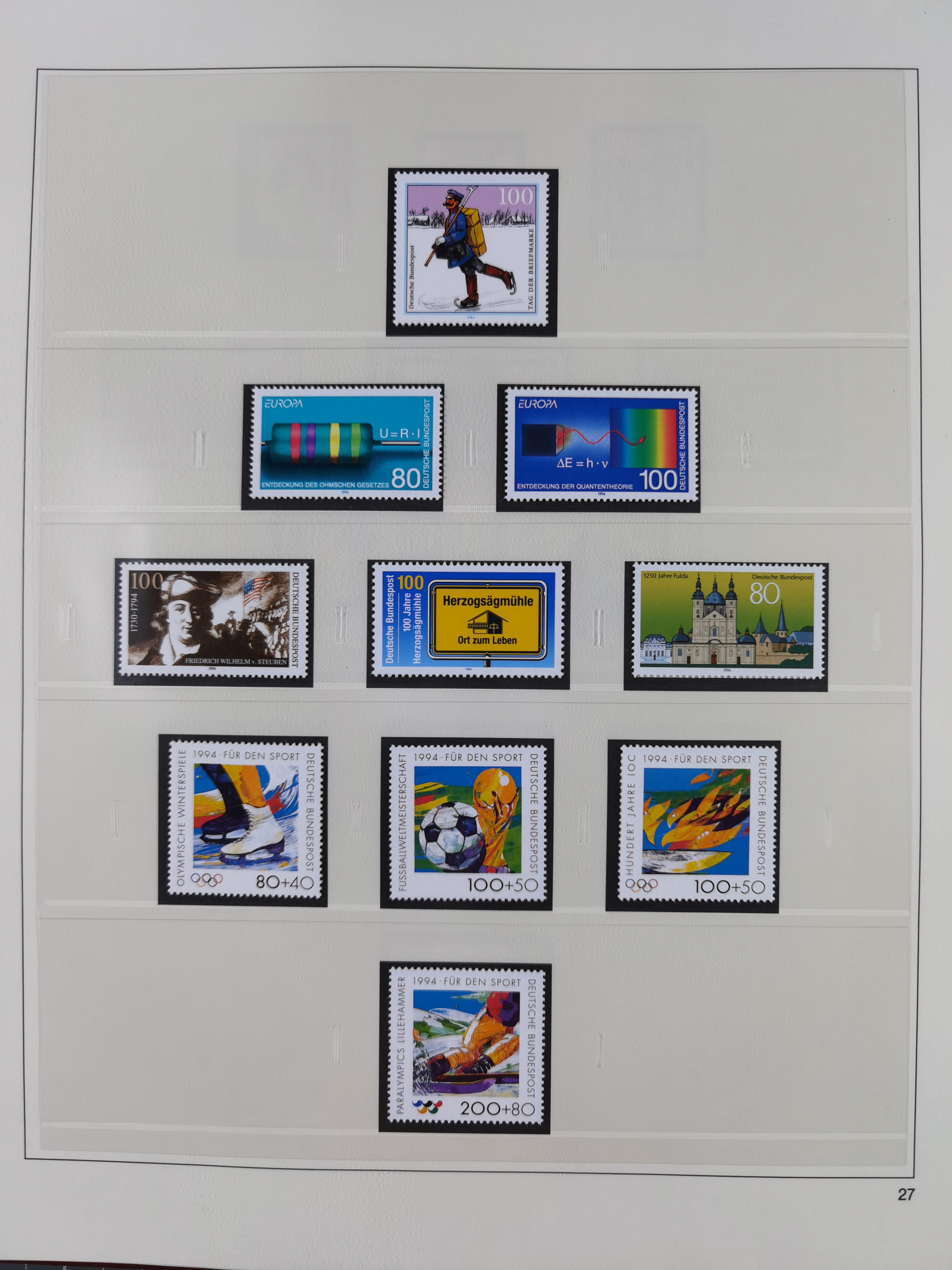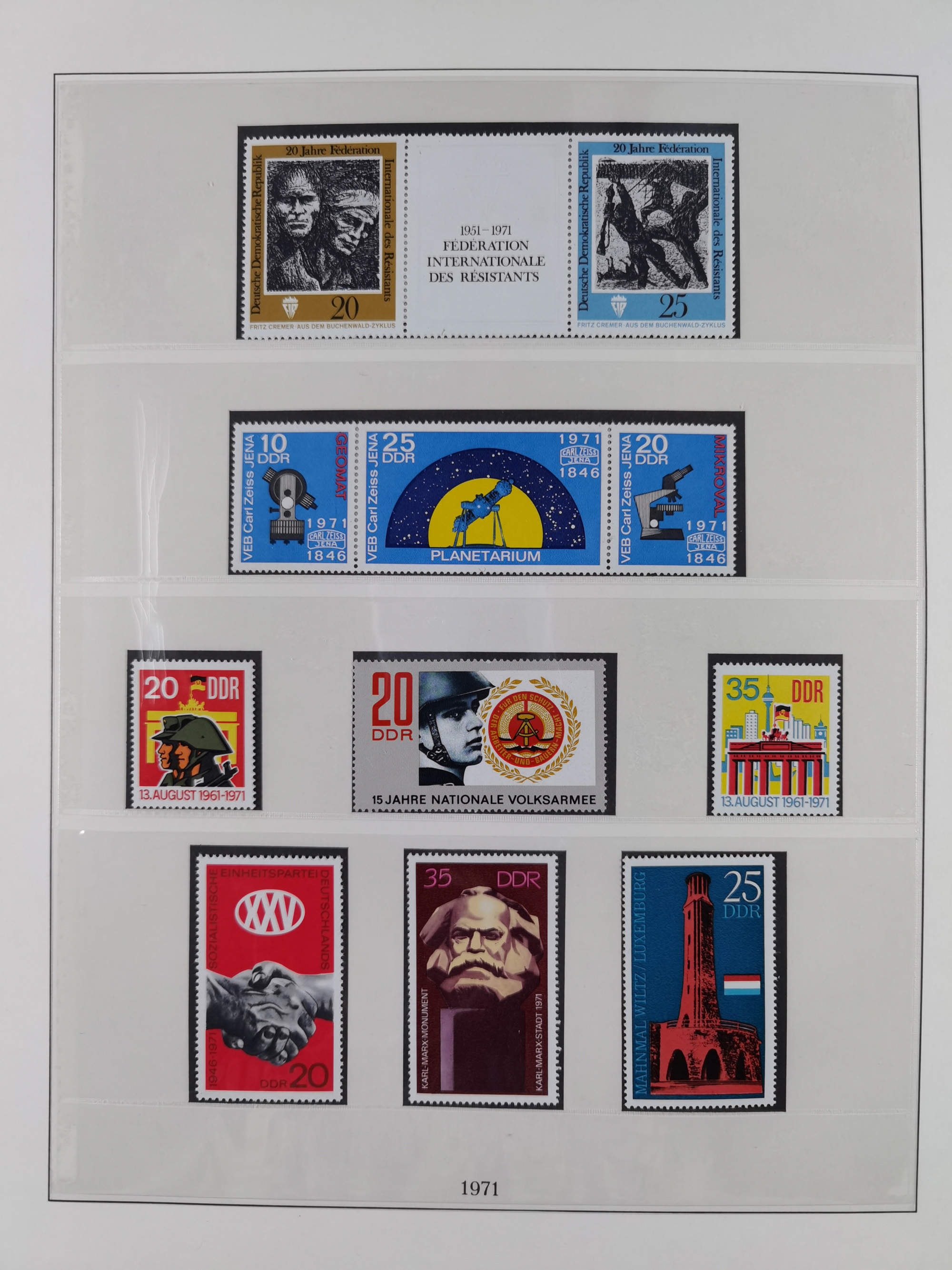 1948/90, in den Hauptnummern bis 1960 komplette postfrische Sammlungen Berlin 1948-90 inkl. Schwarzaufdruck, Rotaufdruck sign. Dub und Block 1, Bundesrepublik 1949-72 inkl. Posthornsatz, sowie DDR 1949-71 inkl. ausgiebigen Teilen Zusammendrucke, es fehlen bei den späten modernen Ausgaben teils einzelne Werte oder Sätze, gute Erhaltung, Alben mit Lagerspuren, in 11 Vordruckalben