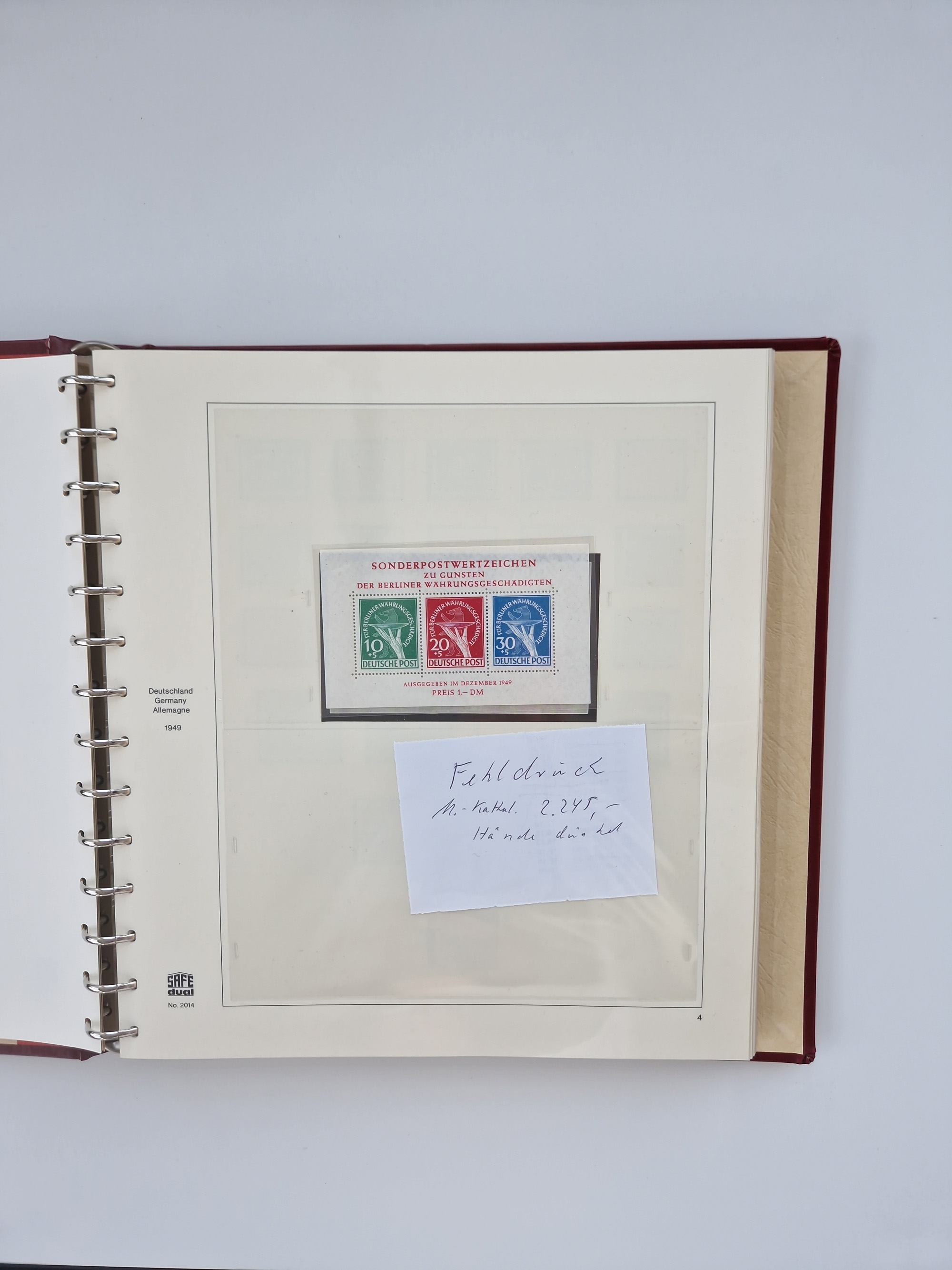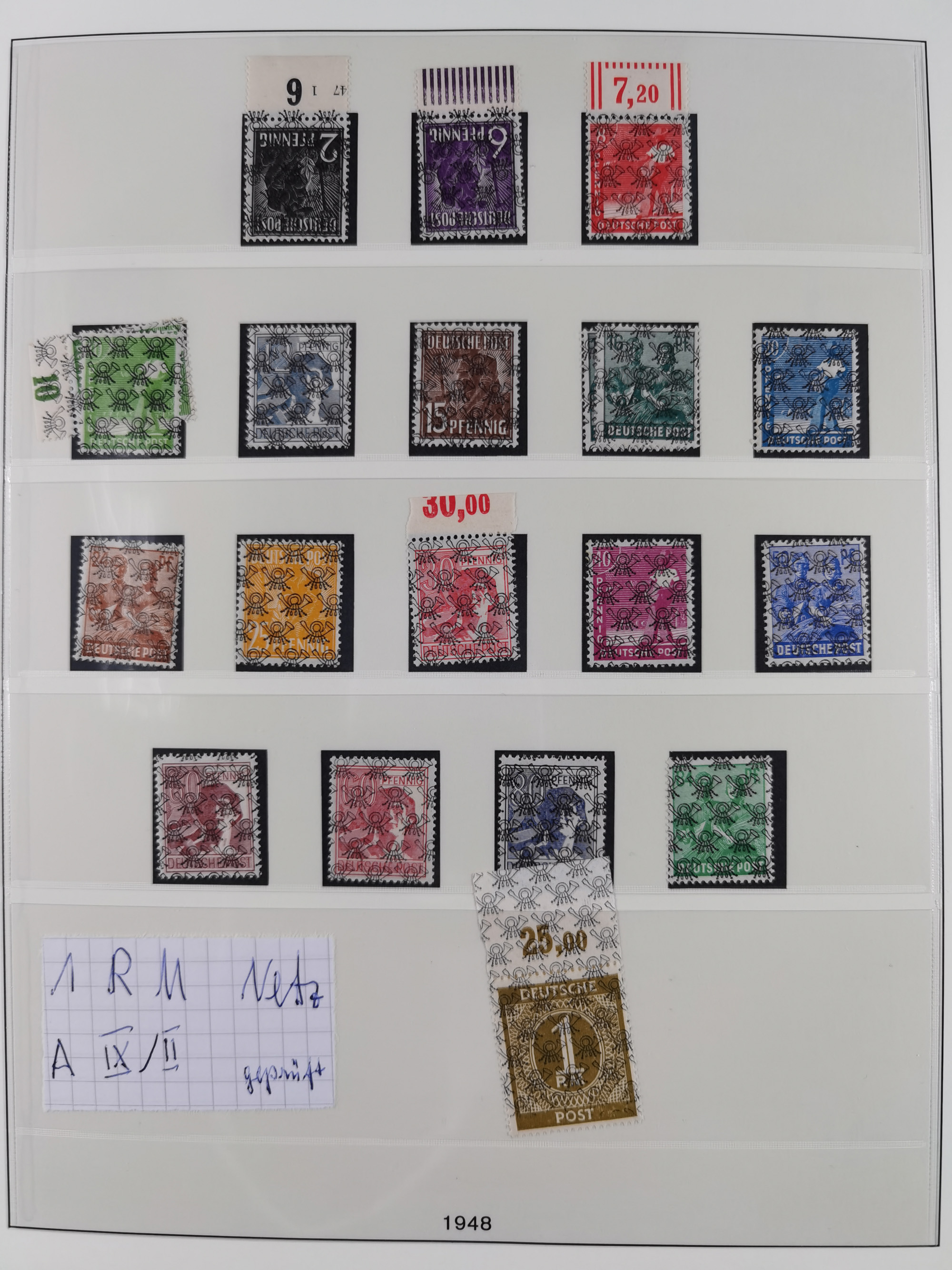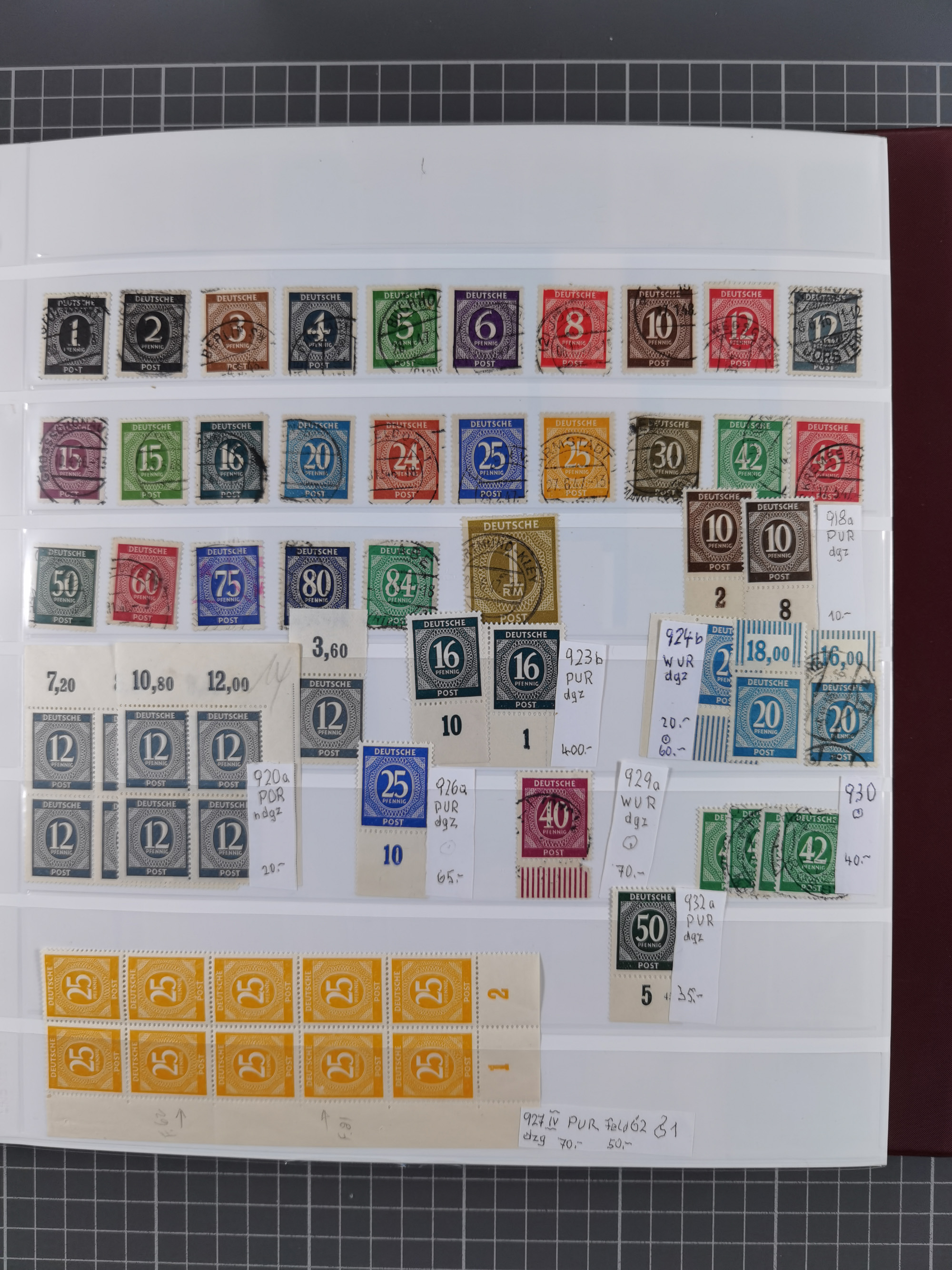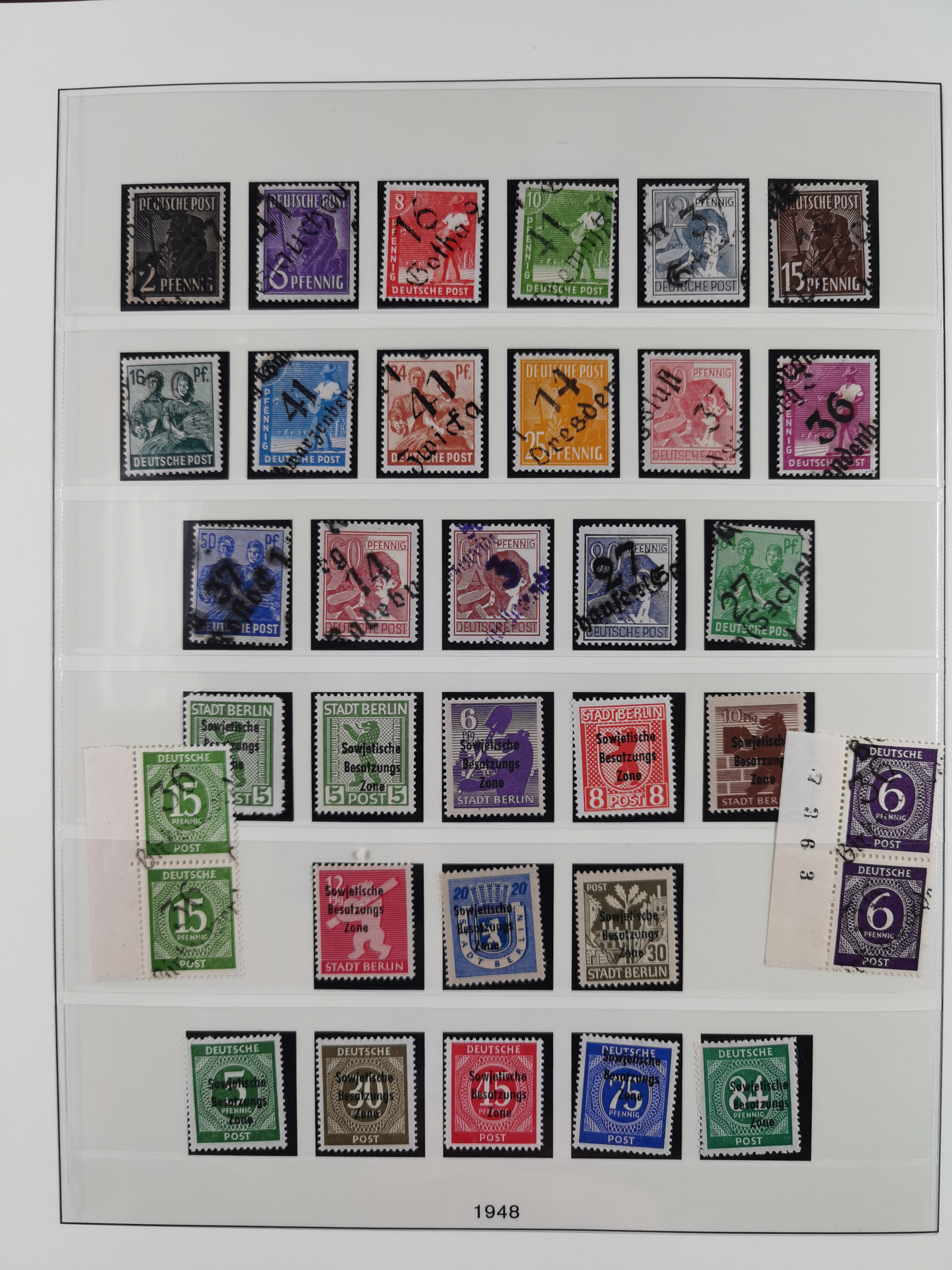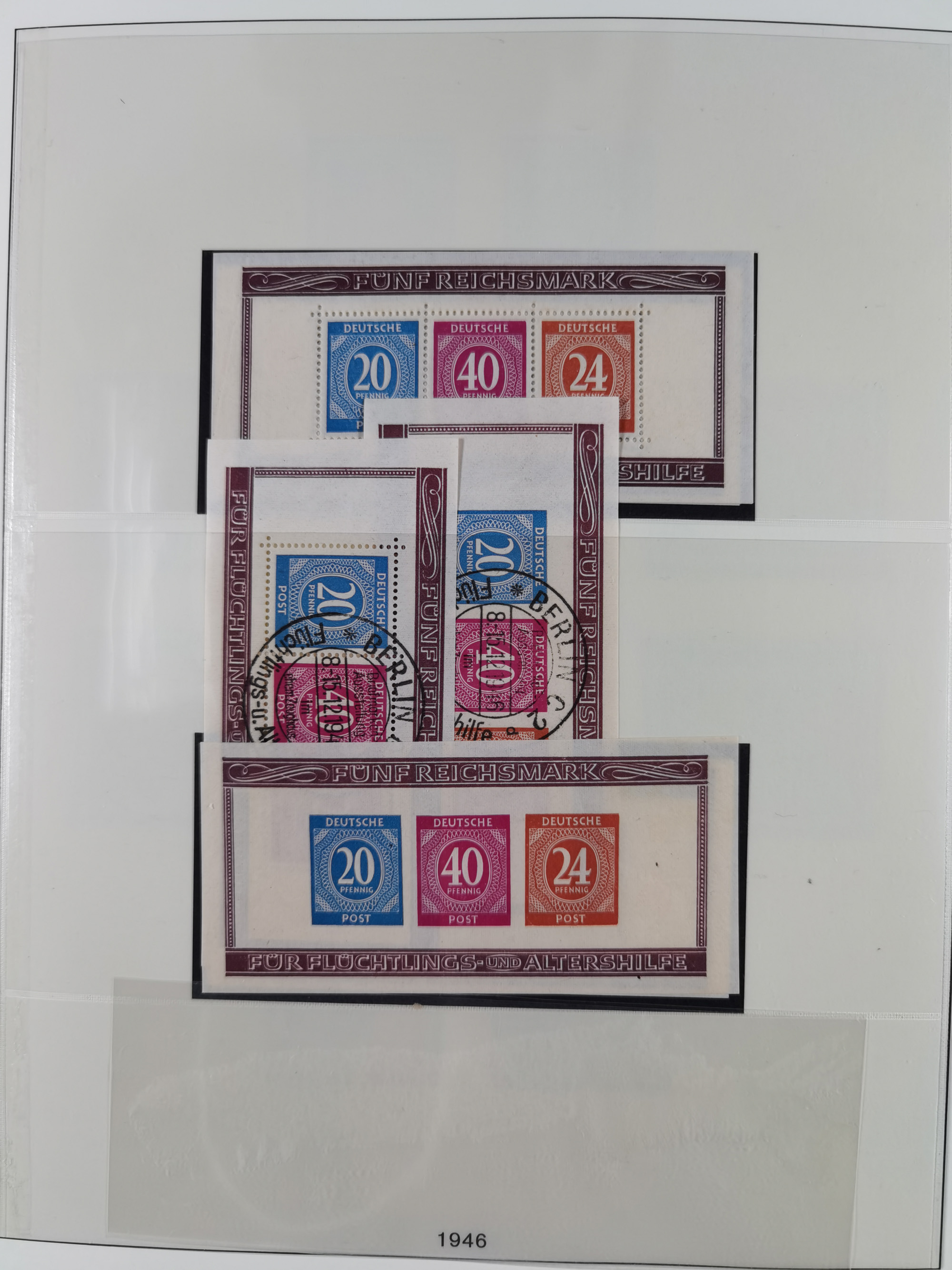 1945/50, interessanter Bestand mit fast nur besseren Sätzen, Block-Ausgaben und Briefen. Dabei u.a. SBZ Bl.1xa postfrisch (FA Ströh BPP), Bl.2t gestempelt (FA Dr. Jasch BPP) und Bl. 4ay gestempelt (FA Ströh BPP), Berlin Mi.-Nr. 1-20 gestempelt (sign. Schlegel BPP mit FA) und Bl. 1I gestempelt (FA D. Schlegel BPP), Saarland Bl.1-2 postfrisch (sign. Ney BPP), Baden Bl. 2 mit rotem SST (sign. Schlegel BPP) und Bund mit besseren Anfangsausgaben und Briefen mit u.a. Mi.-Nr. 116 Br.