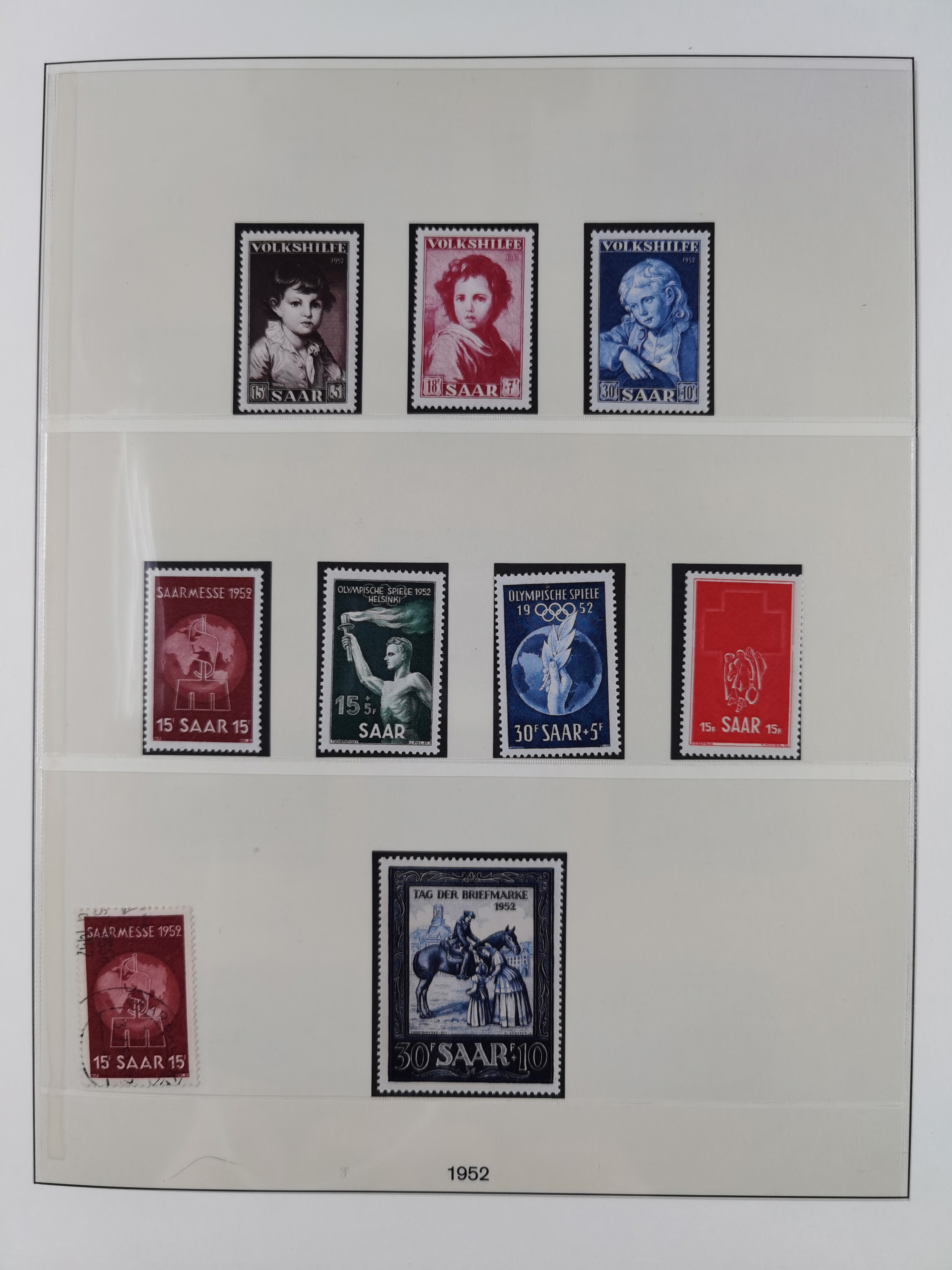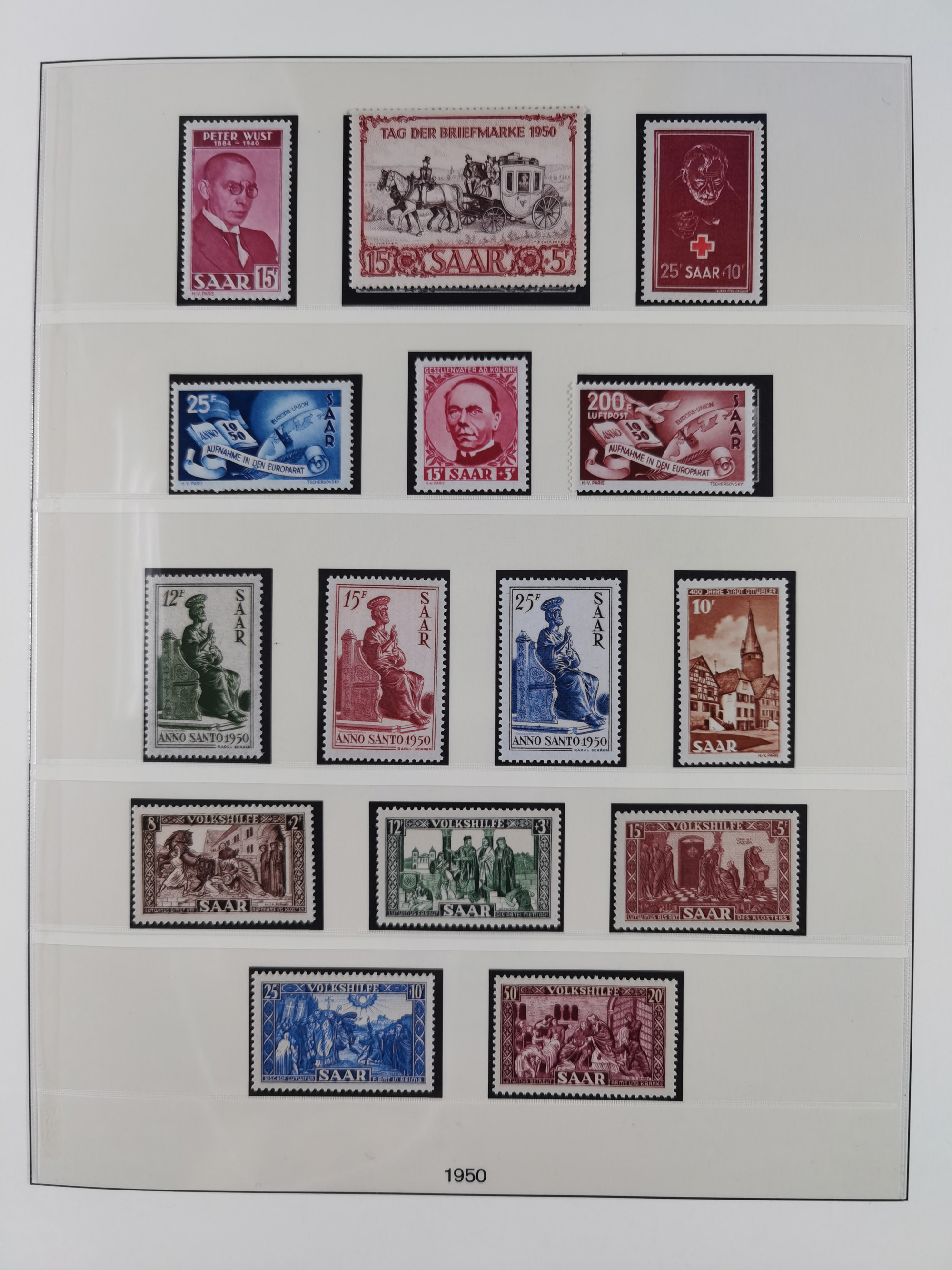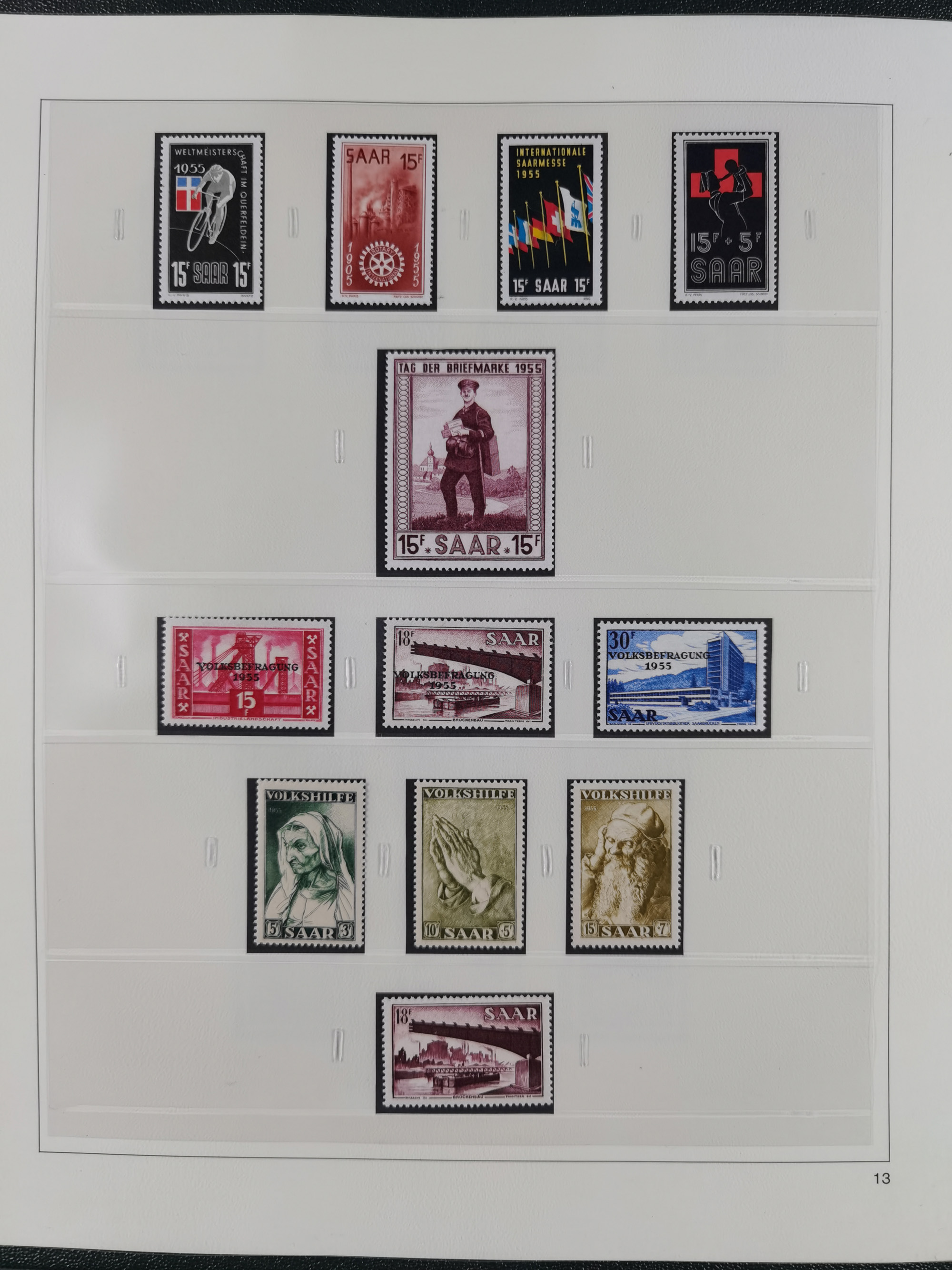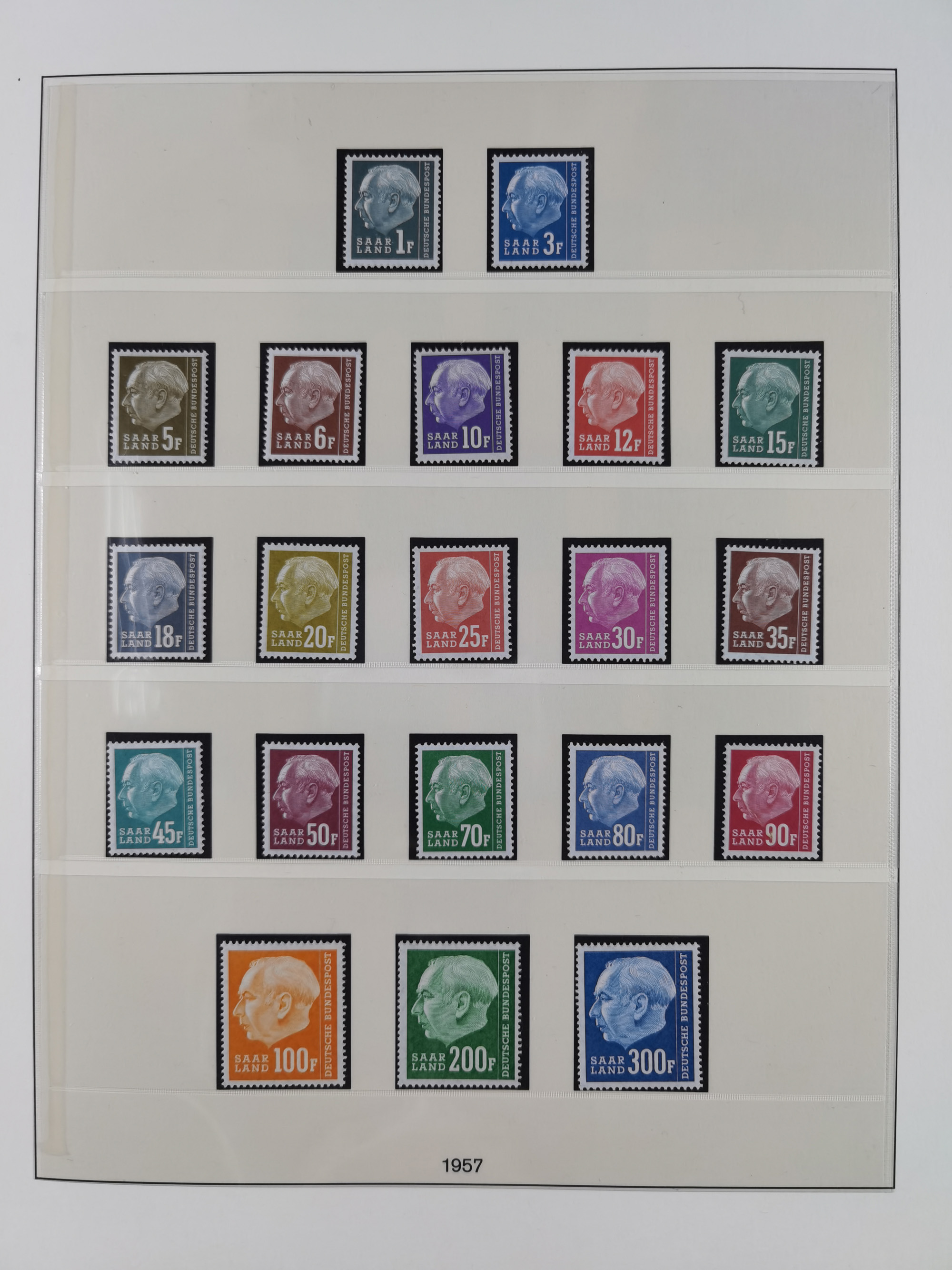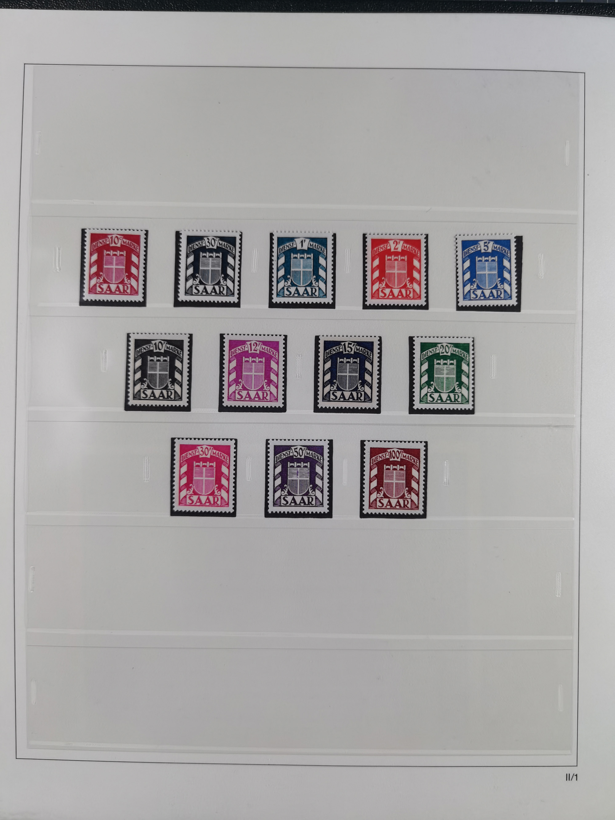1920/59, in den Hauptnummern stark überkomplette fast ausnahmslos postfrische Sammlung inkl. Dienstmarken, dabei Mi.-Nr. 1-17, 1-17IA inkl. Farben mit 14aIA, Type II 7 Werte kpl., zusätzlich diese auch mit PF A (ohne 2aIIA), 1-17III mit 16IIIOR, 18-31 mit 30L und 31L, A31-C31 (B31 ungebraucht), ferner alle Volkshilfen inkl. Madonna mit Bogenrand, sowie Saarland mit unsigniertem Urdrucksatz, Hochwasserhilfe-Blockspaar, einigen Klbg., zusätzlich gestempelt 380-83 und 409-28 OR auf Briefstücken und MH1 postfrisch/ungebraucht (etwas fleckig), gute Erhaltung, 23 (Kurz-)Befunde und Atteste Ney, Geigle, Burger und Bernhard BPP, in zwei Vordruckalben