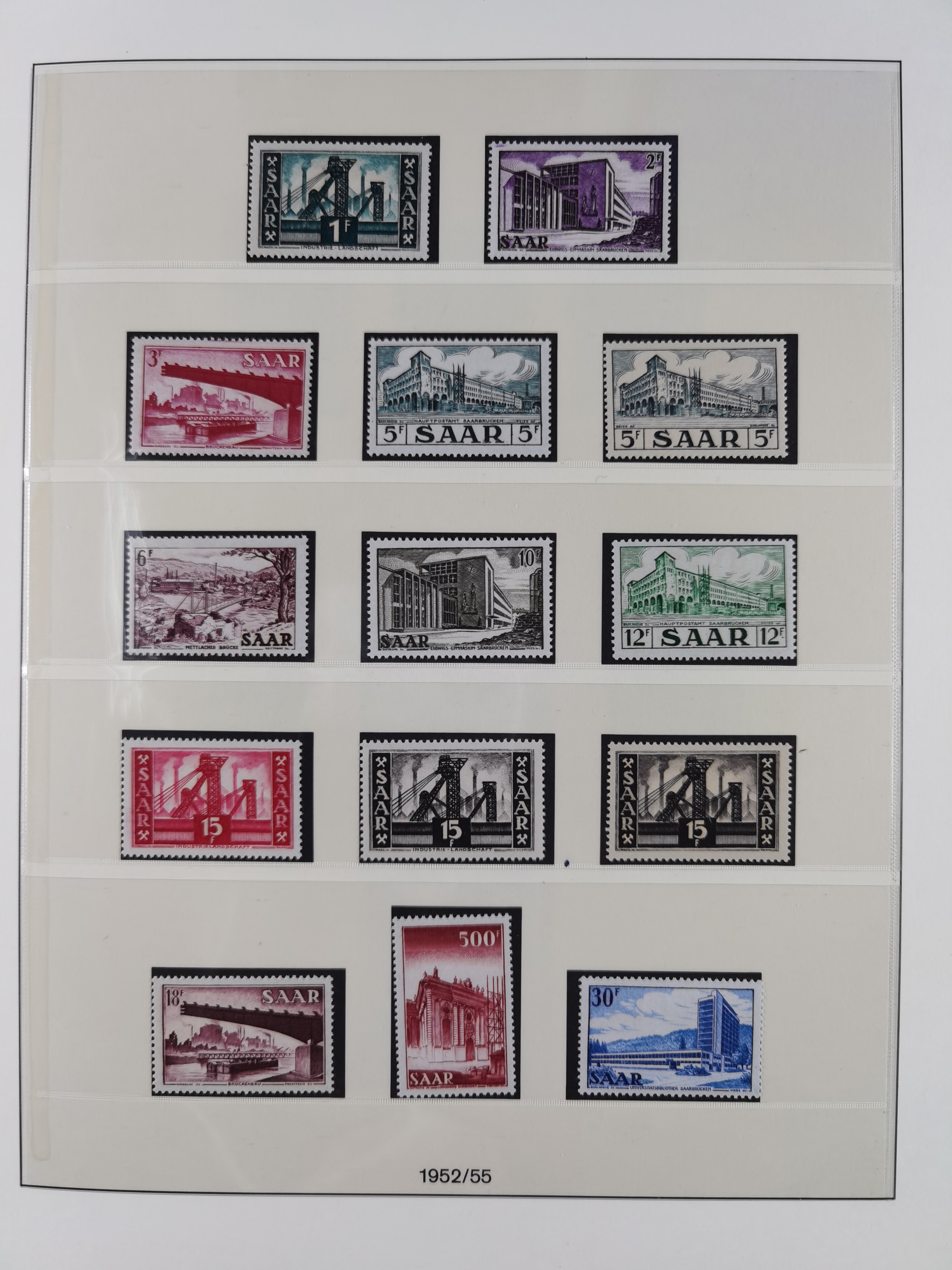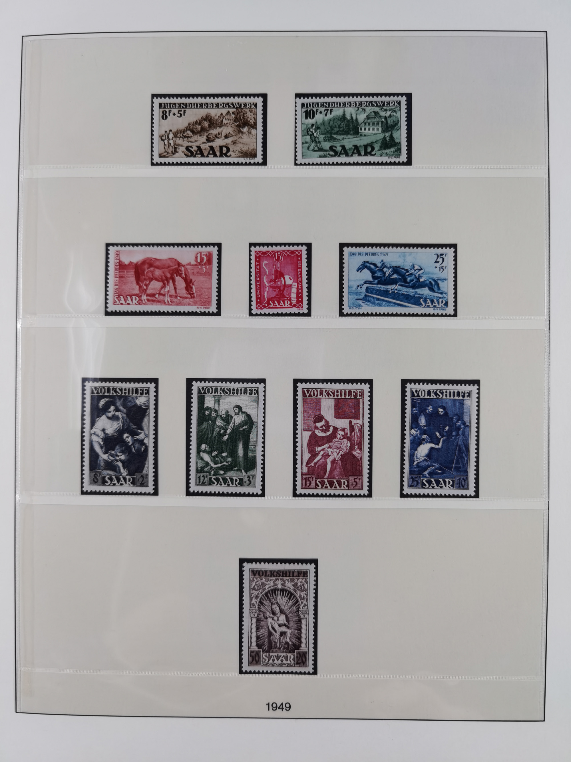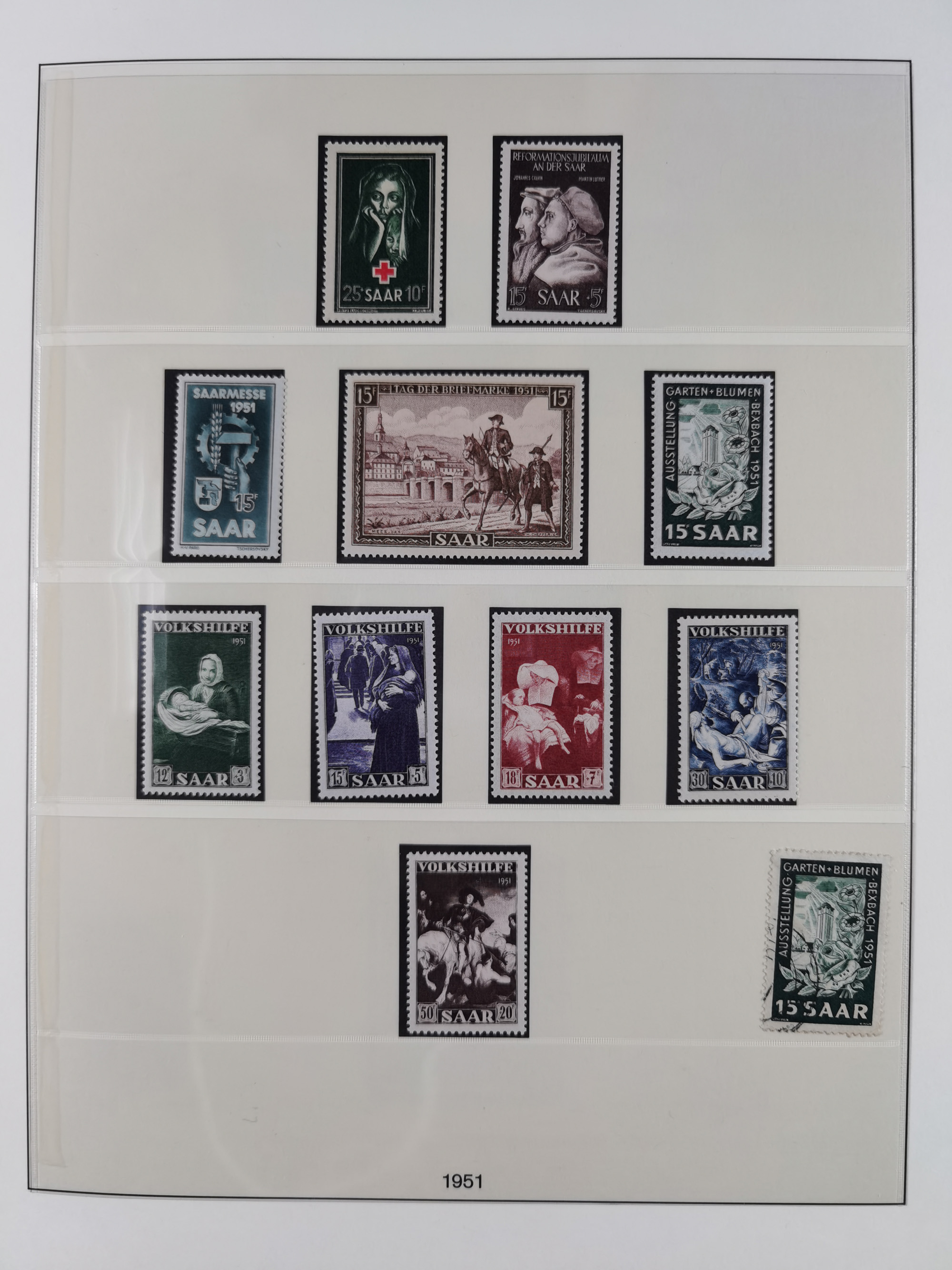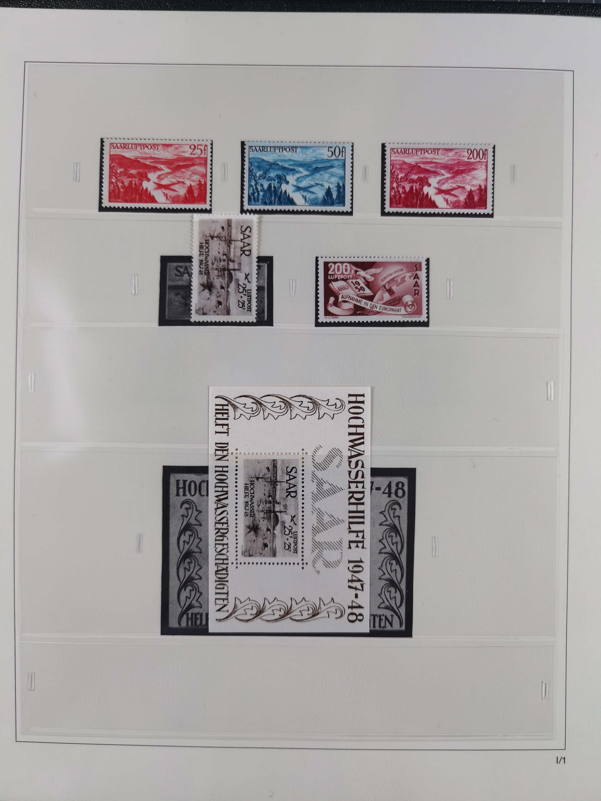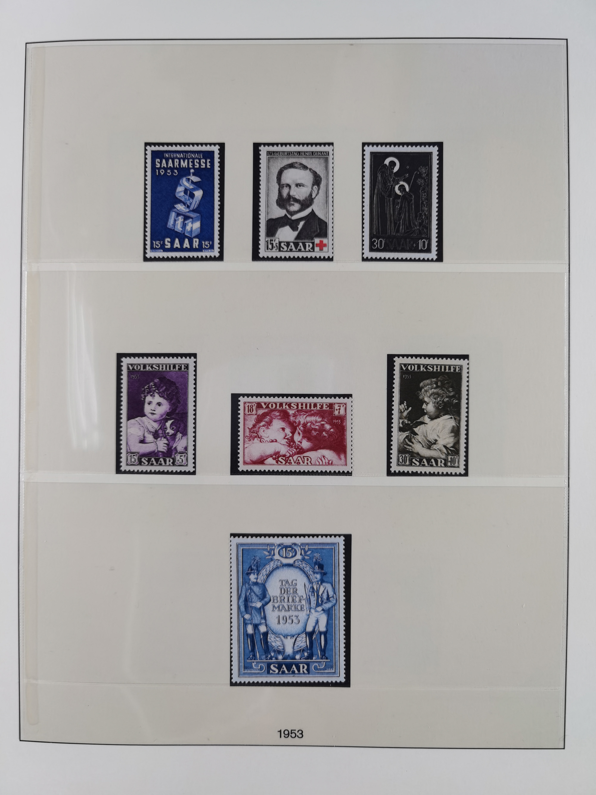 1920/59, in den Hauptnummern stark überkomplette fast ausnahmslos postfrische Sammlung inkl. Dienstmarken, dabei Mi.-Nr. 1-17, 1-17IA inkl. Farben mit 14aIA, Type II 7 Werte kpl., zusätzlich diese auch mit PF A (ohne 2aIIA), 1-17III mit 16IIIOR, 18-31 mit 30L und 31L, A31-C31 (B31 ungebraucht), ferner alle Volkshilfen inkl. Madonna mit Bogenrand, sowie Saarland mit unsigniertem Urdrucksatz, Hochwasserhilfe-Blockspaar, einigen Klbg., zusätzlich gestempelt 380-83 und 409-28 OR auf Briefstücken und MH1 postfrisch/ungebraucht (etwas fleckig), gute Erhaltung, 23 (Kurz-)Befunde und Atteste Ney, Geigle, Burger und Bernhard BPP, in zwei Vordruckalben