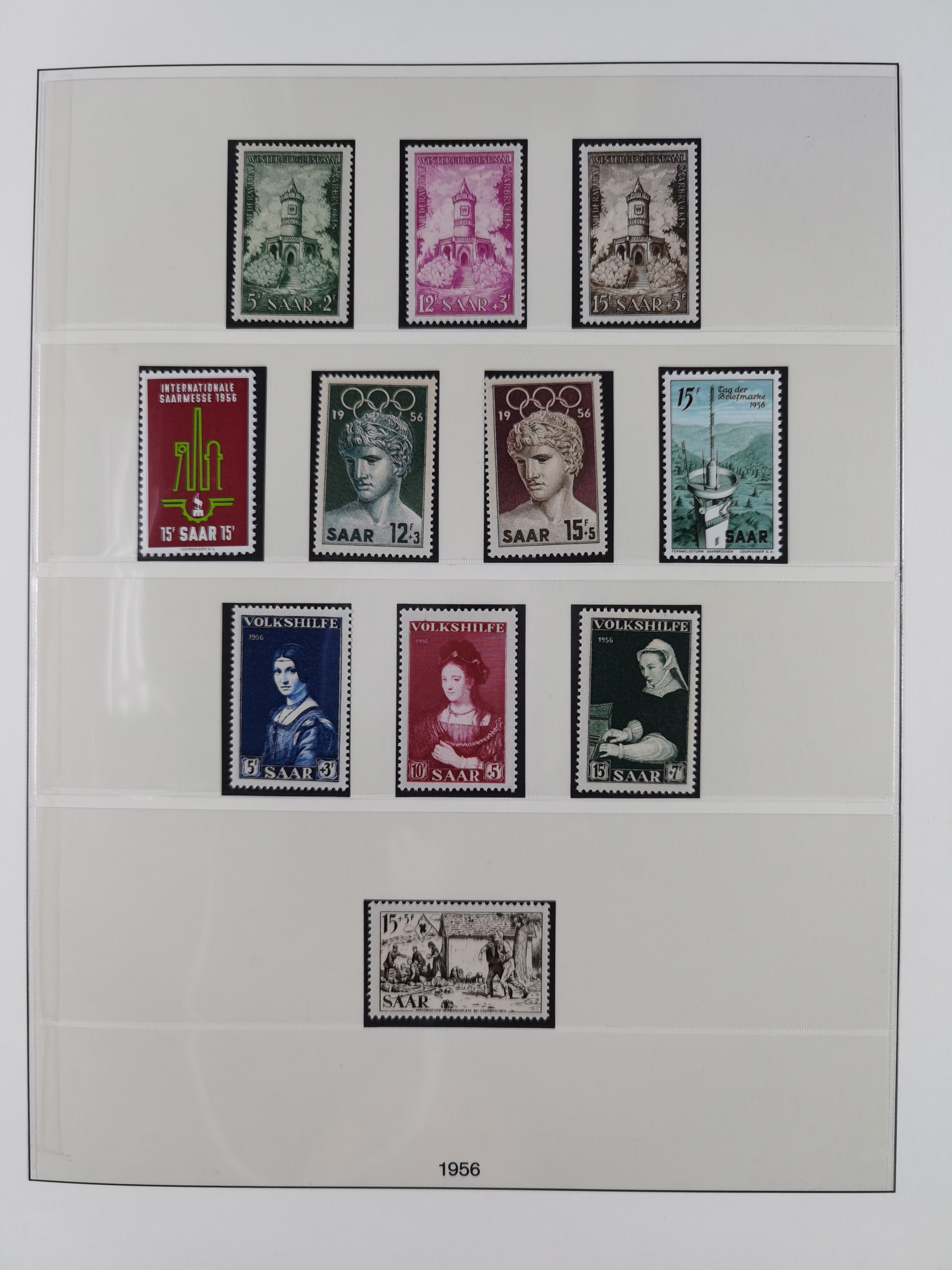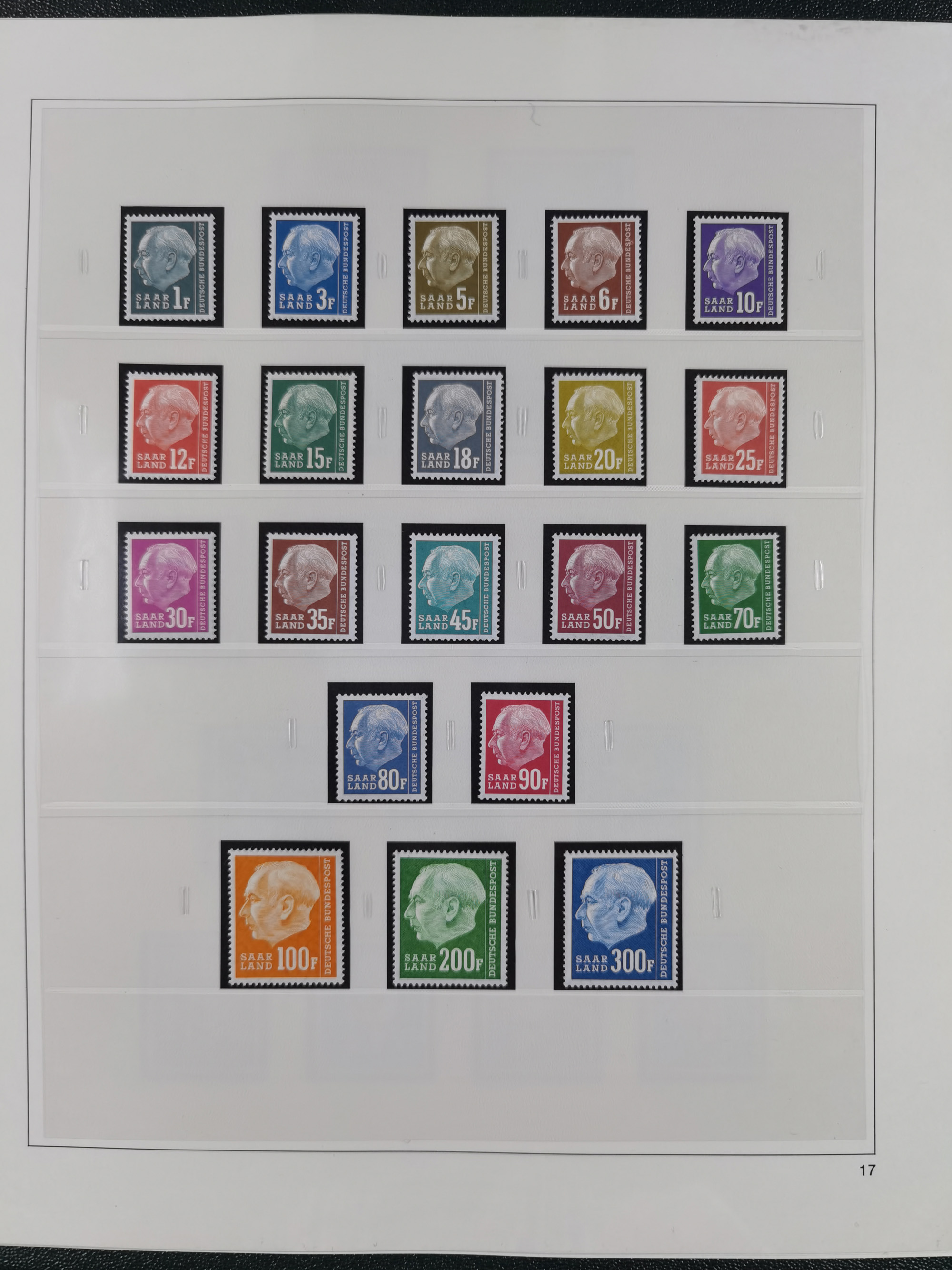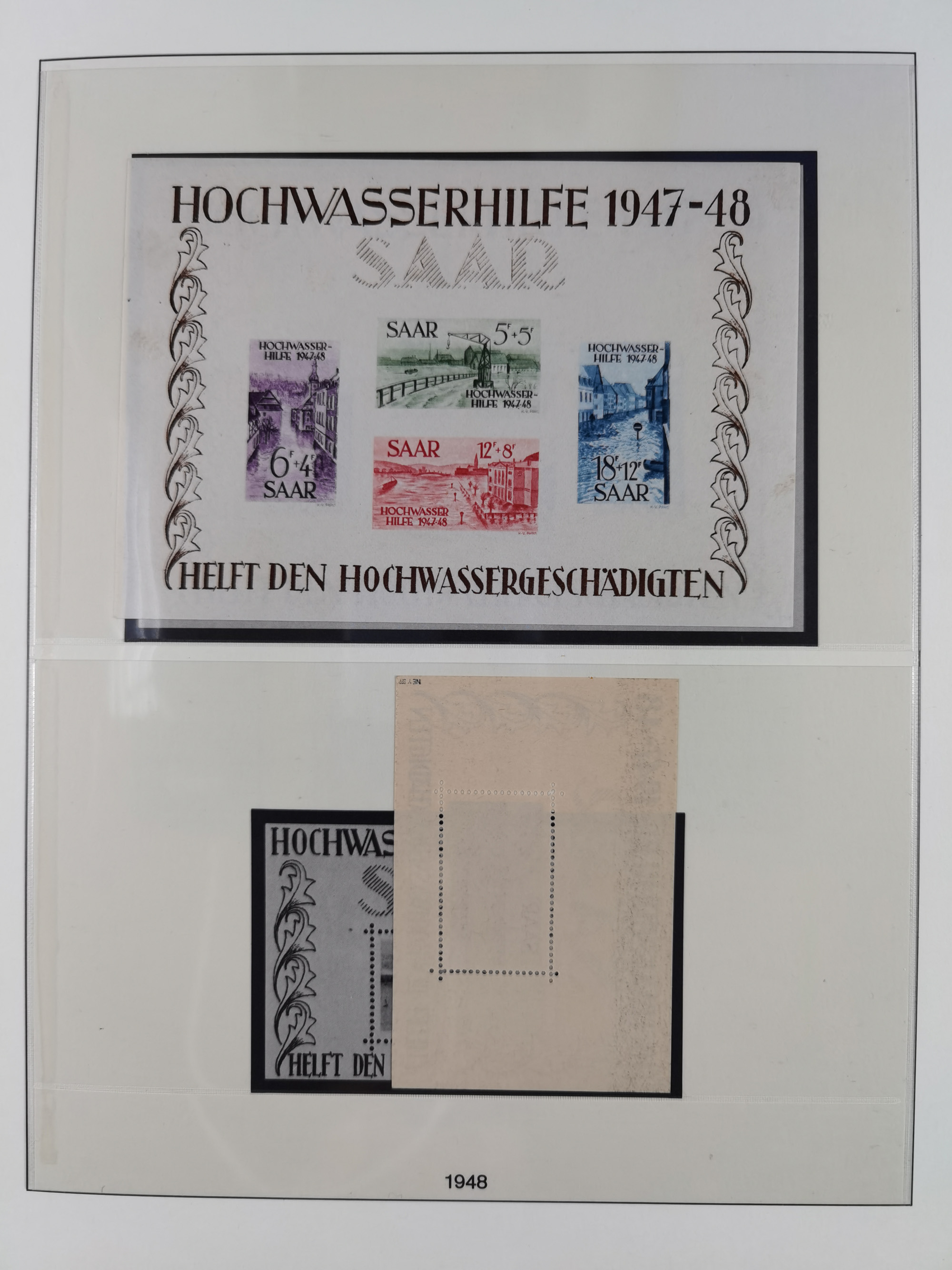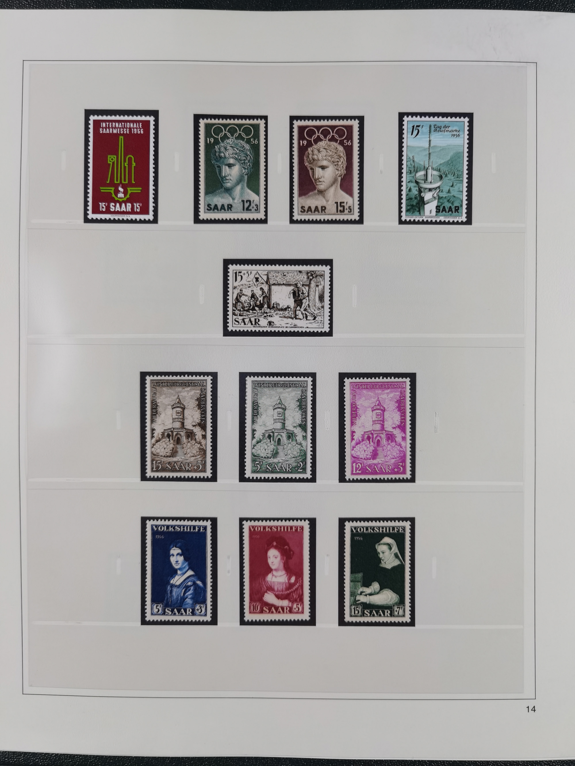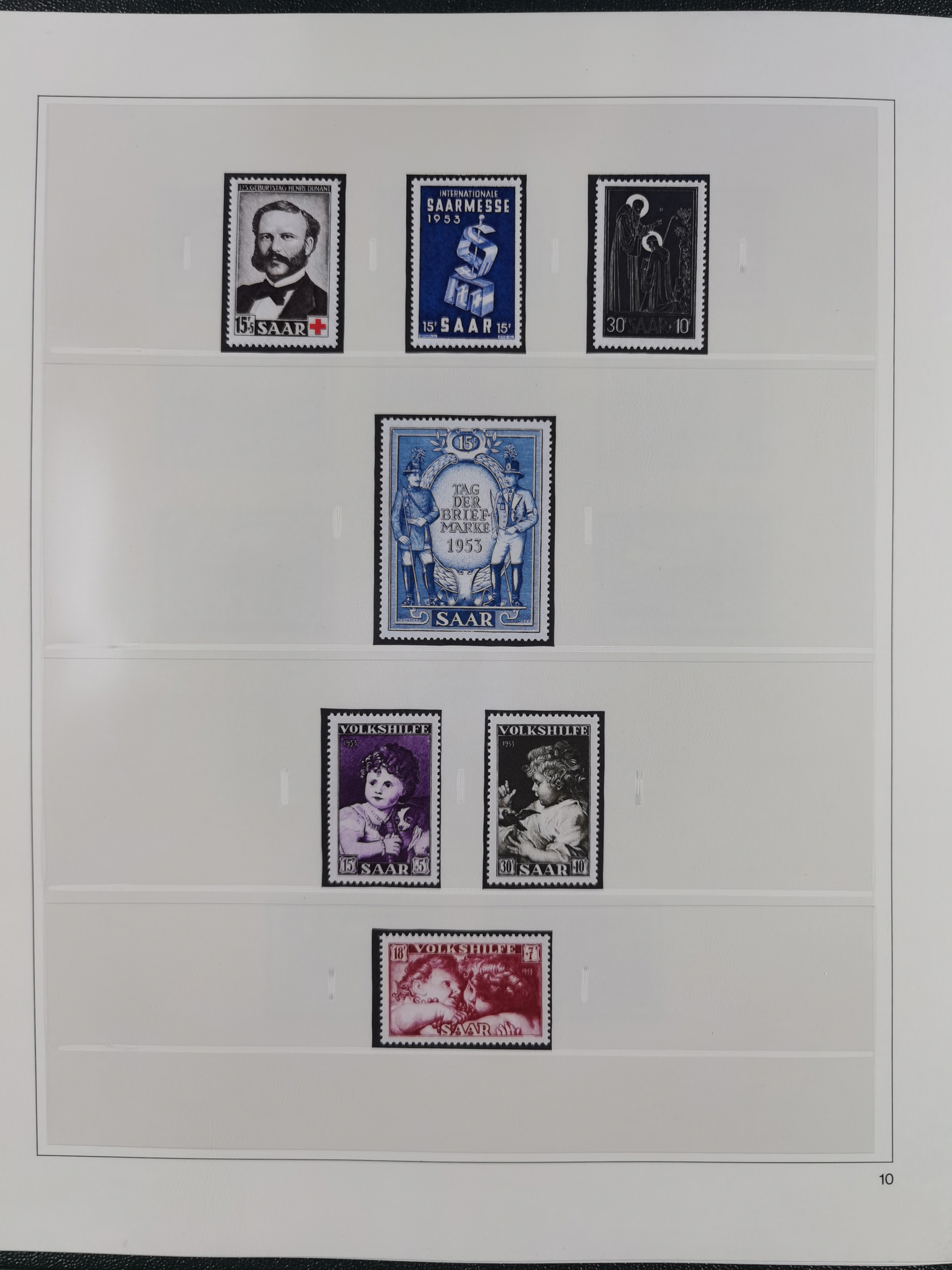 1920/59, in den Hauptnummern stark überkomplette fast ausnahmslos postfrische Sammlung inkl. Dienstmarken, dabei Mi.-Nr. 1-17, 1-17IA inkl. Farben mit 14aIA, Type II 7 Werte kpl., zusätzlich diese auch mit PF A (ohne 2aIIA), 1-17III mit 16IIIOR, 18-31 mit 30L und 31L, A31-C31 (B31 ungebraucht), ferner alle Volkshilfen inkl. Madonna mit Bogenrand, sowie Saarland mit unsigniertem Urdrucksatz, Hochwasserhilfe-Blockspaar, einigen Klbg., zusätzlich gestempelt 380-83 und 409-28 OR auf Briefstücken und MH1 postfrisch/ungebraucht (etwas fleckig), gute Erhaltung, 23 (Kurz-)Befunde und Atteste Ney, Geigle, Burger und Bernhard BPP, in zwei Vordruckalben